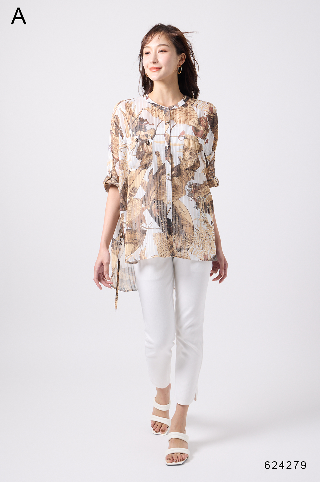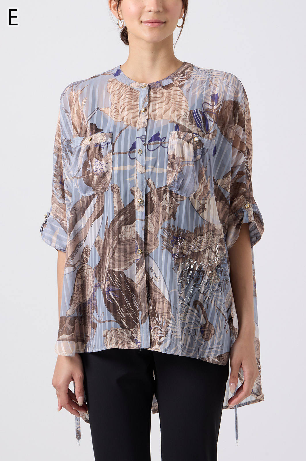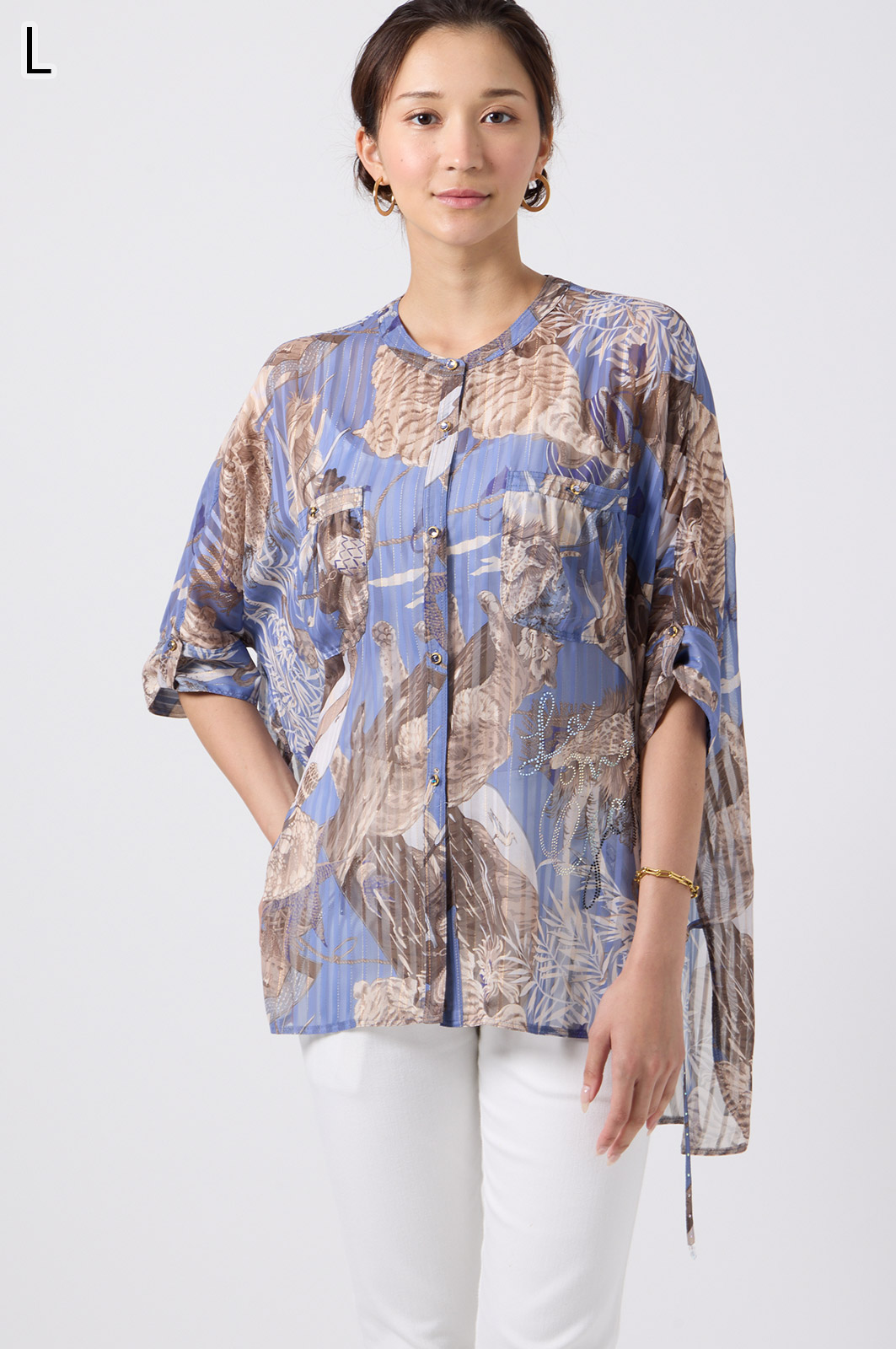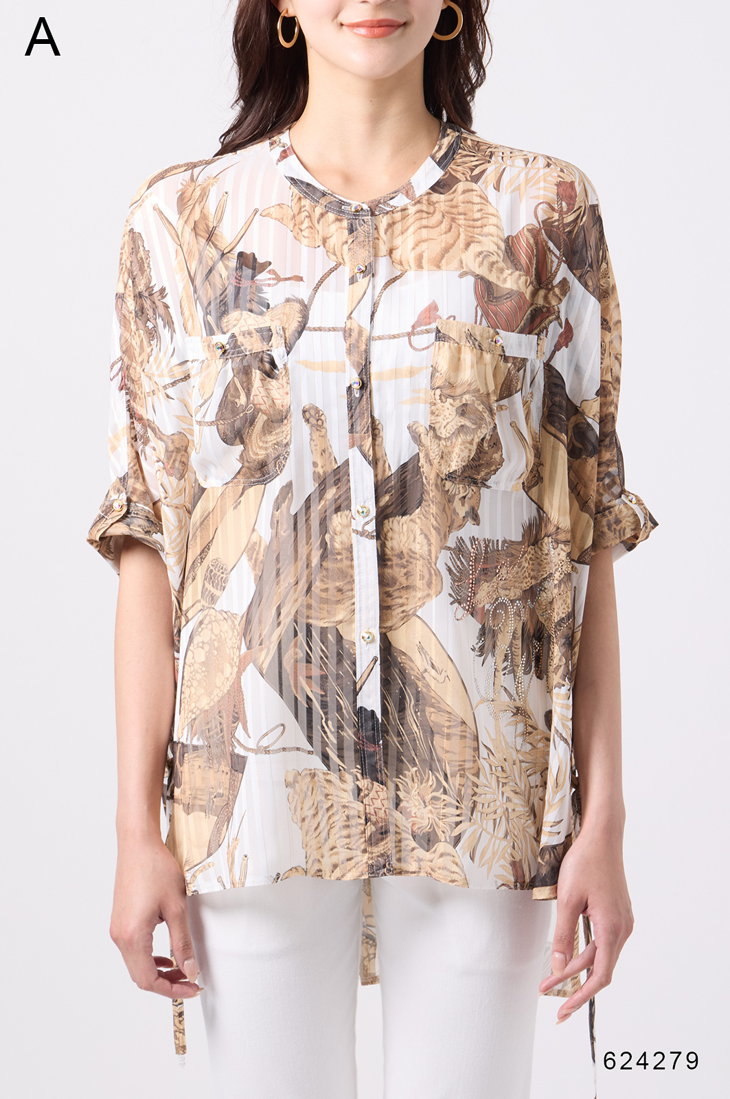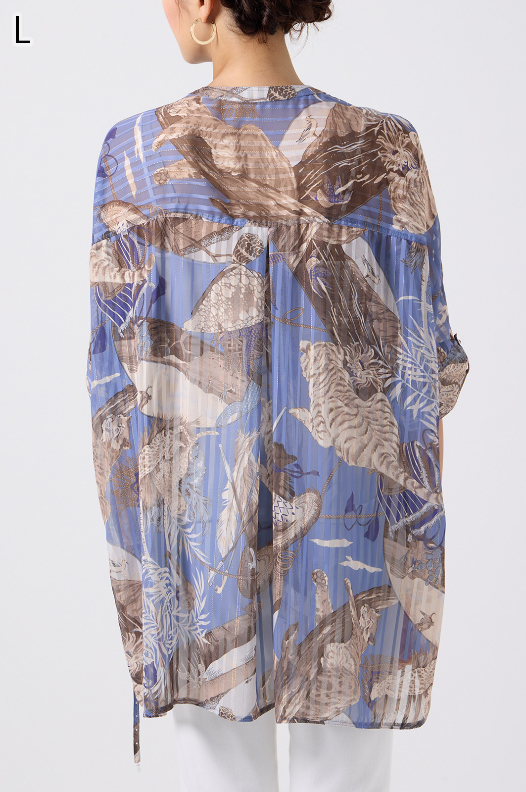 NO.624279BL ブラウス (Blouse) 華やかな動物柄と、光沢のある軽やかな生地が上品な印象を演出。涼しくてさっと羽織れるので、夏のおでかけや冷房対策にもぴったりのブラウスです。 モデル身長:171cm 【 価格 (PRICE) 】 ¥63,800 税込(W/ TAX) 【 カラー (COLOR) 】 9号着用。他カラーも展開予定。 【 品質 (QUALITY) 】 ポリエステル100%(スリット糸使用) 【 サイズ ( SIZE ) 】 9号:着丈79cm/バスト164cm/ゆき丈58cm 11号:着丈81cm/バスト170cm/ゆき丈59cm