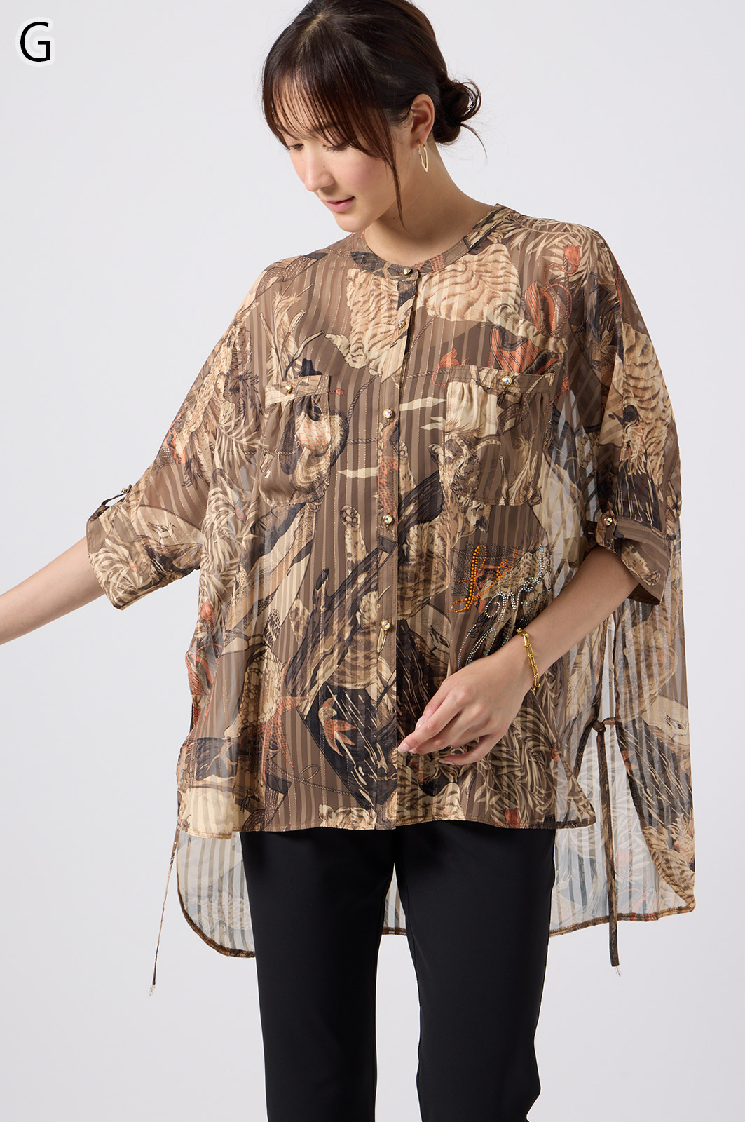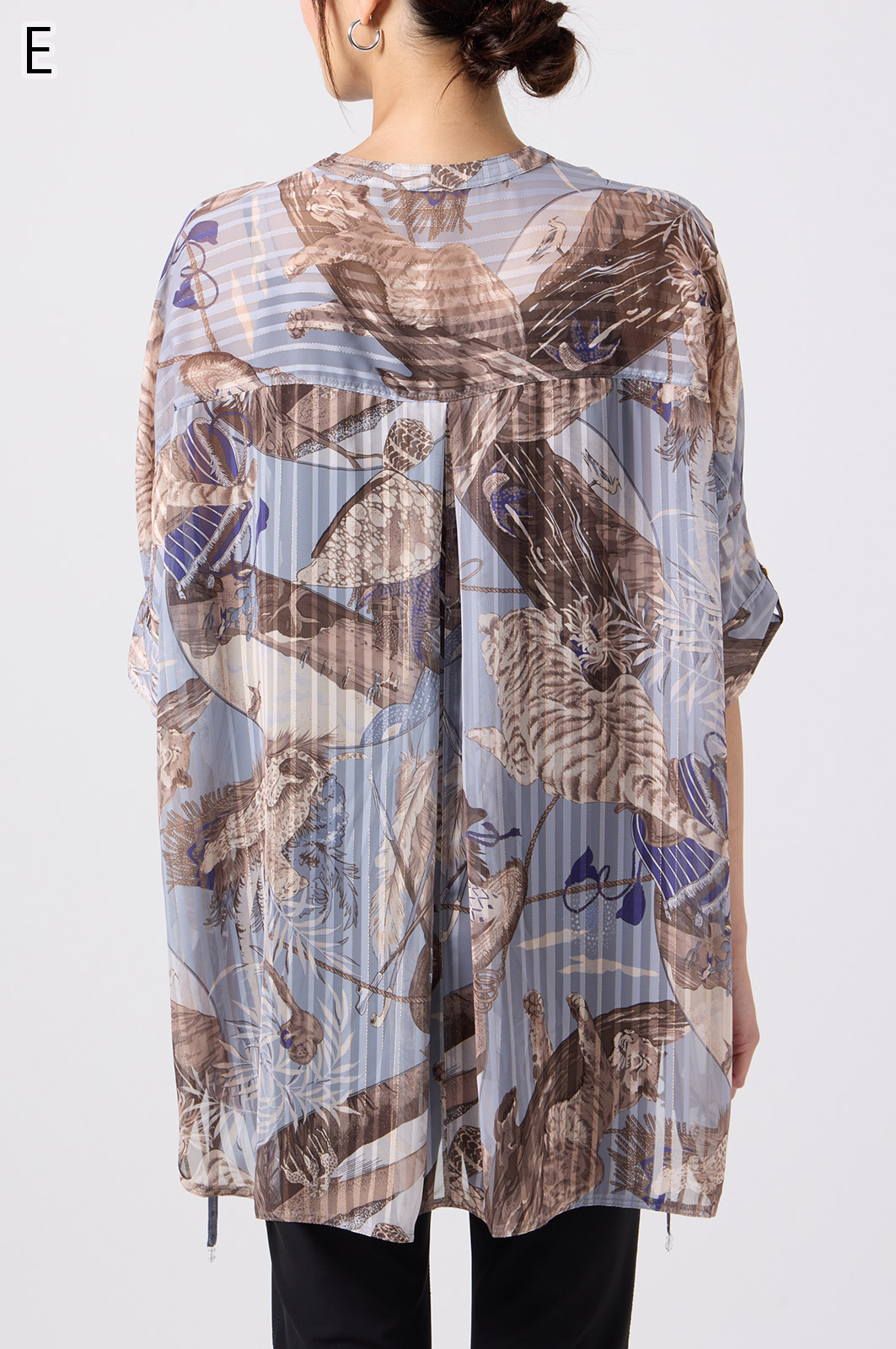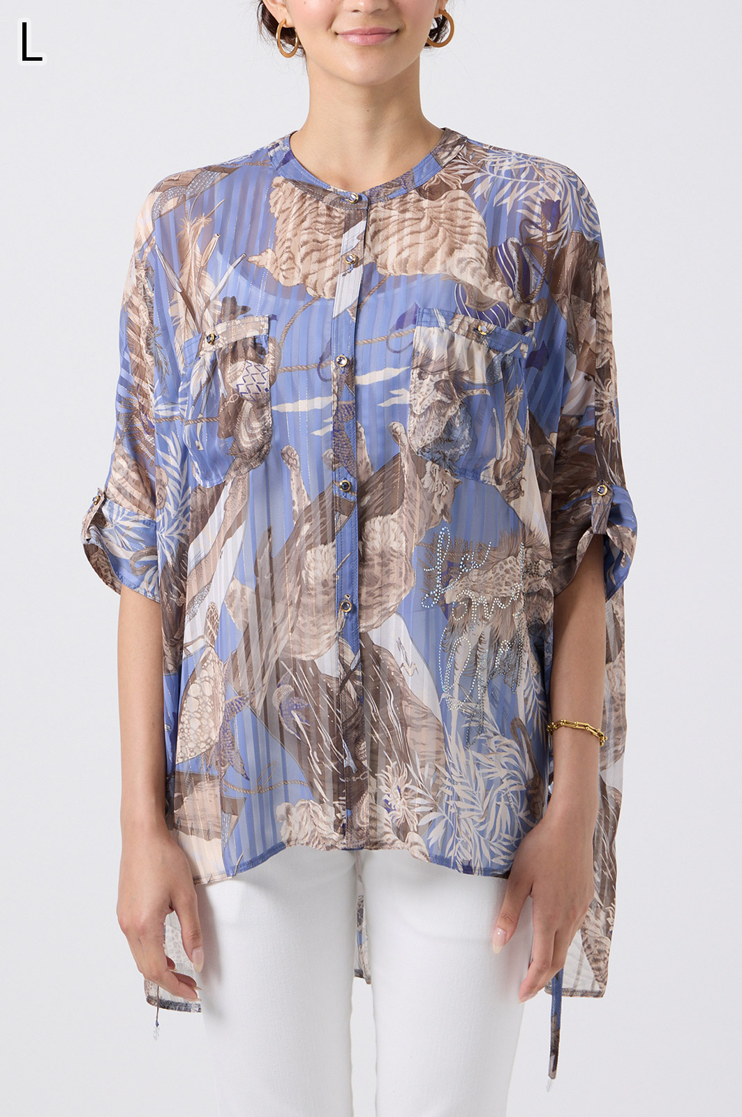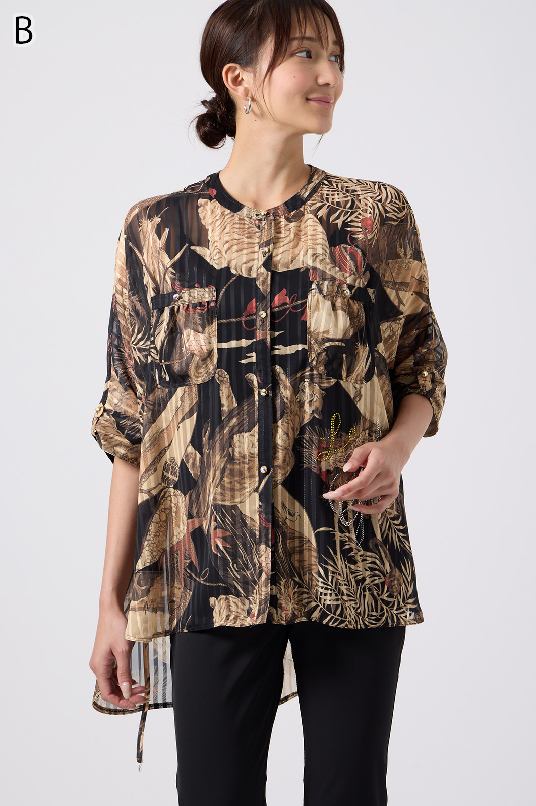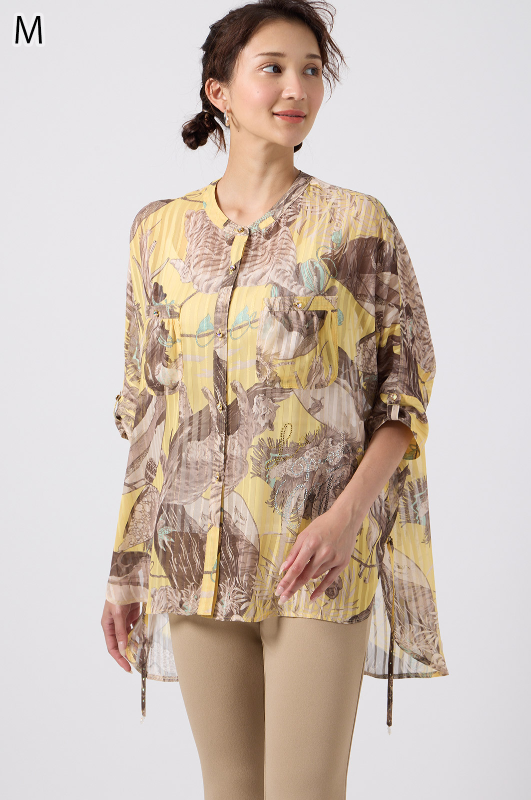 NO.624279BL ブラウス (Blouse) 華やかな動物柄と、光沢のある軽やかな生地が上品な印象を演出。涼しくてさっと羽織れるので、夏のおでかけや冷房対策にもぴったりのブラウスです。 モデル身長:171cm 【 価格 (PRICE) 】 ¥63,800 税込(W/ TAX) 【 カラー (COLOR) 】 9号着用。他カラーも展開予定。 【 品質 (QUALITY) 】 ポリエステル100%(スリット糸使用) 【 サイズ ( SIZE ) 】 9号:着丈79cm/バスト164cm/ゆき丈58cm 11号:着丈81cm/バスト170cm/ゆき丈59cm