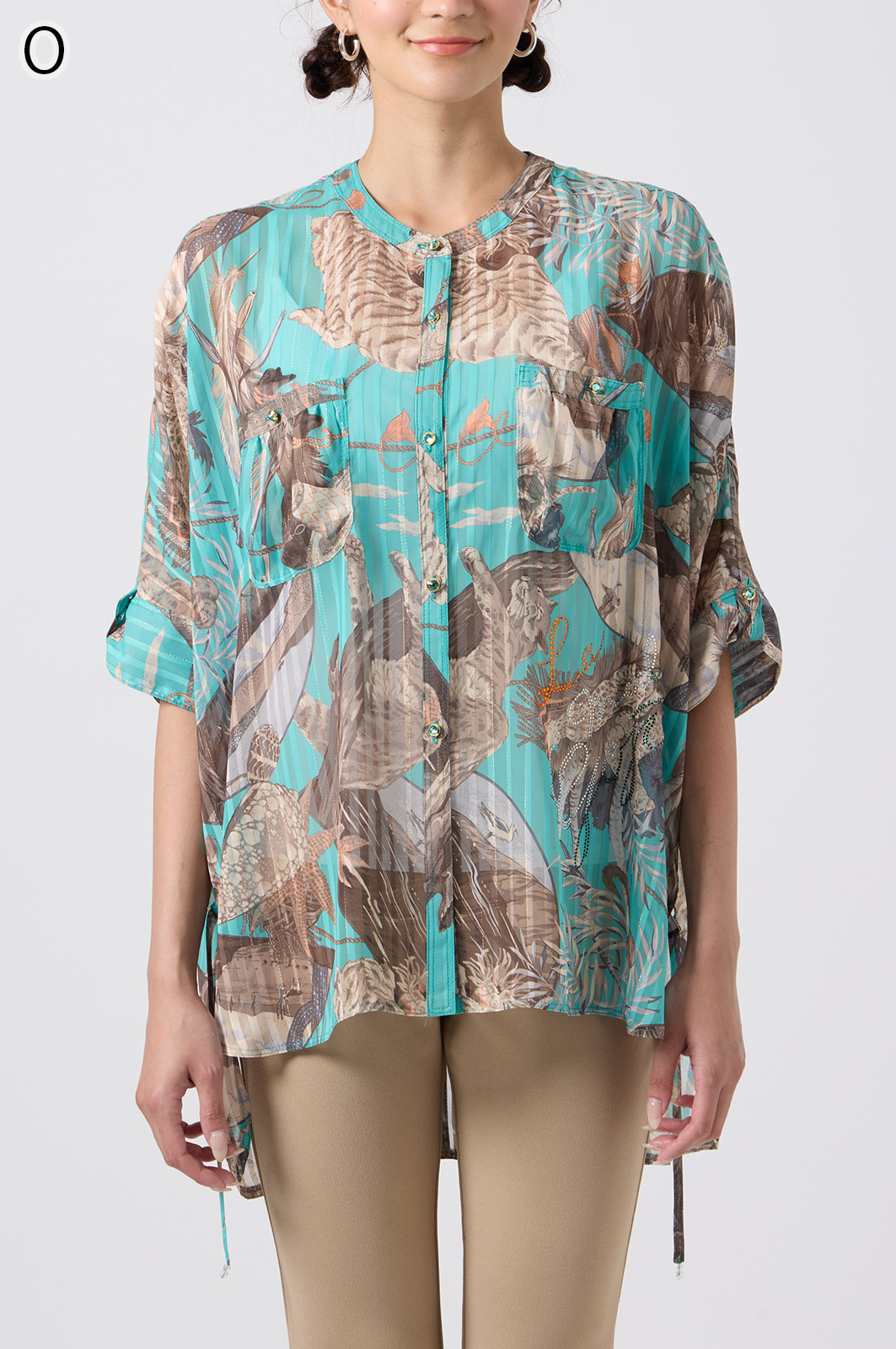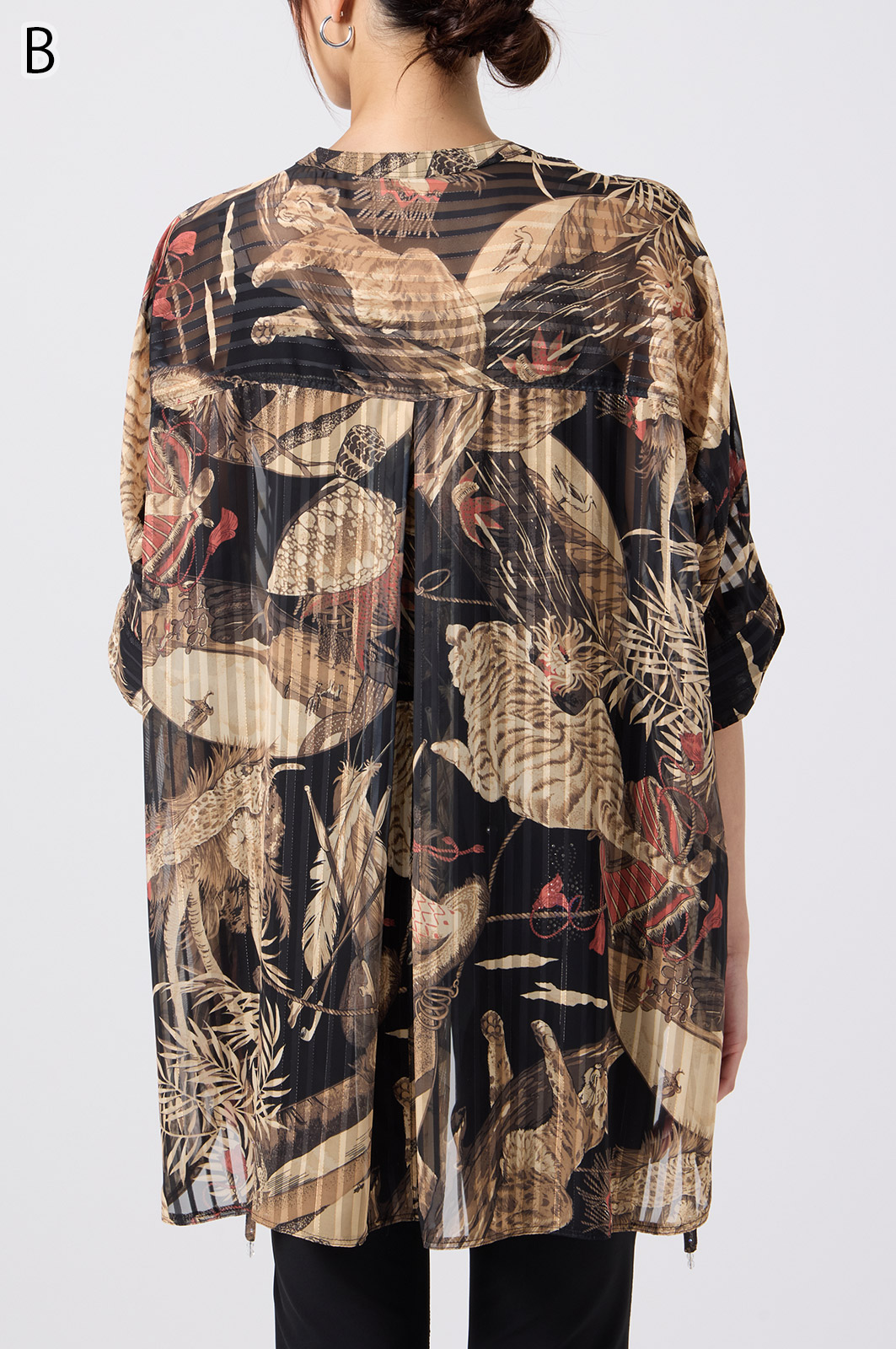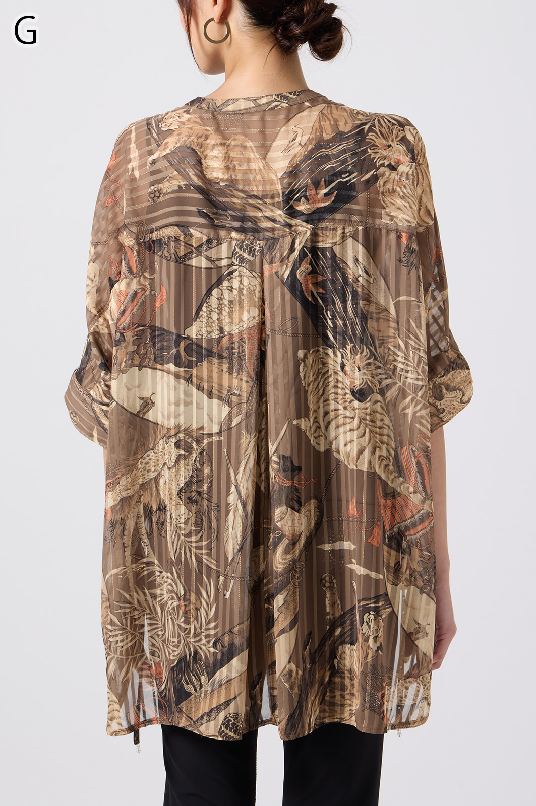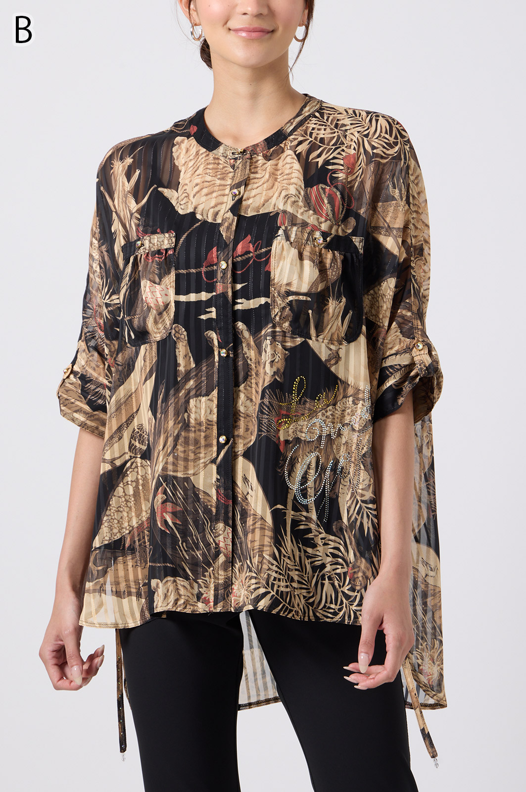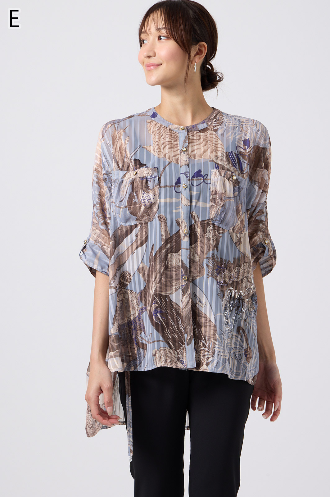 NO.624279BL ブラウス (Blouse) 華やかな動物柄と、光沢のある軽やかな生地が上品な印象を演出。涼しくてさっと羽織れるので、夏のおでかけや冷房対策にもぴったりのブラウスです。 モデル身長:171cm 【 価格 (PRICE) 】 ¥63,800 税込(W/ TAX) 【 カラー (COLOR) 】 9号着用。他カラーも展開予定。 【 品質 (QUALITY) 】 ポリエステル100%(スリット糸使用) 【 サイズ ( SIZE ) 】 9号:着丈79cm/バスト164cm/ゆき丈58cm 11号:着丈81cm/バスト170cm/ゆき丈59cm