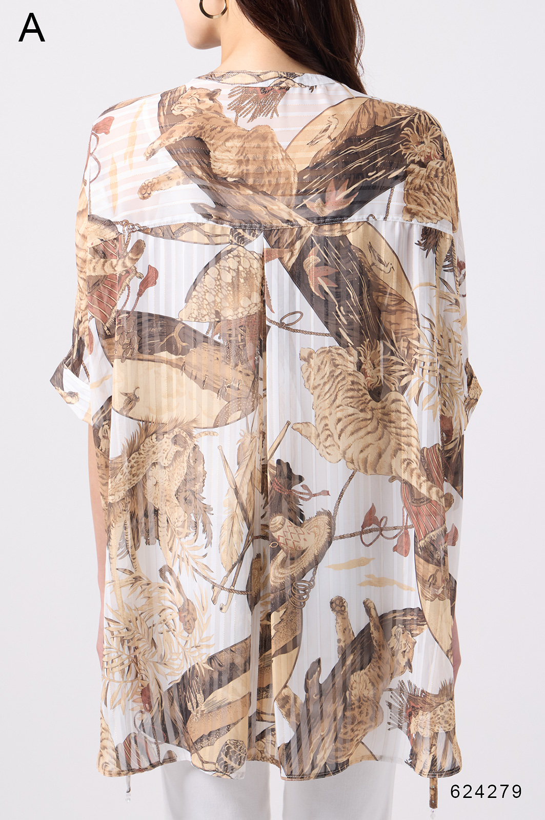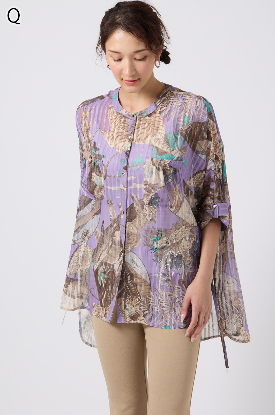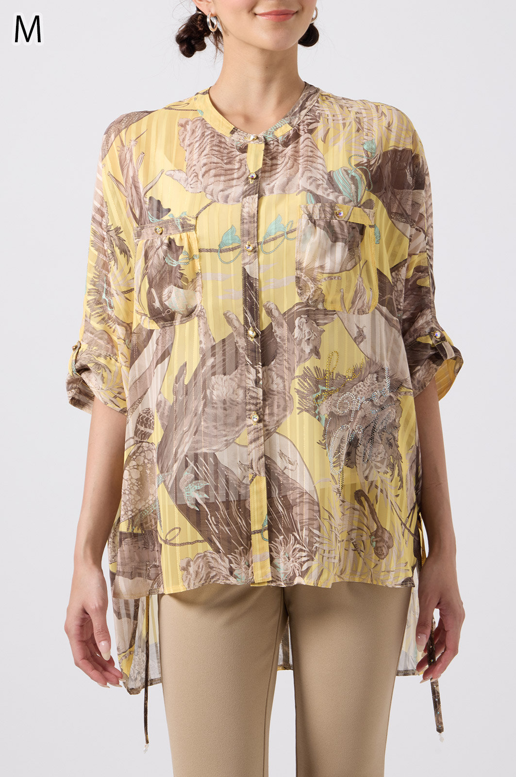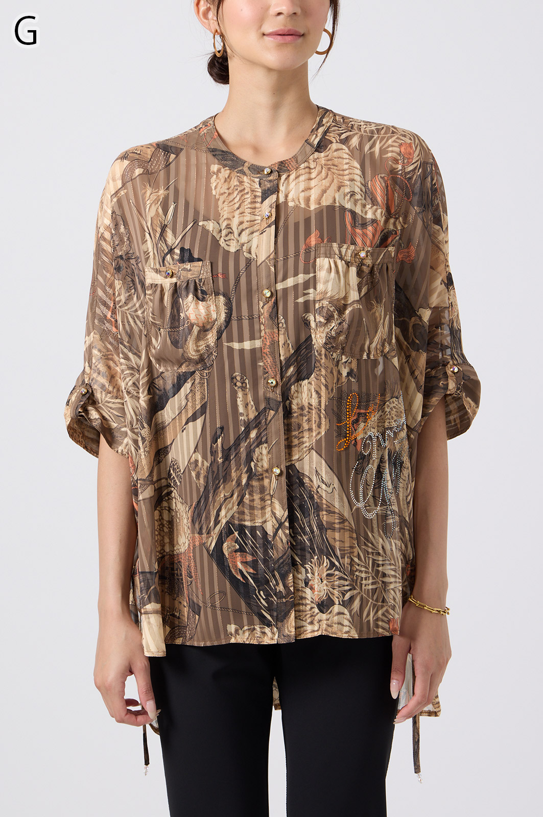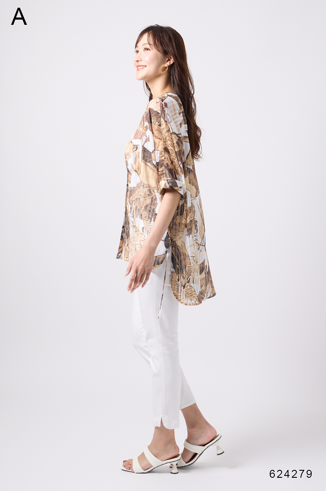 NO.624279BL ブラウス (Blouse) 華やかな動物柄と、光沢のある軽やかな生地が上品な印象を演出。涼しくてさっと羽織れるので、夏のおでかけや冷房対策にもぴったりのブラウスです。 モデル身長:171cm 【 価格 (PRICE) 】 ¥63,800 税込(W/ TAX) 【 カラー (COLOR) 】 9号着用。他カラーも展開予定。 【 品質 (QUALITY) 】 ポリエステル100%(スリット糸使用) 【 サイズ ( SIZE ) 】 9号:着丈79cm/バスト164cm/ゆき丈58cm 11号:着丈81cm/バスト170cm/ゆき丈59cm