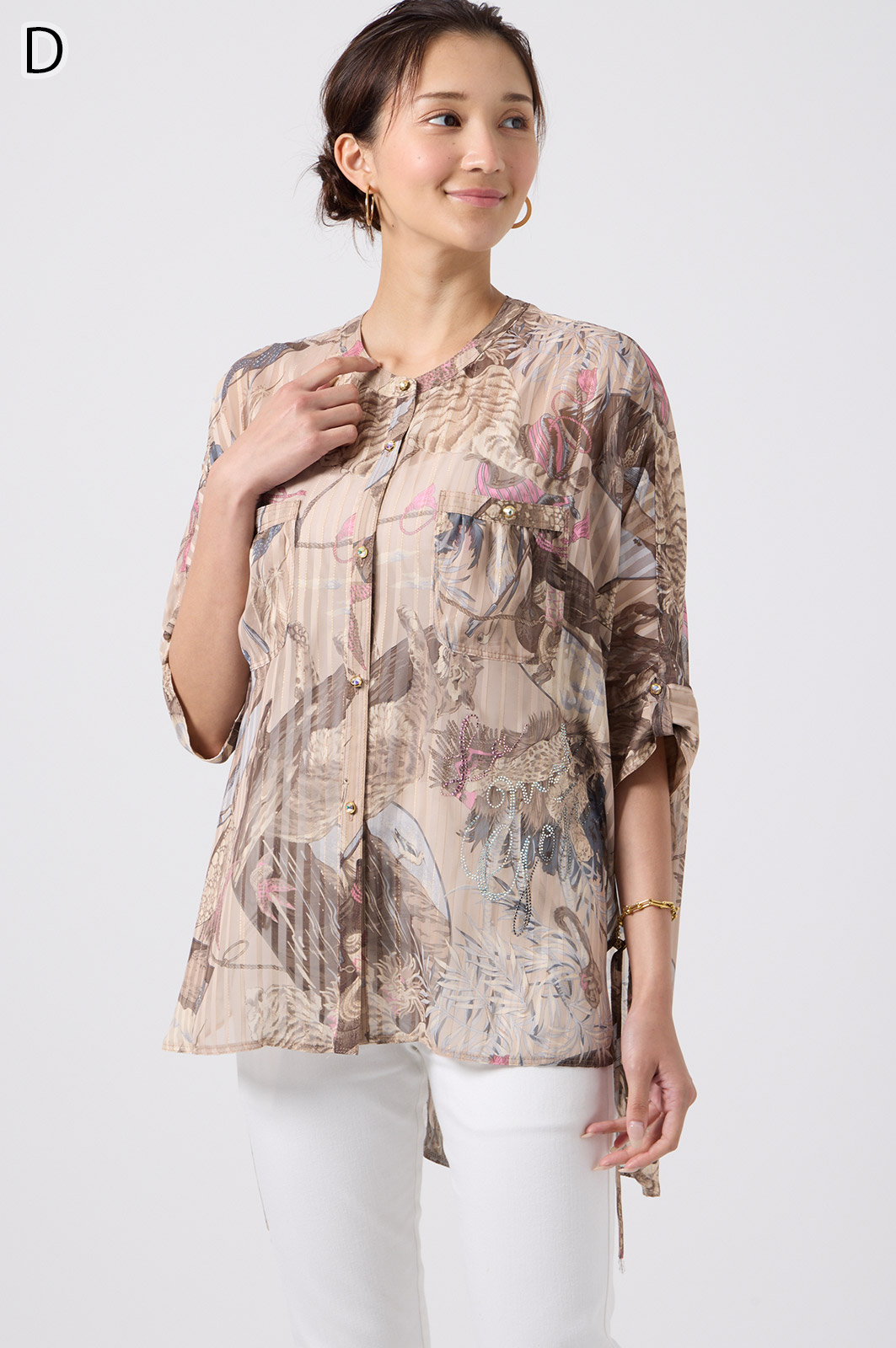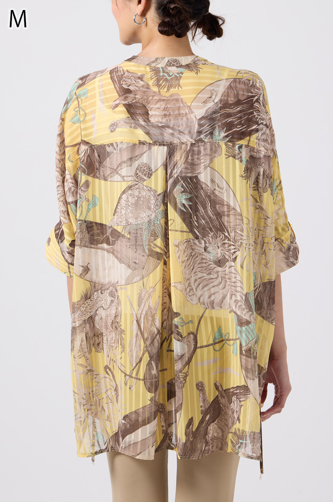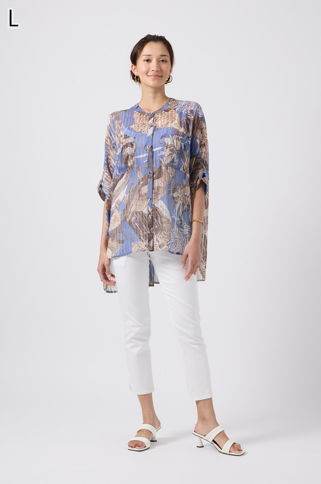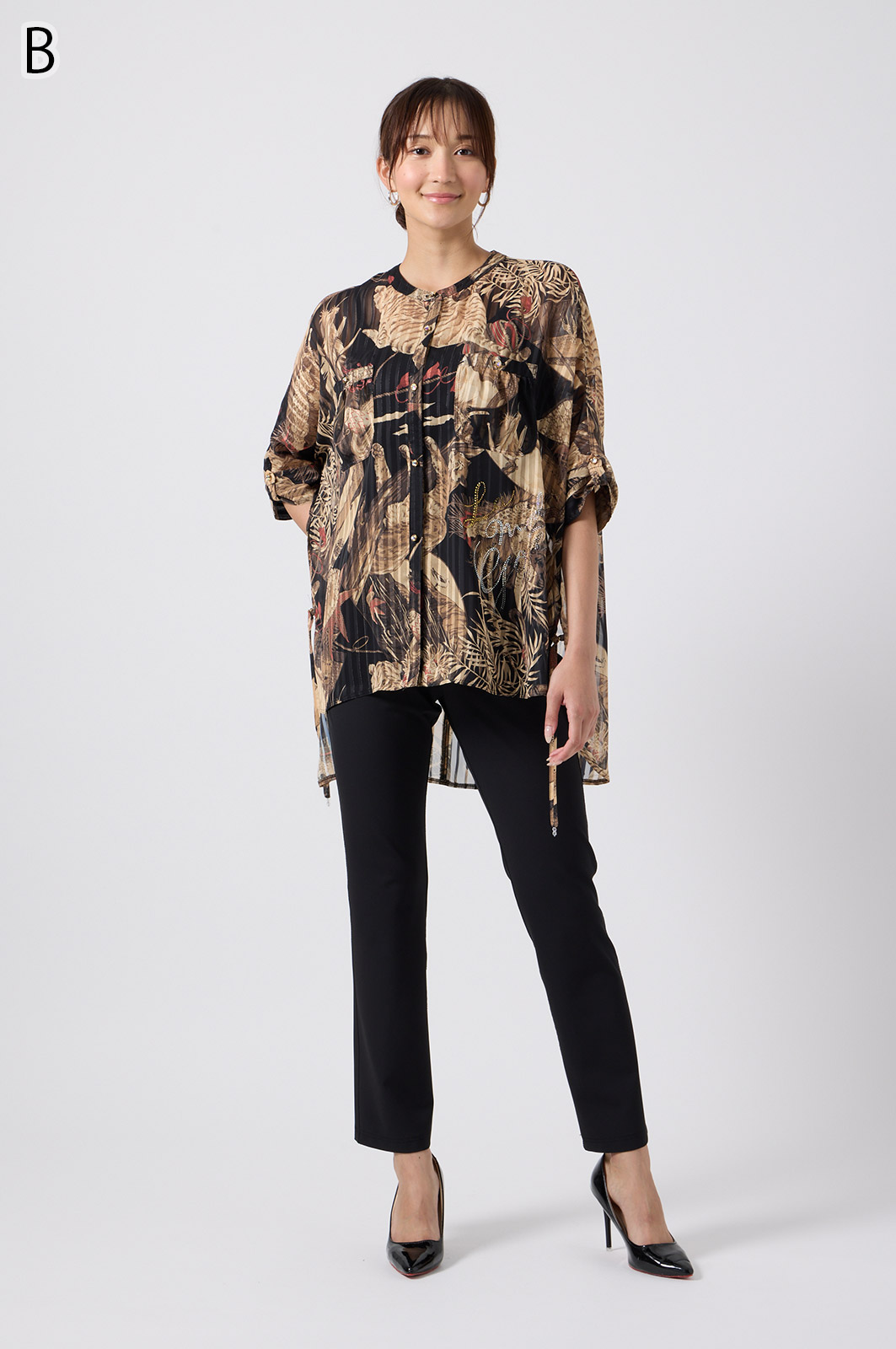 NO.624279BL ブラウス (Blouse) 華やかな動物柄と、光沢のある軽やかな生地が上品な印象を演出。涼しくてさっと羽織れるので、夏のおでかけや冷房対策にもぴったりのブラウスです。 モデル身長:171cm 【 価格 (PRICE) 】 ¥63,800 税込(W/ TAX) 【 カラー (COLOR) 】 9号着用。他カラーも展開予定。 【 品質 (QUALITY) 】 ポリエステル100%(スリット糸使用) 【 サイズ ( SIZE ) 】 9号:着丈79cm/バスト164cm/ゆき丈58cm 11号:着丈81cm/バスト170cm/ゆき丈59cm