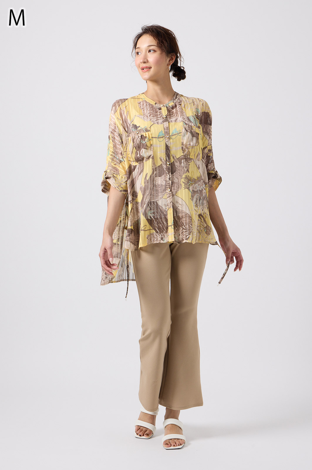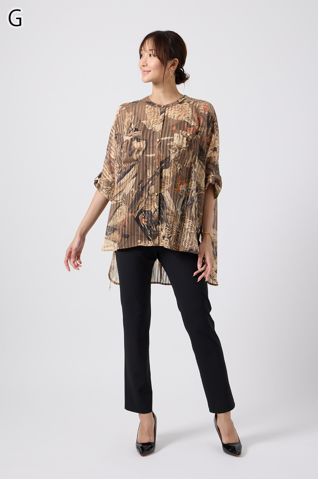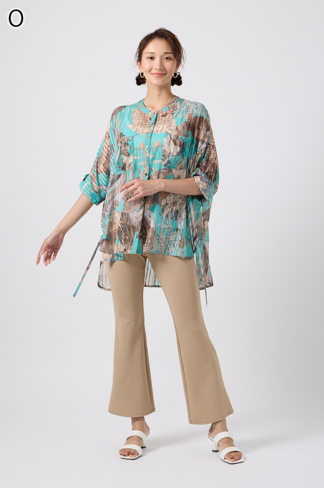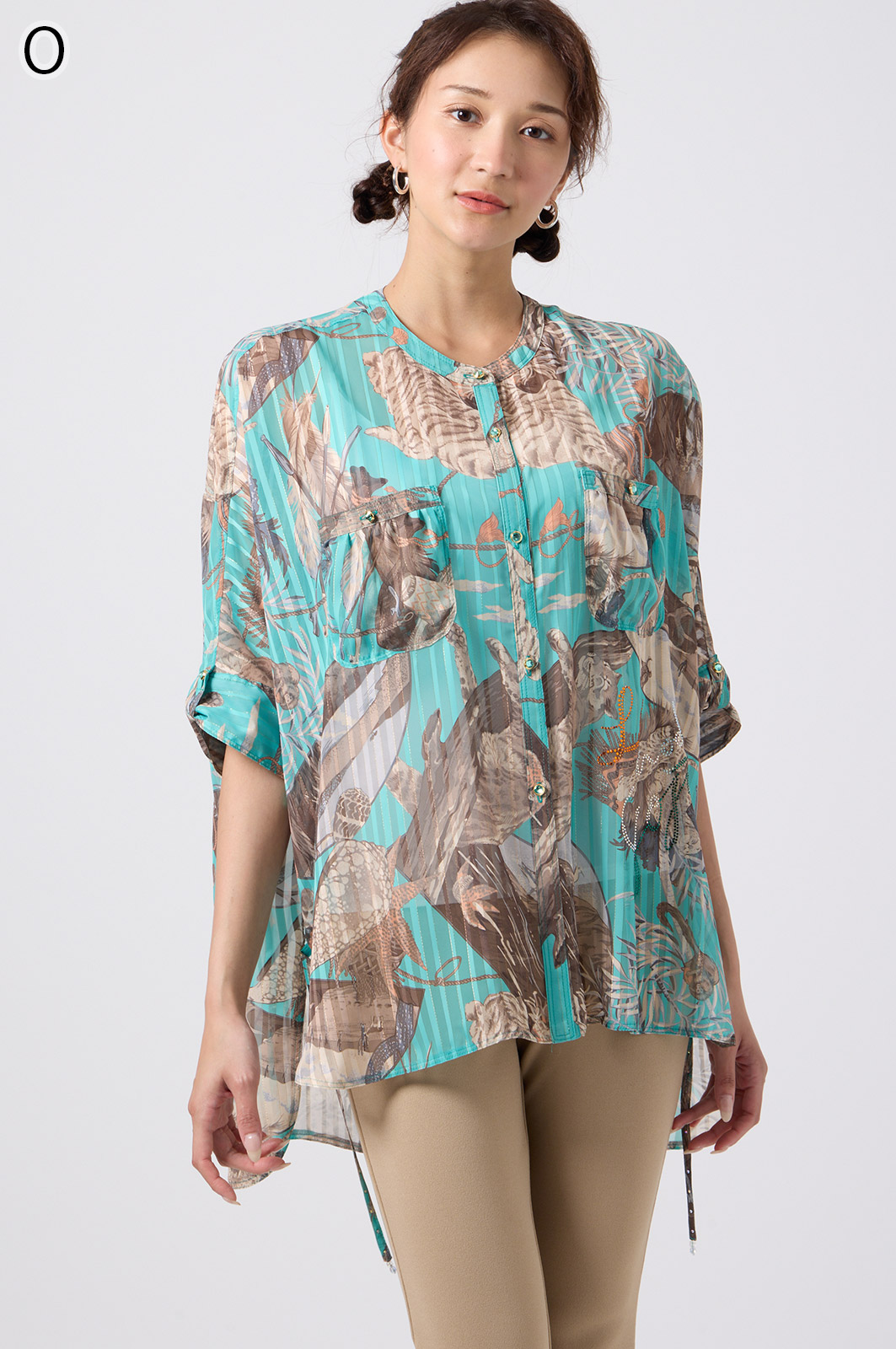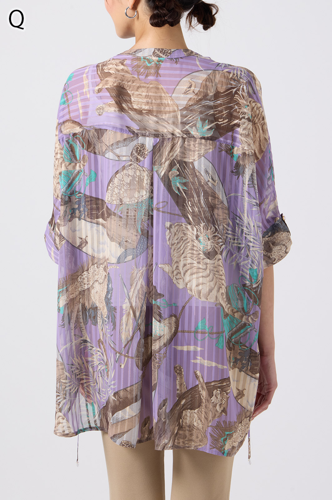 NO.624279BL ブラウス (Blouse) 華やかな動物柄と、光沢のある軽やかな生地が上品な印象を演出。涼しくてさっと羽織れるので、夏のおでかけや冷房対策にもぴったりのブラウスです。 モデル身長:171cm 【 価格 (PRICE) 】 ¥63,800 税込(W/ TAX) 【 カラー (COLOR) 】 9号着用。他カラーも展開予定。 【 品質 (QUALITY) 】 ポリエステル100%(スリット糸使用) 【 サイズ ( SIZE ) 】 9号:着丈79cm/バスト164cm/ゆき丈58cm 11号:着丈81cm/バスト170cm/ゆき丈59cm