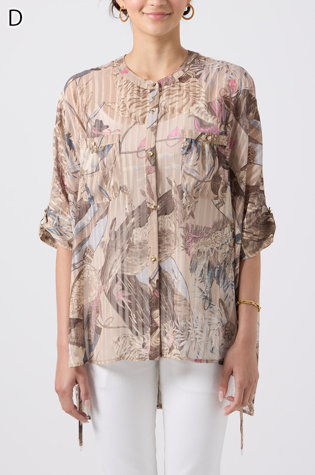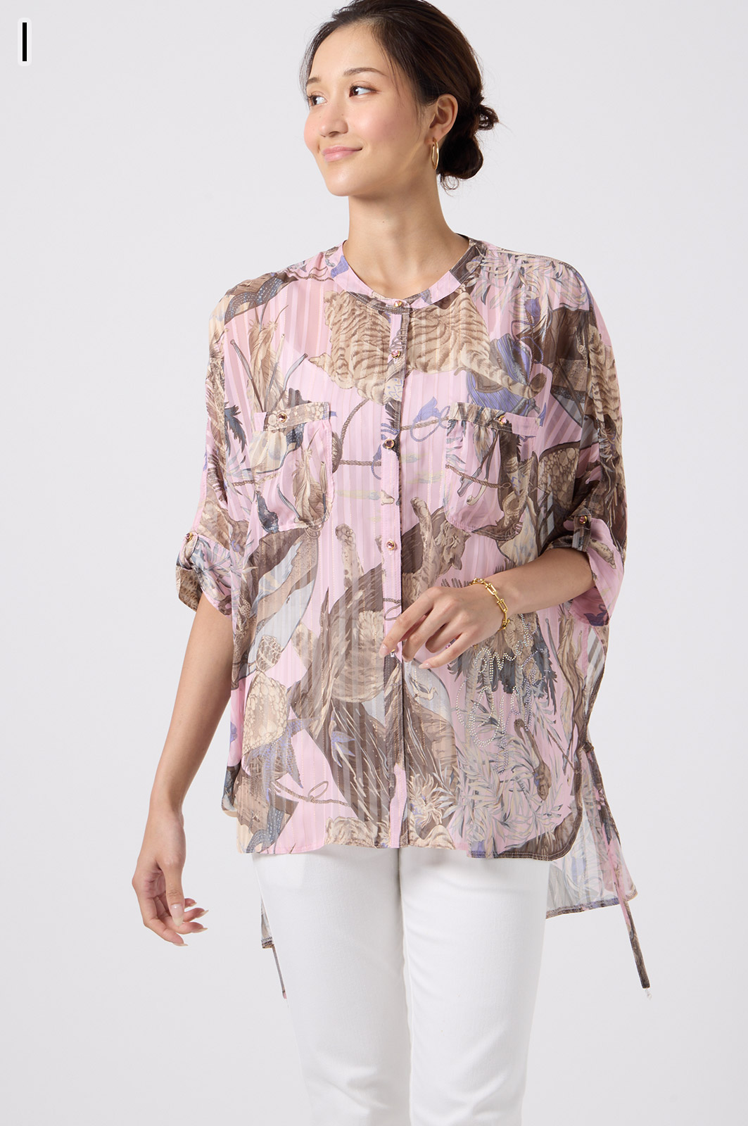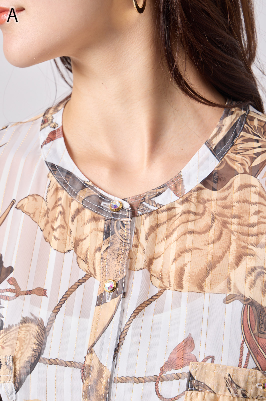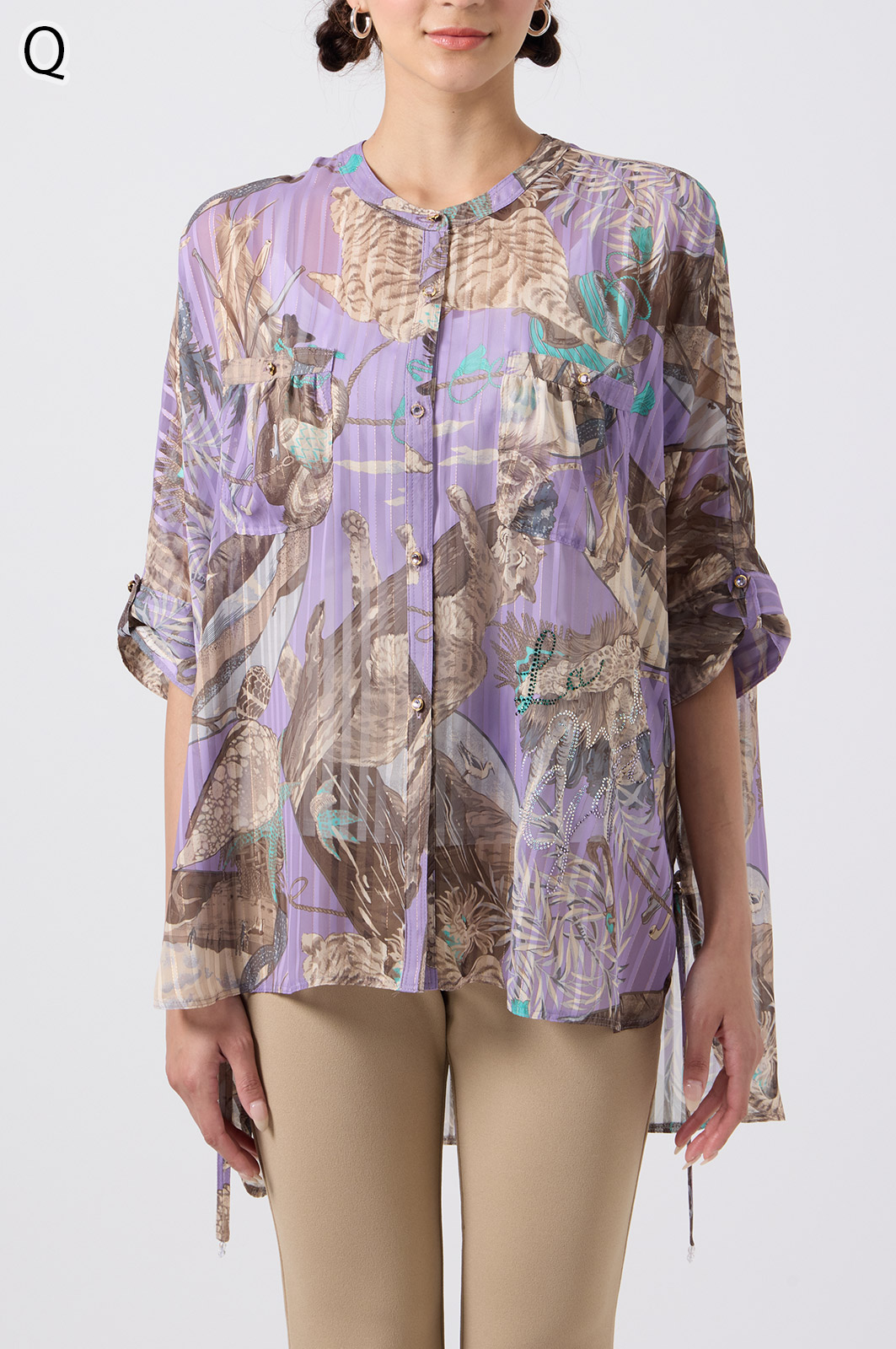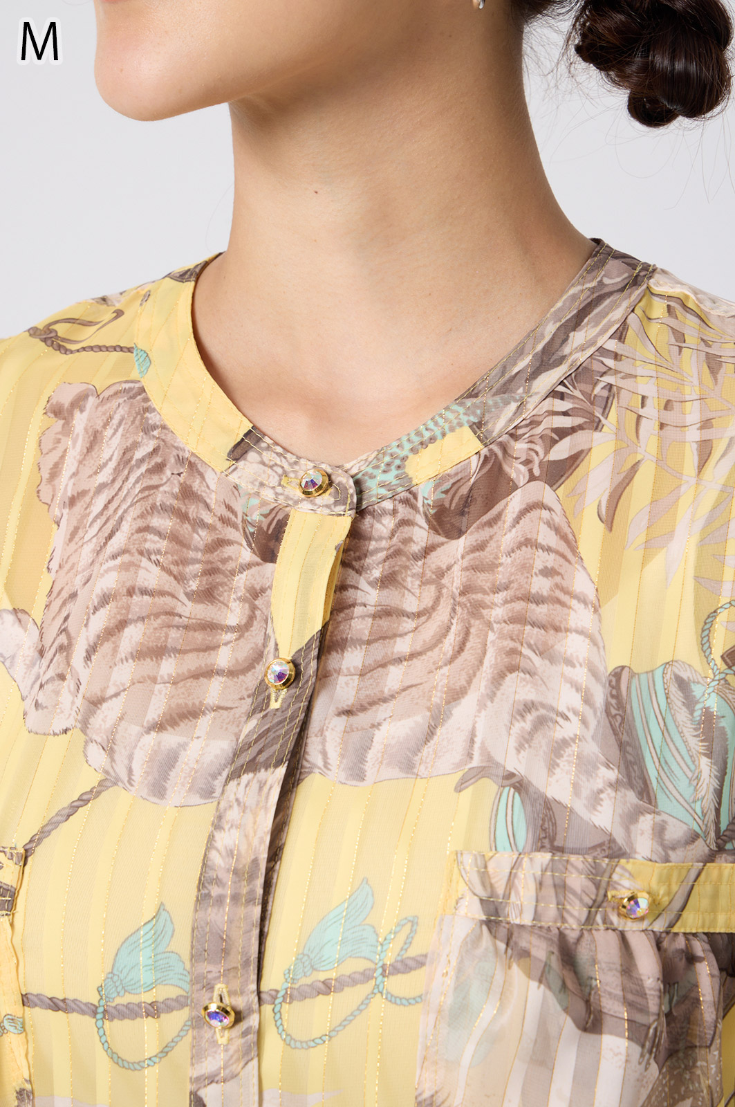 NO.624279BL ブラウス (Blouse) 華やかな動物柄と、光沢のある軽やかな生地が上品な印象を演出。涼しくてさっと羽織れるので、夏のおでかけや冷房対策にもぴったりのブラウスです。 モデル身長:171cm 【 価格 (PRICE) 】 ¥63,800 税込(W/ TAX) 【 カラー (COLOR) 】 9号着用。他カラーも展開予定。 【 品質 (QUALITY) 】 ポリエステル100%(スリット糸使用) 【 サイズ ( SIZE ) 】 9号:着丈79cm/バスト164cm/ゆき丈58cm 11号:着丈81cm/バスト170cm/ゆき丈59cm