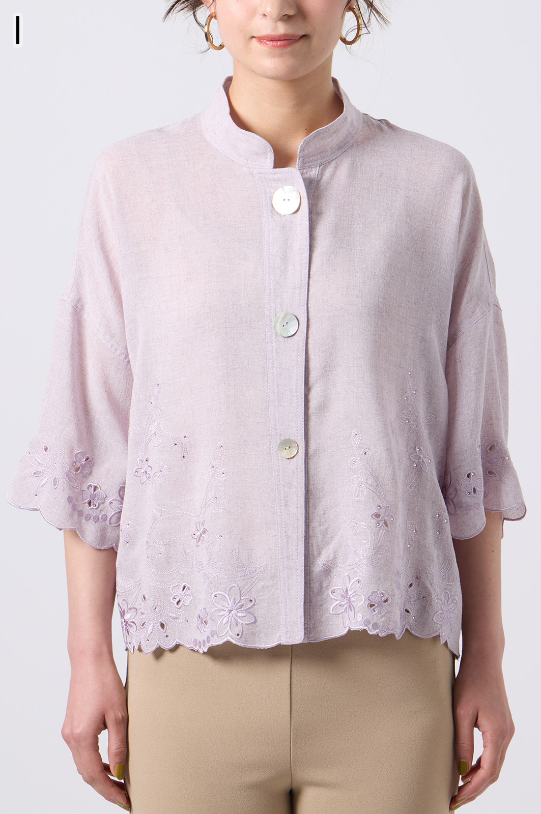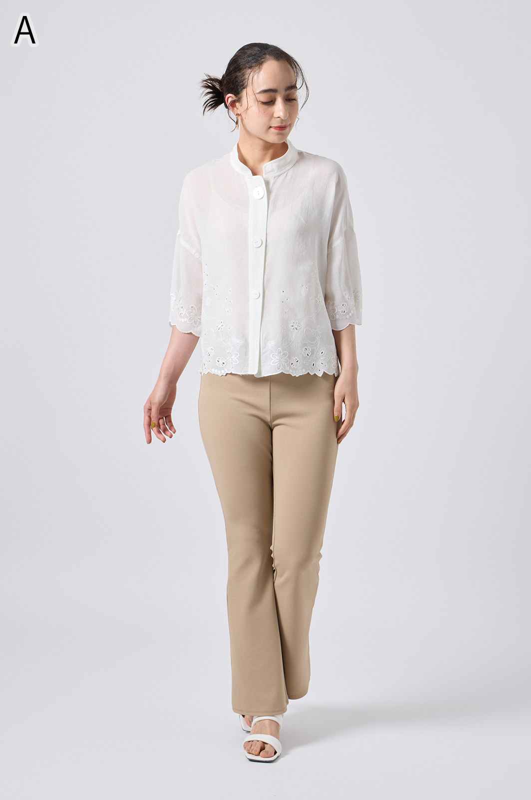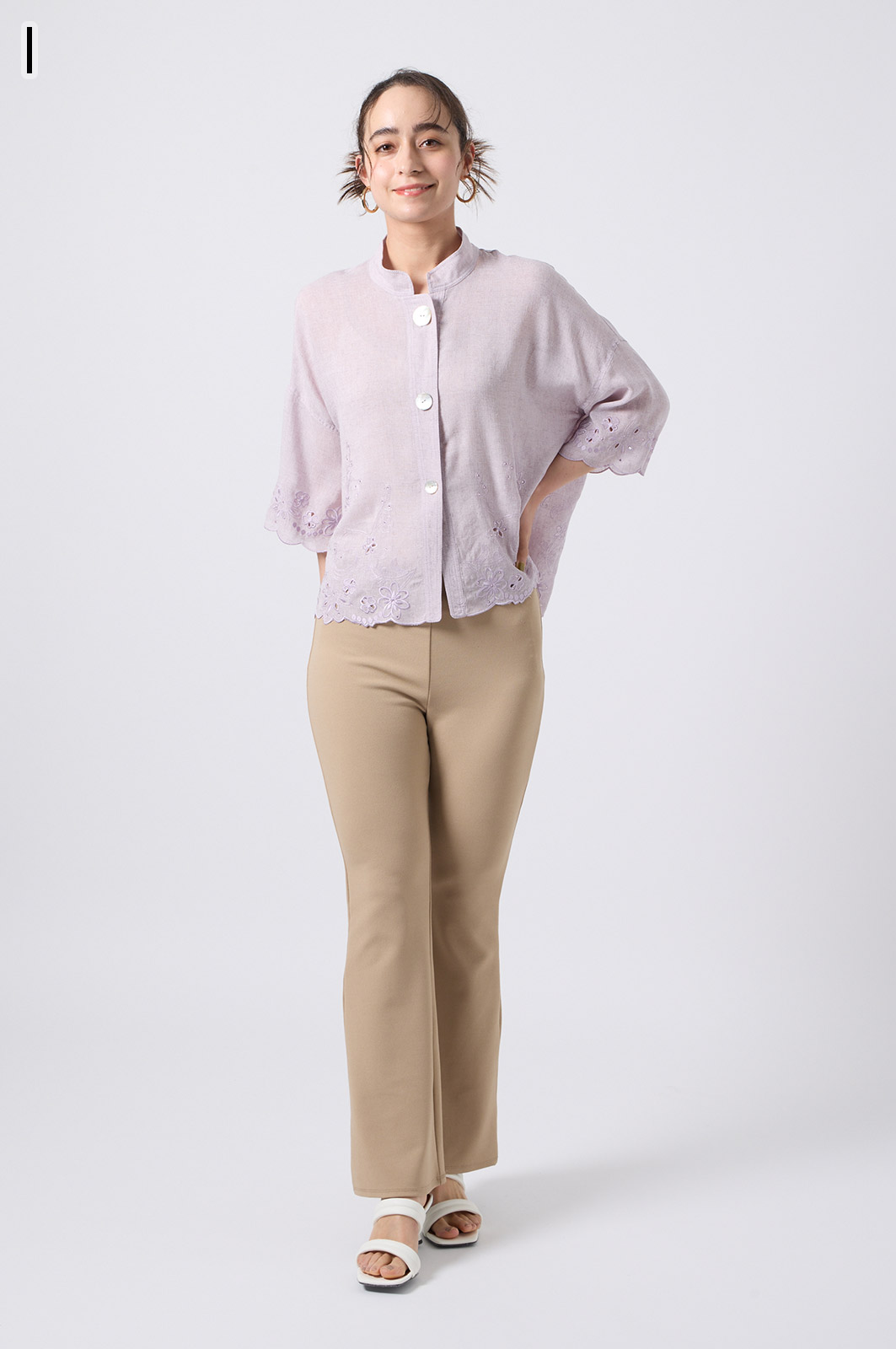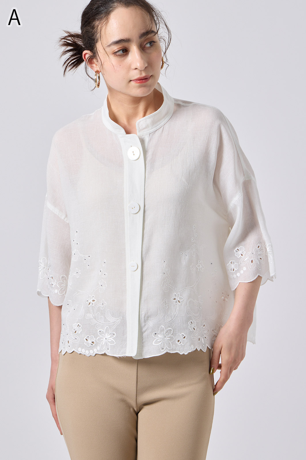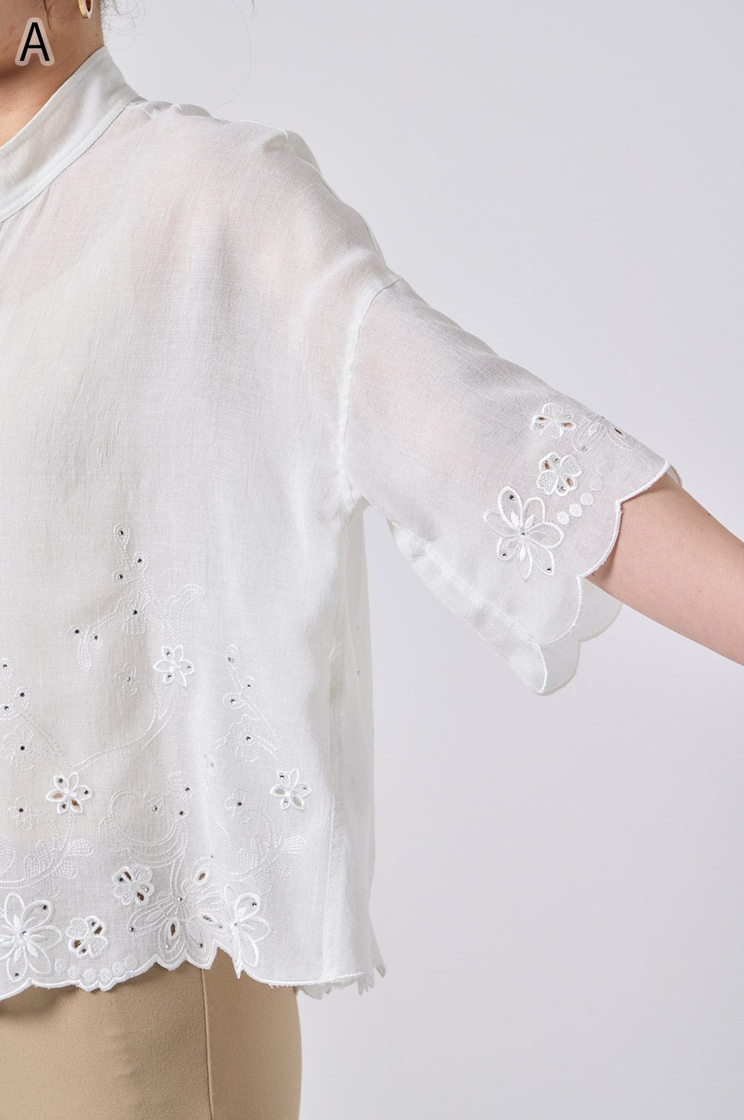 初夏にぴったりの涼しげでお手入れ簡単な素材を使用。短め丈でふんわり広がるデザインに、透かし模様をあしらった、上品で軽やかな印象のブラウスです。
