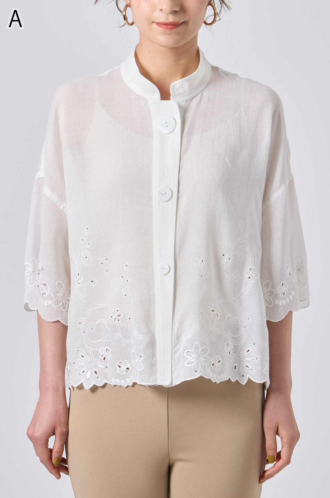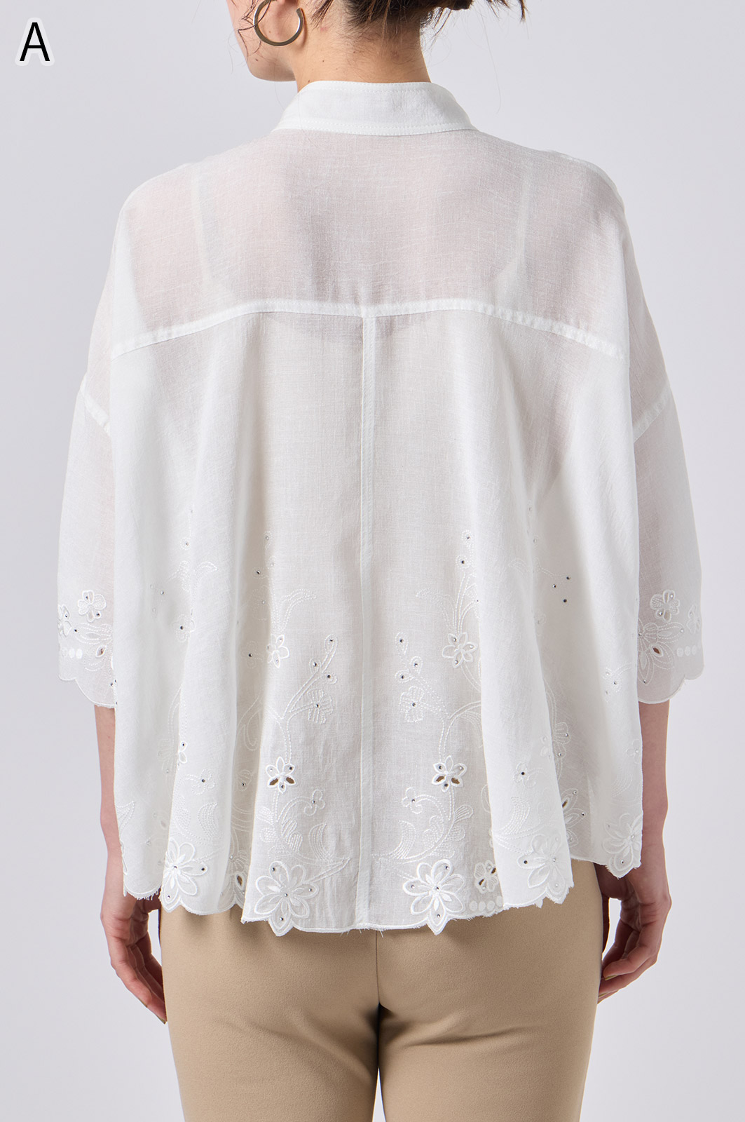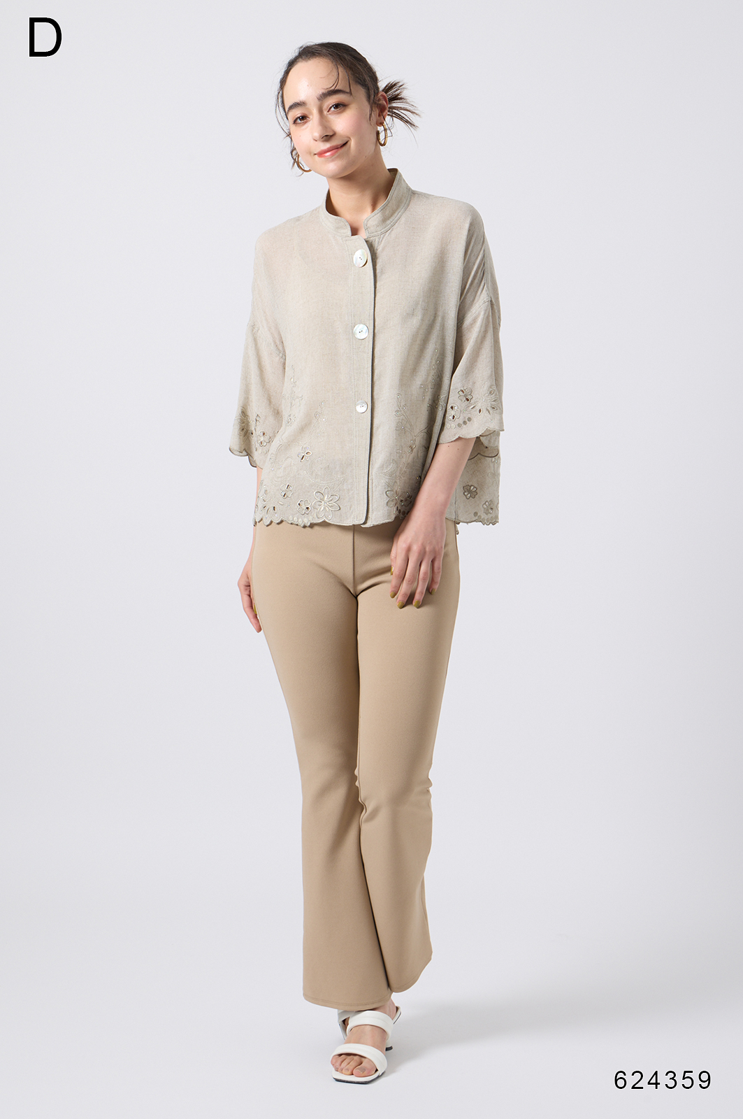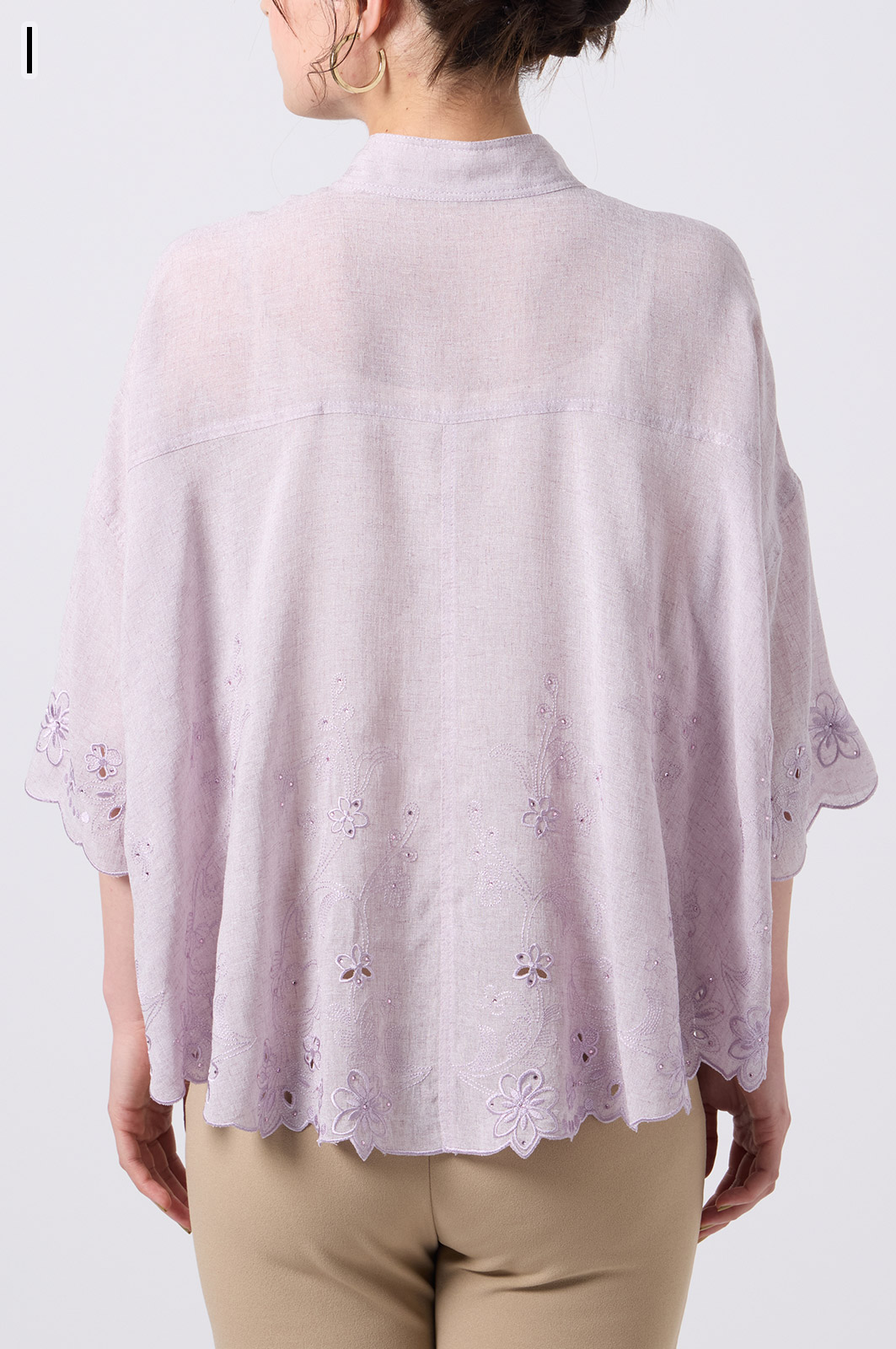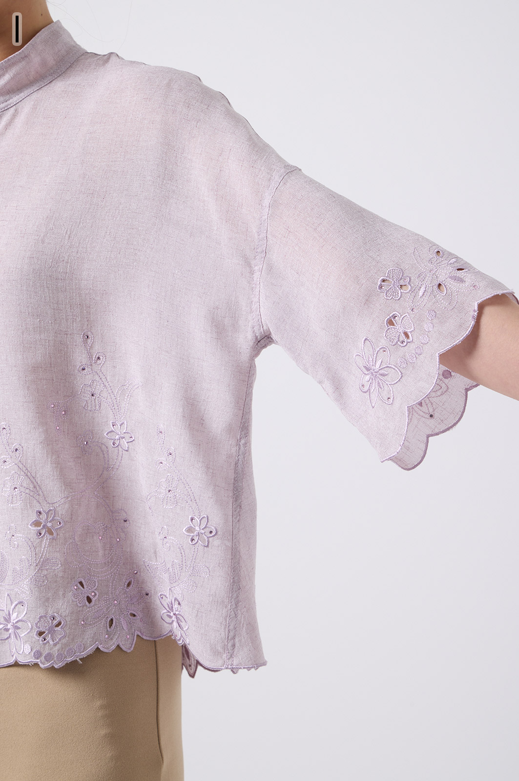 初夏にぴったりの涼しげでお手入れ簡単な素材を使用。短め丈でふんわり広がるデザインに、透かし模様をあしらった、上品で軽やかな印象のブラウスです。