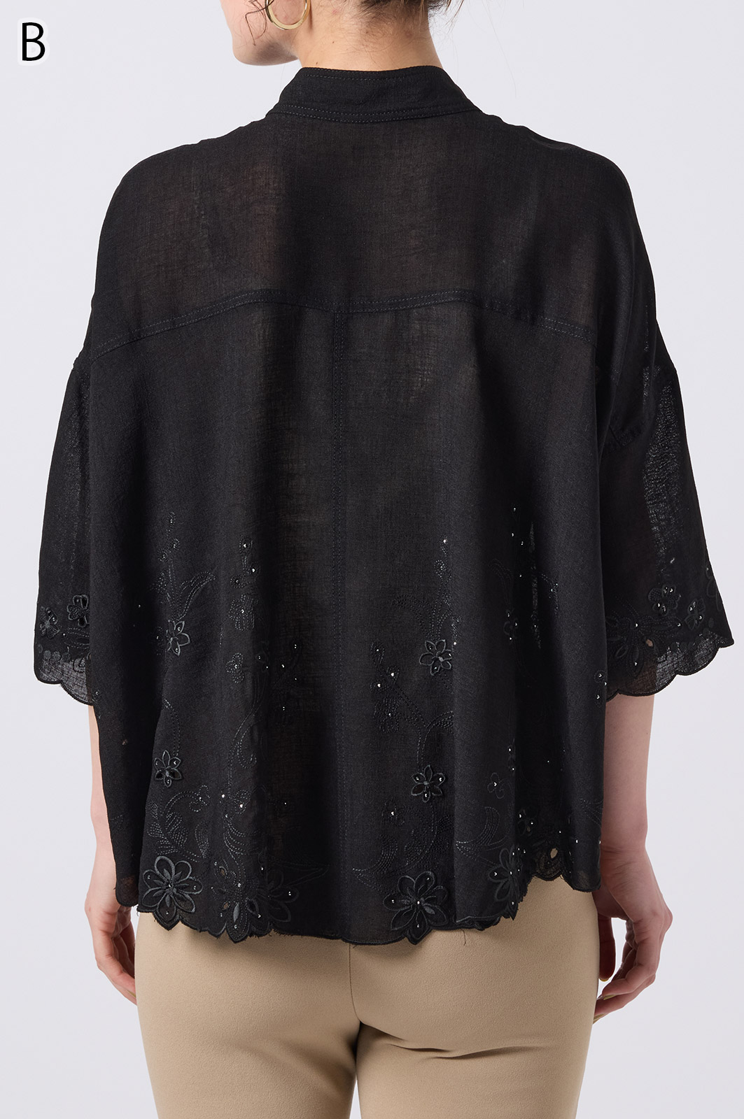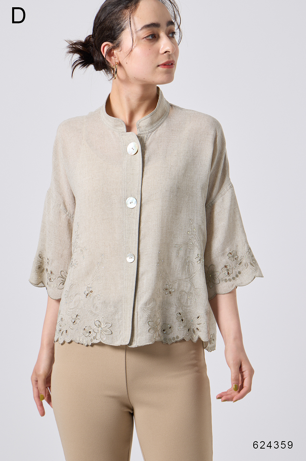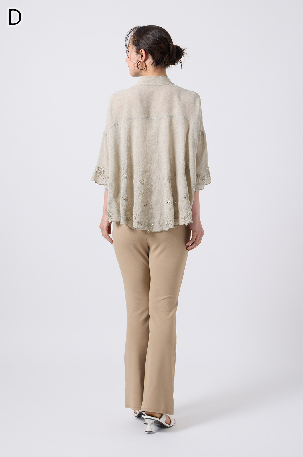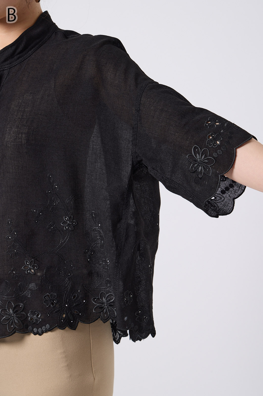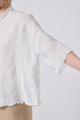 初夏にぴったりの涼しげでお手入れ簡単な素材を使用。短め丈でふんわり広がるデザインに、透かし模様をあしらった、上品で軽やかな印象のブラウスです。