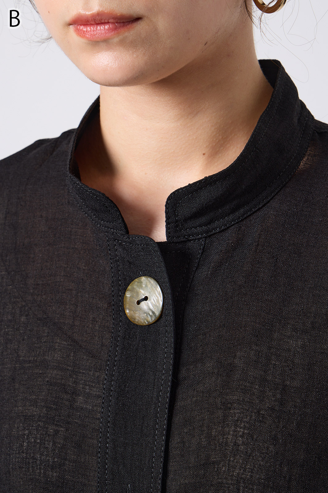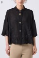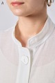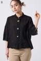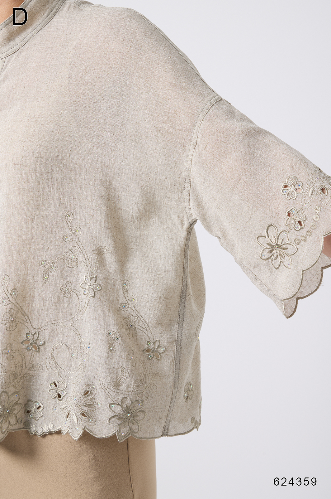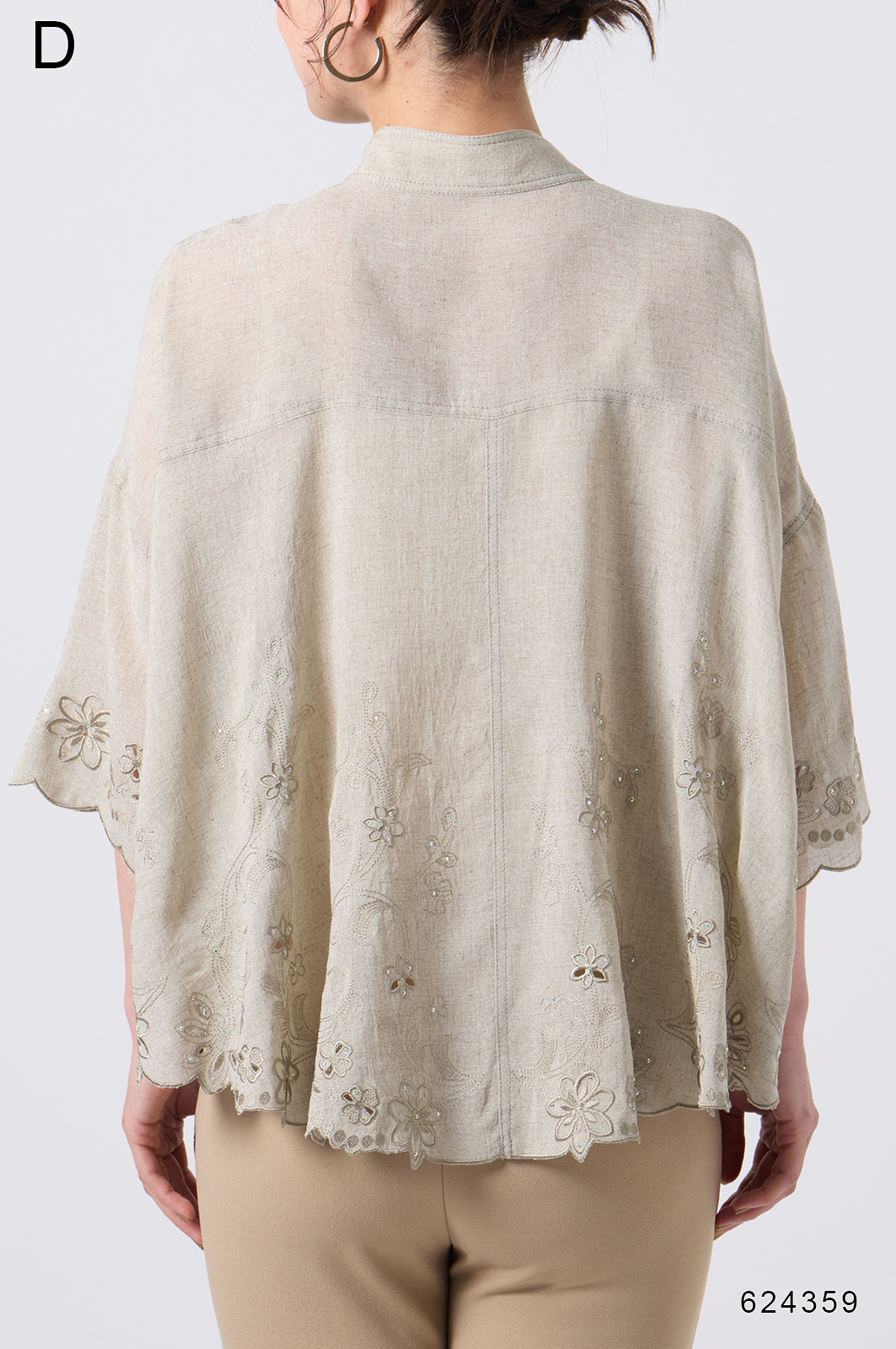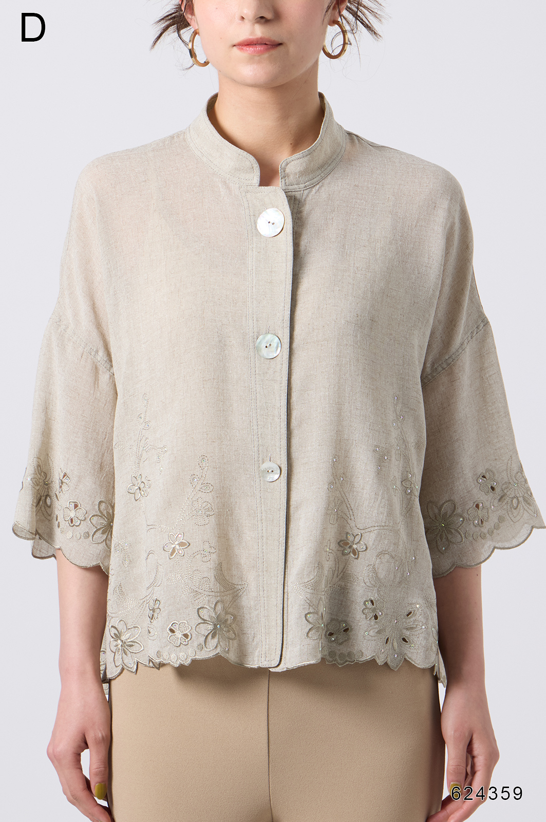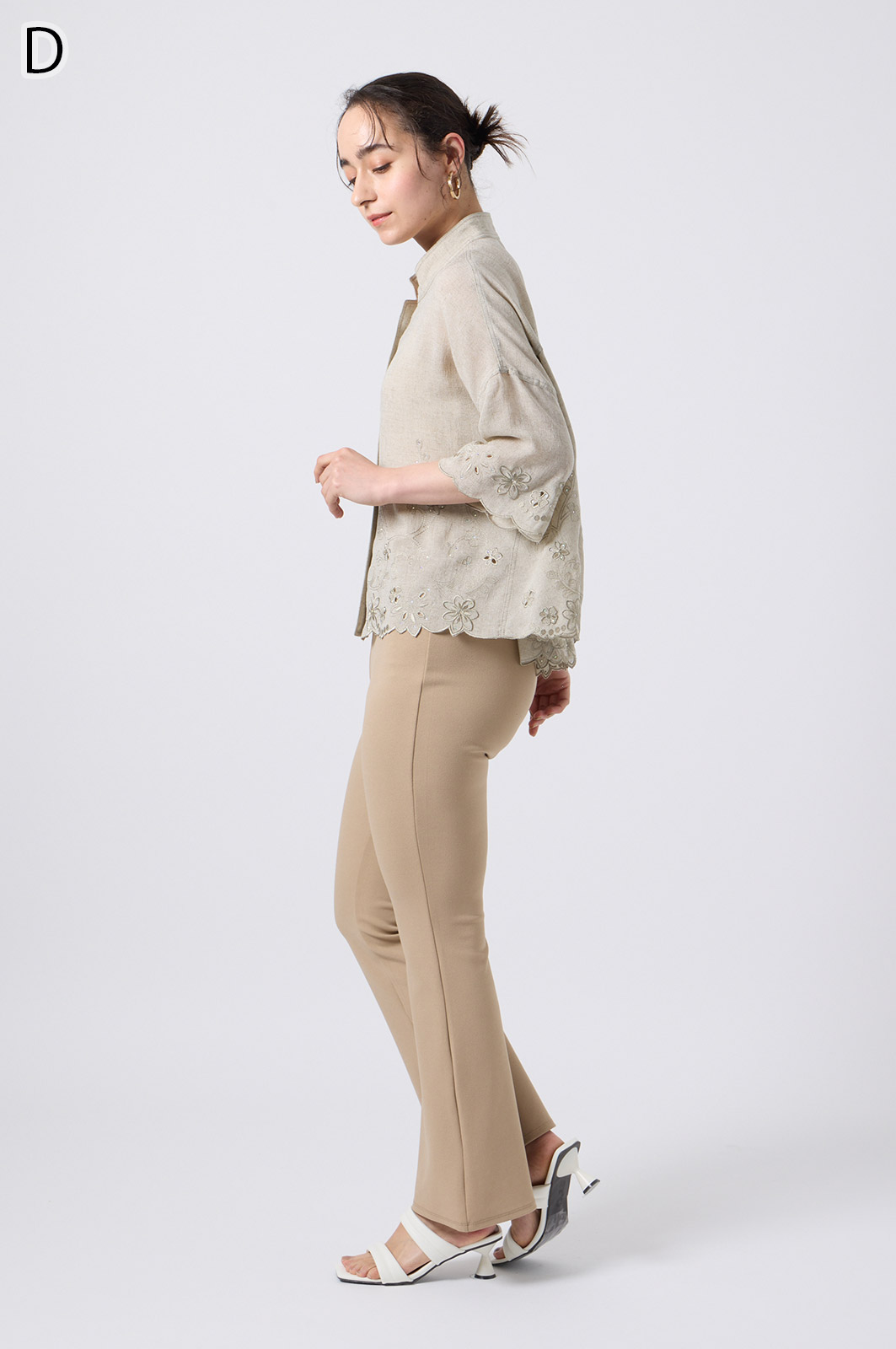 初夏にぴったりの涼しげでお手入れ簡単な素材を使用。短め丈でふんわり広がるデザインに、透かし模様をあしらった、上品で軽やかな印象のブラウスです。