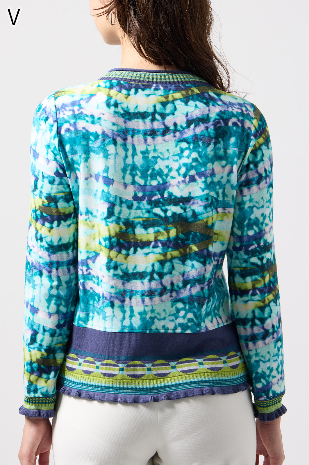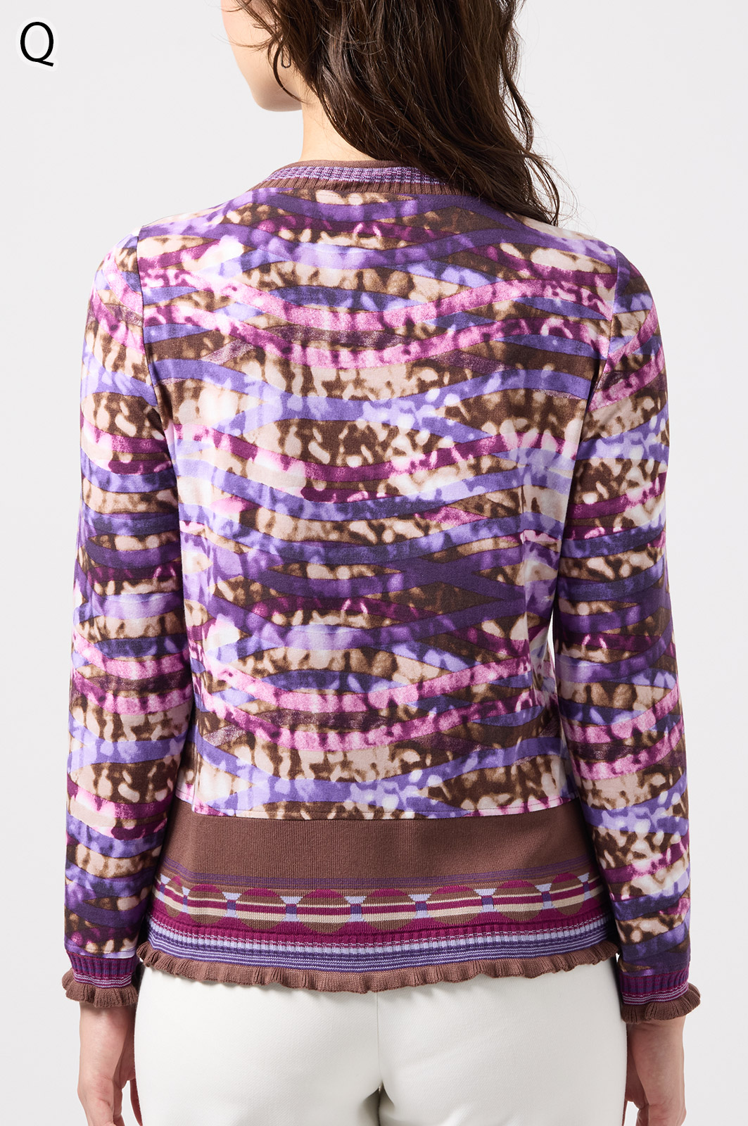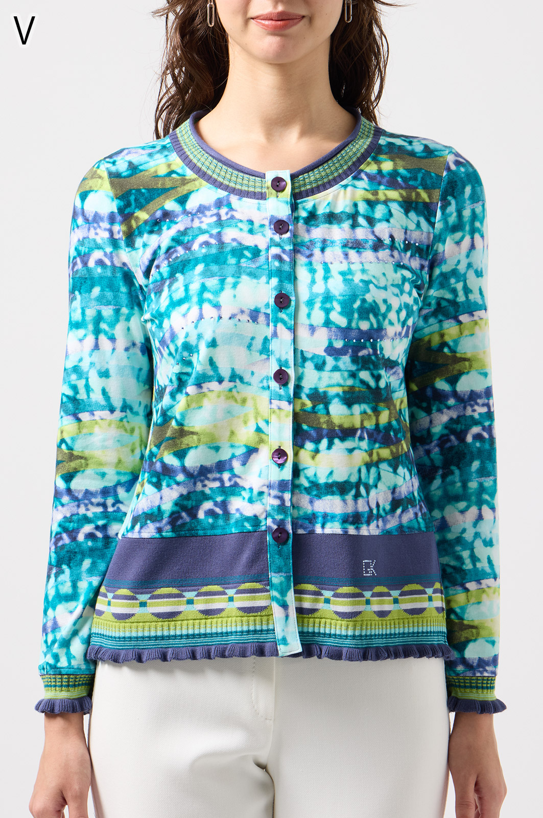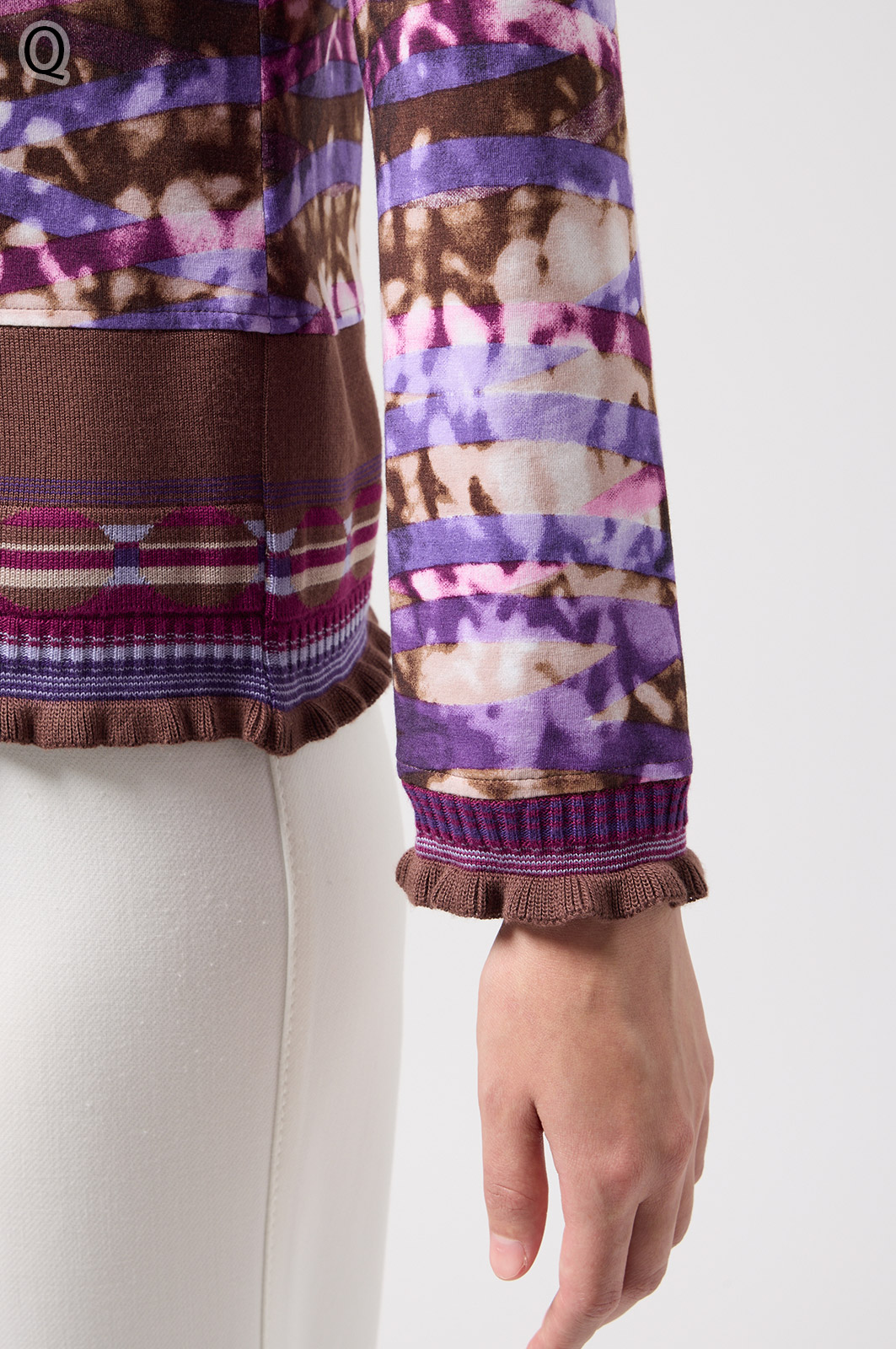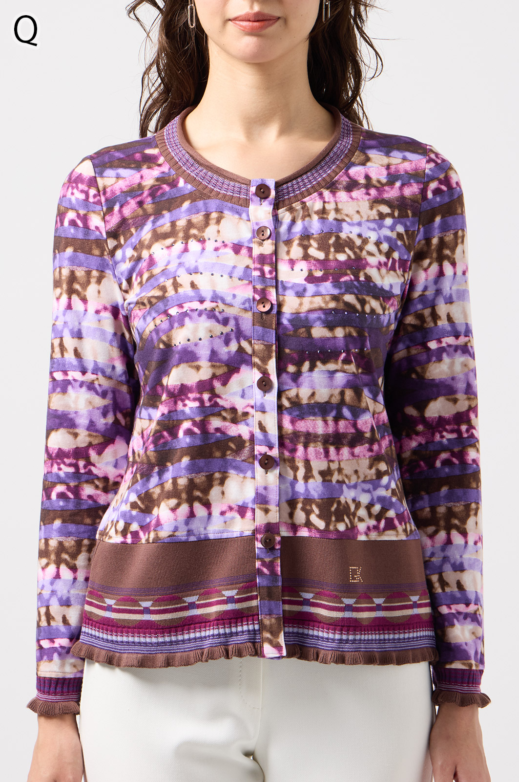 フリルの付いたカラフルな編み模様が衿ぐりや袖口、裾を彩る前開きブラウス。前を開ければ軽やかなカーディガン風に、閉じれば華やかなTシャツ風に着こなせる便利な一枚です。