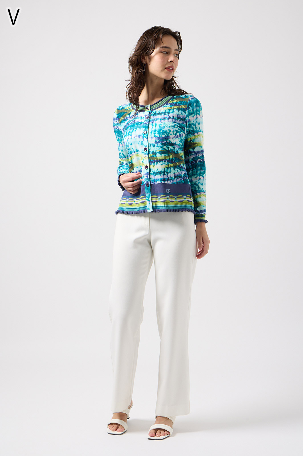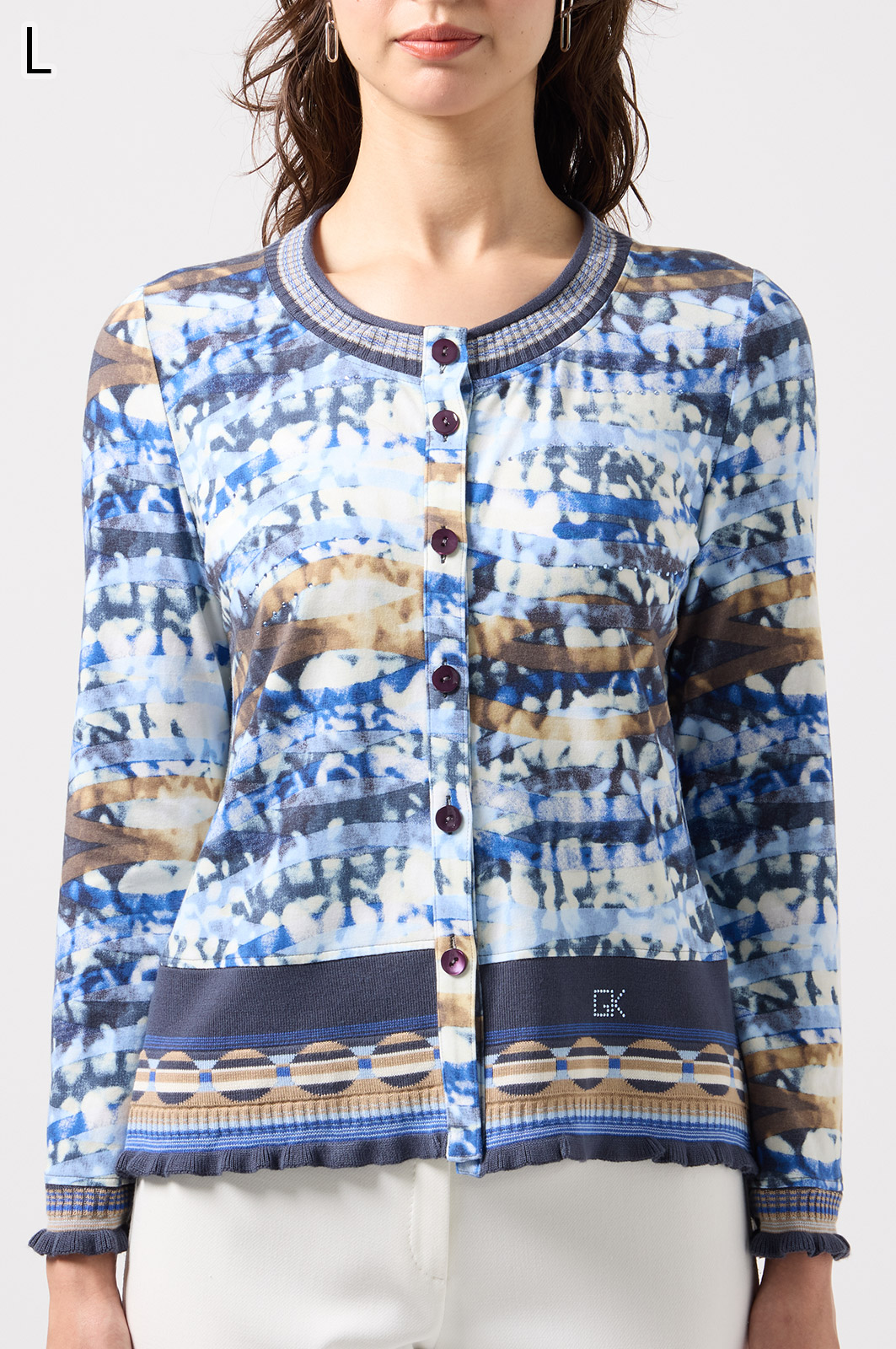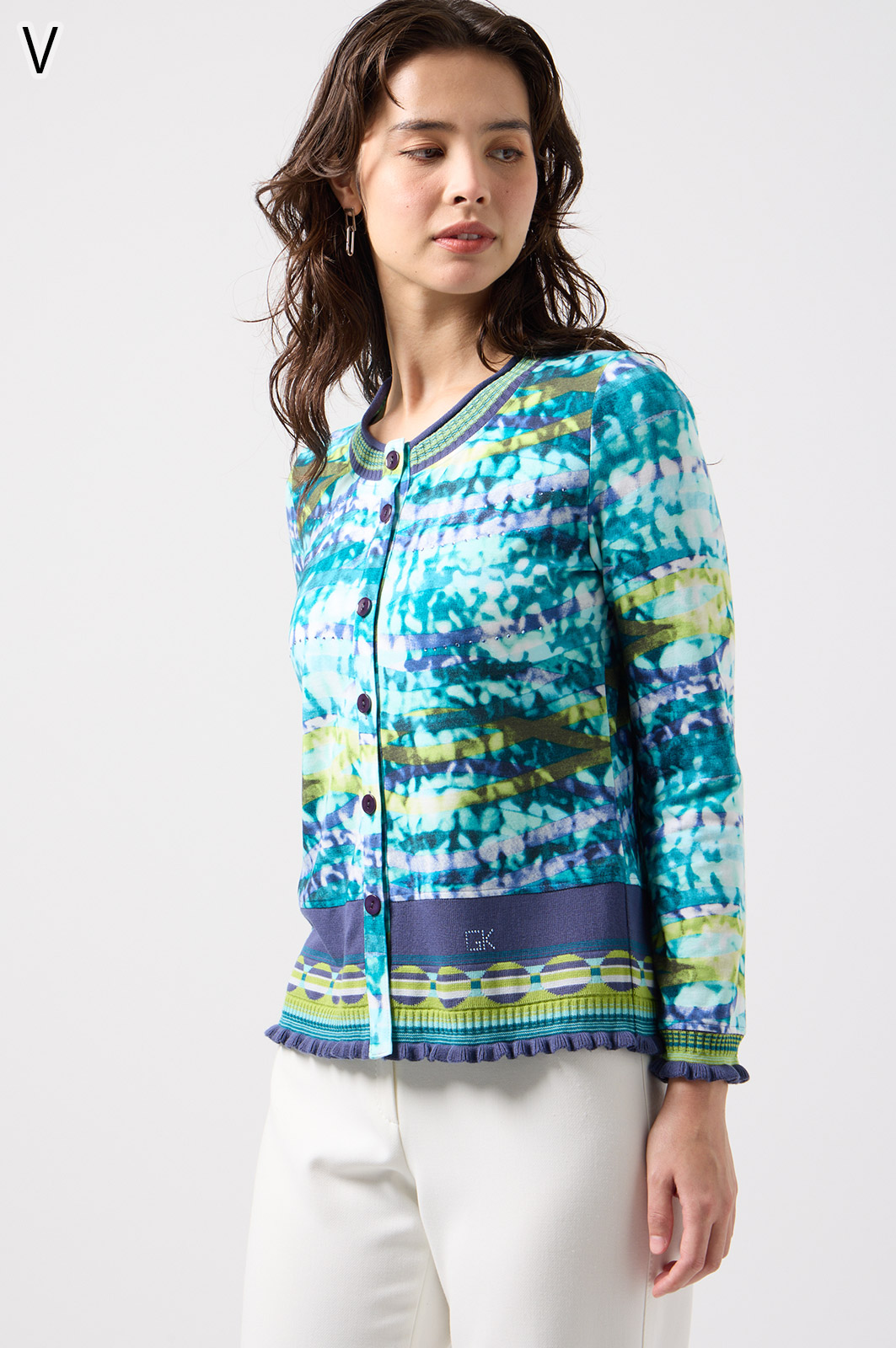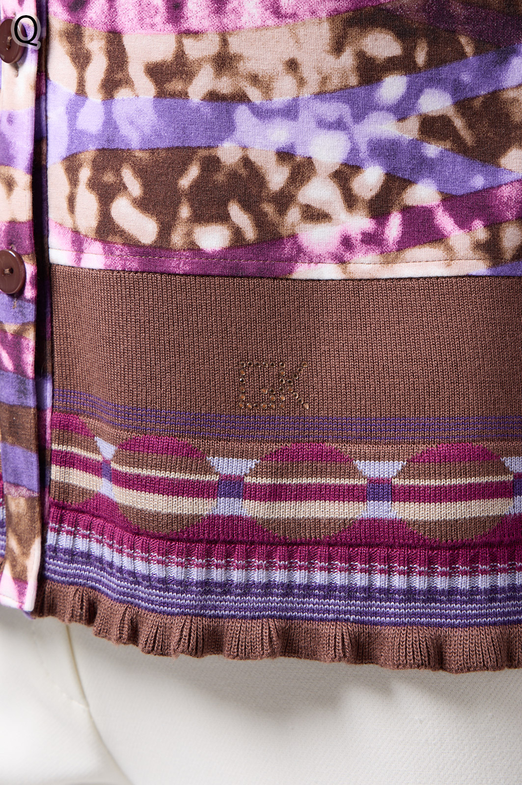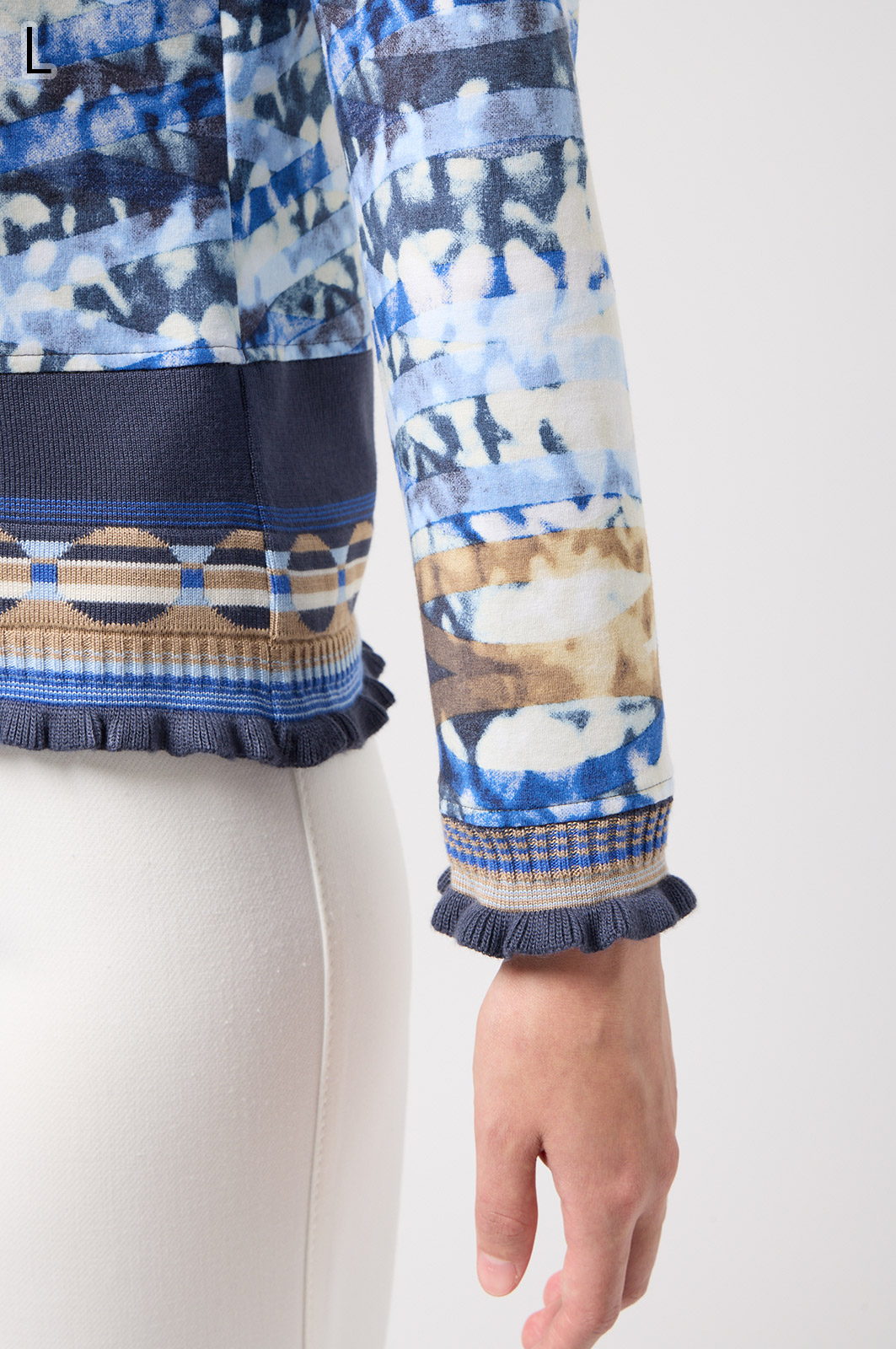 フリルの付いたカラフルな編み模様が衿ぐりや袖口、裾を彩る前開きブラウス。前を開ければ軽やかなカーディガン風に、閉じれば華やかなTシャツ風に着こなせる便利な一枚です。