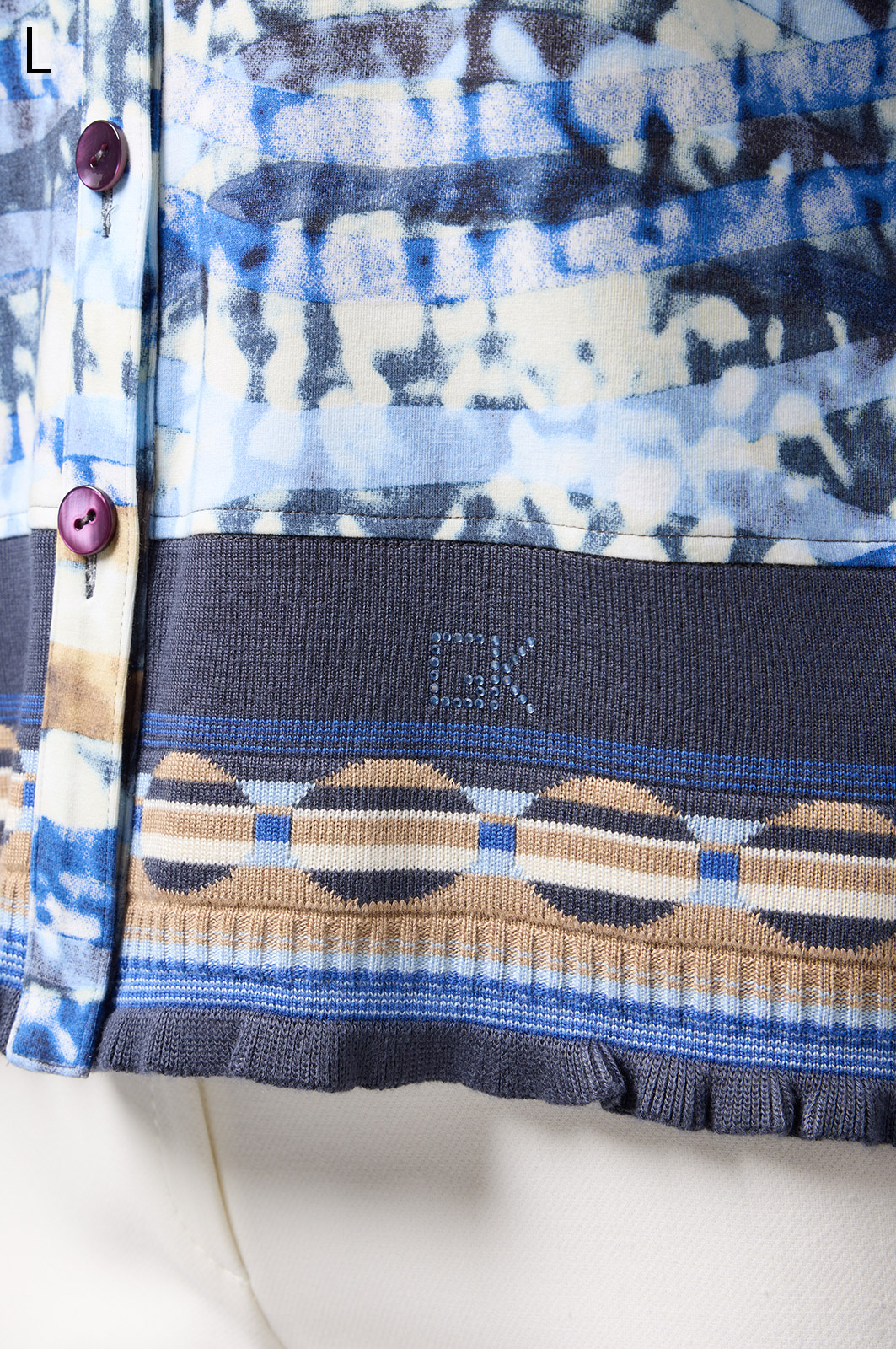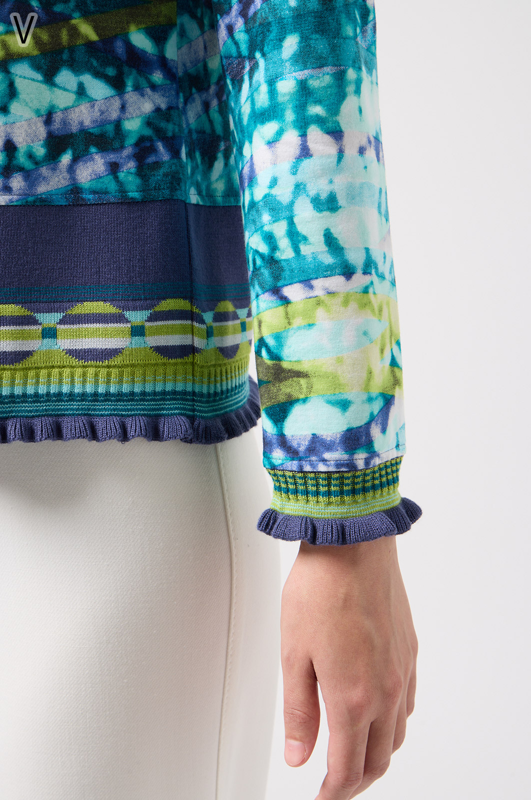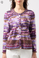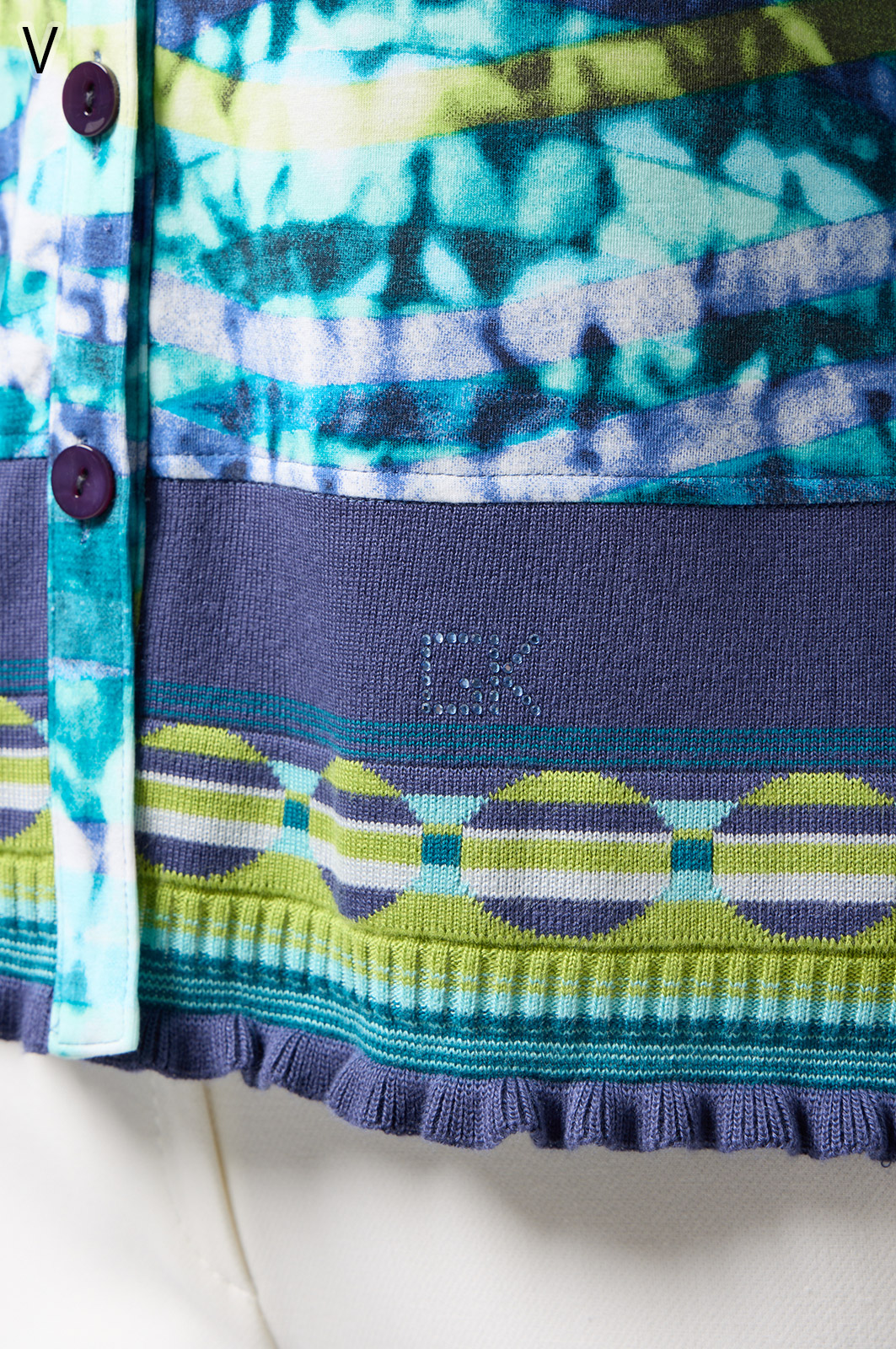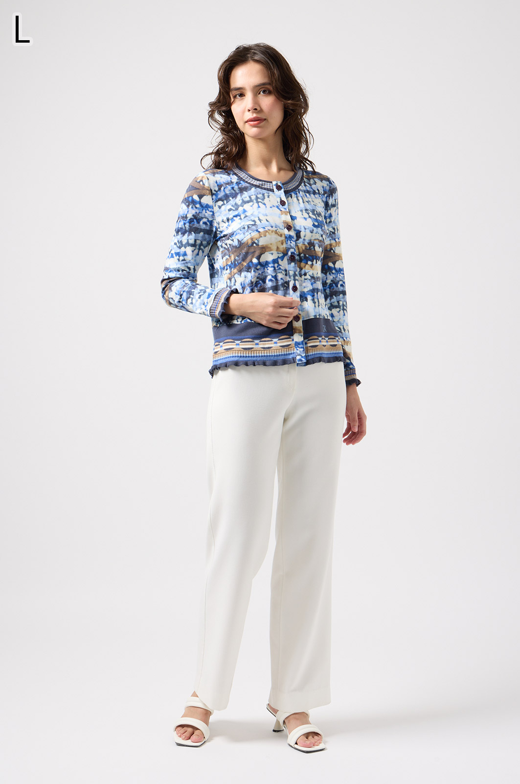フリルの付いたカラフルな編み模様が衿ぐりや袖口、裾を彩る前開きブラウス。前を開ければ軽やかなカーディガン風に、閉じれば華やかなTシャツ風に着こなせる便利な一枚です。