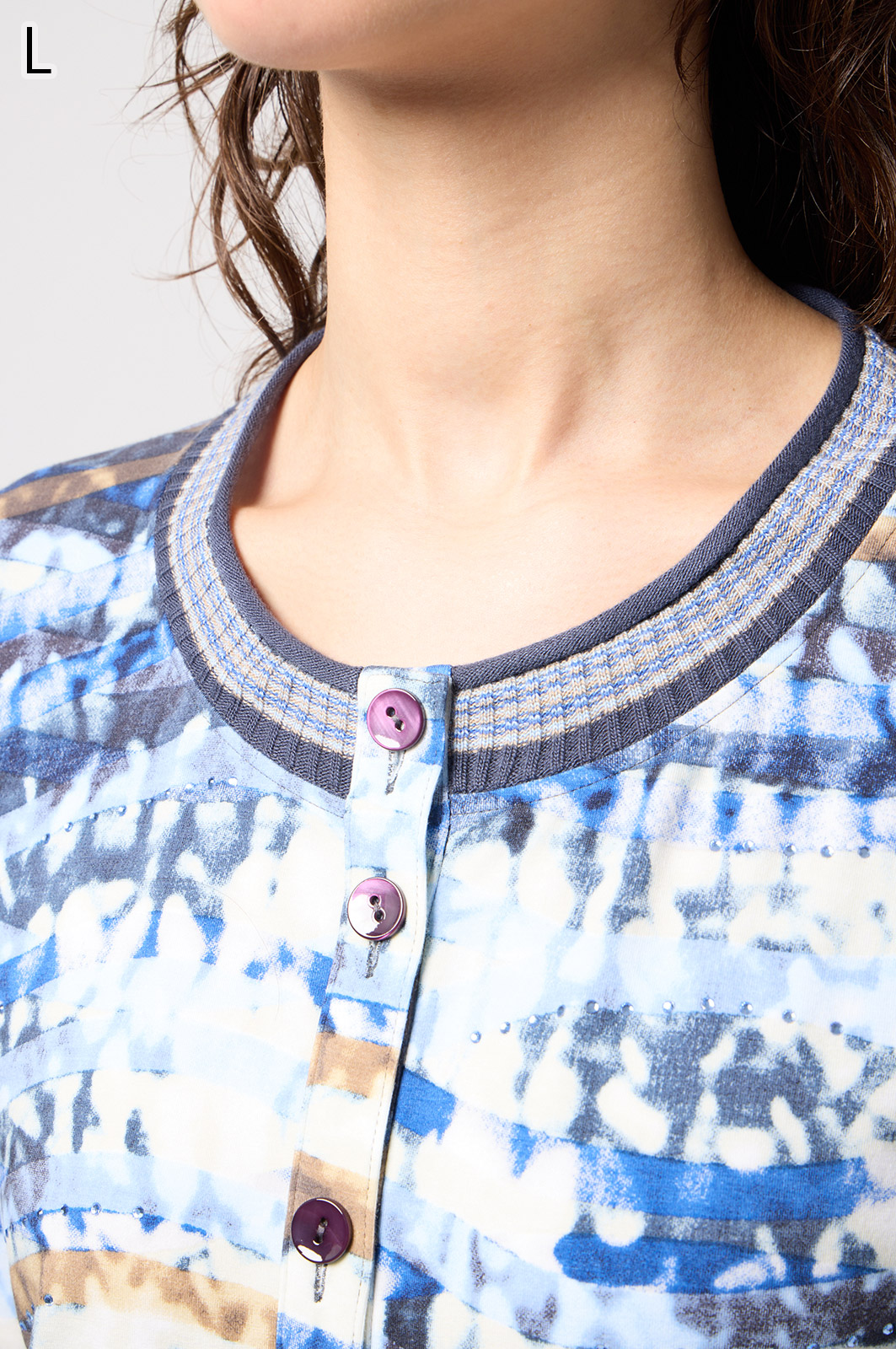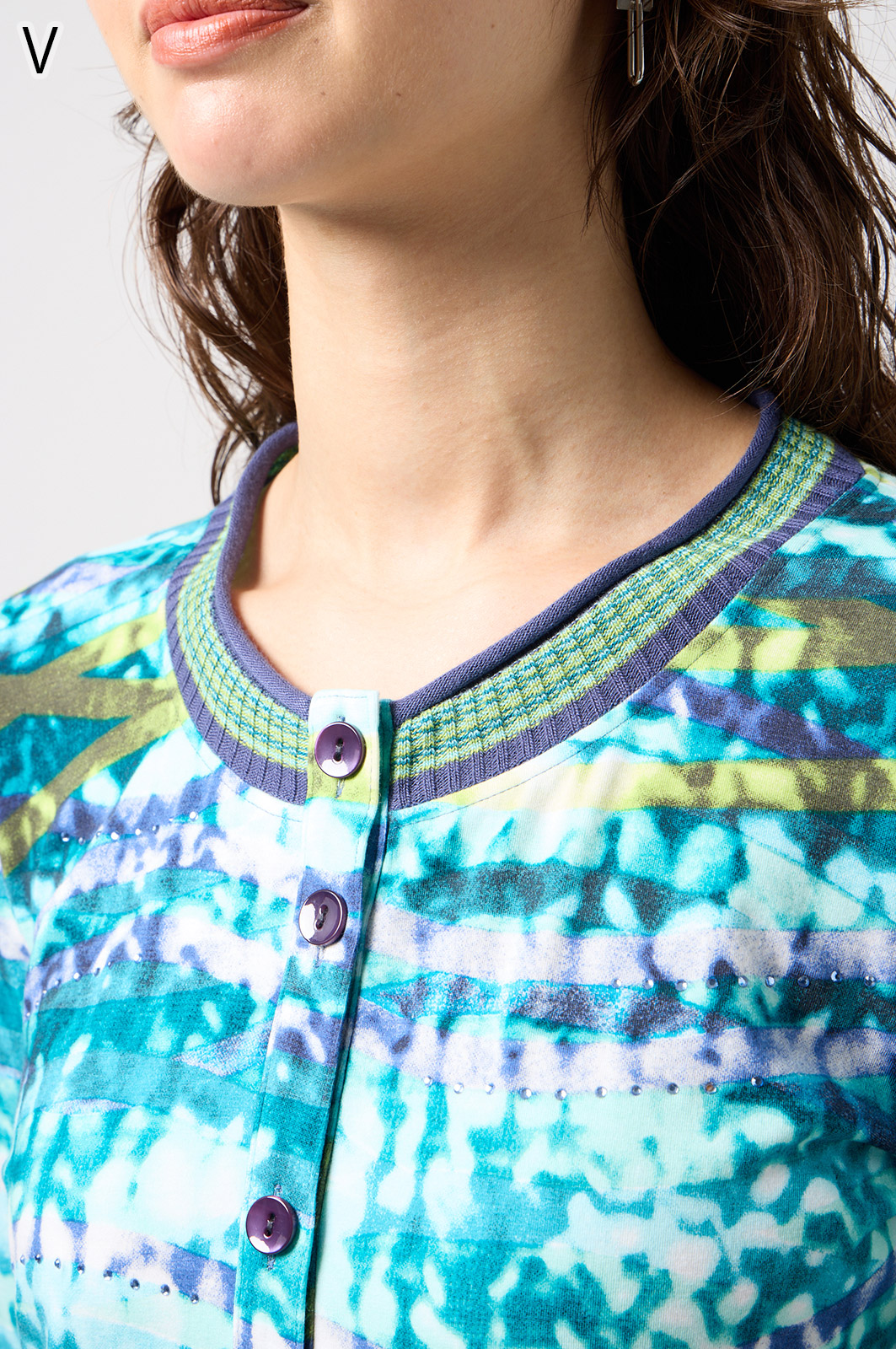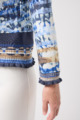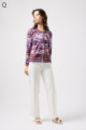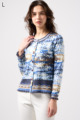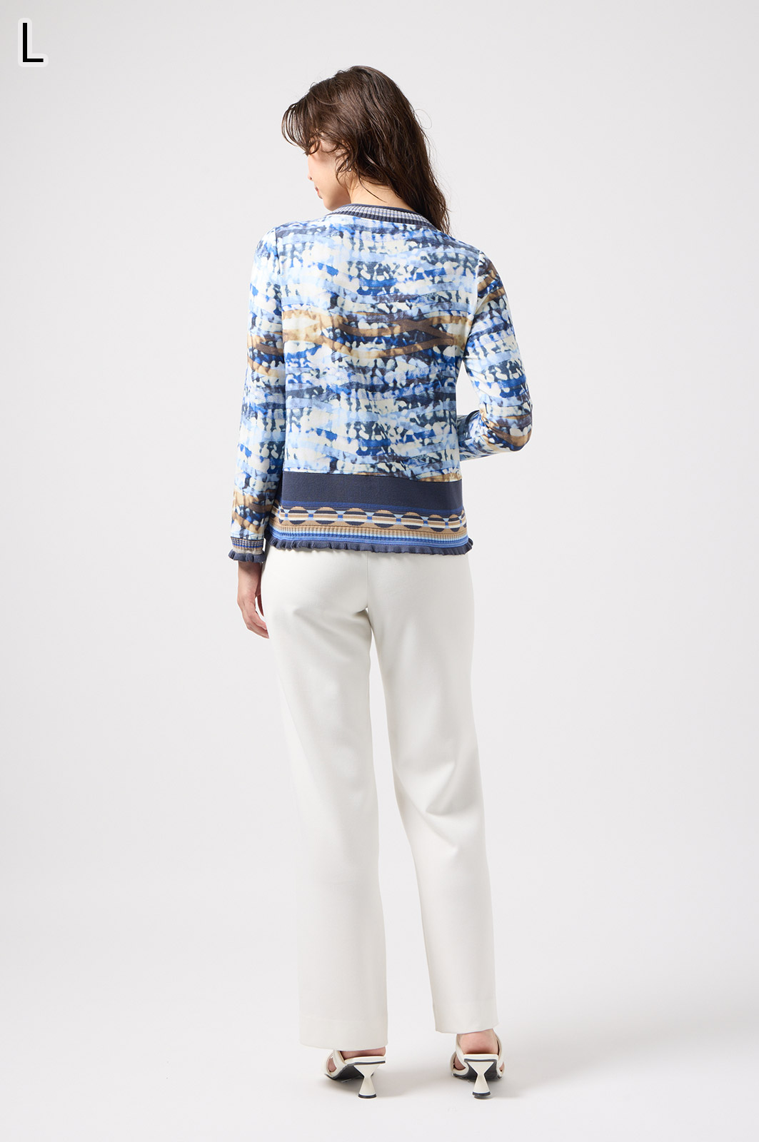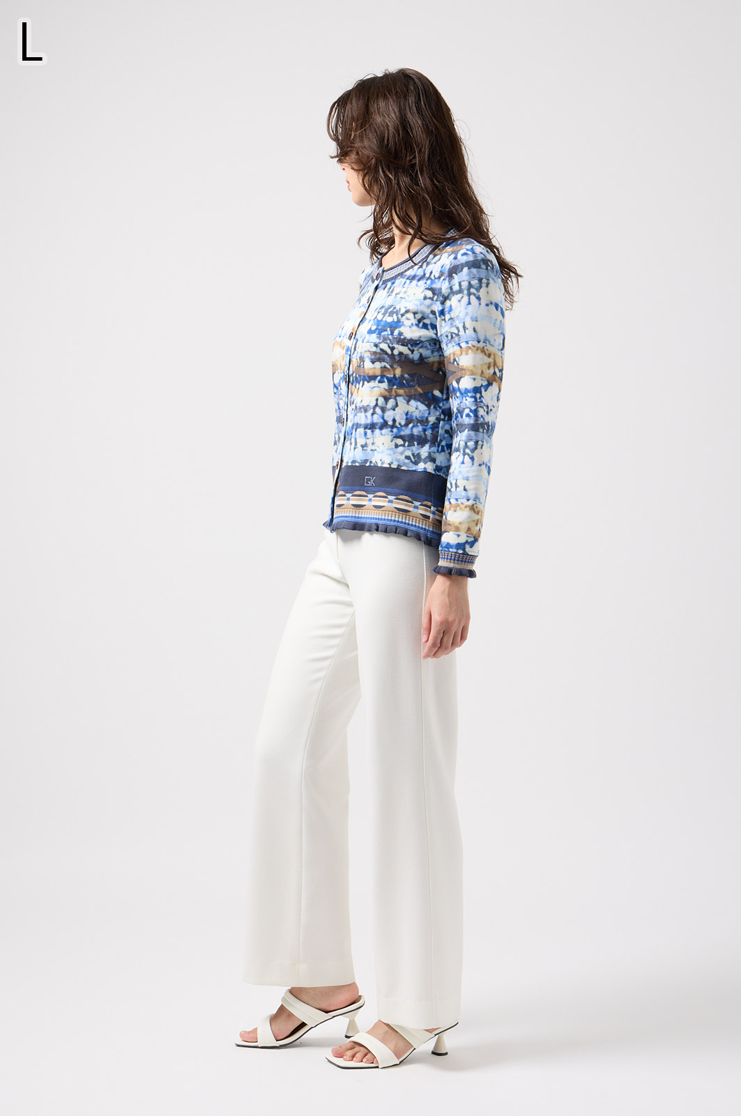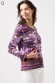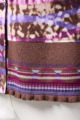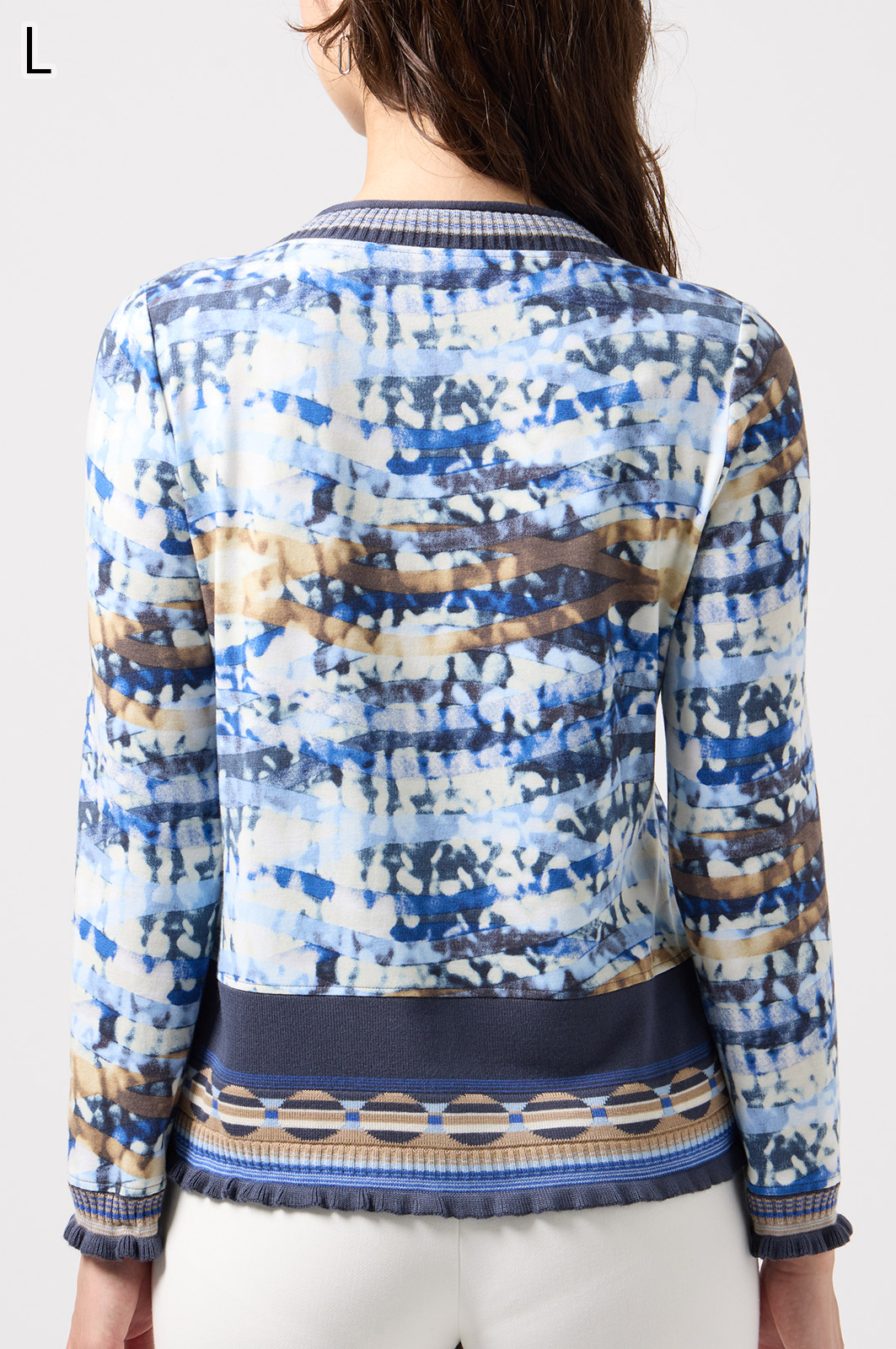 フリルの付いたカラフルな編み模様が衿ぐりや袖口、裾を彩る前開きブラウス。前を開ければ軽やかなカーディガン風に、閉じれば華やかなTシャツ風に着こなせる便利な一枚です。