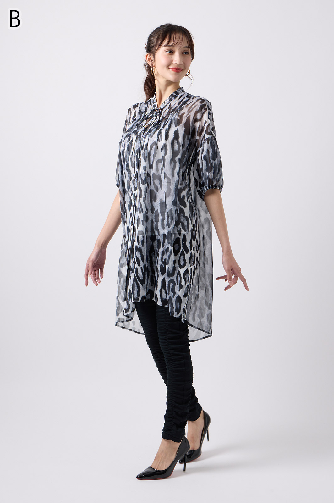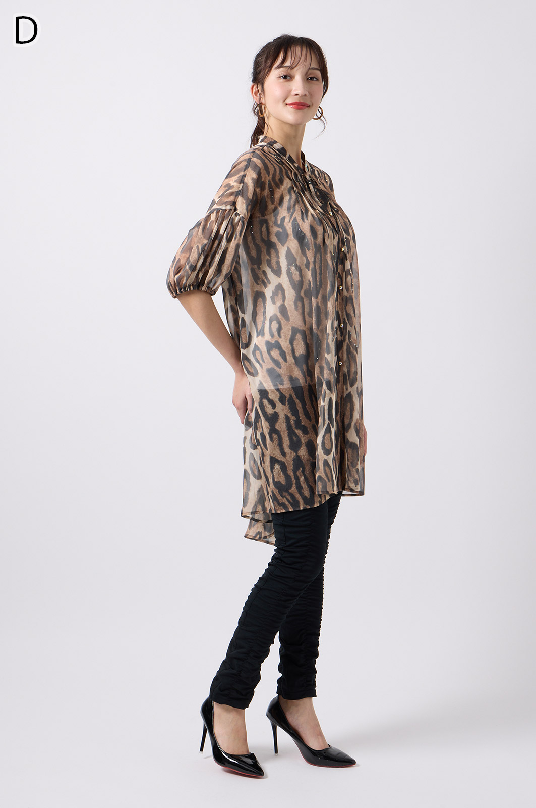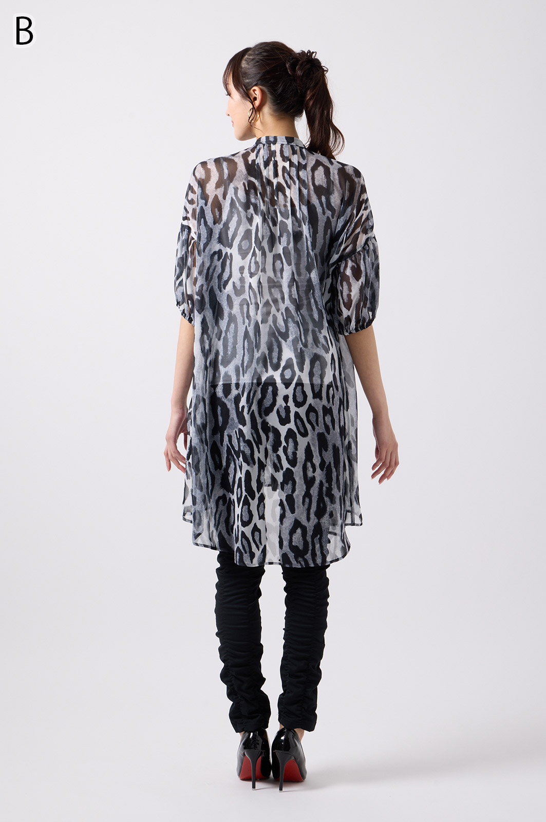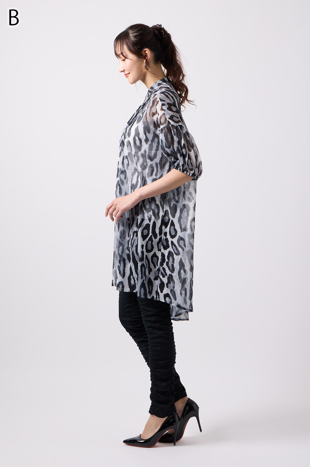 透け感のあるさらりとしたシフォン素材にジャガー柄をプリント。前後に入ったタックが立体感を生み、上品で華やかな印象のブラウスです。