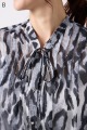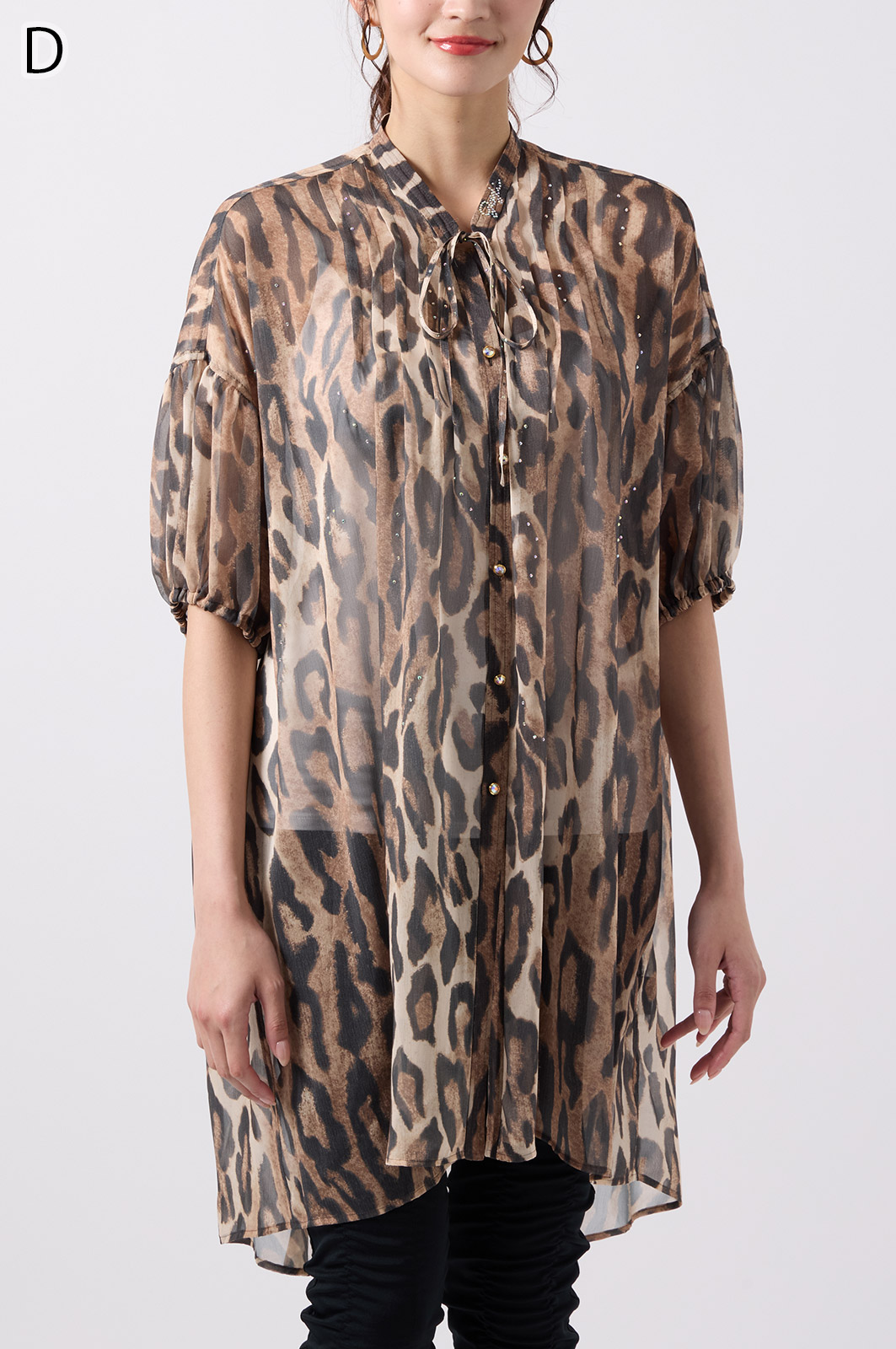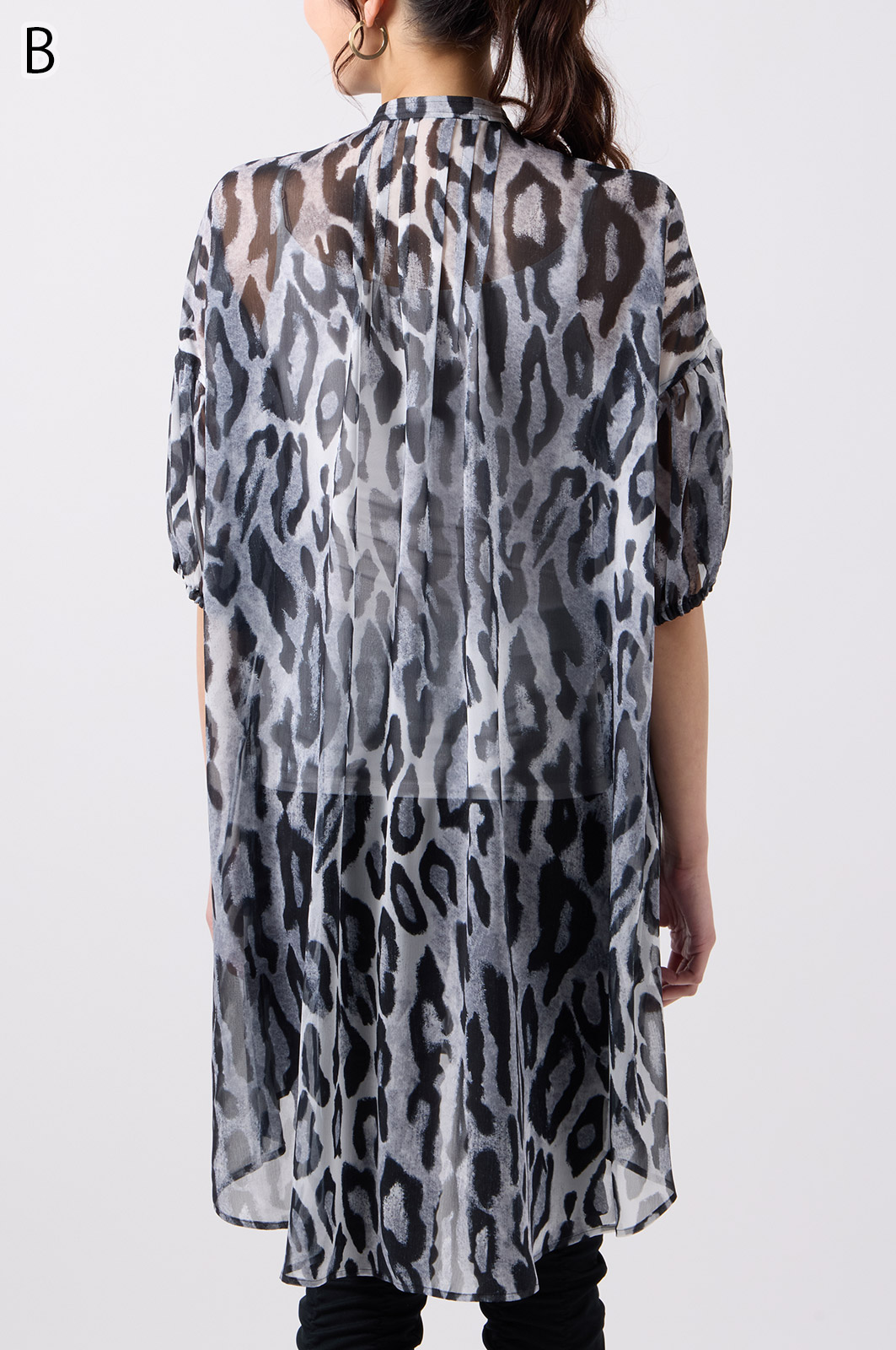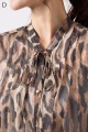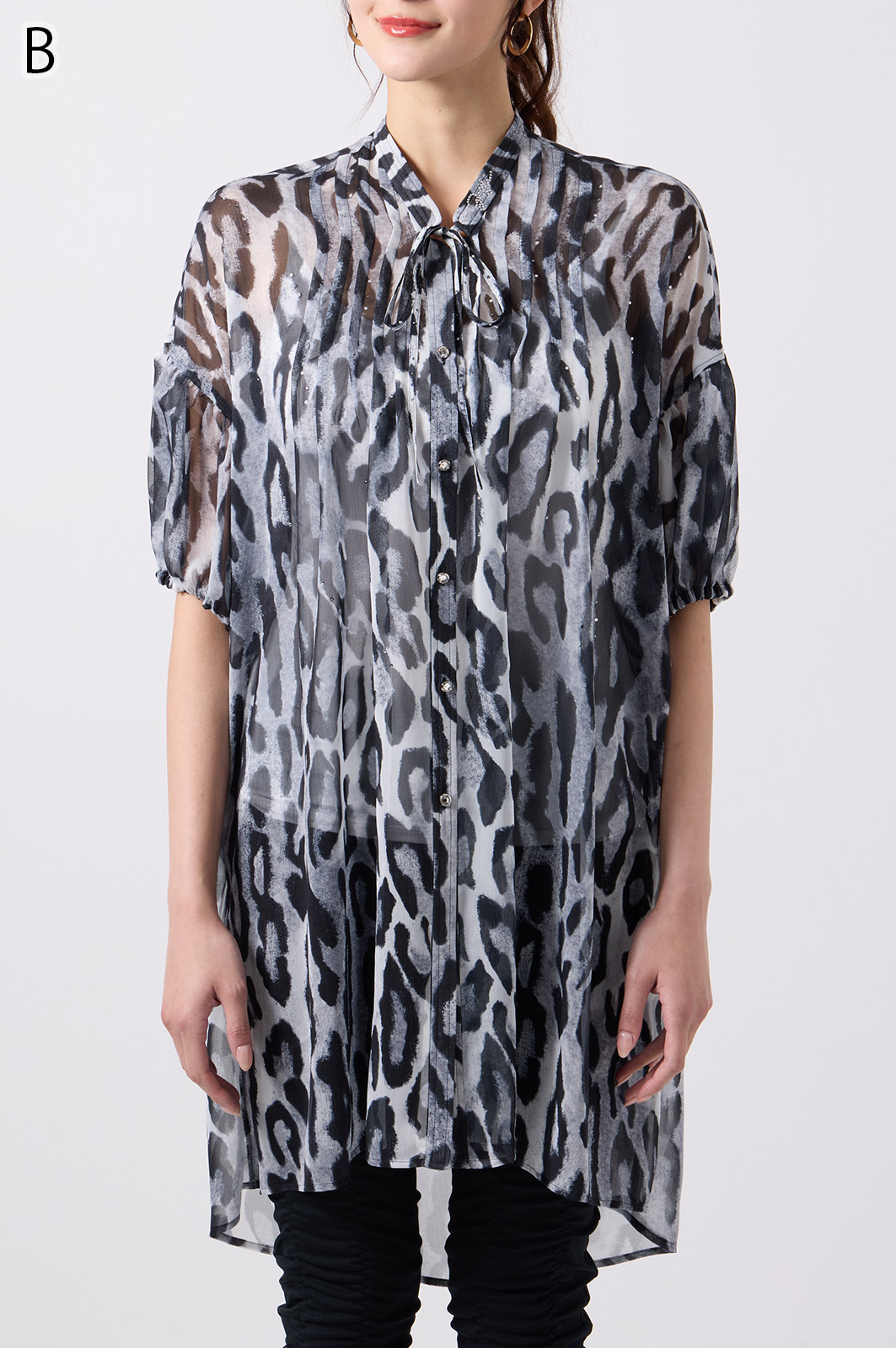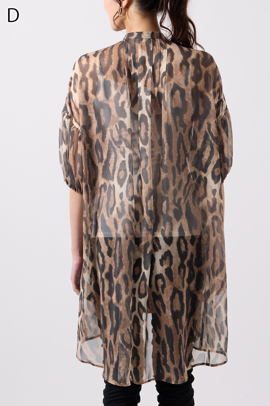 透け感のあるさらりとしたシフォン素材にジャガー柄をプリント。前後に入ったタックが立体感を生み、上品で華やかな印象のブラウスです。