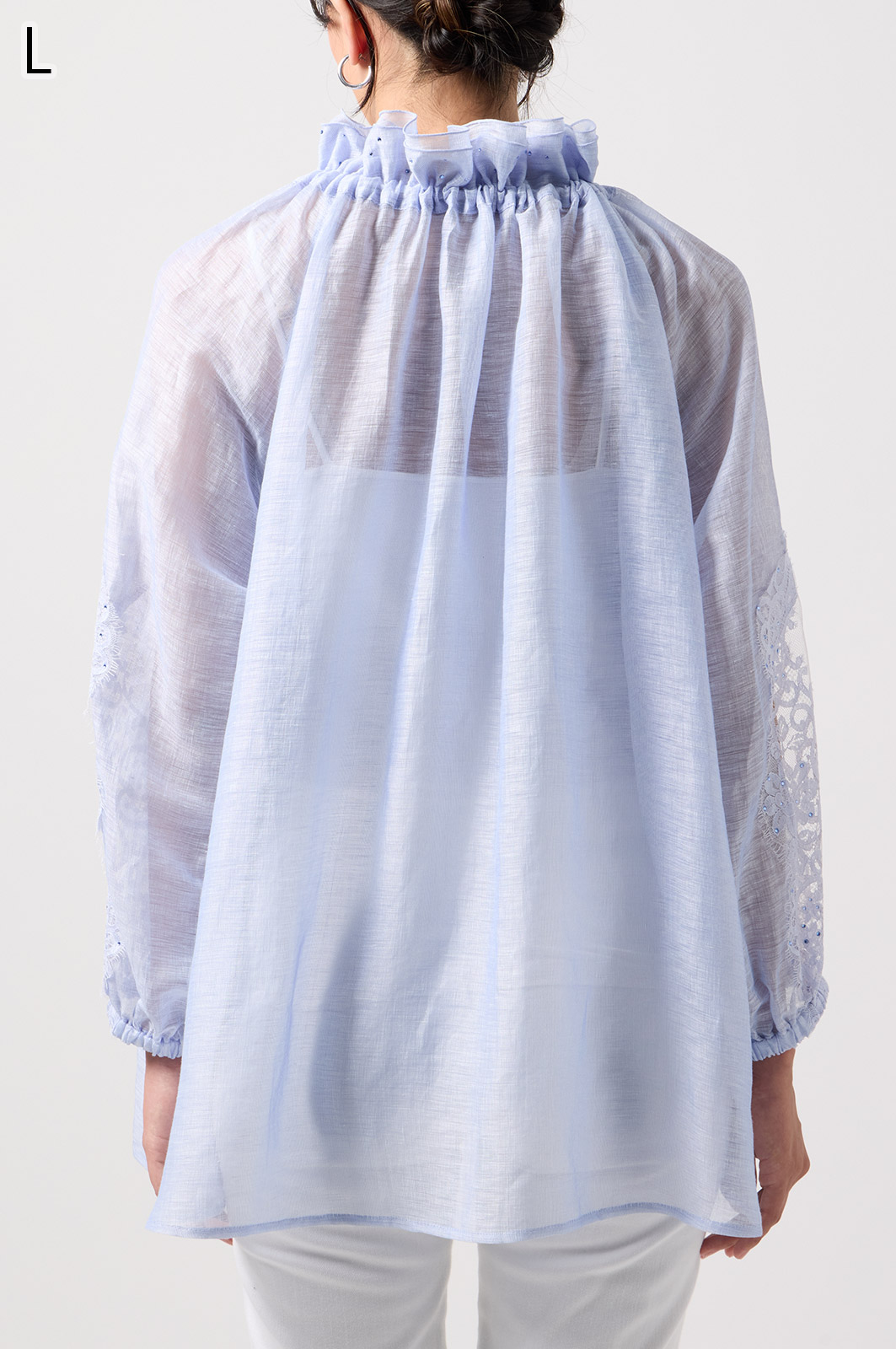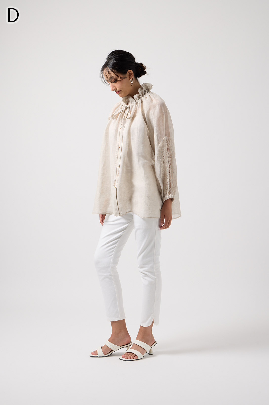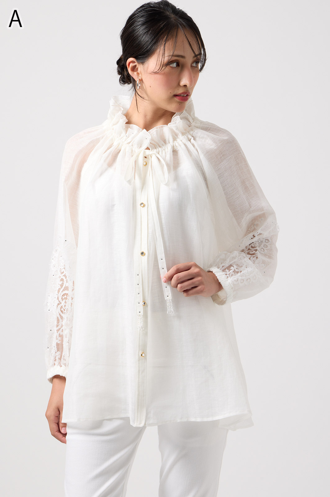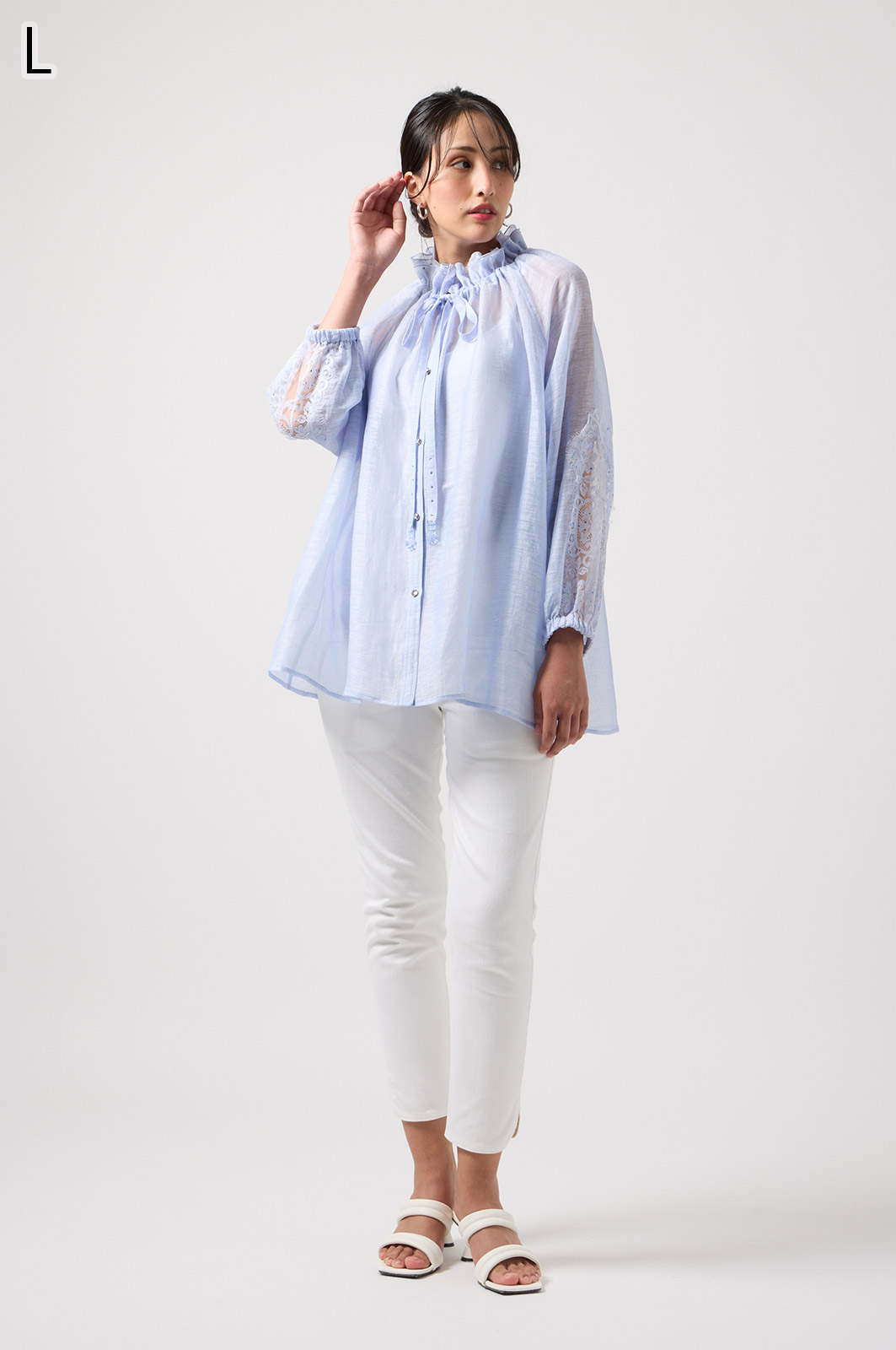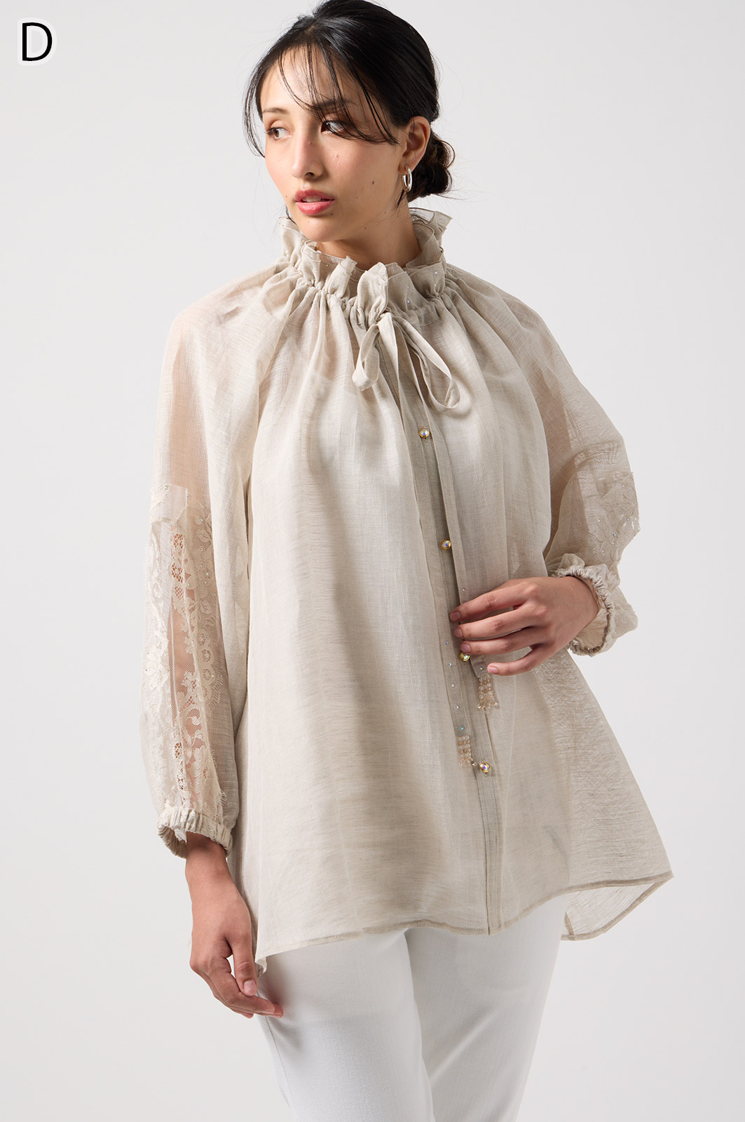 羽のように軽やかな麻入り素材を使い、衿元のフリルと袖のレースが女性らしさを引き立てる、涼しく羽織れるブラウスです。
