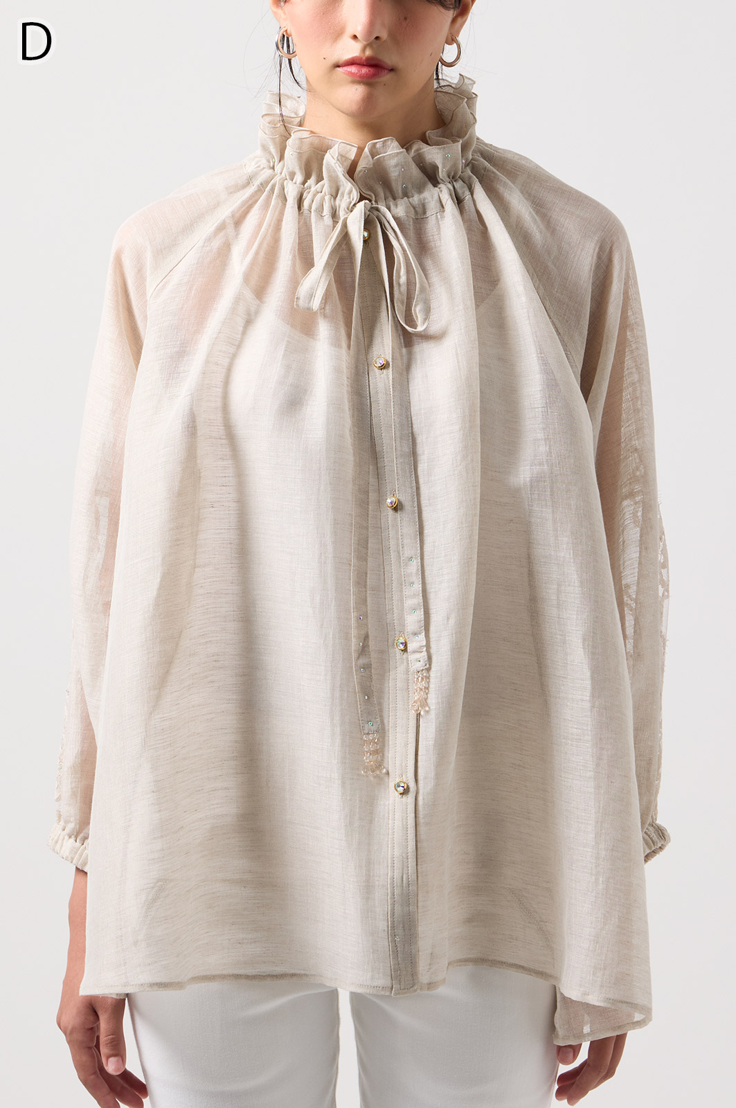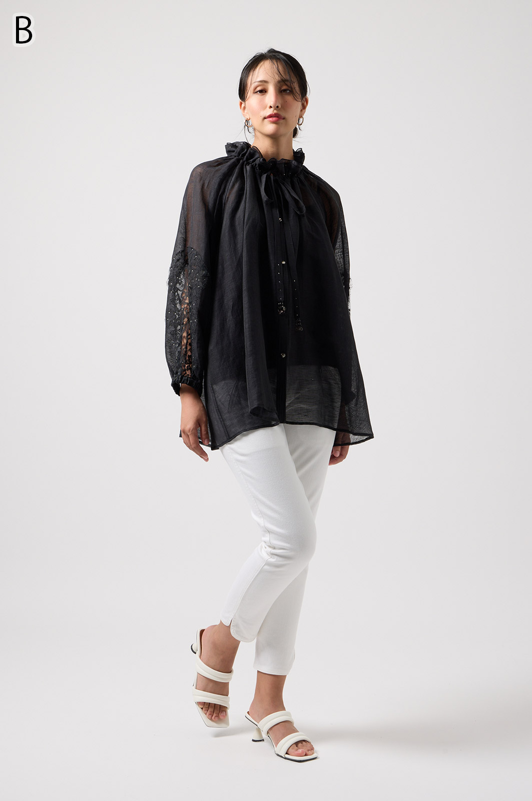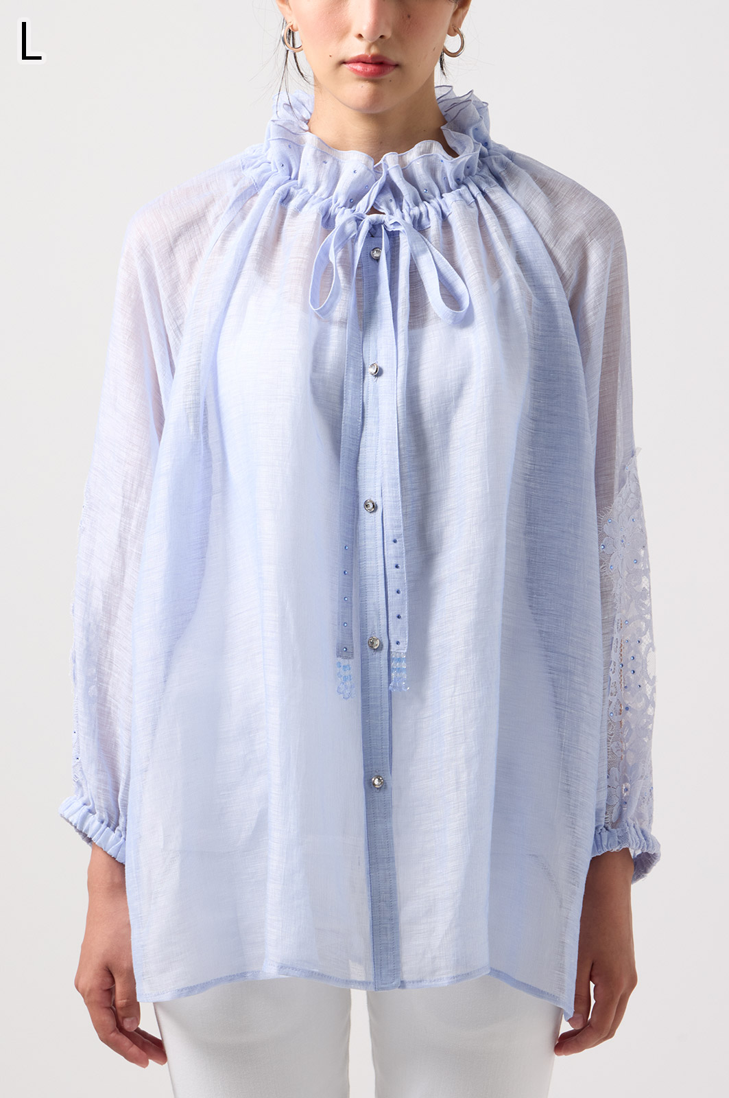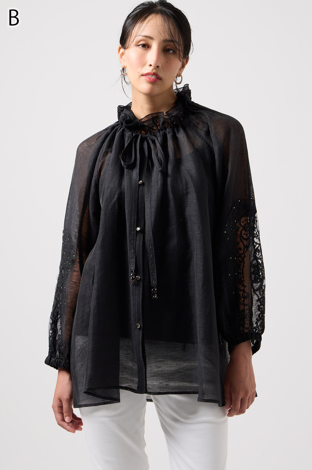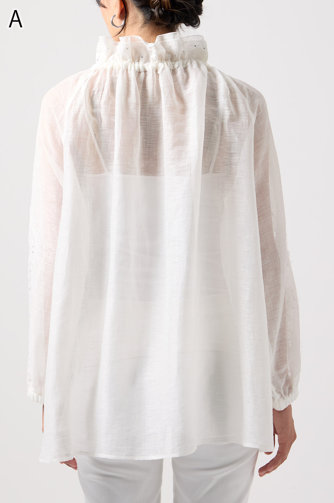 羽のように軽やかな麻入り素材を使い、衿元のフリルと袖のレースが女性らしさを引き立てる、涼しく羽織れるブラウスです。
