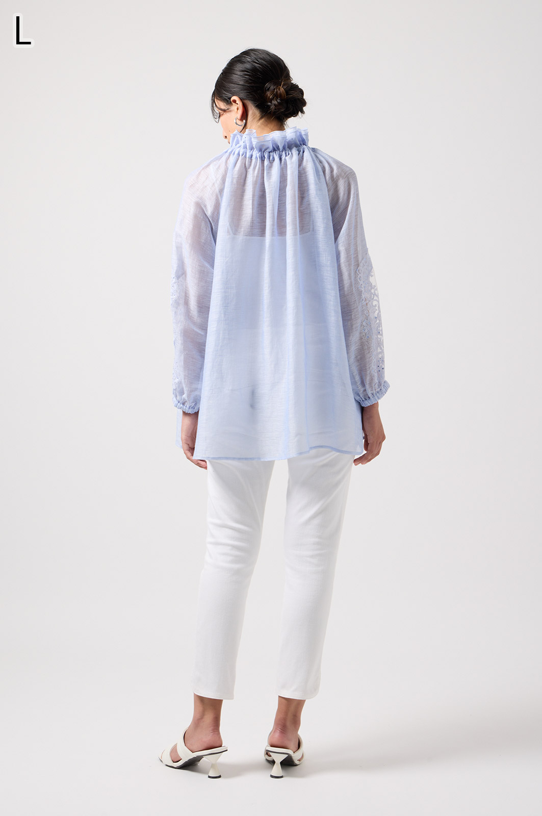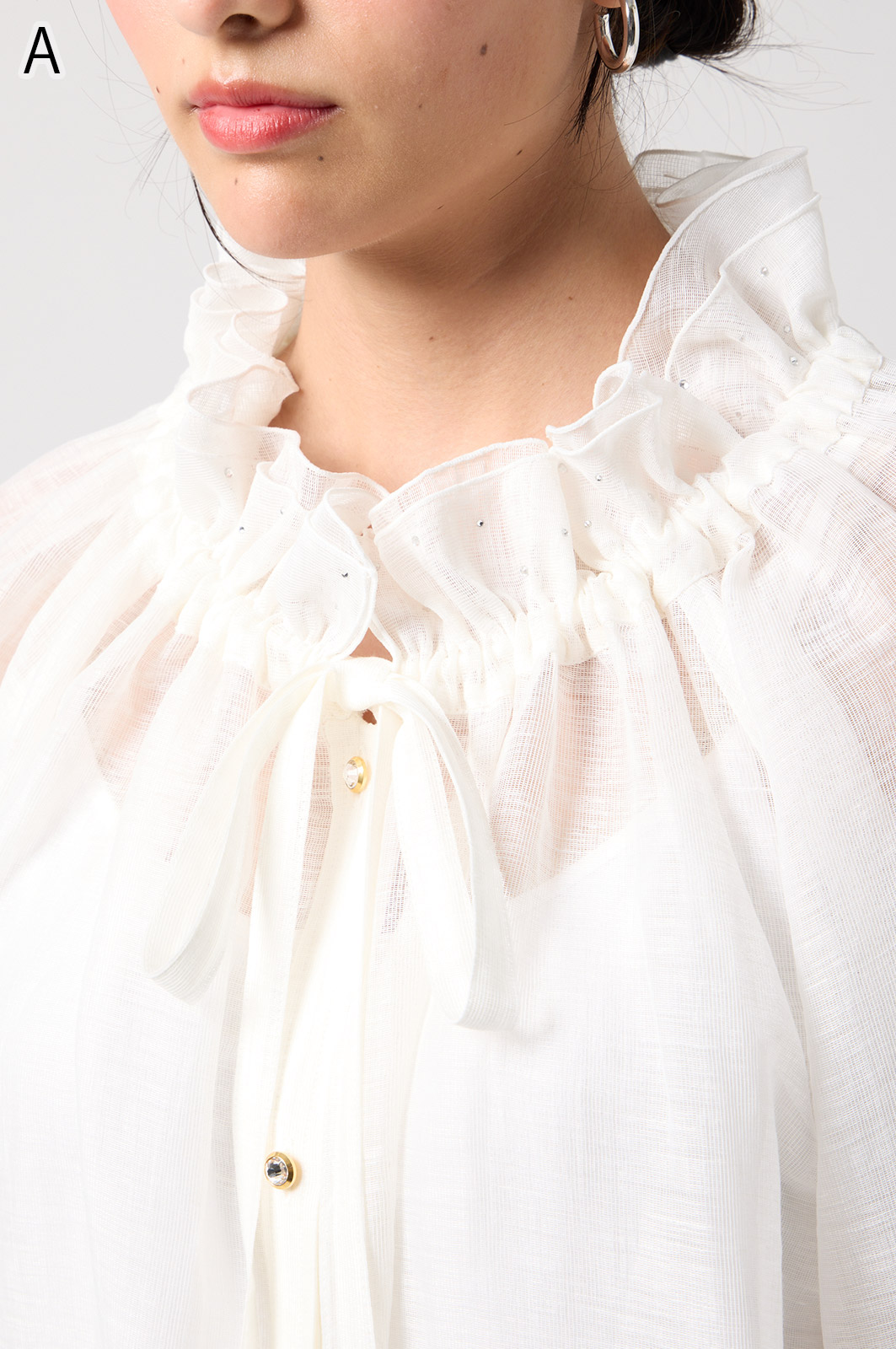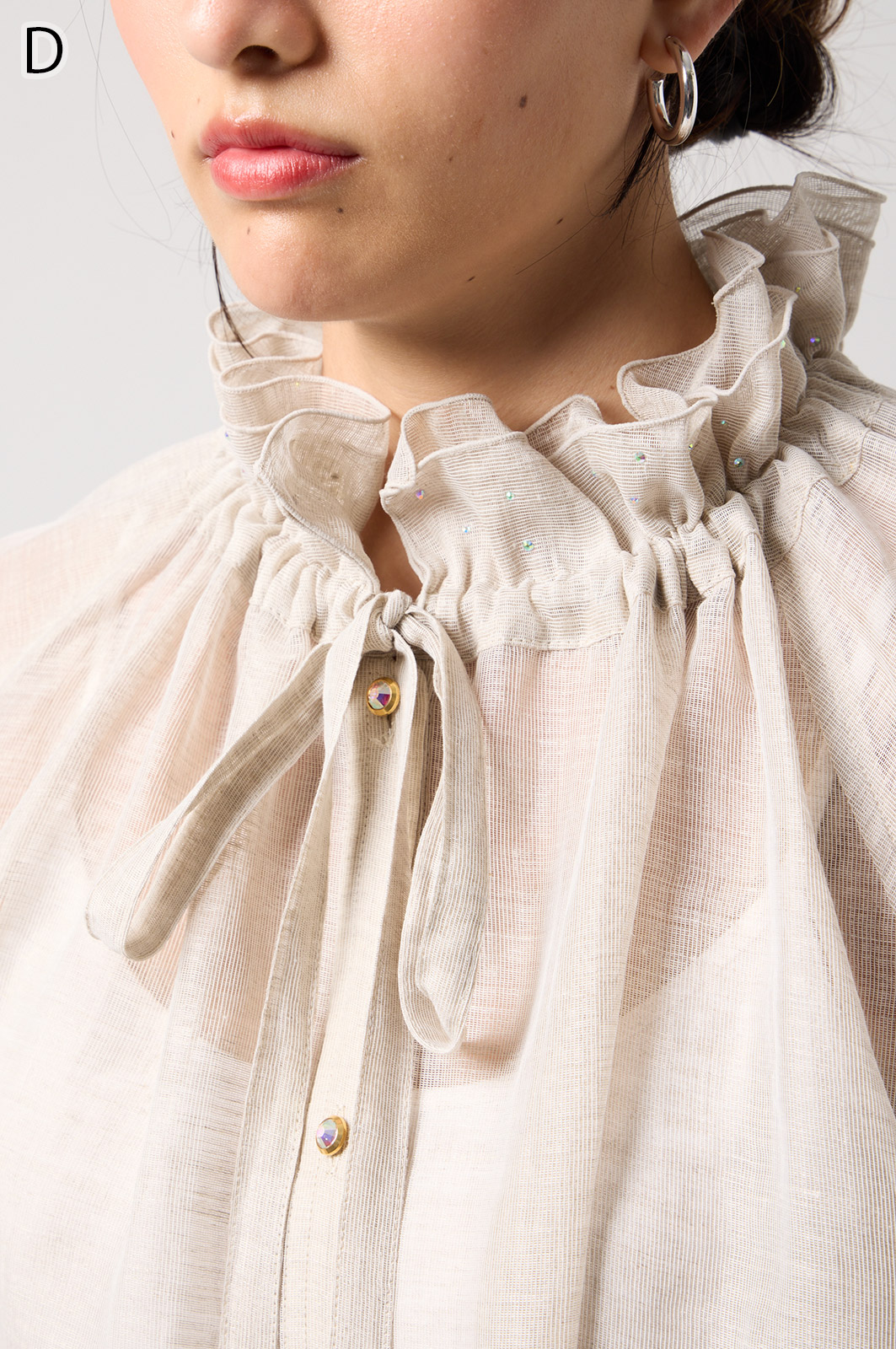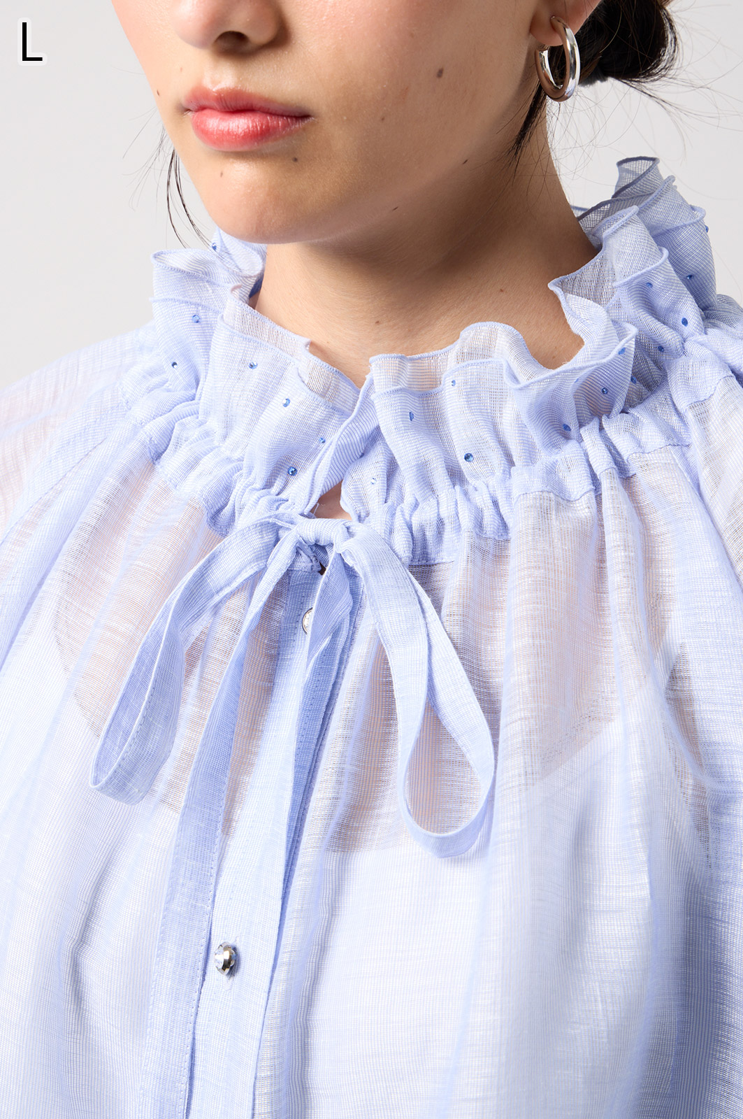 羽のように軽やかな麻入り素材を使い、衿元のフリルと袖のレースが女性らしさを引き立てる、涼しく羽織れるブラウスです。