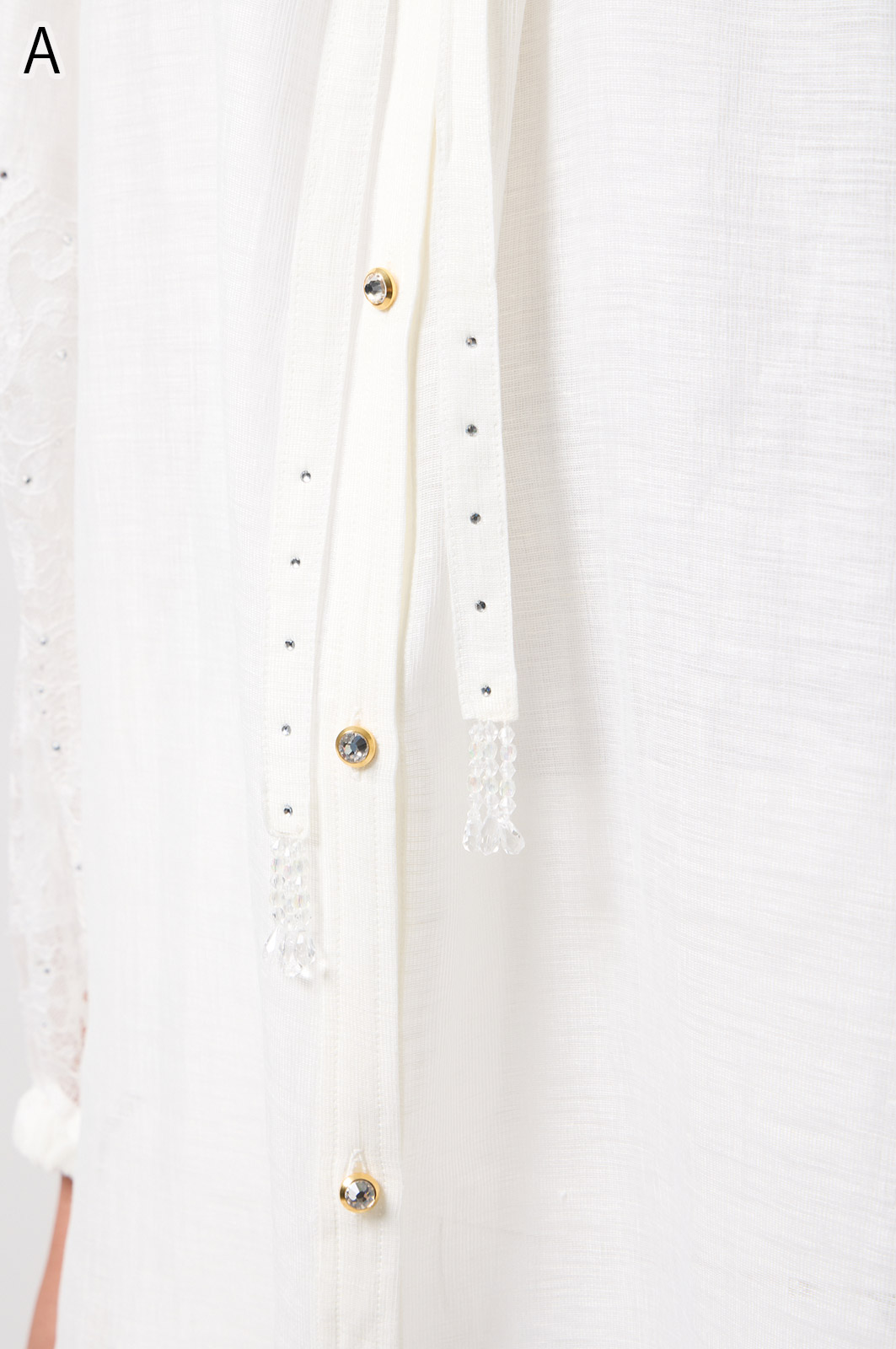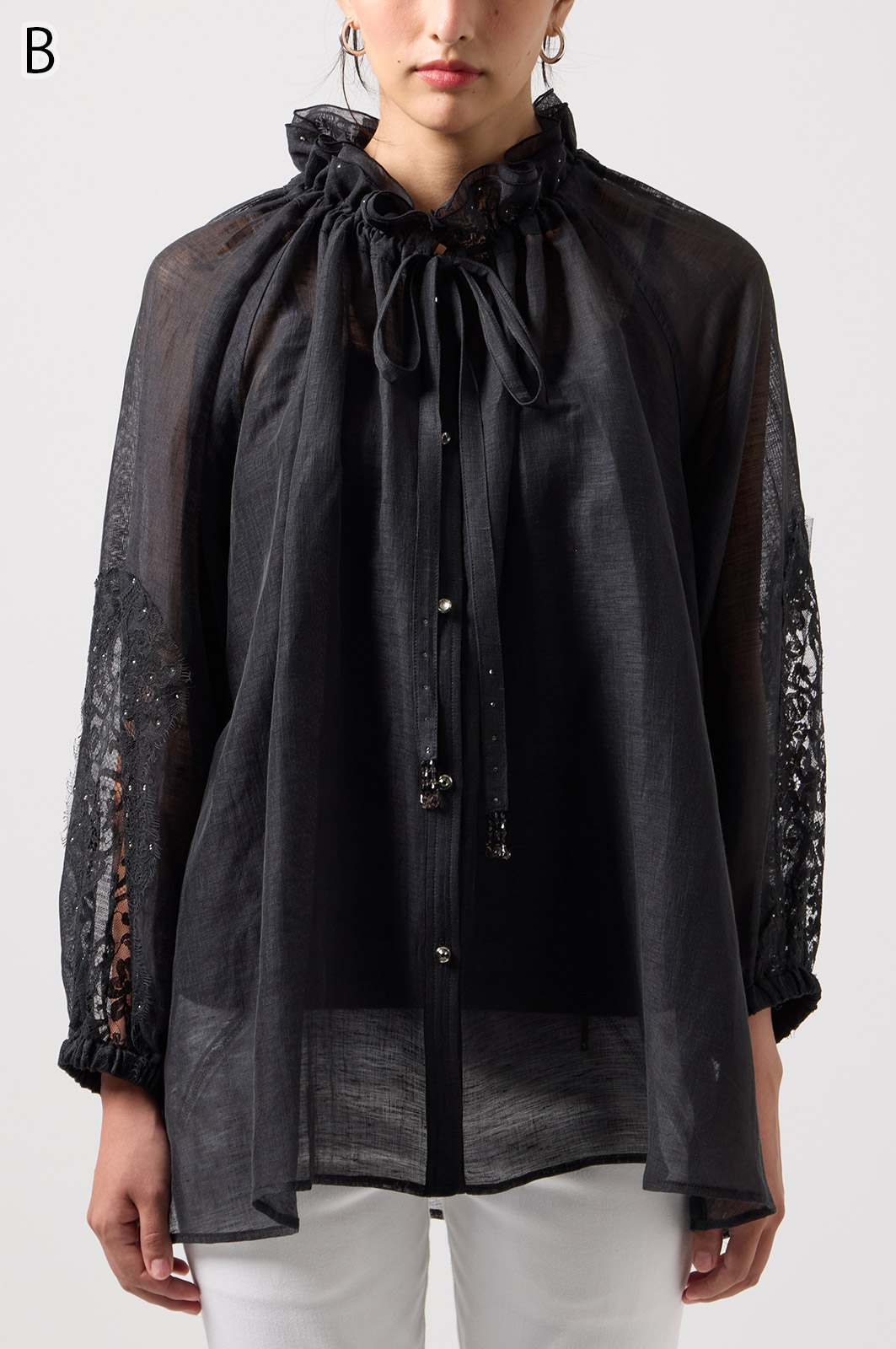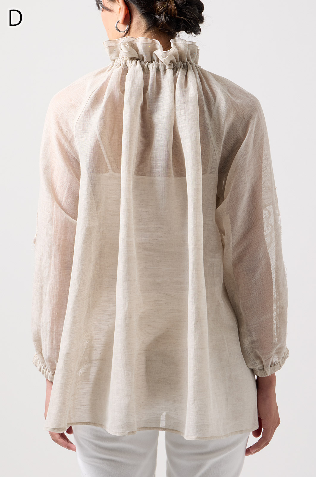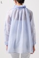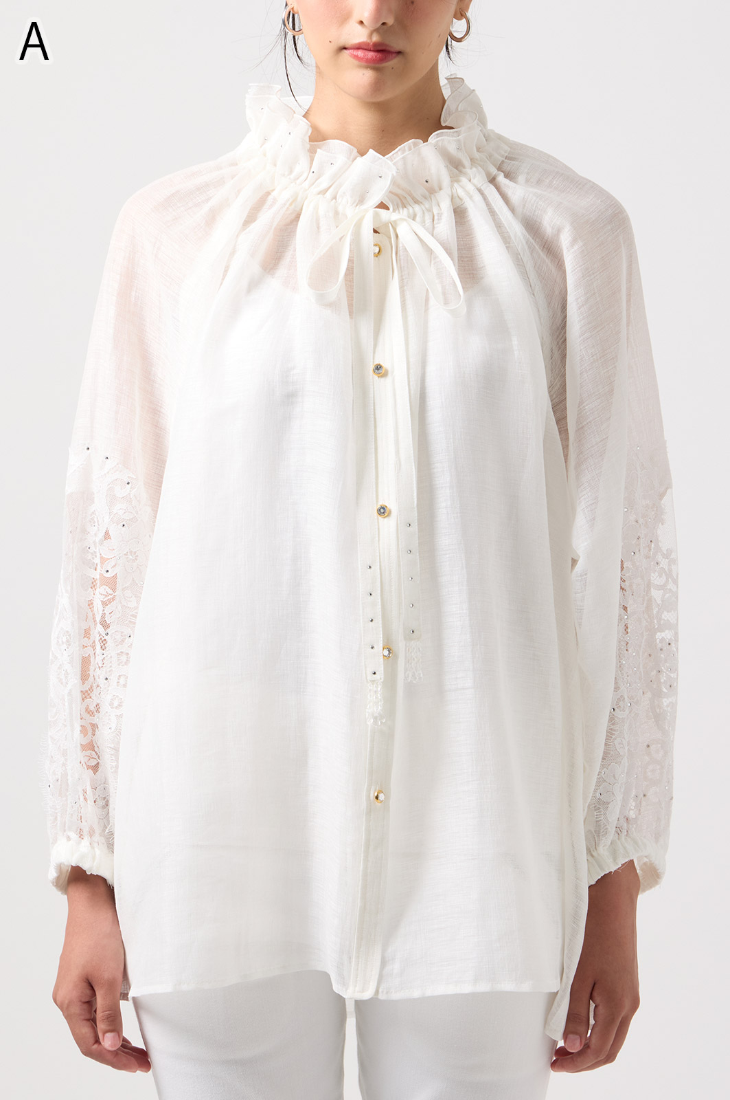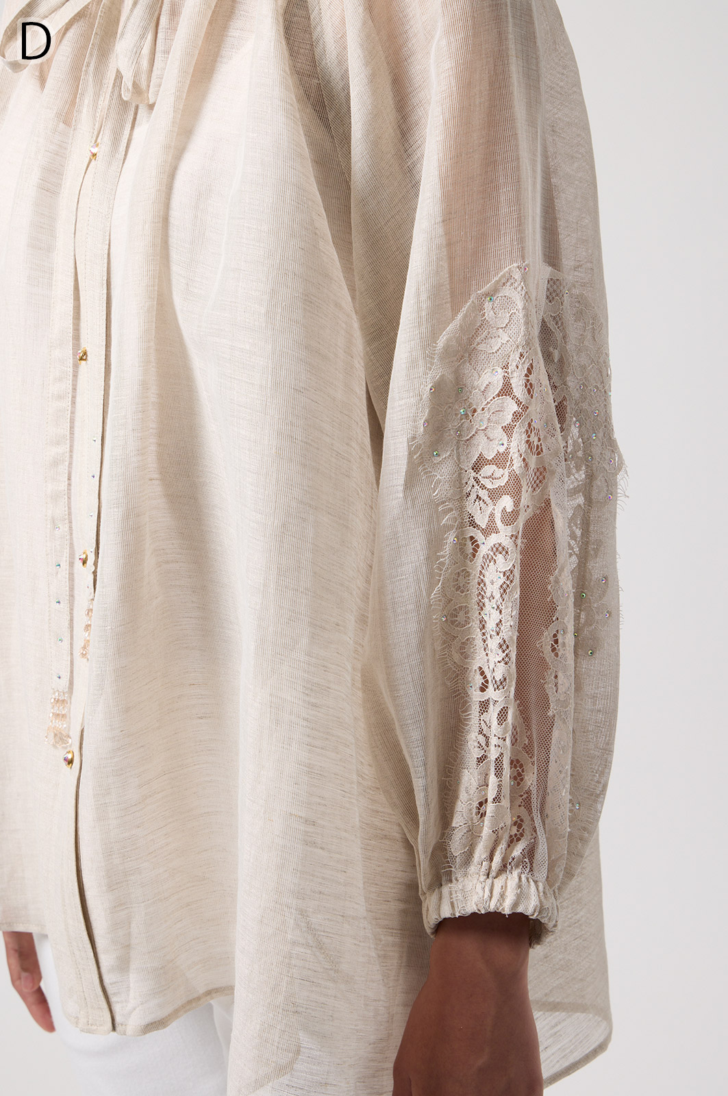 羽のように軽やかな麻入り素材を使い、衿元のフリルと袖のレースが女性らしさを引き立てる、涼しく羽織れるブラウスです。