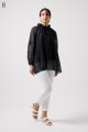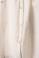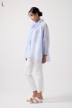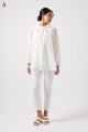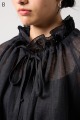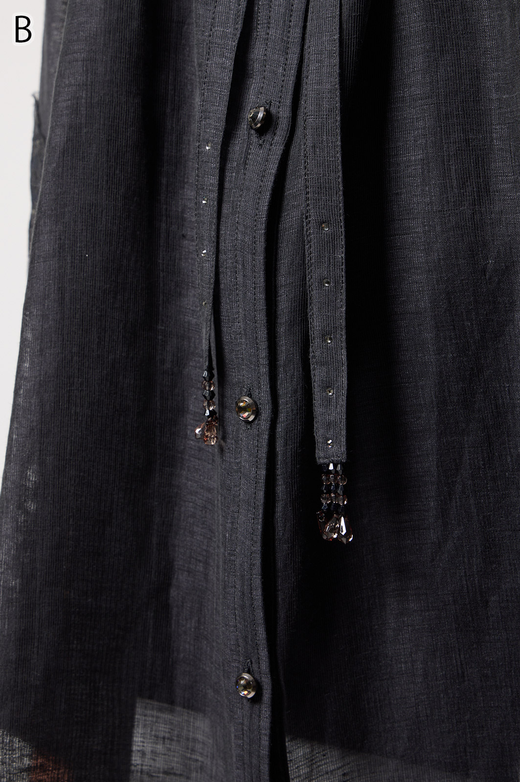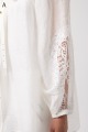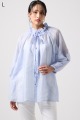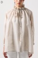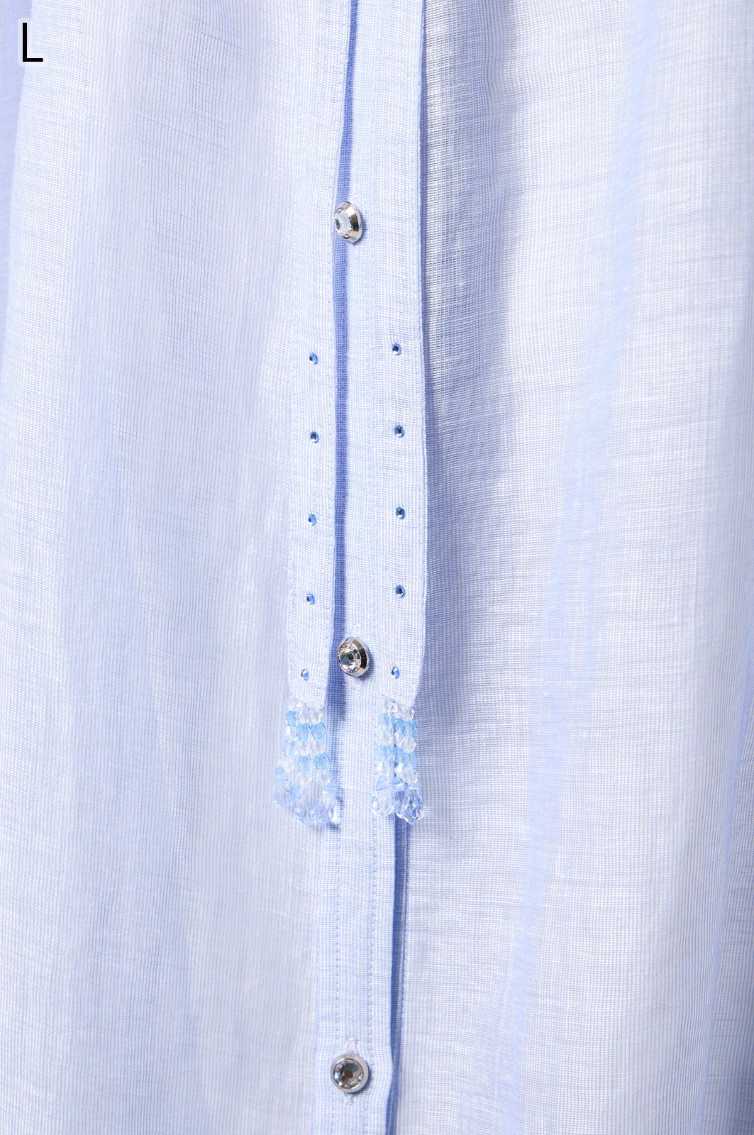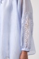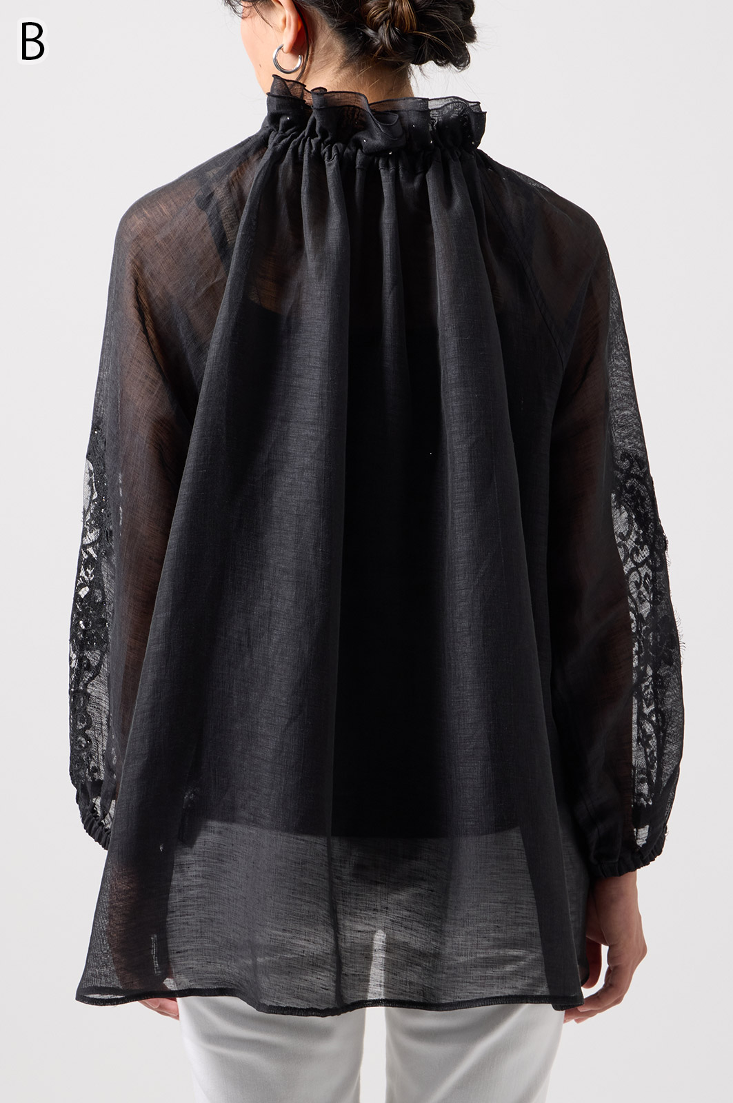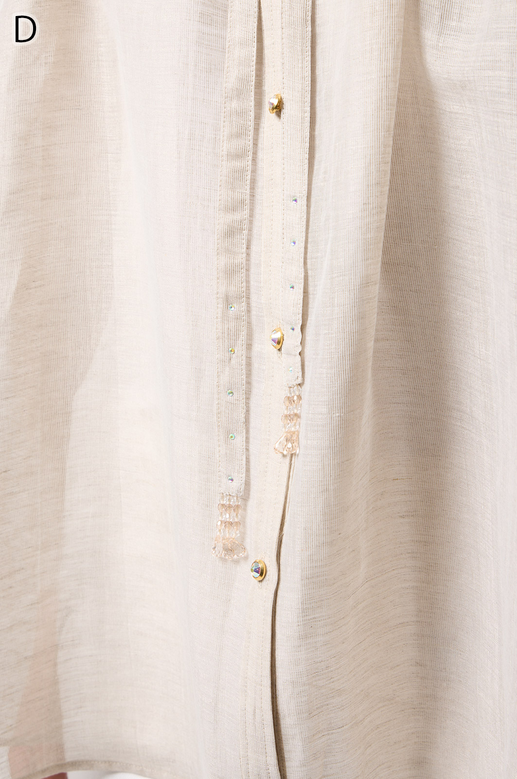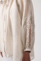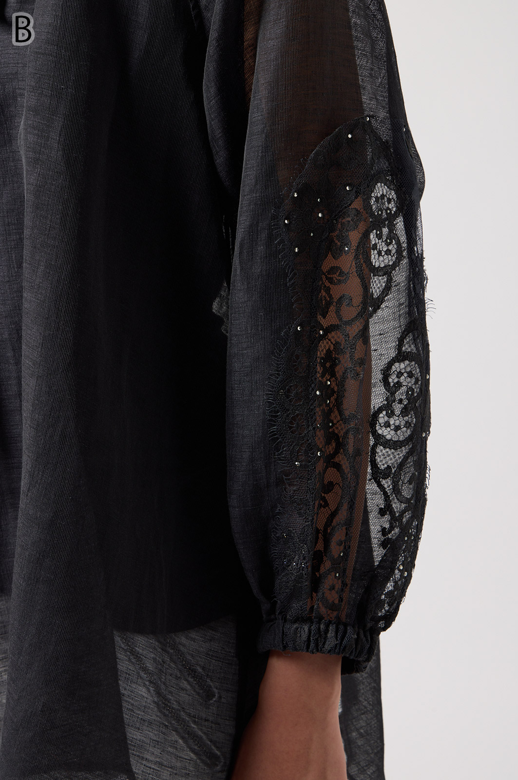 羽のように軽やかな麻入り素材を使い、衿元のフリルと袖のレースが女性らしさを引き立てる、涼しく羽織れるブラウスです。