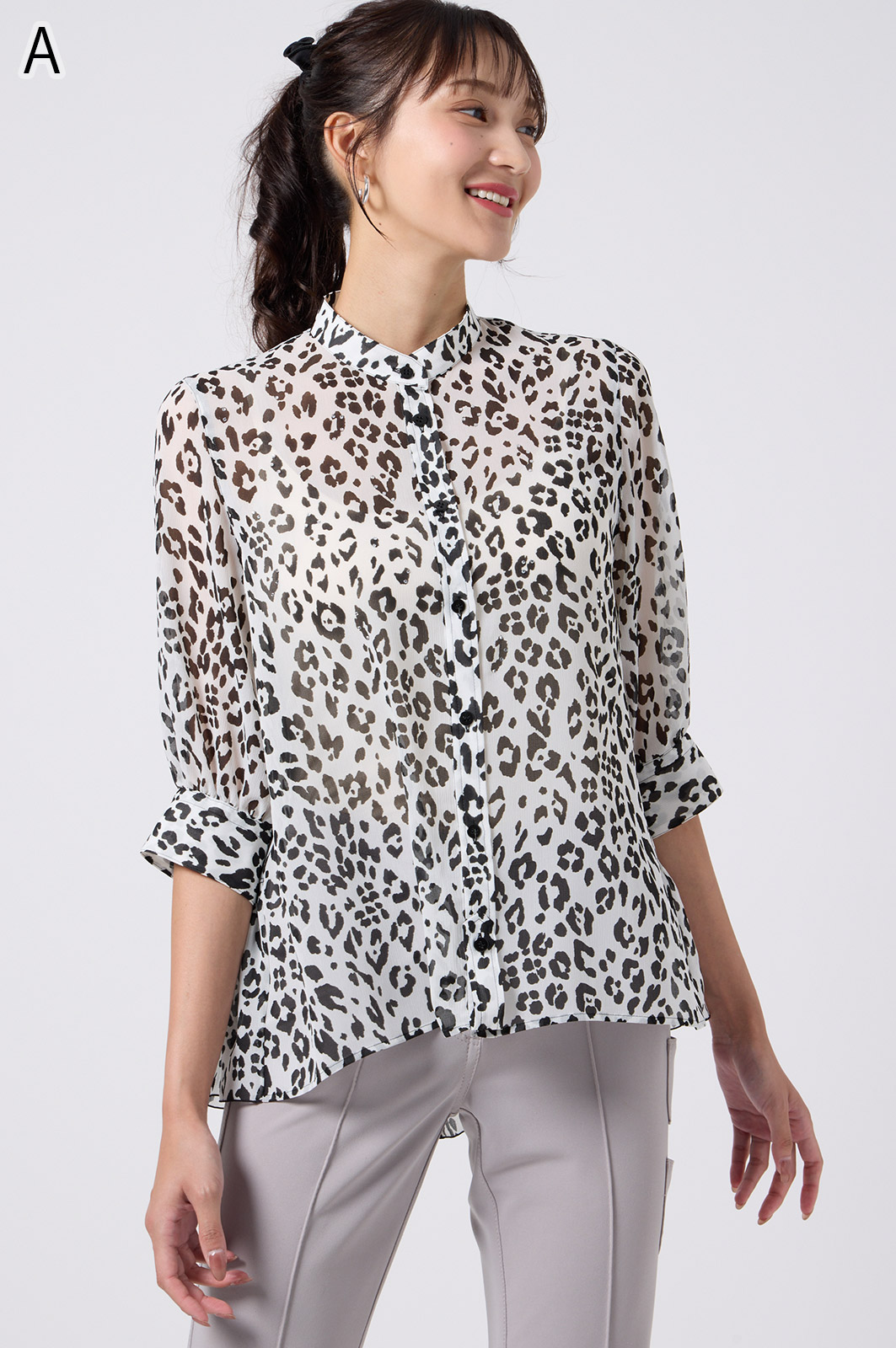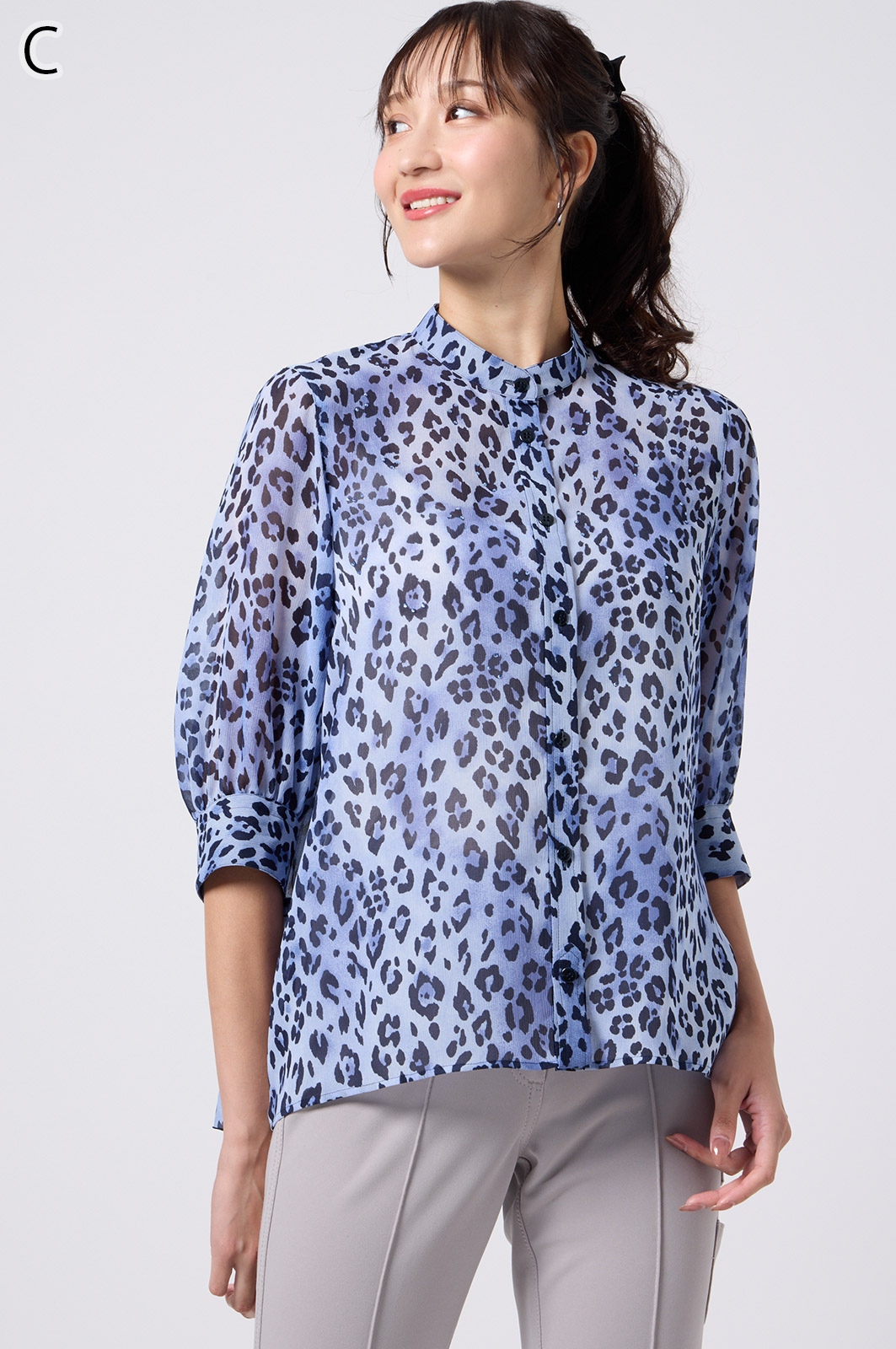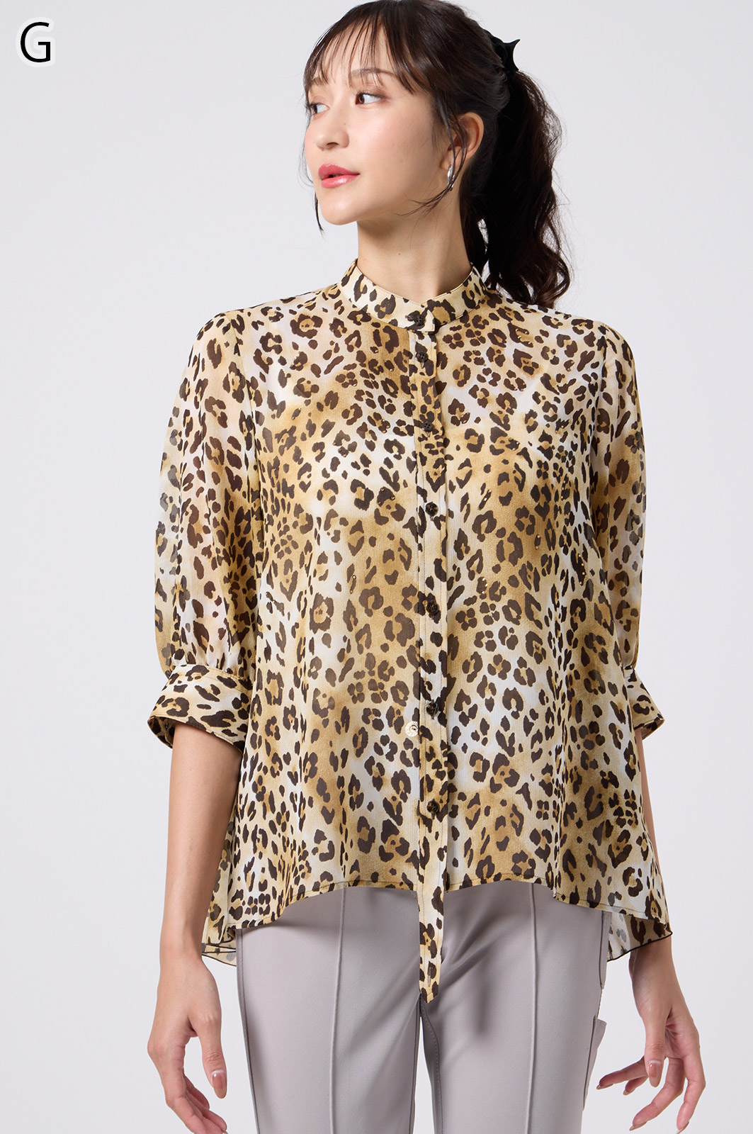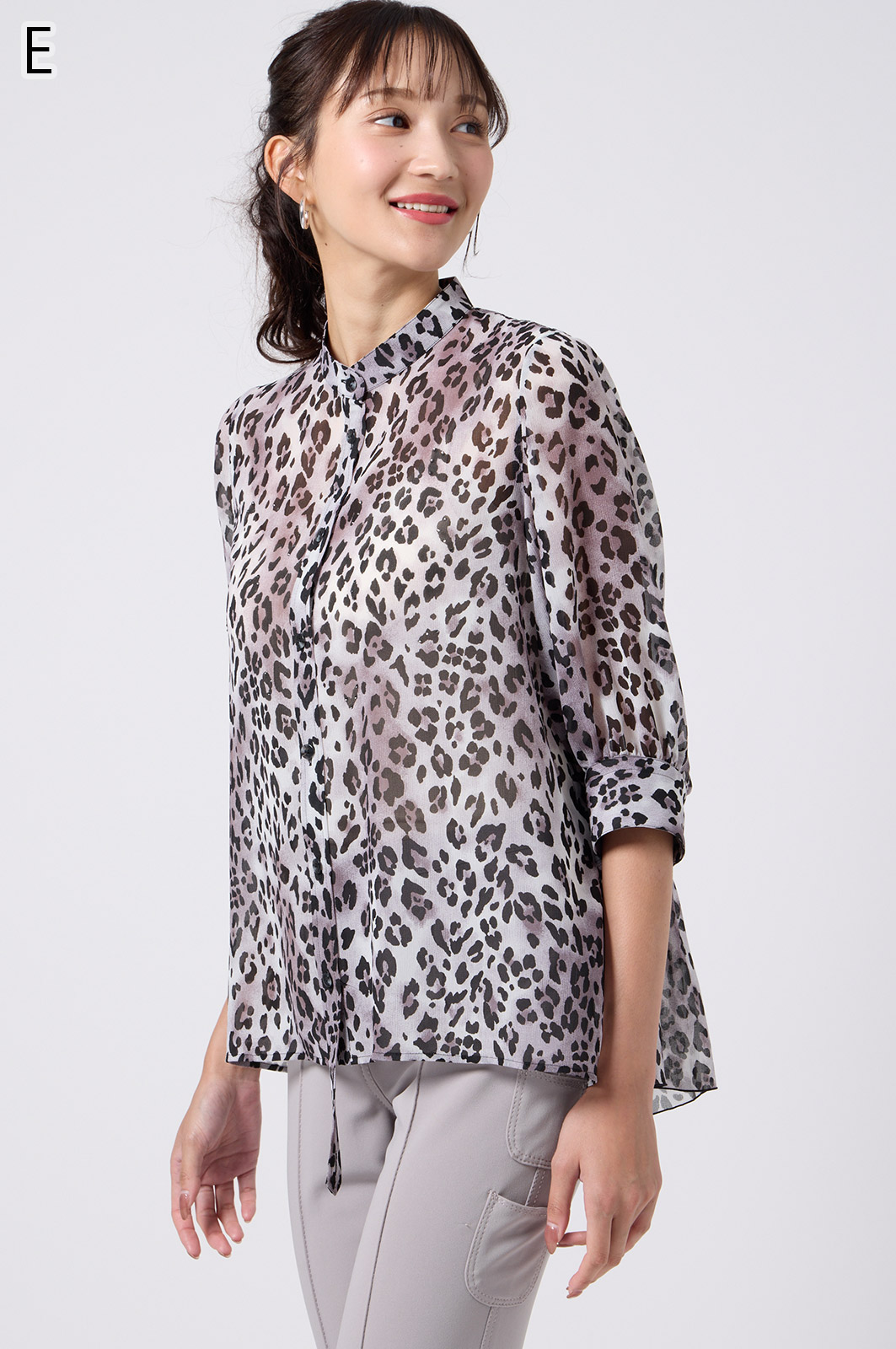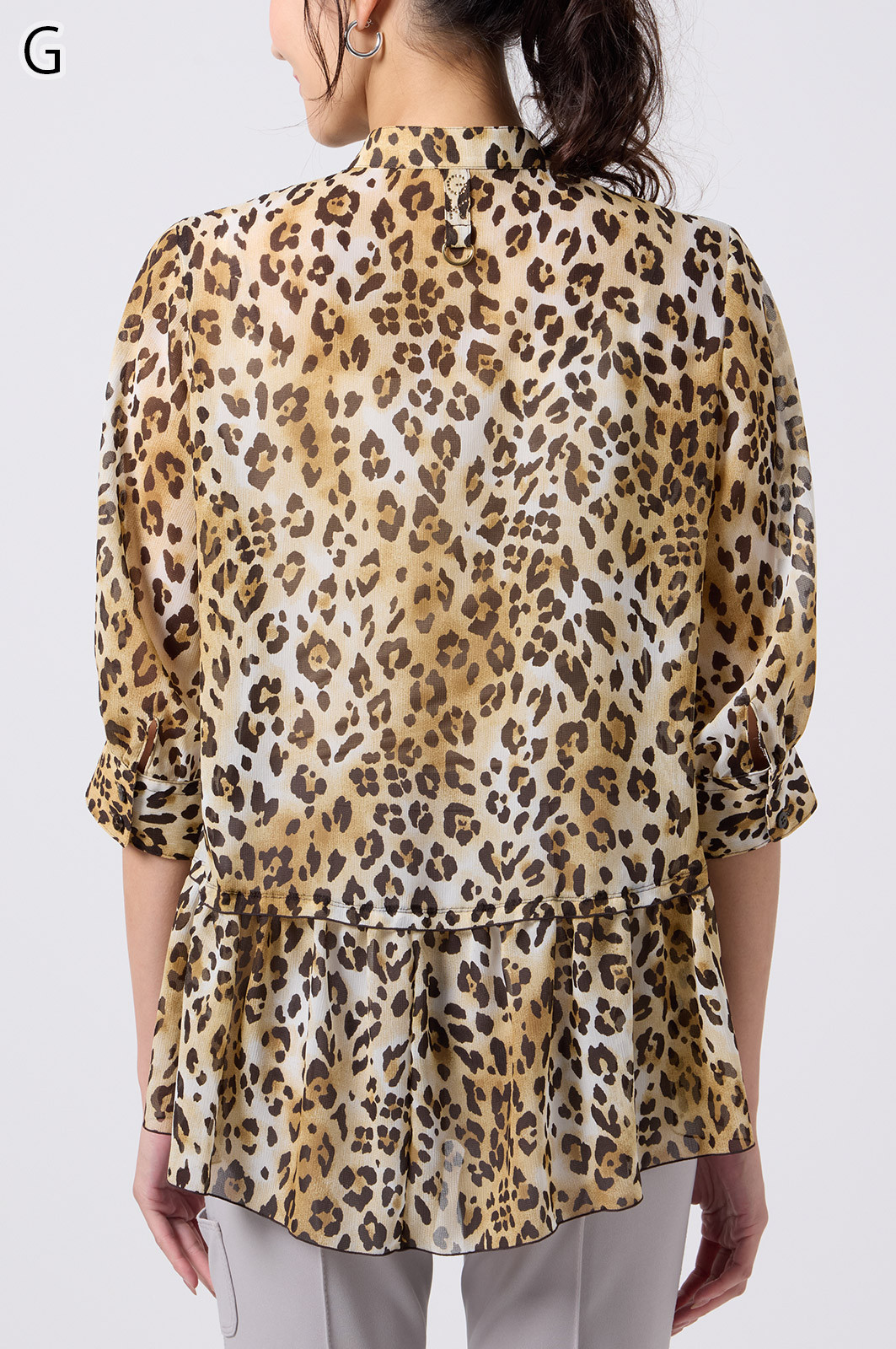 やわらかく透け感のあるヒョウ柄ブラウス。ふんわり広がる七分袖と、後ろのギャザー入りフレアが女性らしさを演出。前の長めの布は折り返してアレンジでき、首元はすっきりした立ち衿仕立て♪
