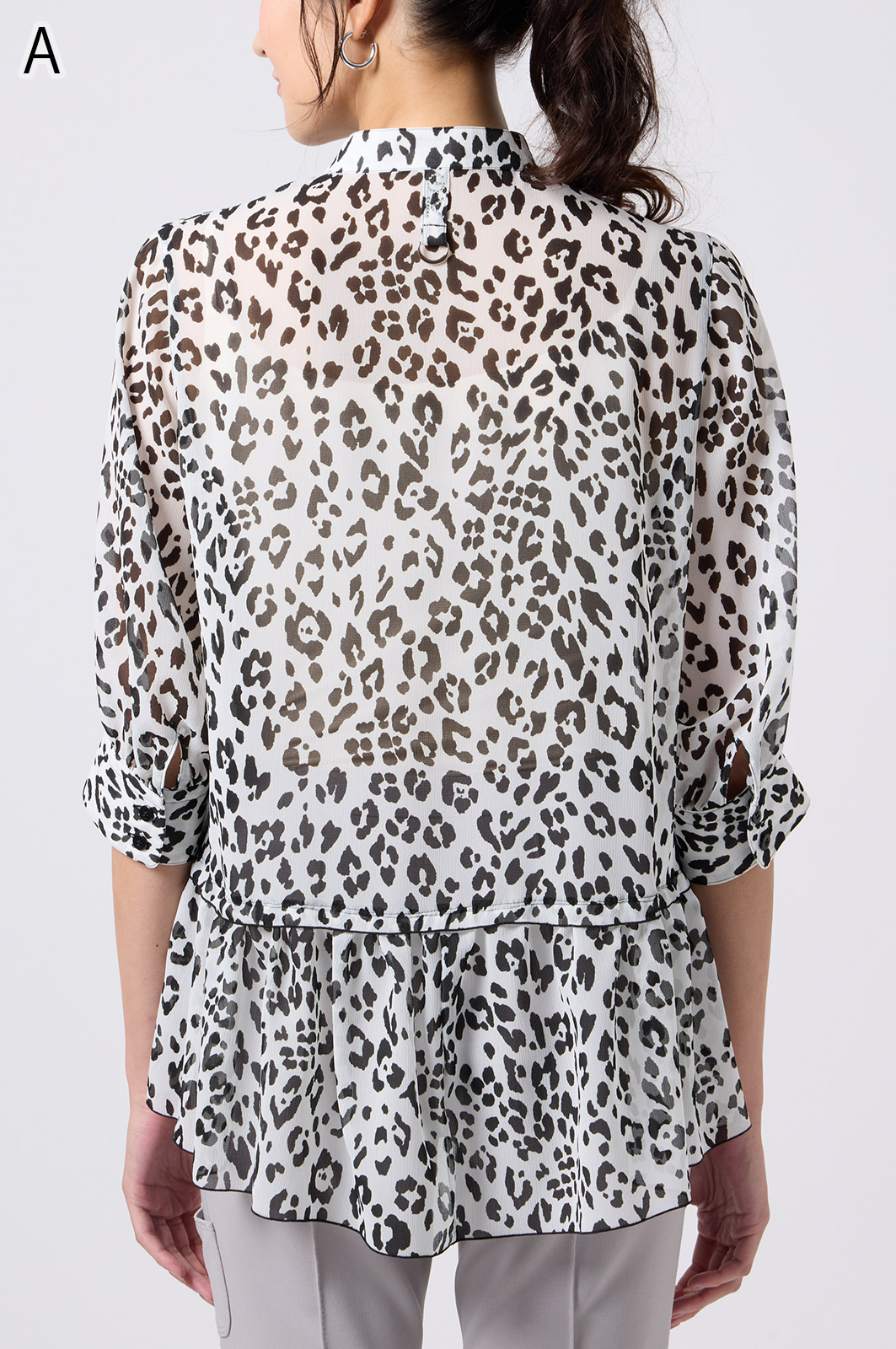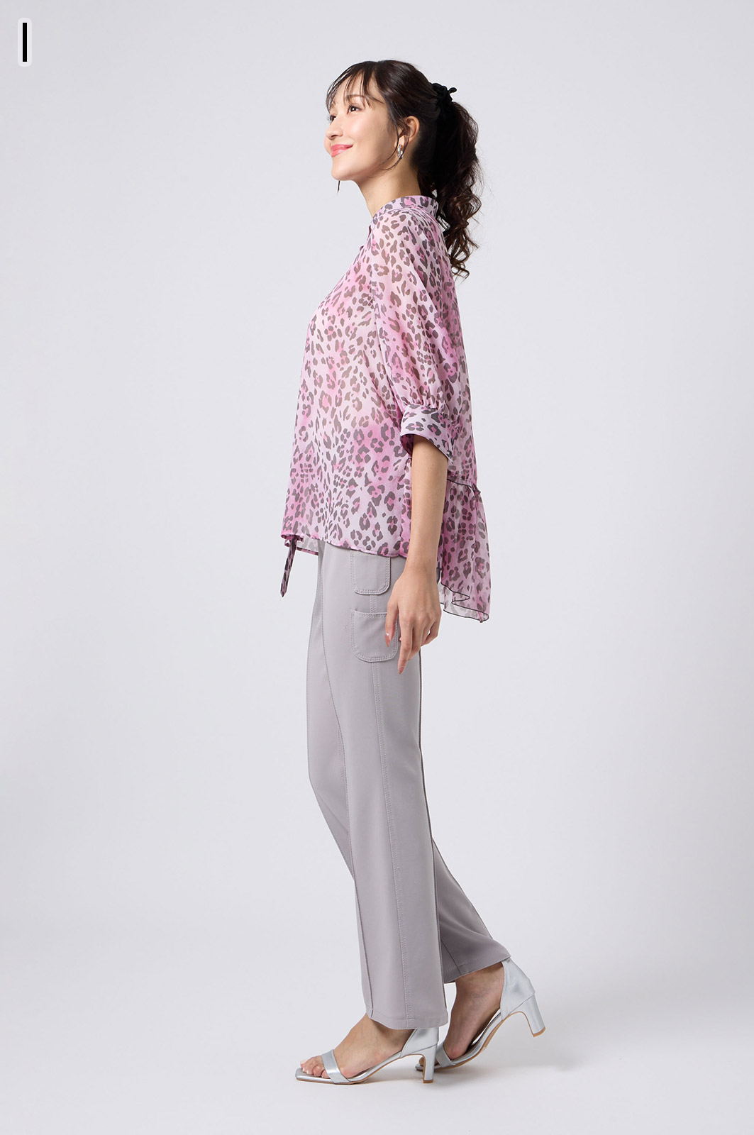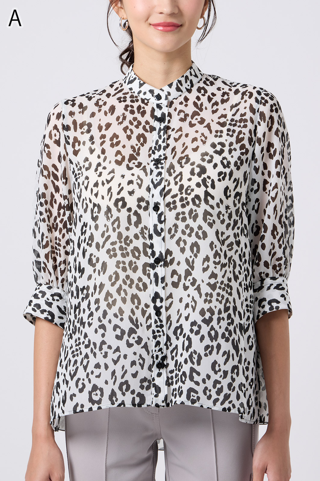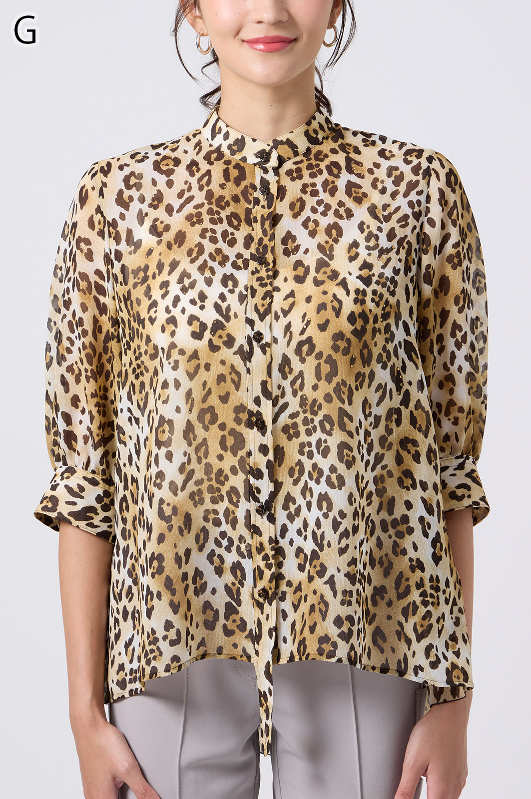 やわらかく透け感のあるヒョウ柄ブラウス。ふんわり広がる七分袖と、後ろのギャザー入りフレアが女性らしさを演出。前の長めの布は折り返してアレンジでき、首元はすっきりした立ち衿仕立て♪