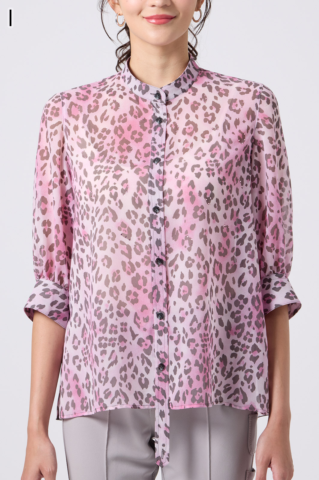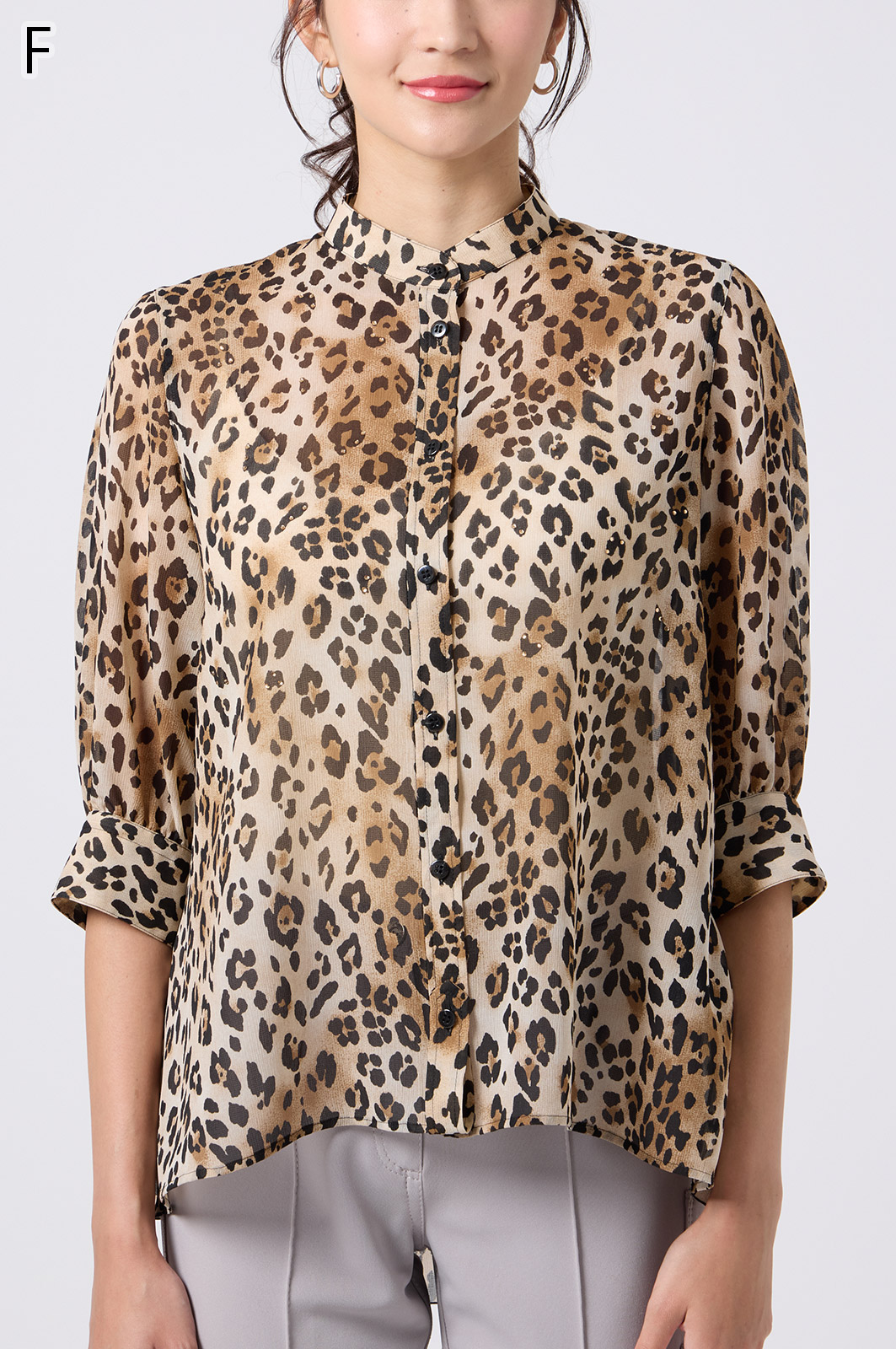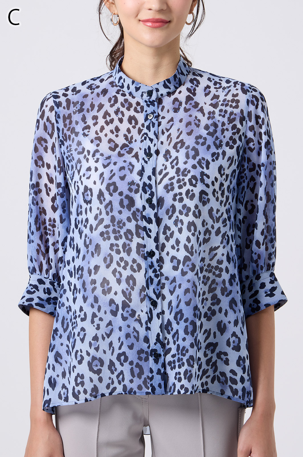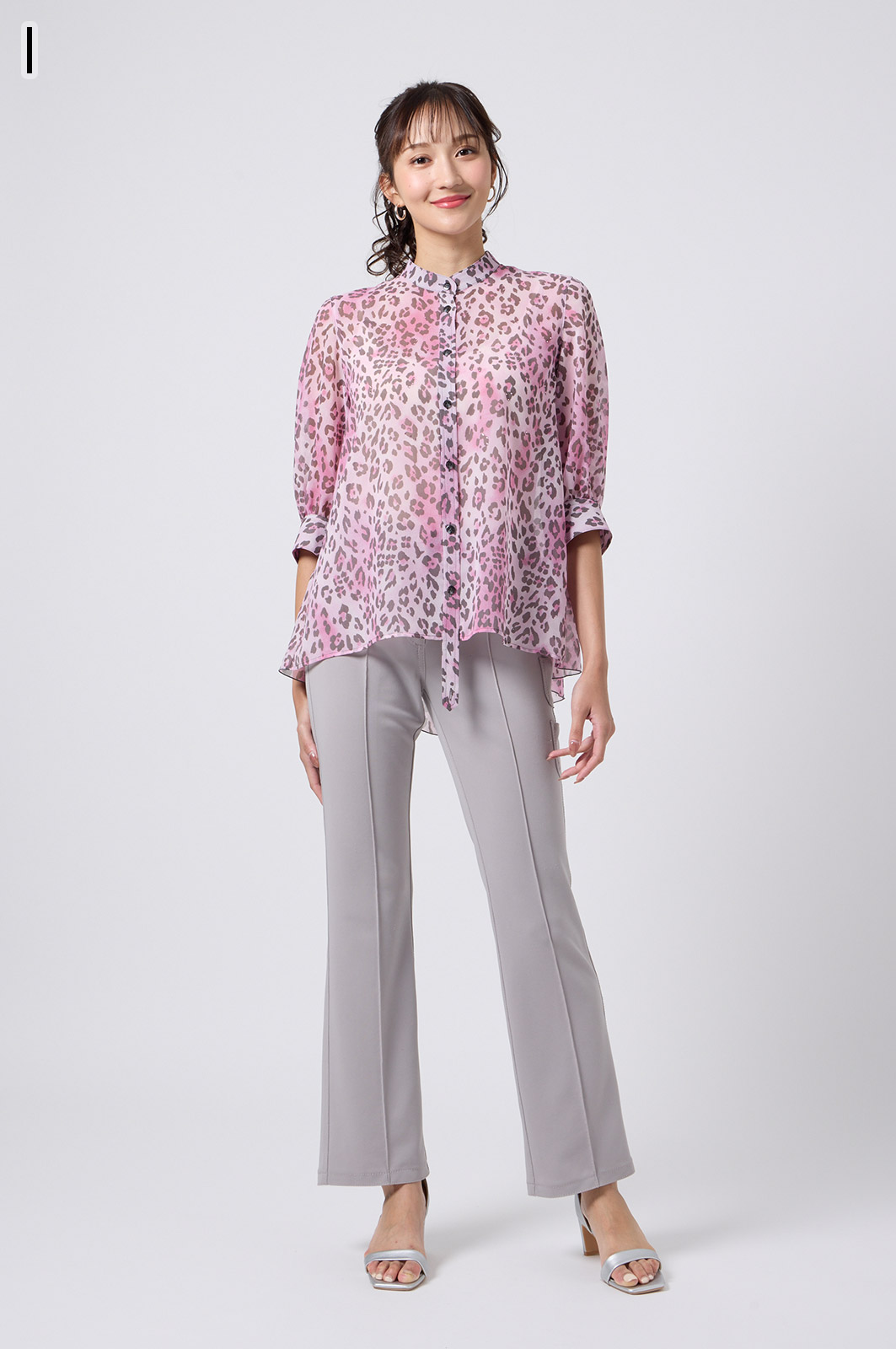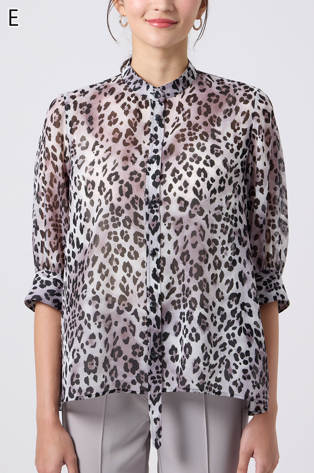 やわらかく透け感のあるヒョウ柄ブラウス。ふんわり広がる七分袖と、後ろのギャザー入りフレアが女性らしさを演出。前の長めの布は折り返してアレンジでき、首元はすっきりした立ち衿仕立て♪
