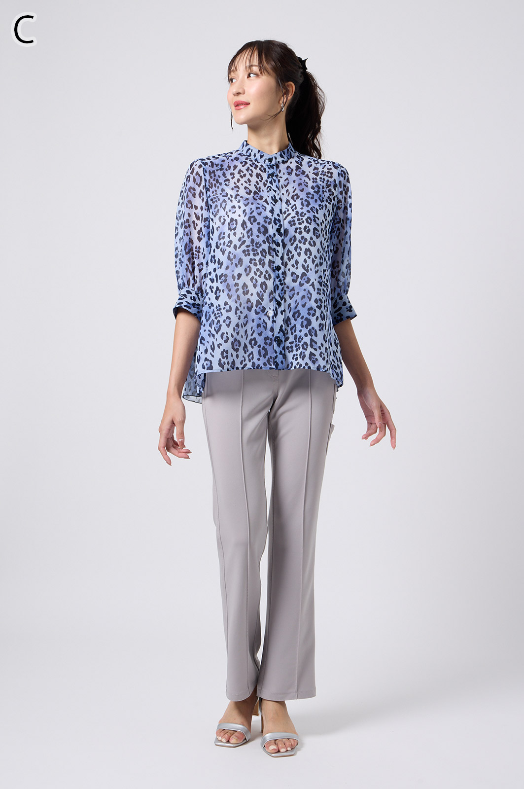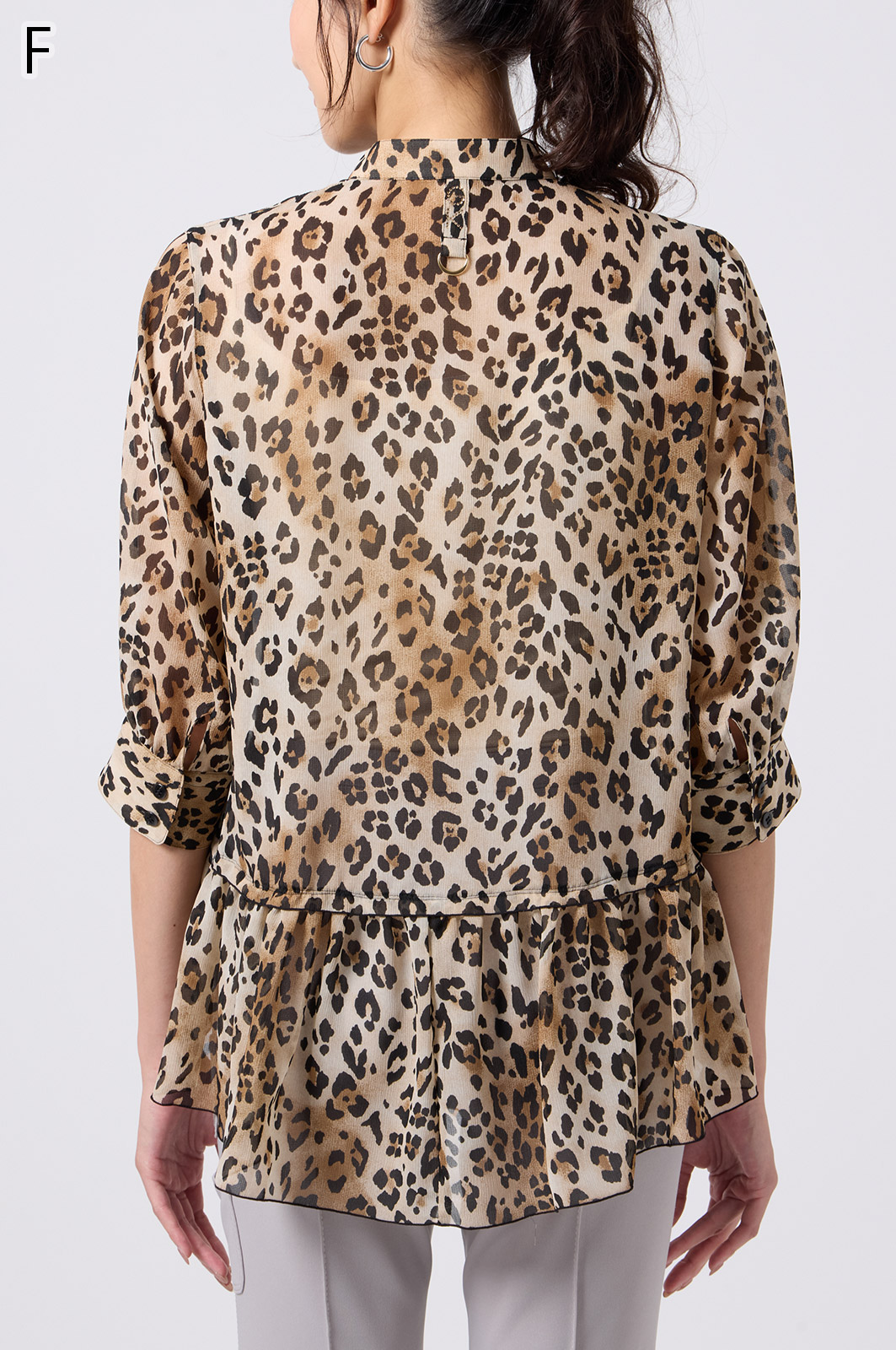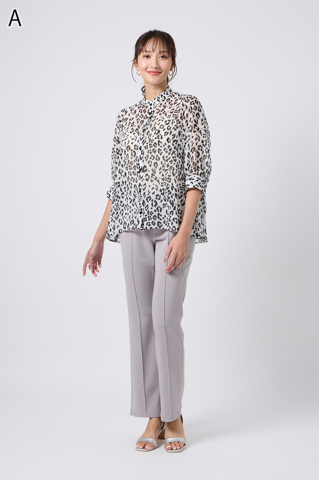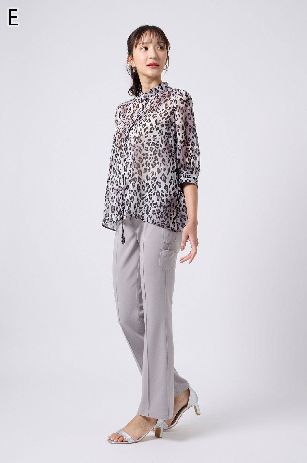 やわらかく透け感のあるヒョウ柄ブラウス。ふんわり広がる七分袖と、後ろのギャザー入りフレアが女性らしさを演出。前の長めの布は折り返してアレンジでき、首元はすっきりした立ち衿仕立て♪