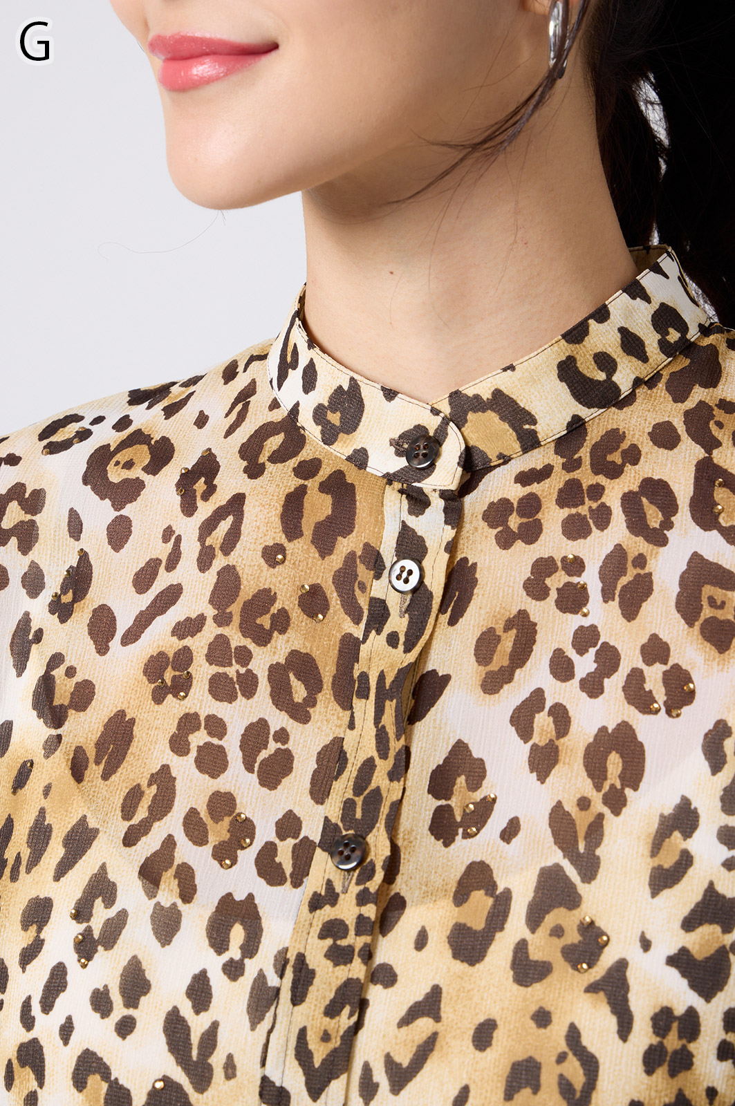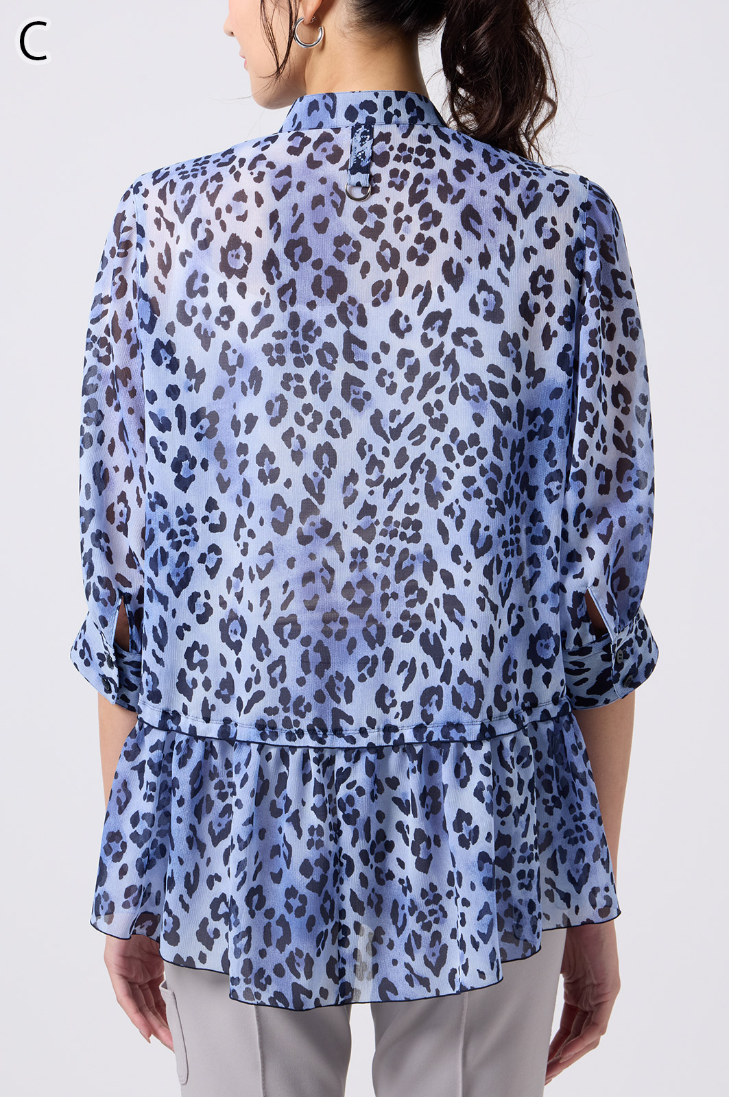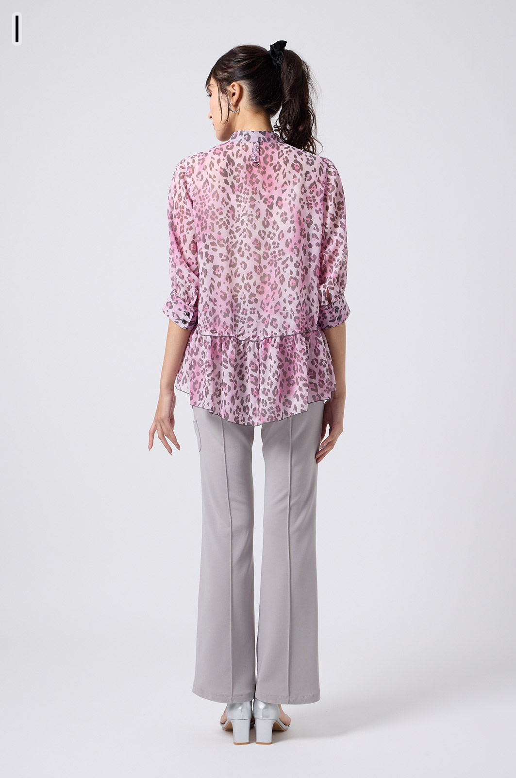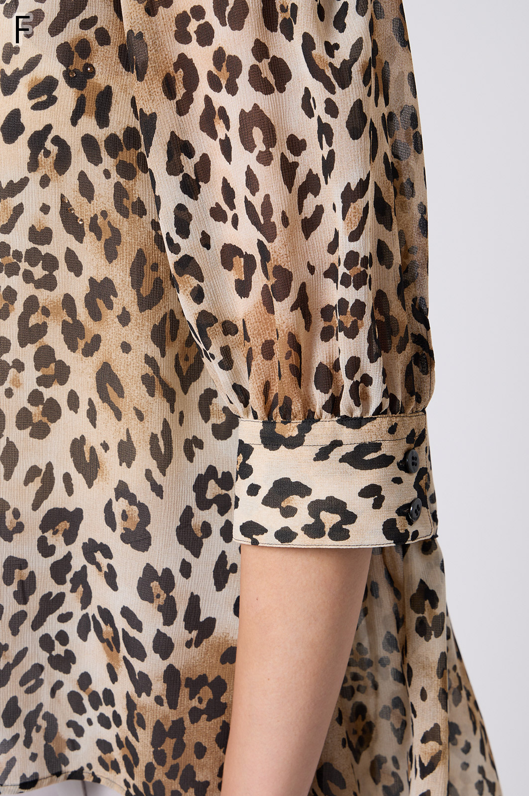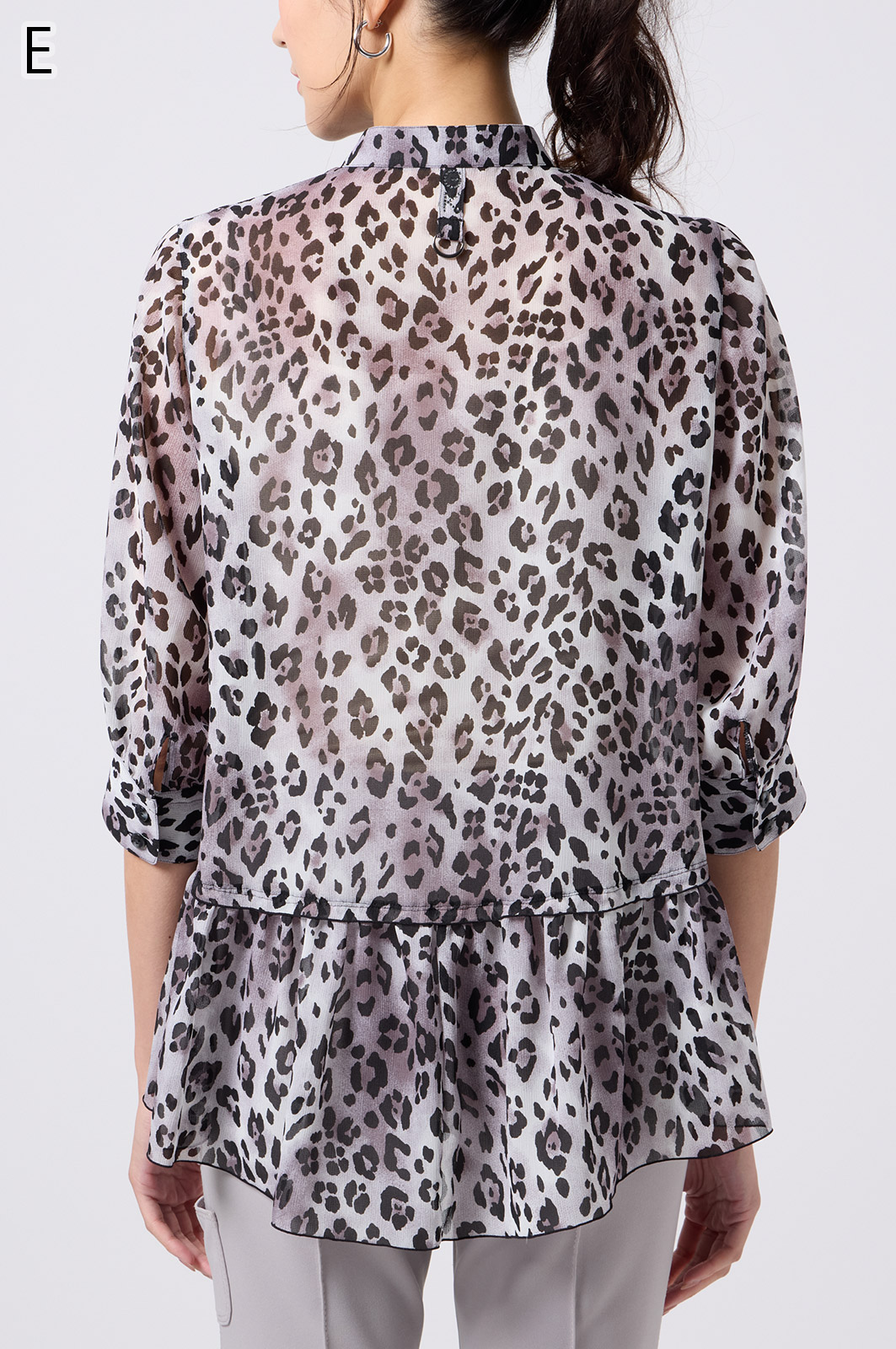 やわらかく透け感のあるヒョウ柄ブラウス。ふんわり広がる七分袖と、後ろのギャザー入りフレアが女性らしさを演出。前の長めの布は折り返してアレンジでき、首元はすっきりした立ち衿仕立て♪