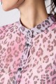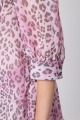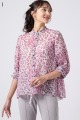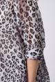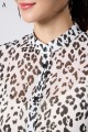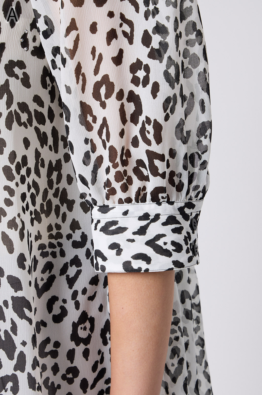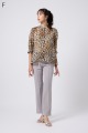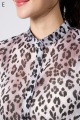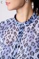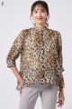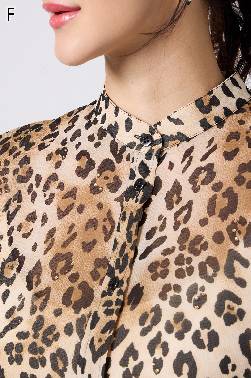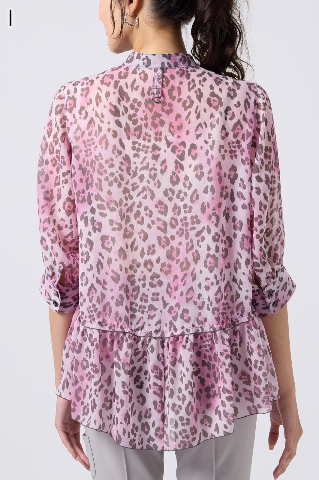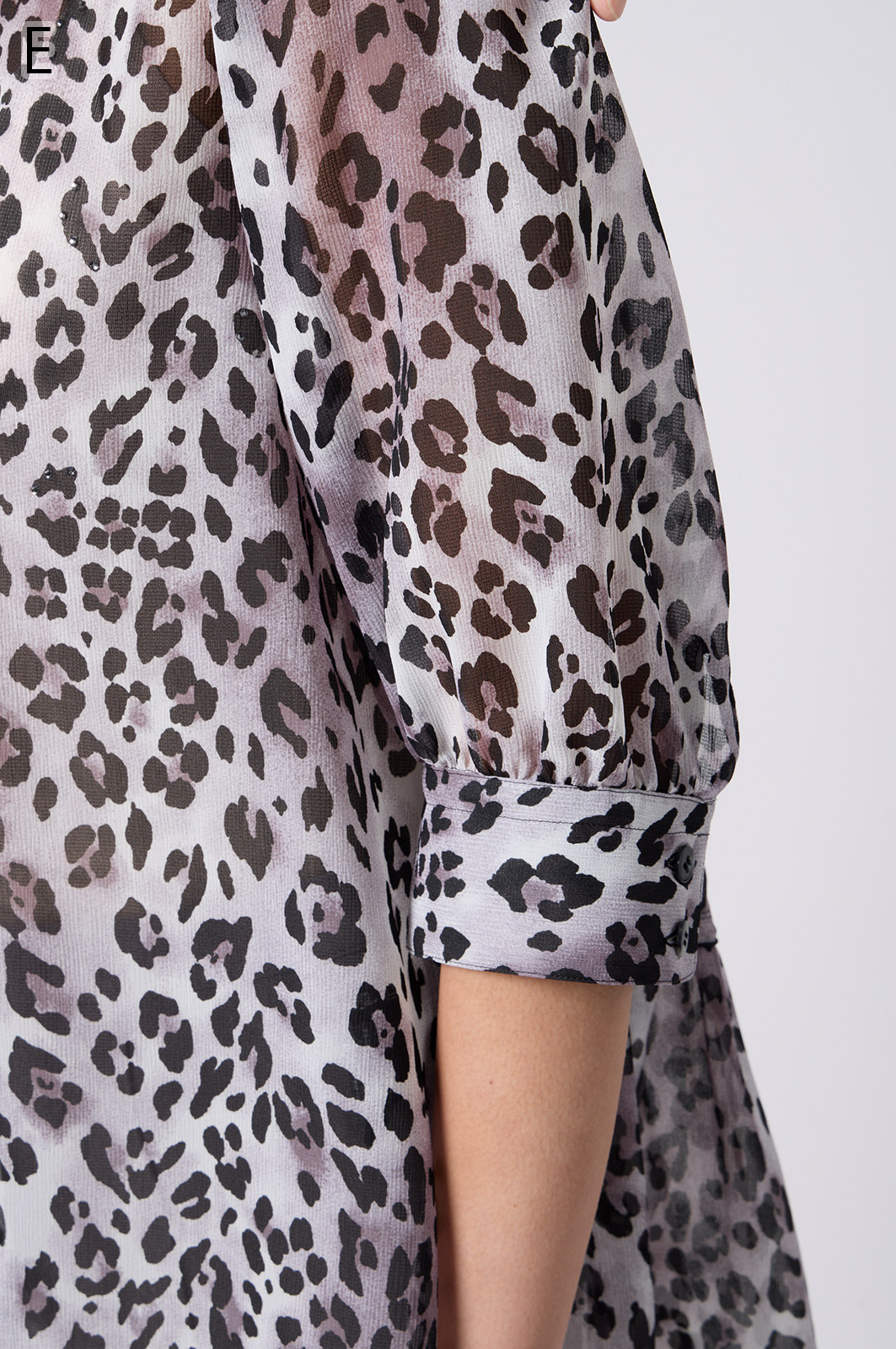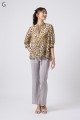 やわらかく透け感のあるヒョウ柄ブラウス。ふんわり広がる七分袖と、後ろのギャザー入りフレアが女性らしさを演出。前の長めの布は折り返してアレンジでき、首元はすっきりした立ち衿仕立て♪