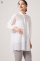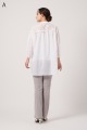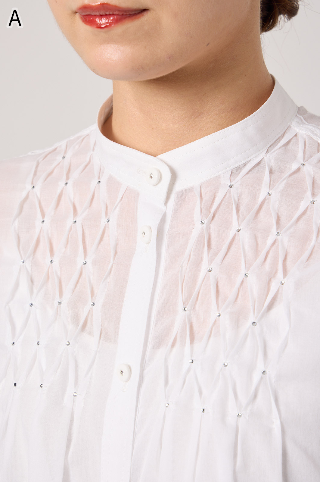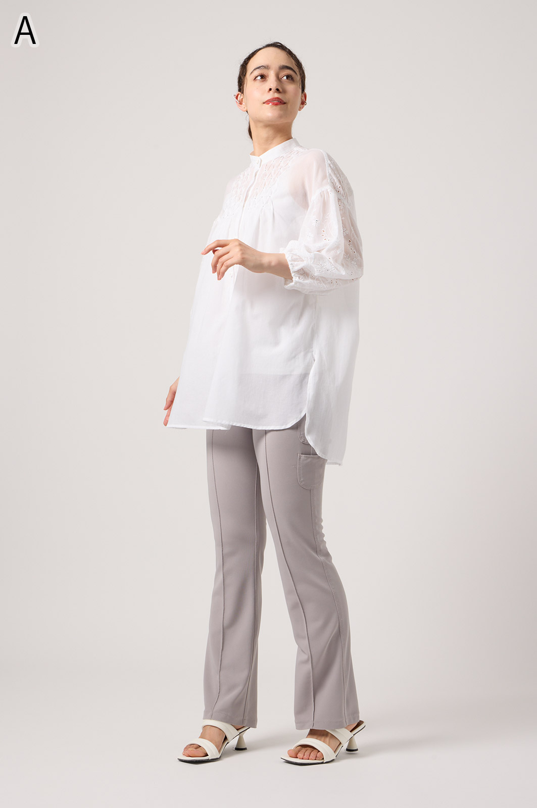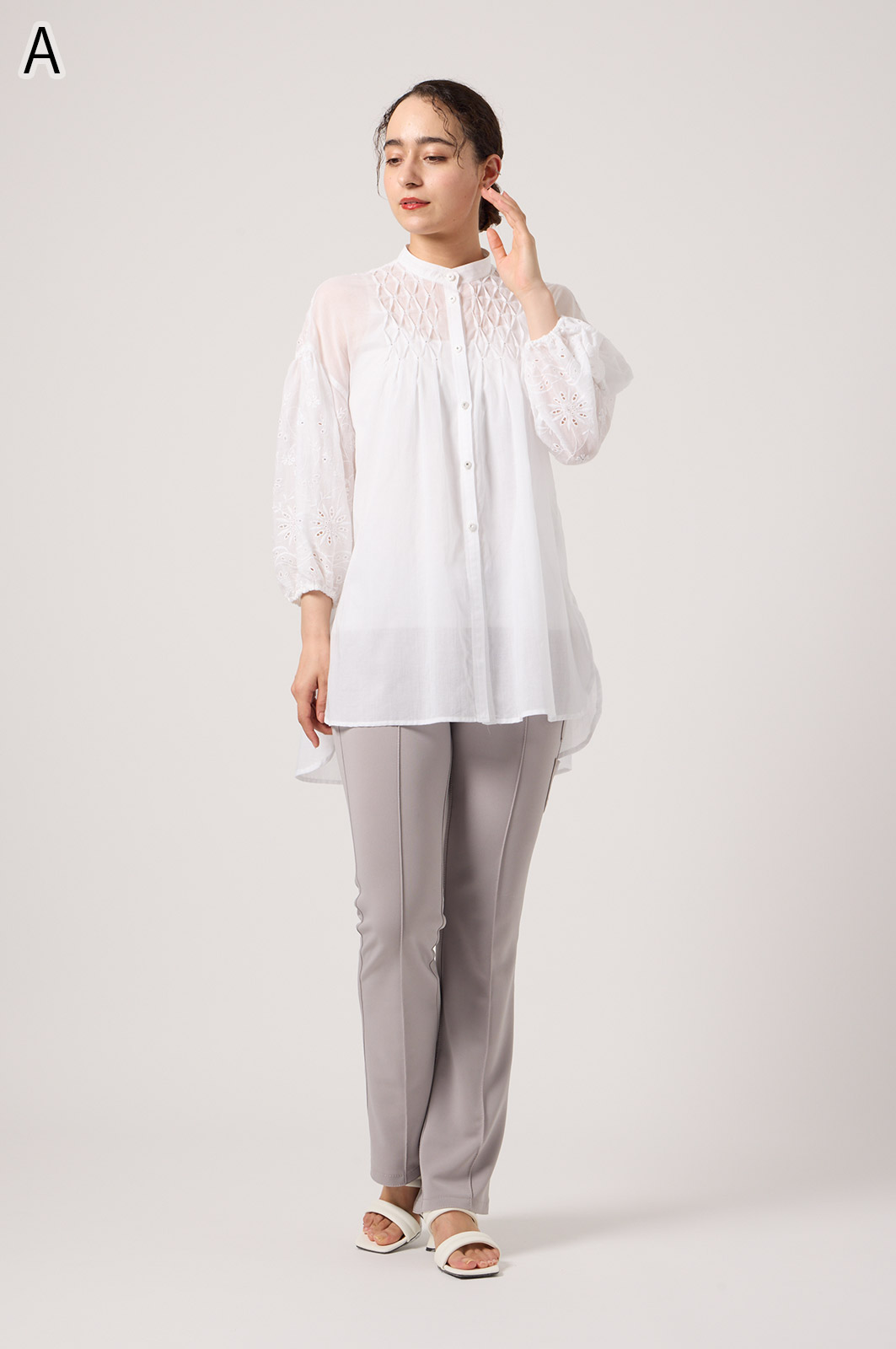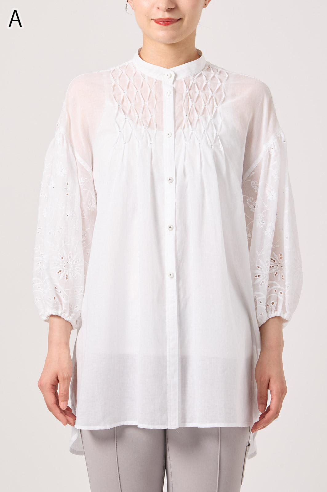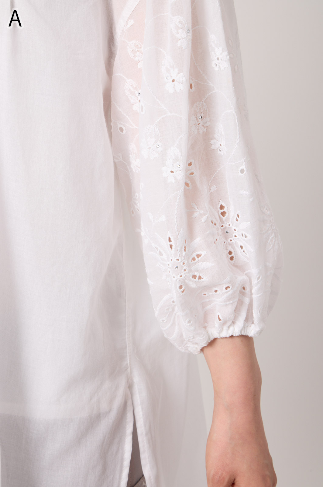 イタリア製の上質な綿100%素材に、繊細なカットワーク刺しゅうを施した羽織りブラウス。涼しく上品で、夏の軽い羽織りに最適です。