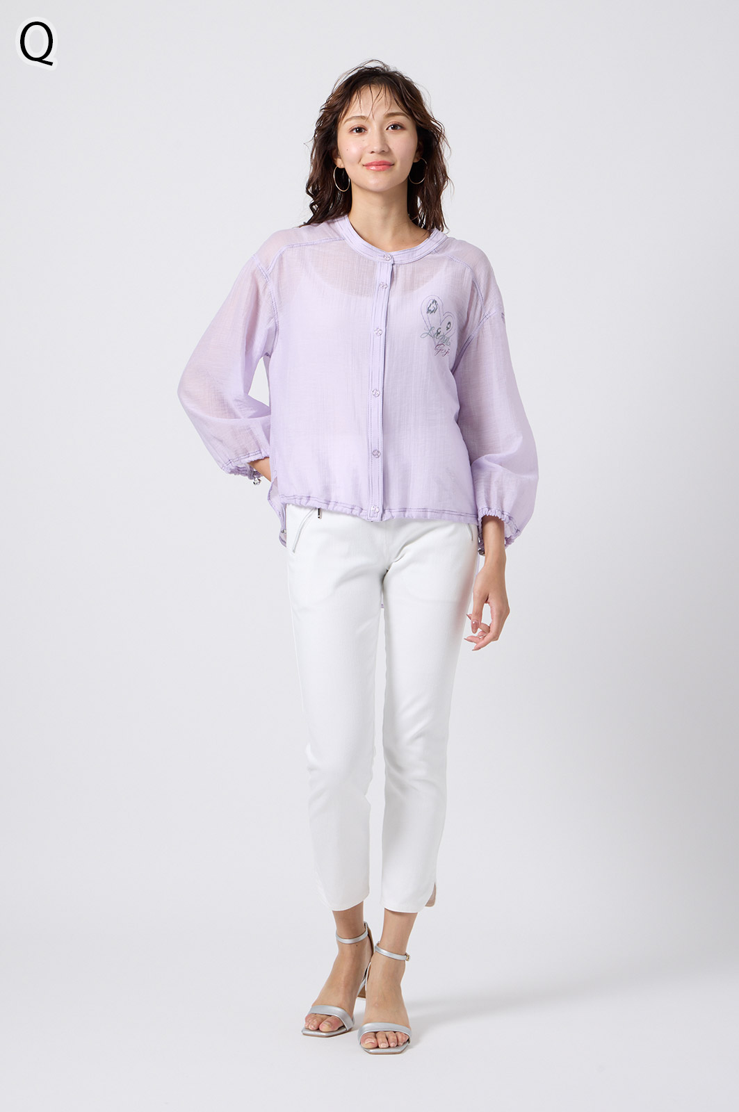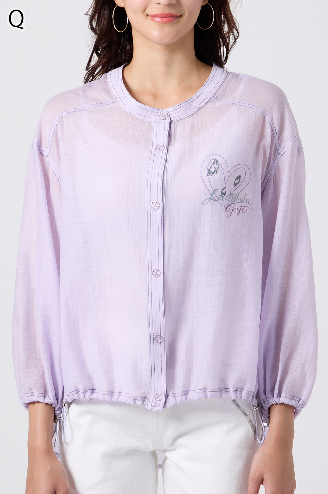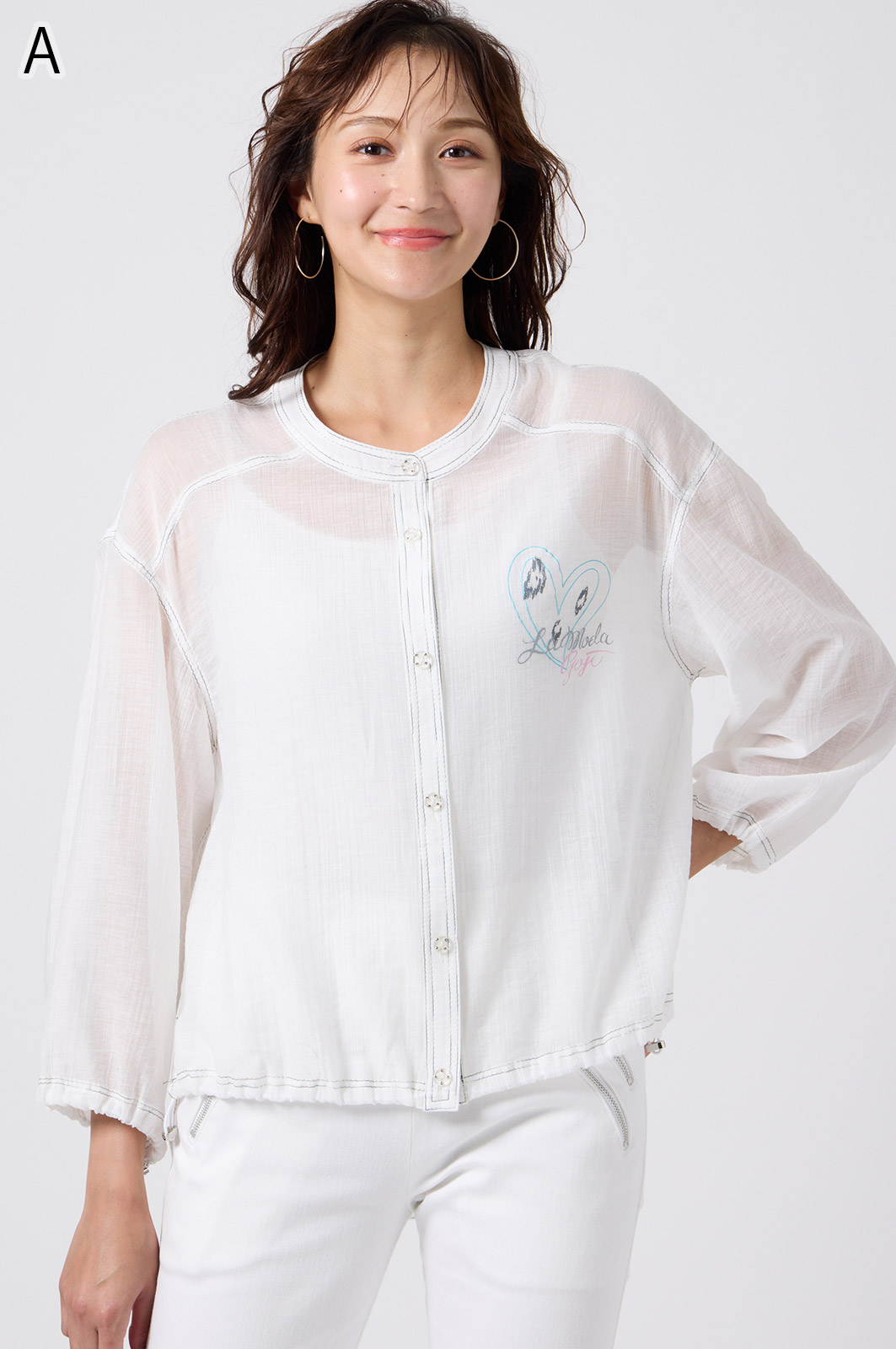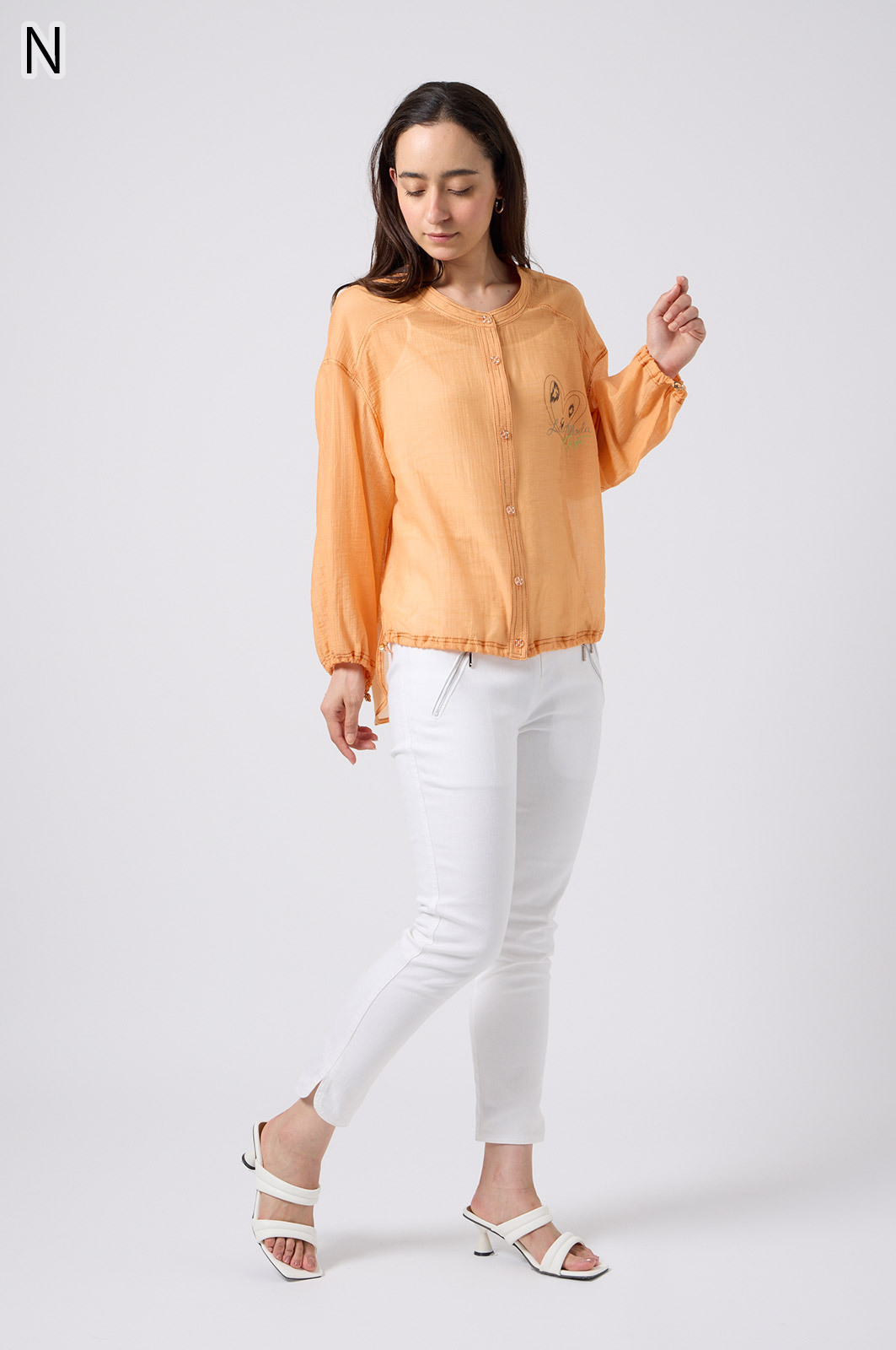 軽くて涼しい綿混のしぼ感素材を使った、ブルゾン風のブラウス。さっと羽織れて、お出かけにも日よけにも大活躍!着まわししやすく、毎日使いたくなる一枚です♪