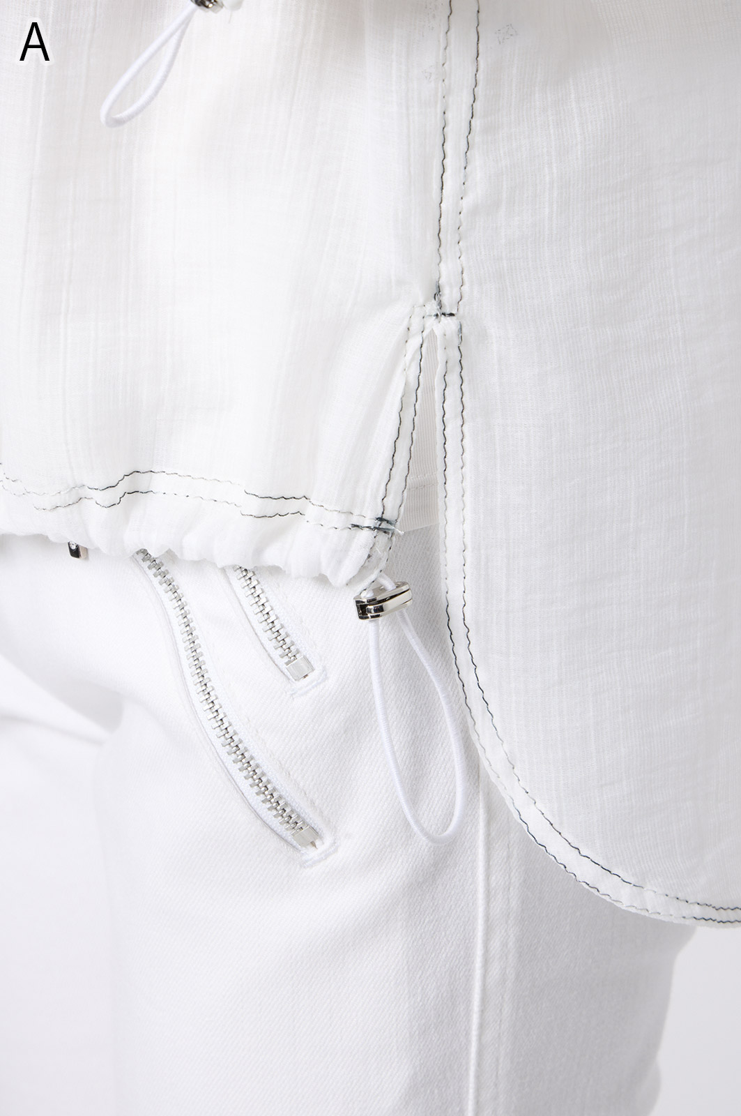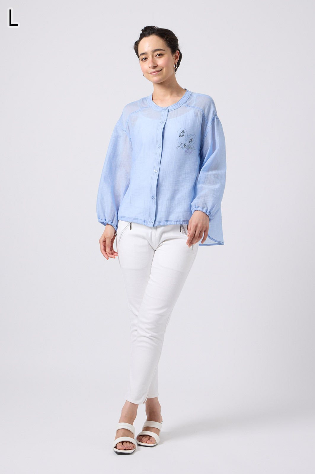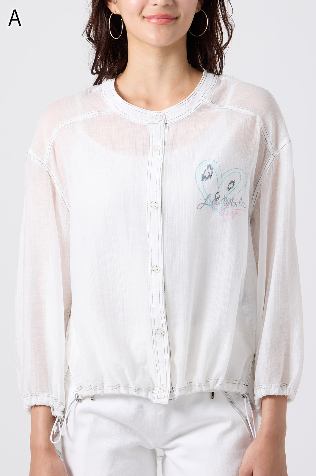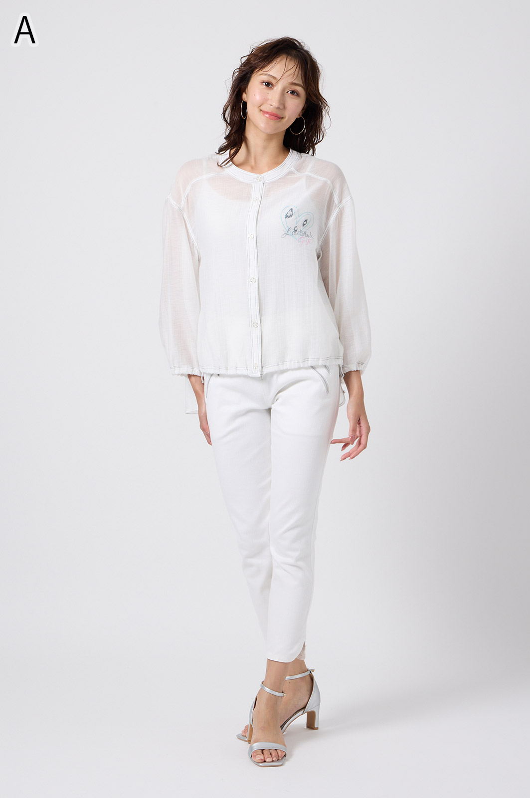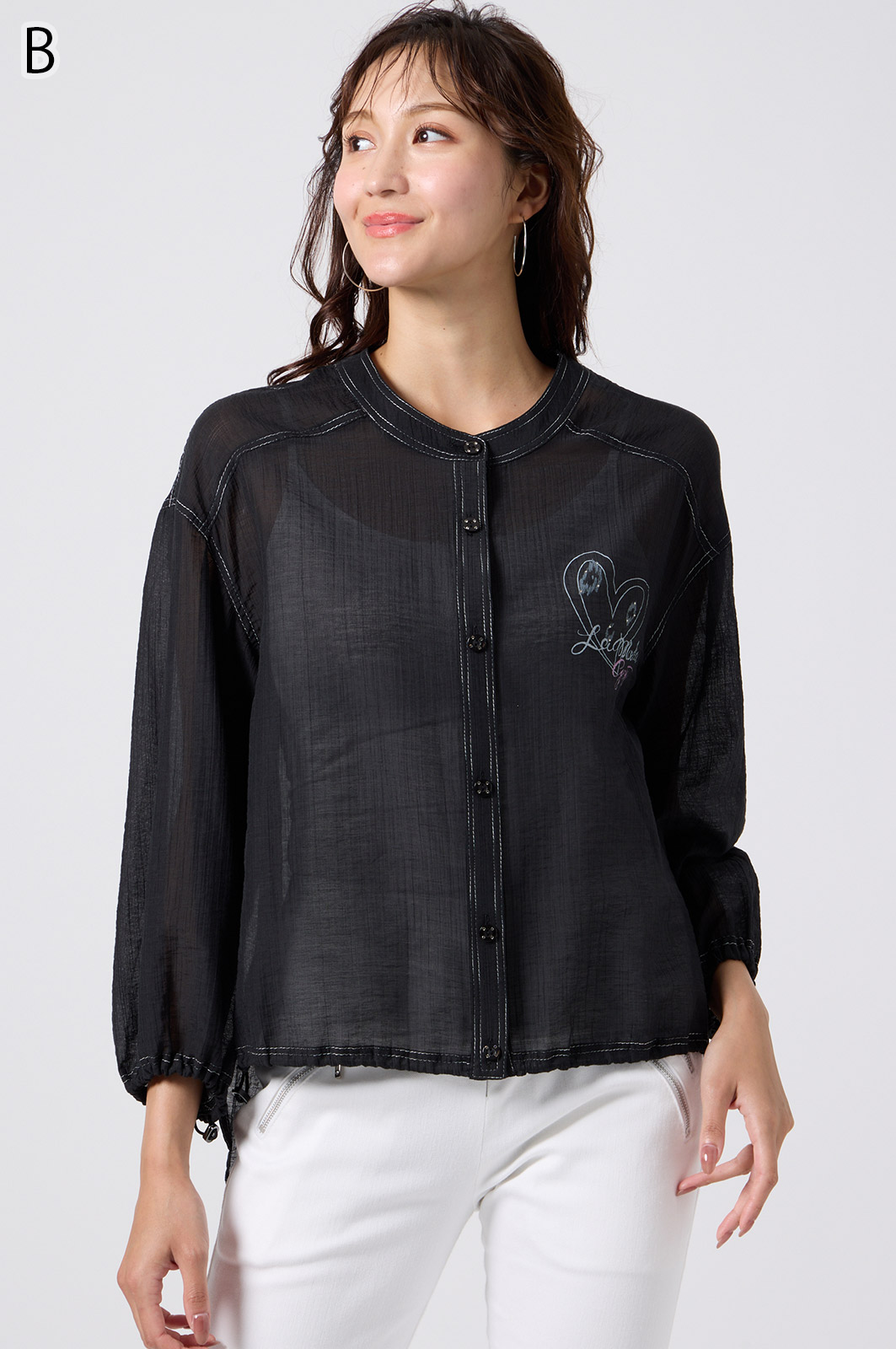 軽くて涼しい綿混のしぼ感素材を使った、ブルゾン風のブラウス。さっと羽織れて、お出かけにも日よけにも大活躍!着まわししやすく、毎日使いたくなる一枚です♪