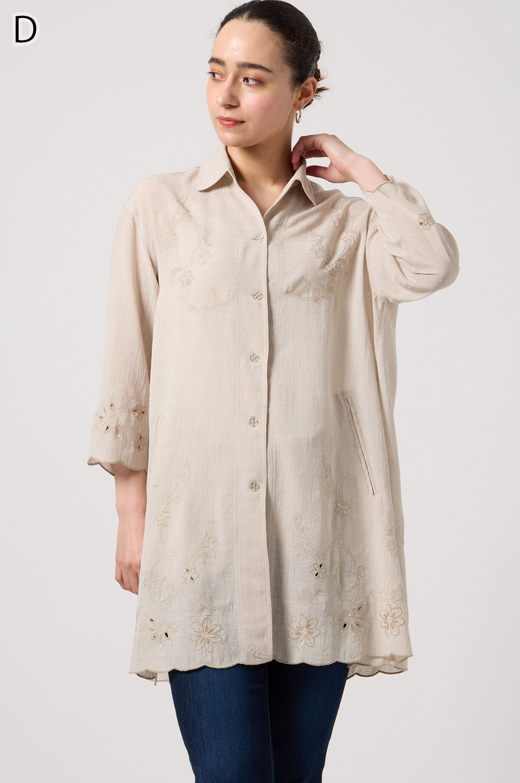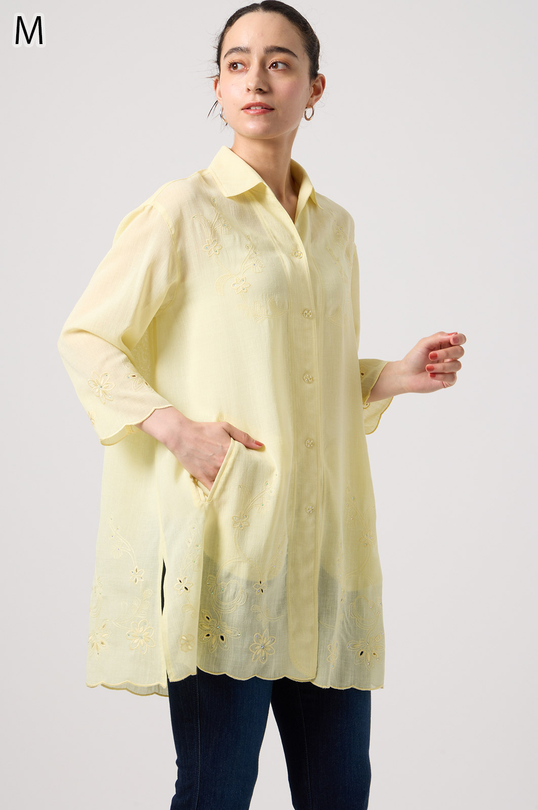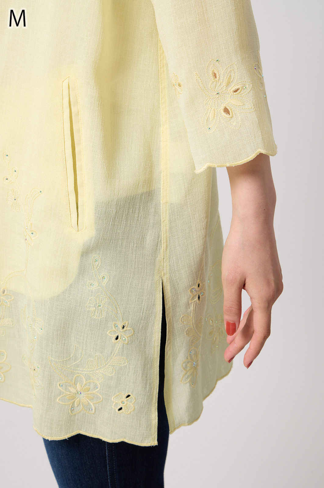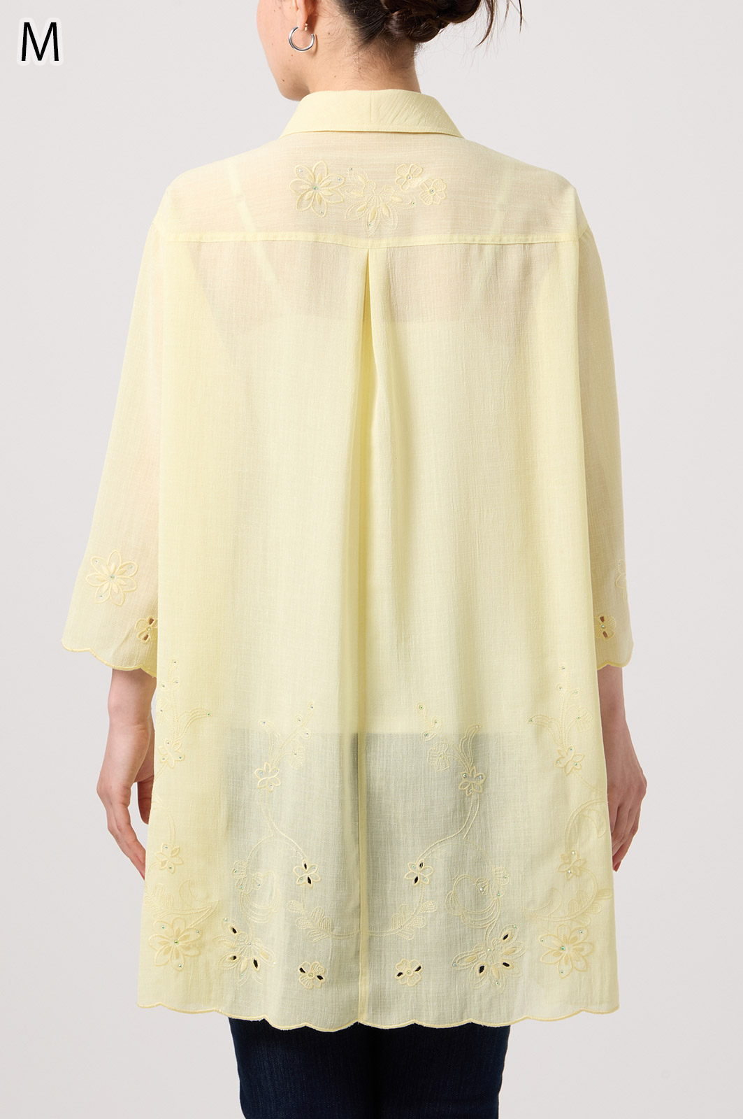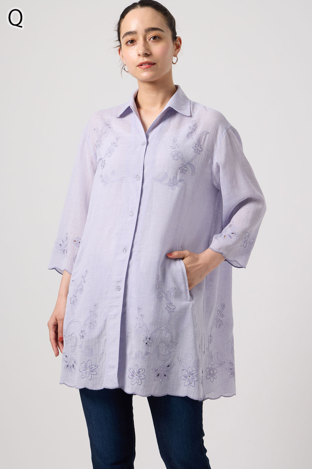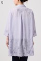 涼しげな風合いの生地に、上品な透かし刺しゅうをプラスした夏にぴったりの軽やか羽織りアイテムです。