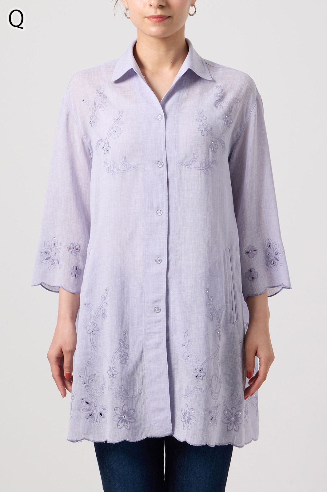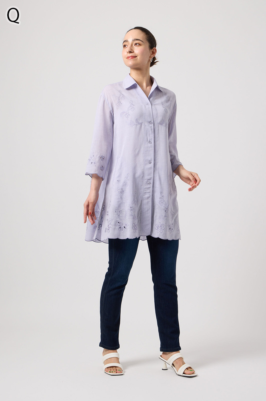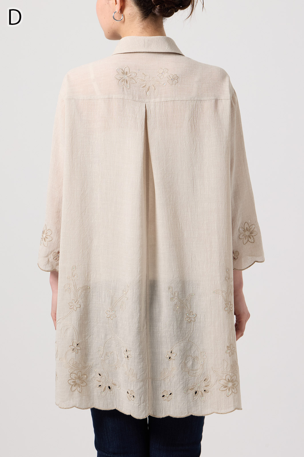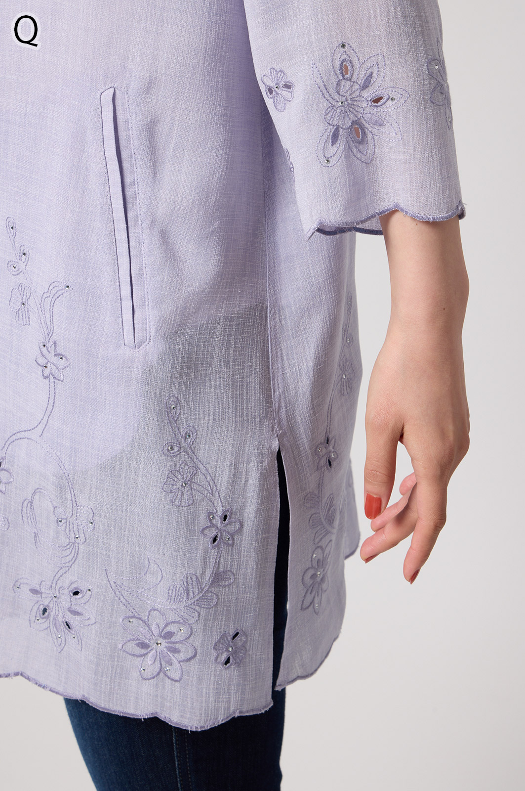 涼しげな風合いの生地に、上品な透かし刺しゅうをプラスした夏にぴったりの軽やか羽織りアイテムです。