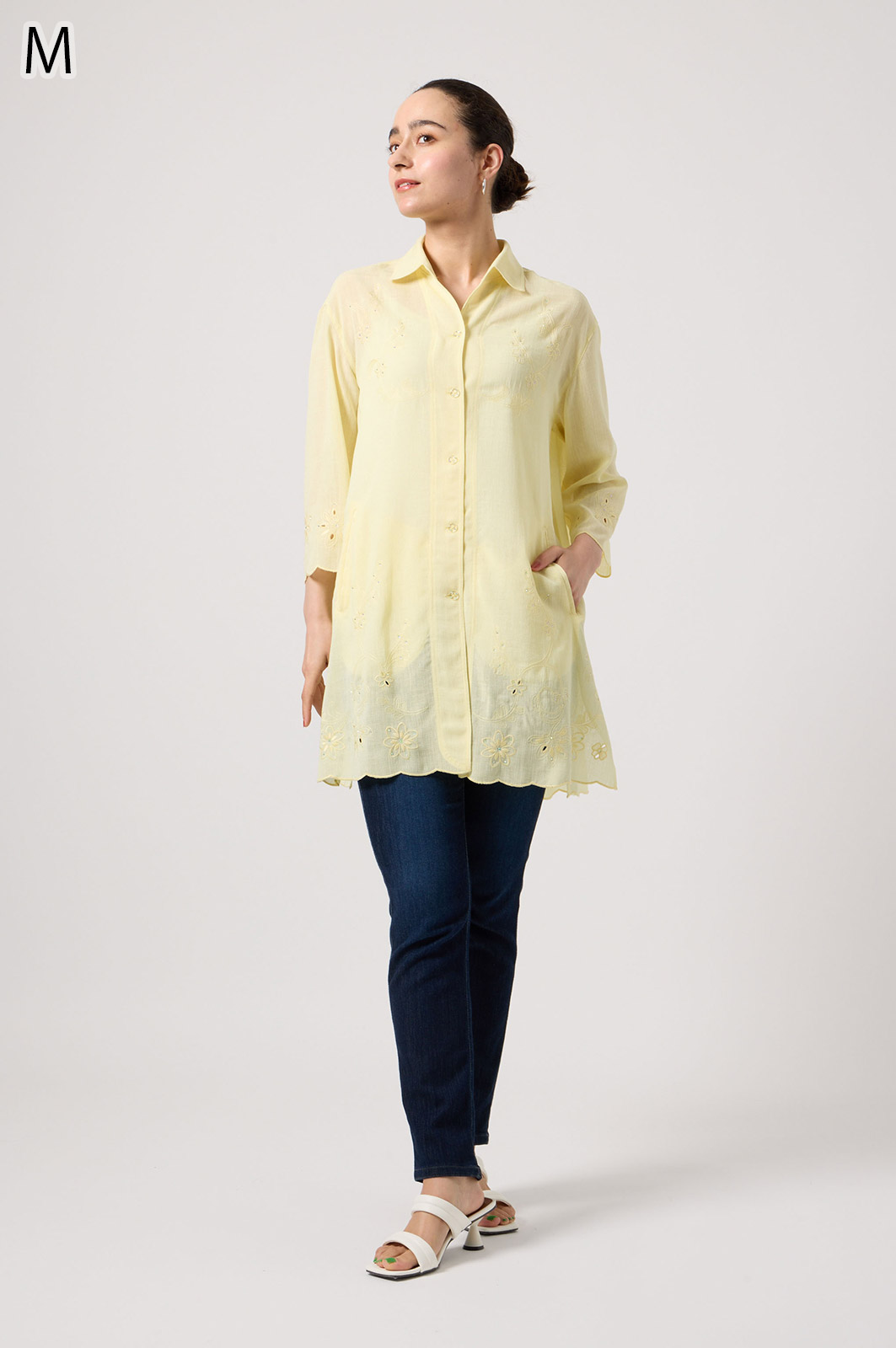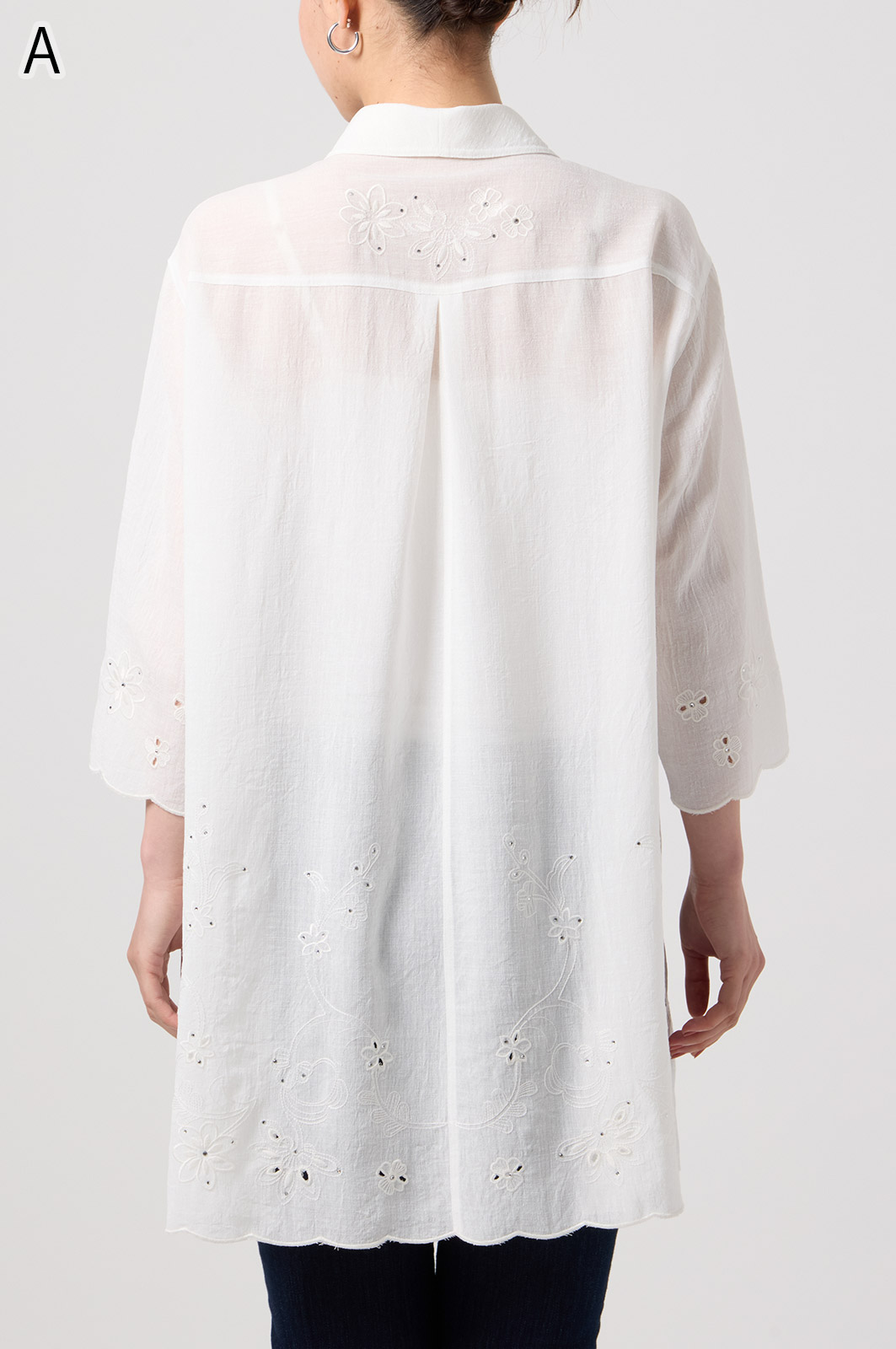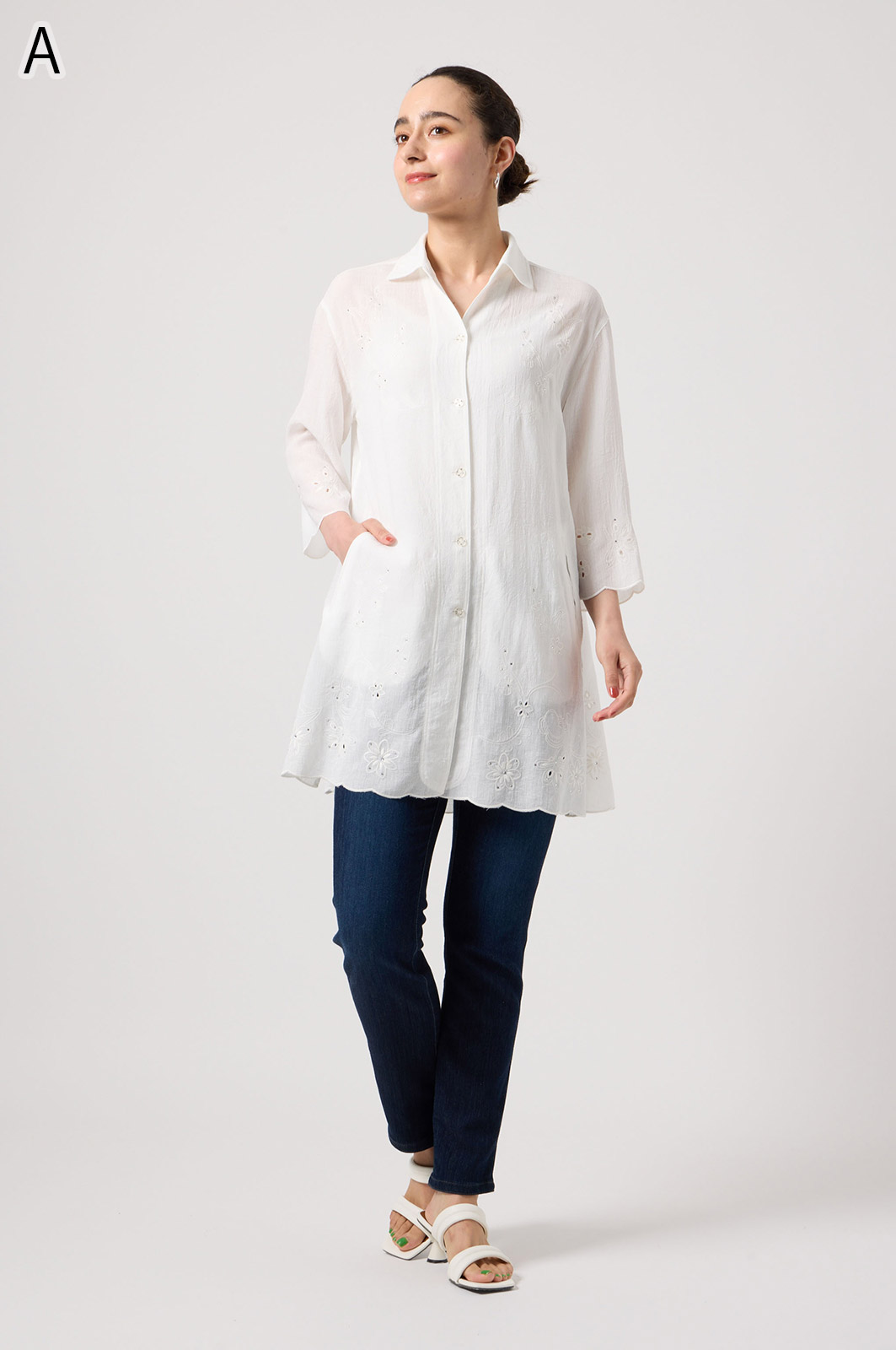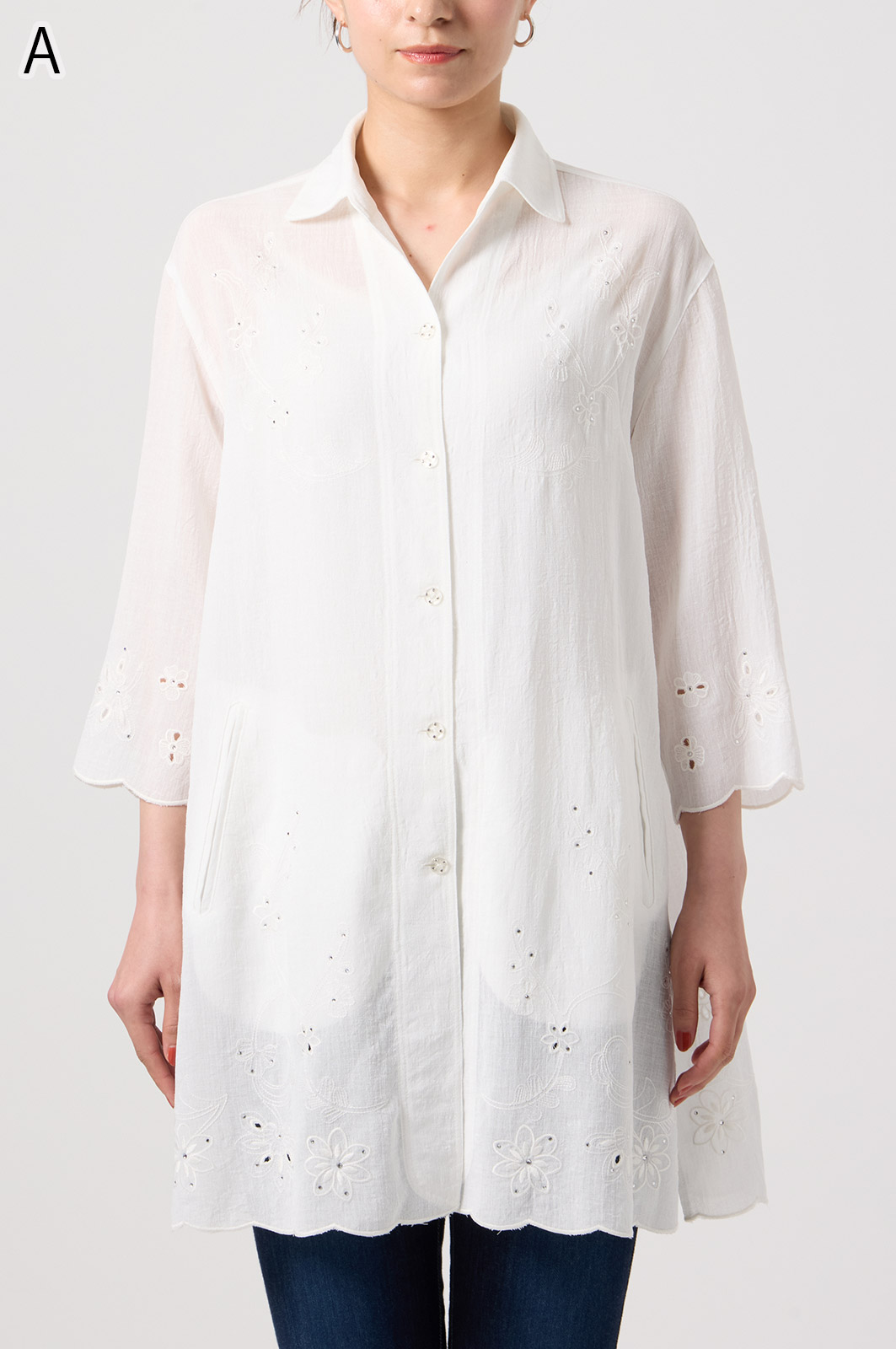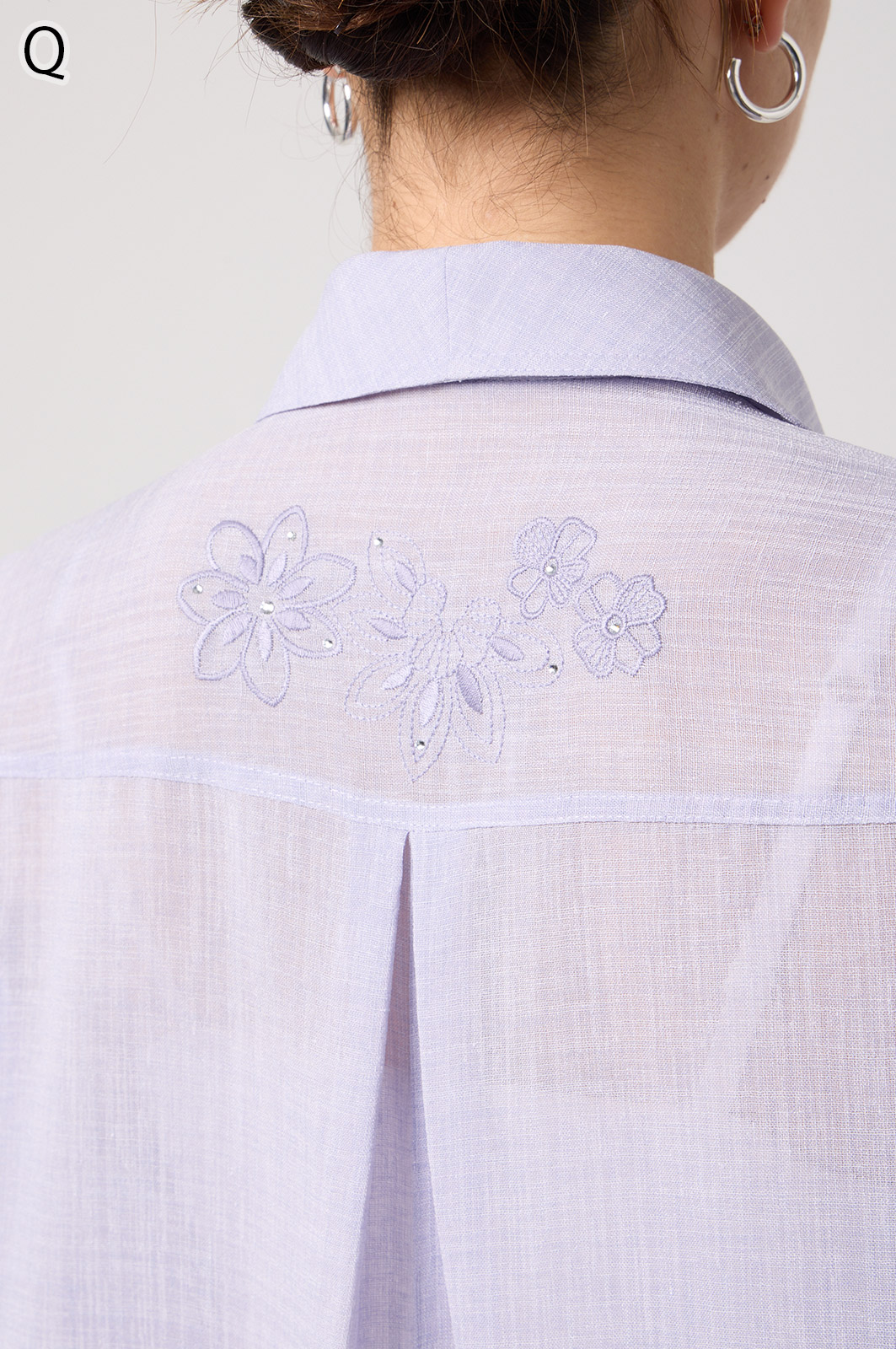 涼しげな風合いの生地に、上品な透かし刺しゅうをプラスした夏にぴったりの軽やか羽織りアイテムです。