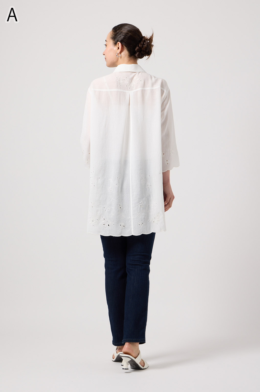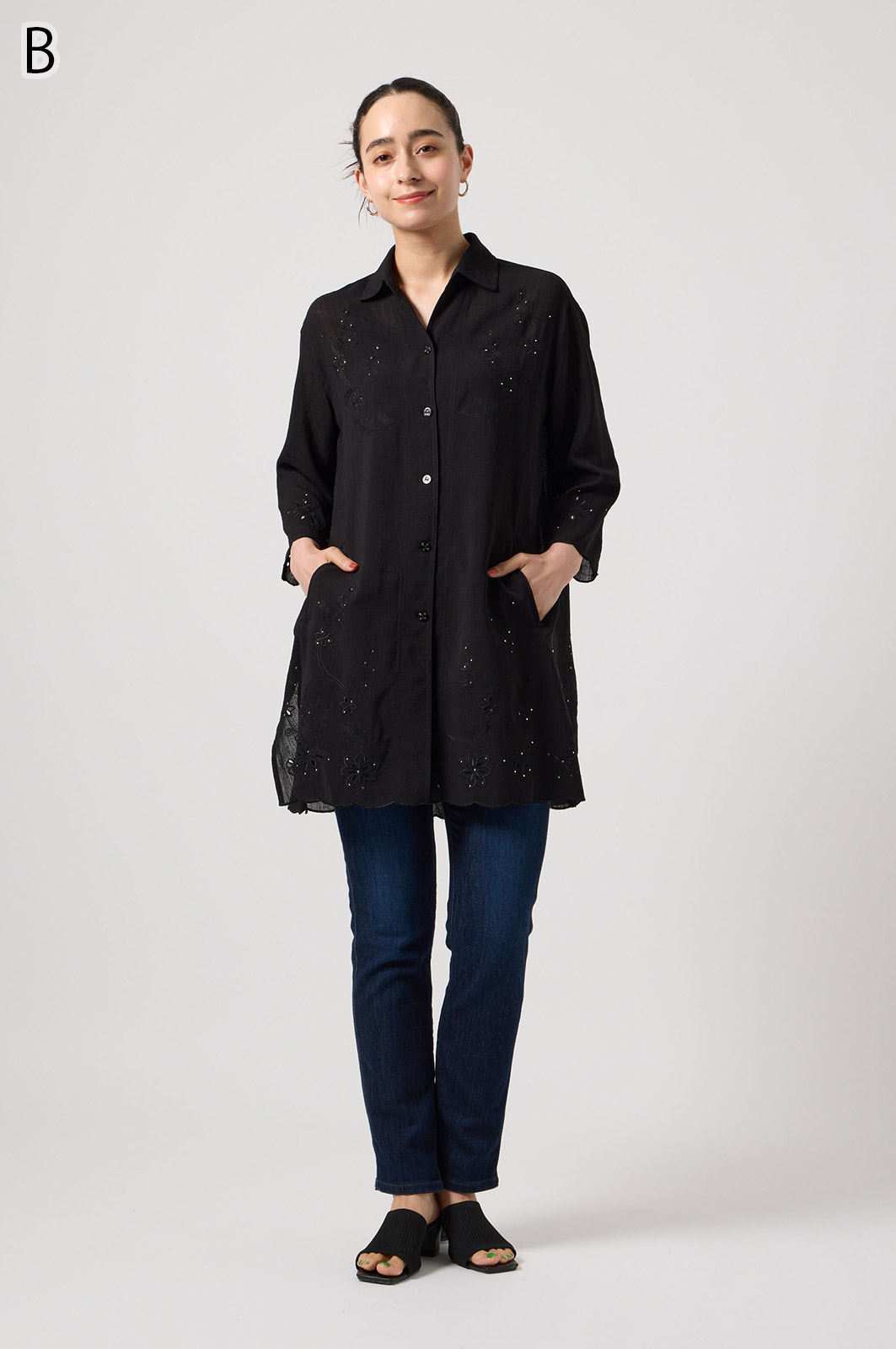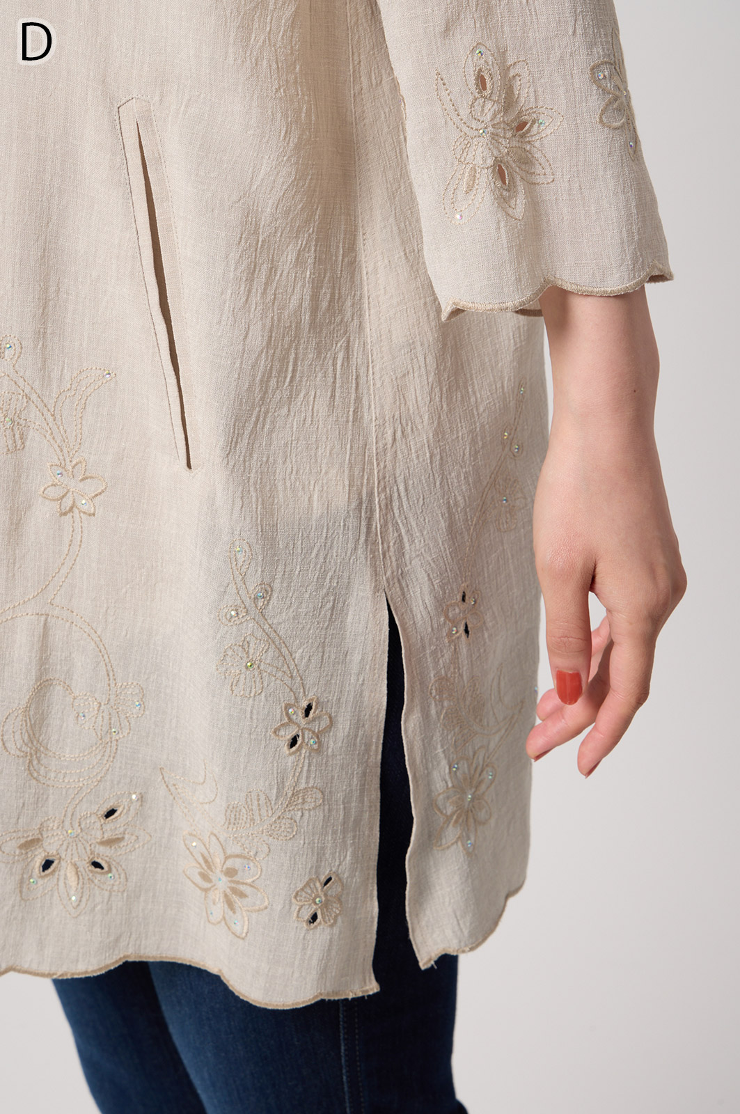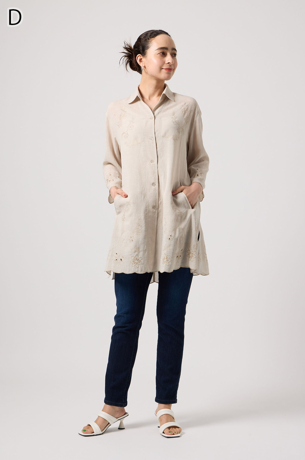 涼しげな風合いの生地に、上品な透かし刺しゅうをプラスした夏にぴったりの軽やか羽織りアイテムです。