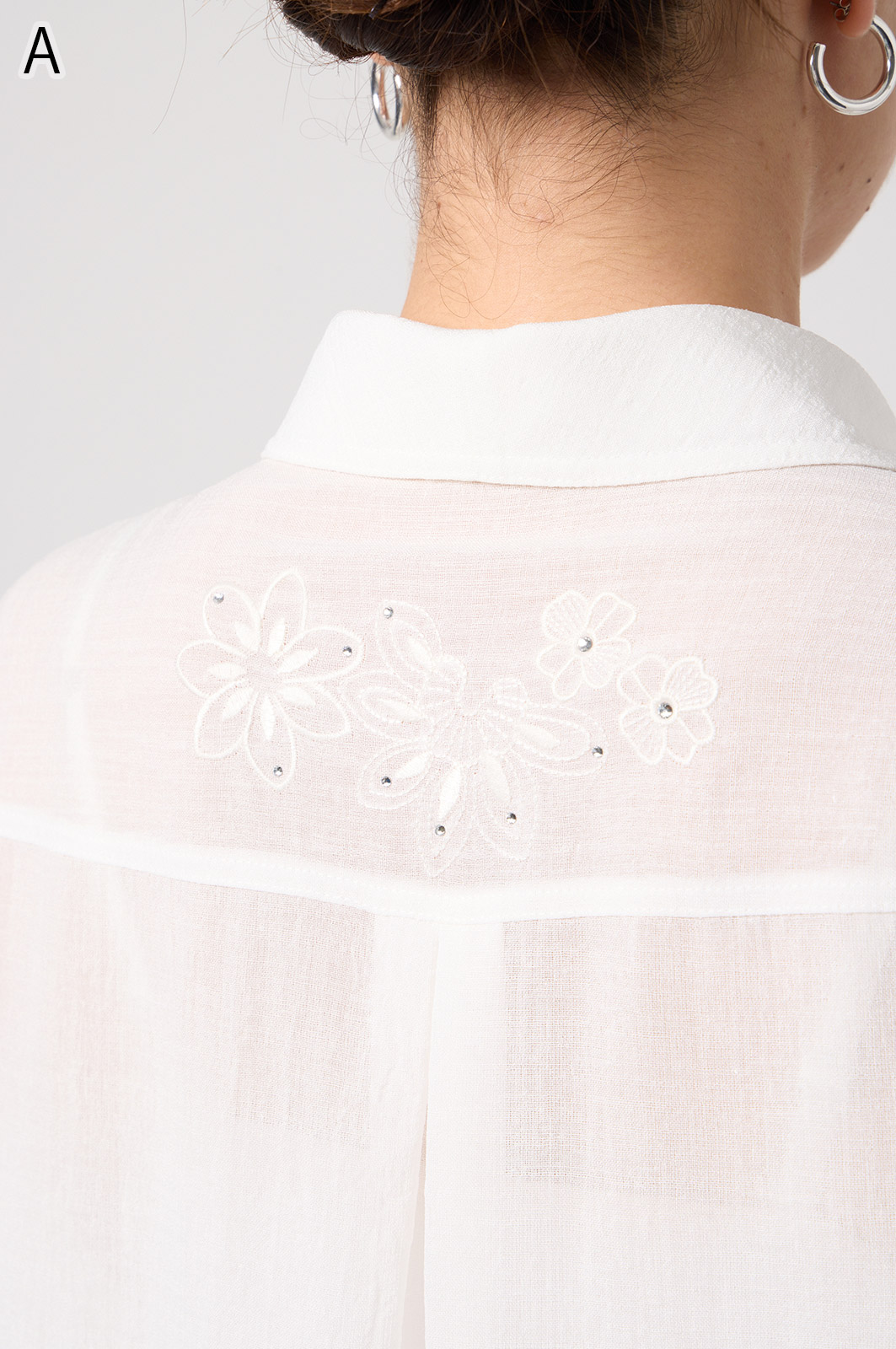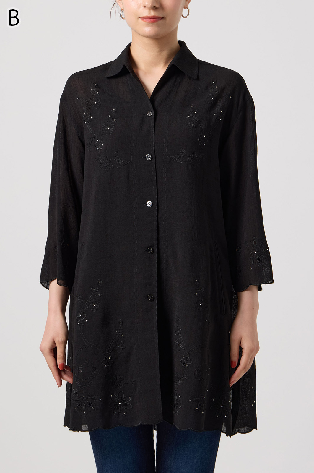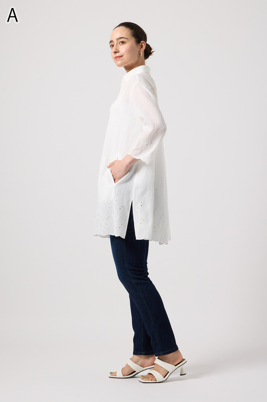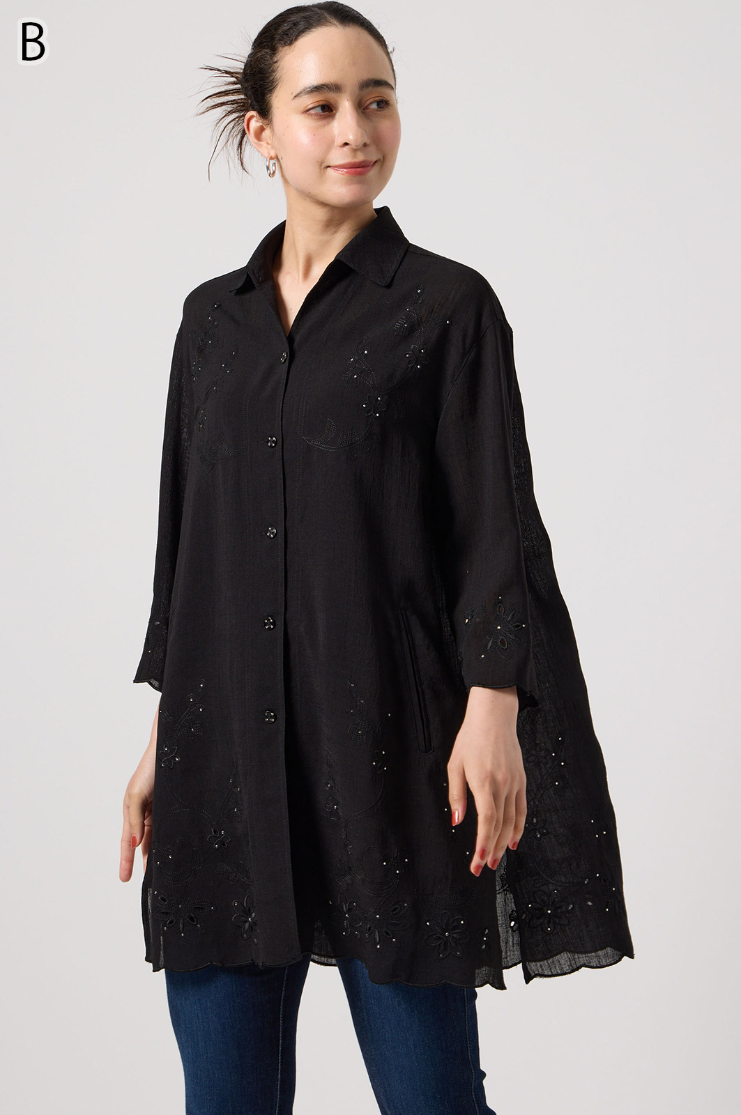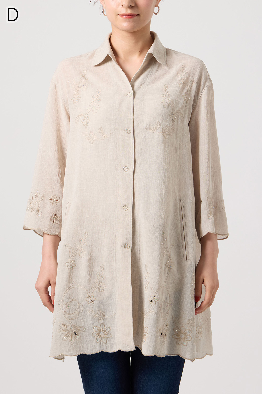 涼しげな風合いの生地に、上品な透かし刺しゅうをプラスした夏にぴったりの軽やか羽織りアイテムです。