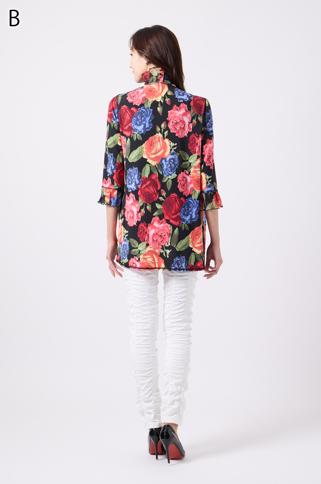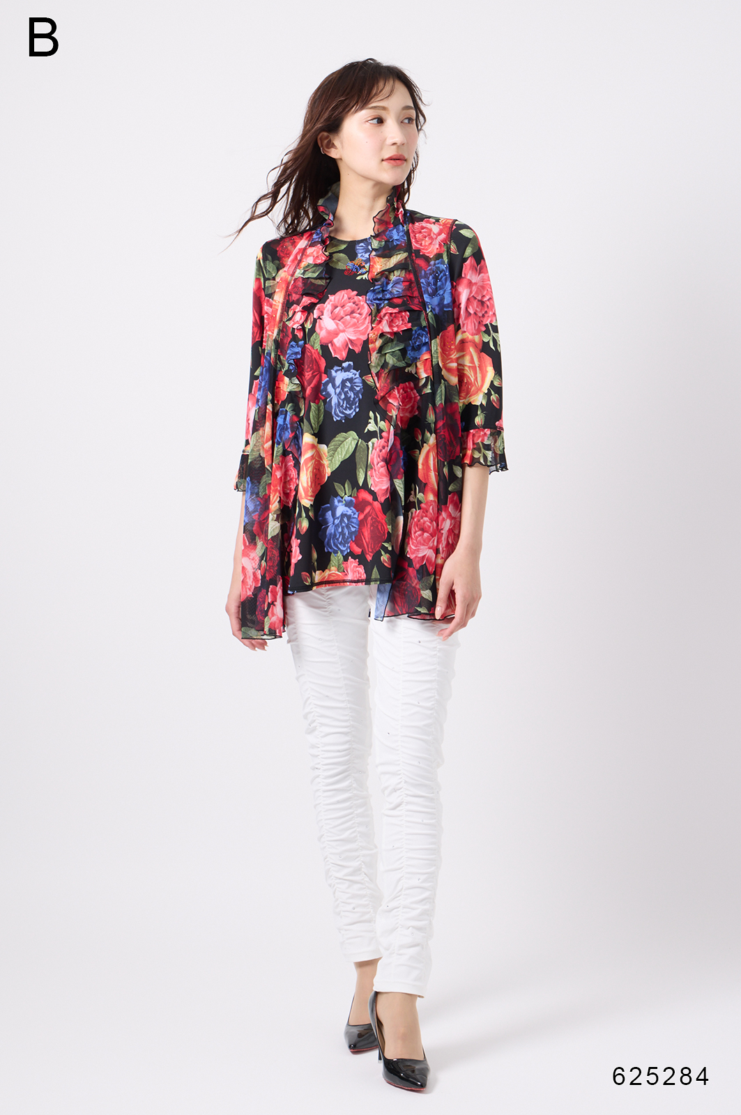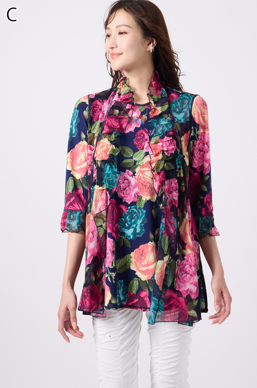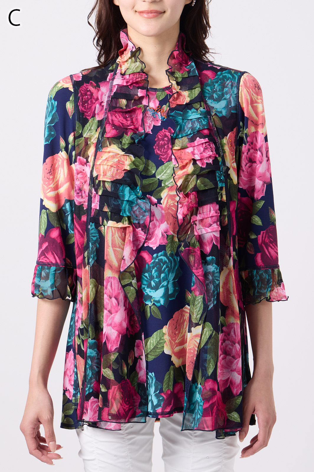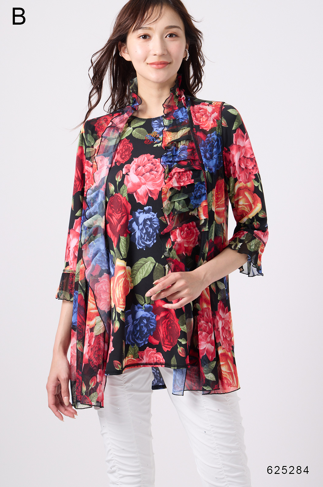 華やかな花柄ニットと軽やかなメッシュ素材を組み合わせた、見た目にも涼しい一枚。前身頃は二重仕立てで、重ね着風の立体感がポイント。Tシャツ感覚で着られて、ほどよく華やかな印象に。