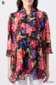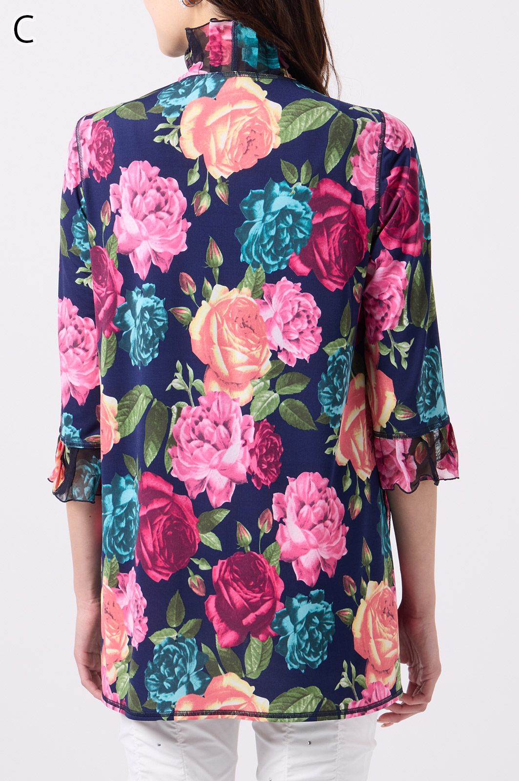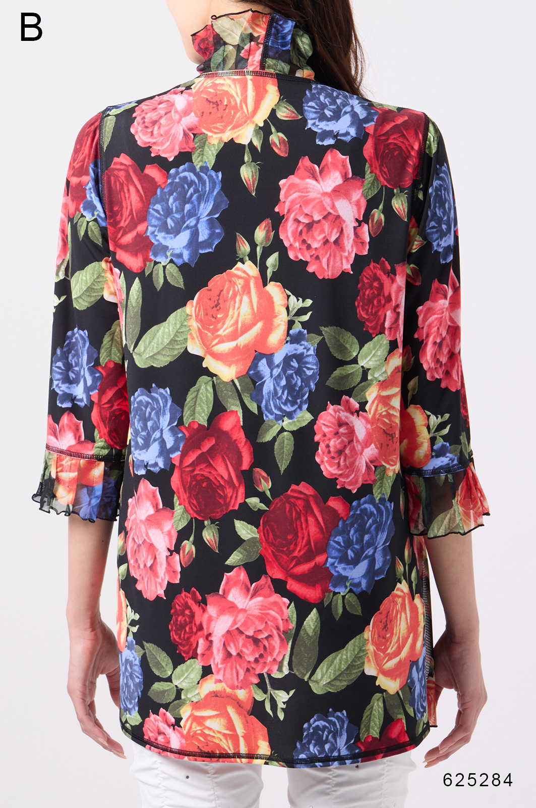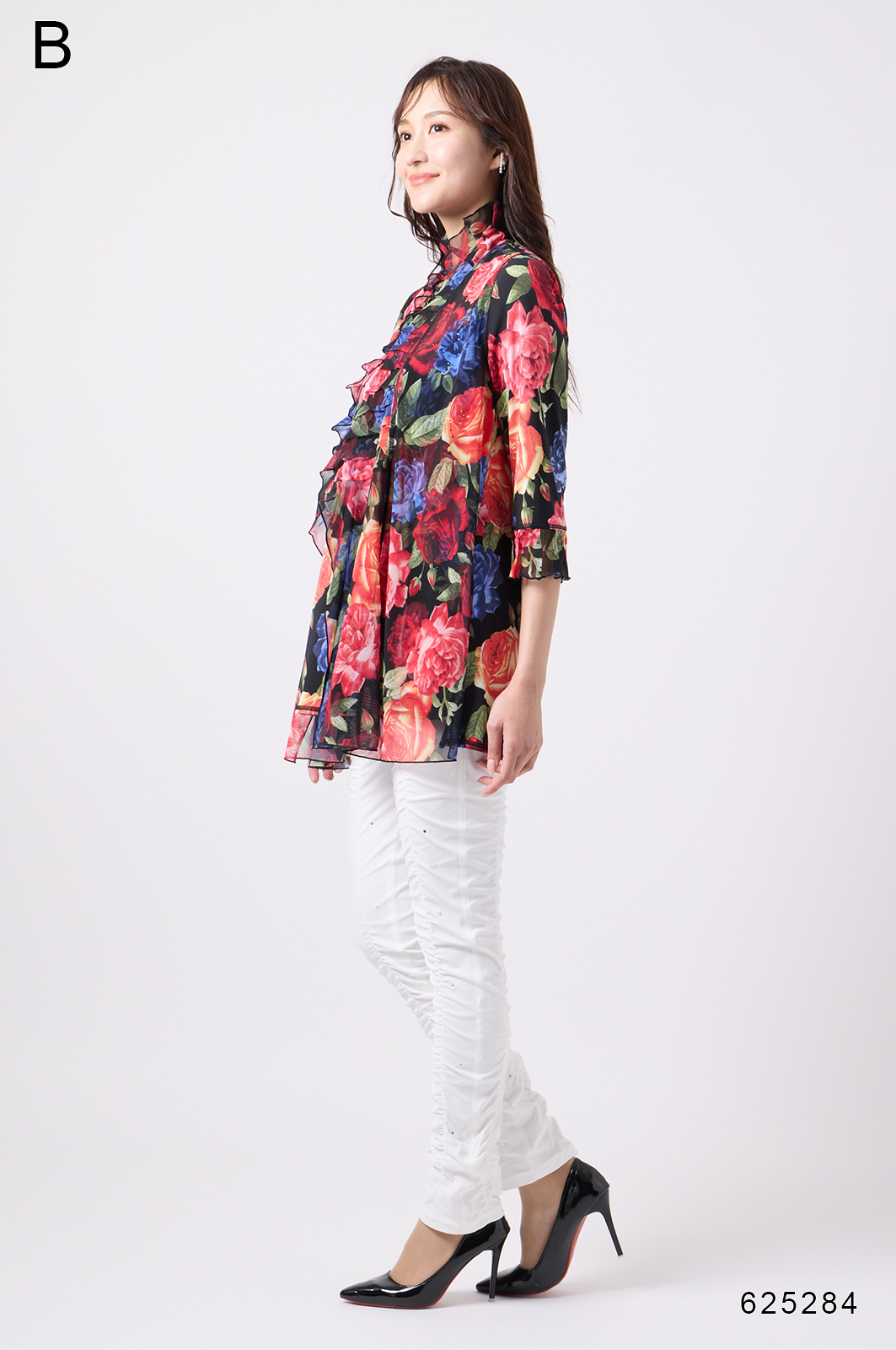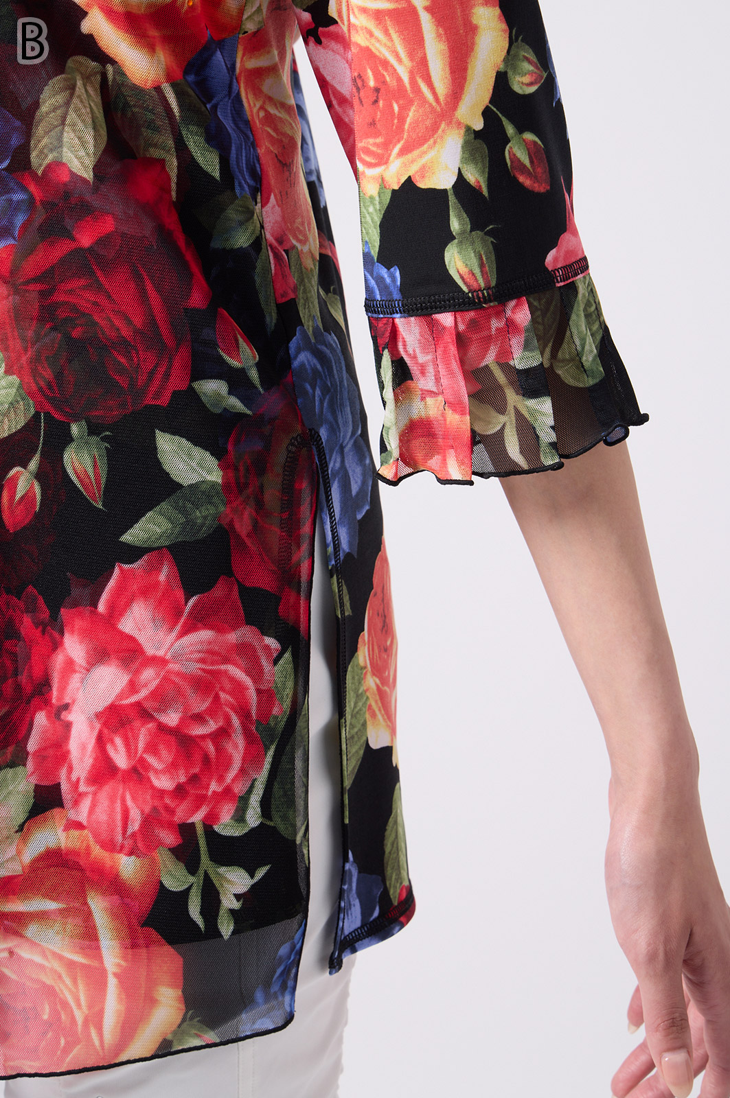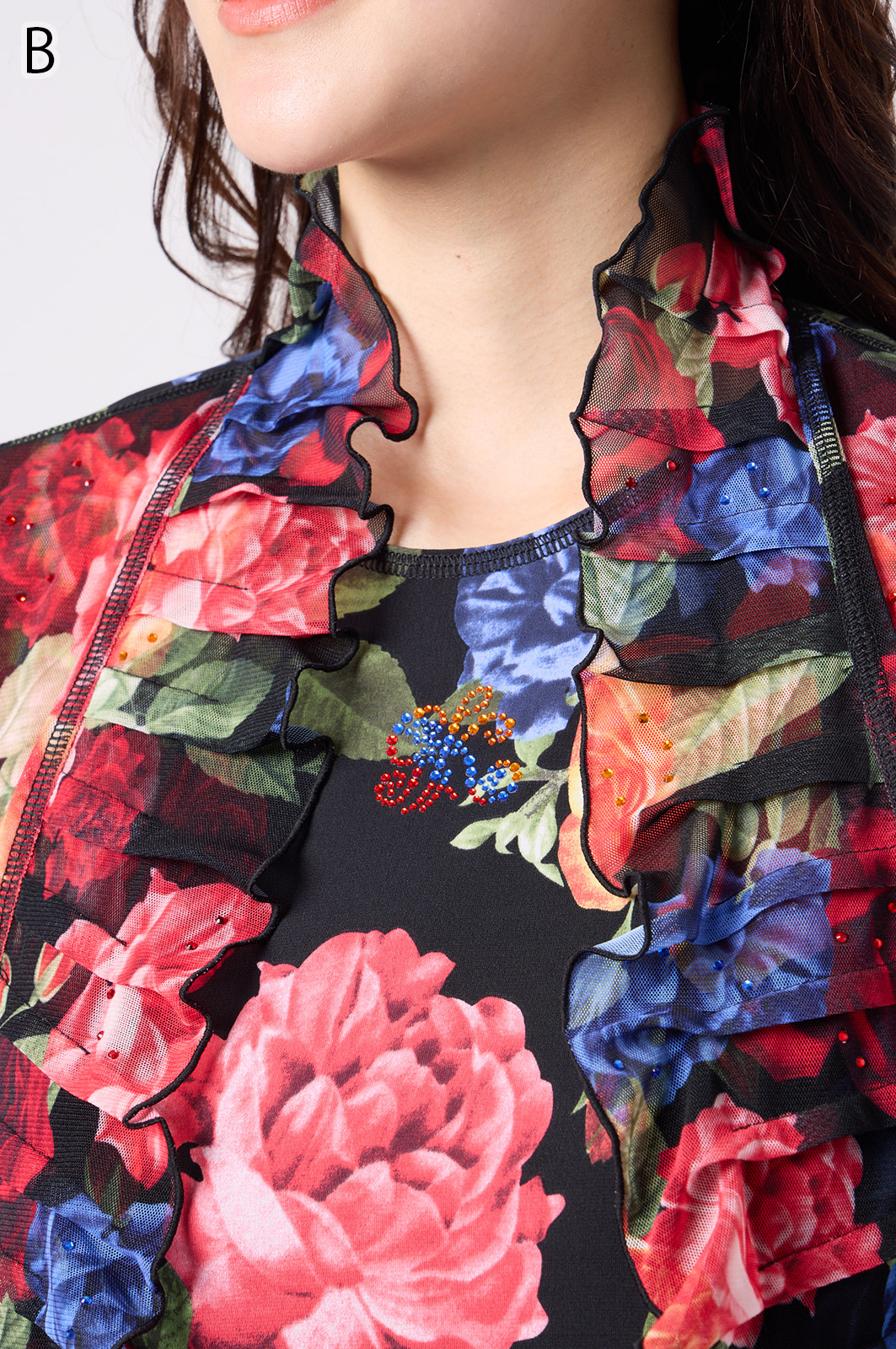 華やかな花柄ニットと軽やかなメッシュ素材を組み合わせた、見た目にも涼しい一枚。前身頃は二重仕立てで、重ね着風の立体感がポイント。Tシャツ感覚で着られて、ほどよく華やかな印象に。