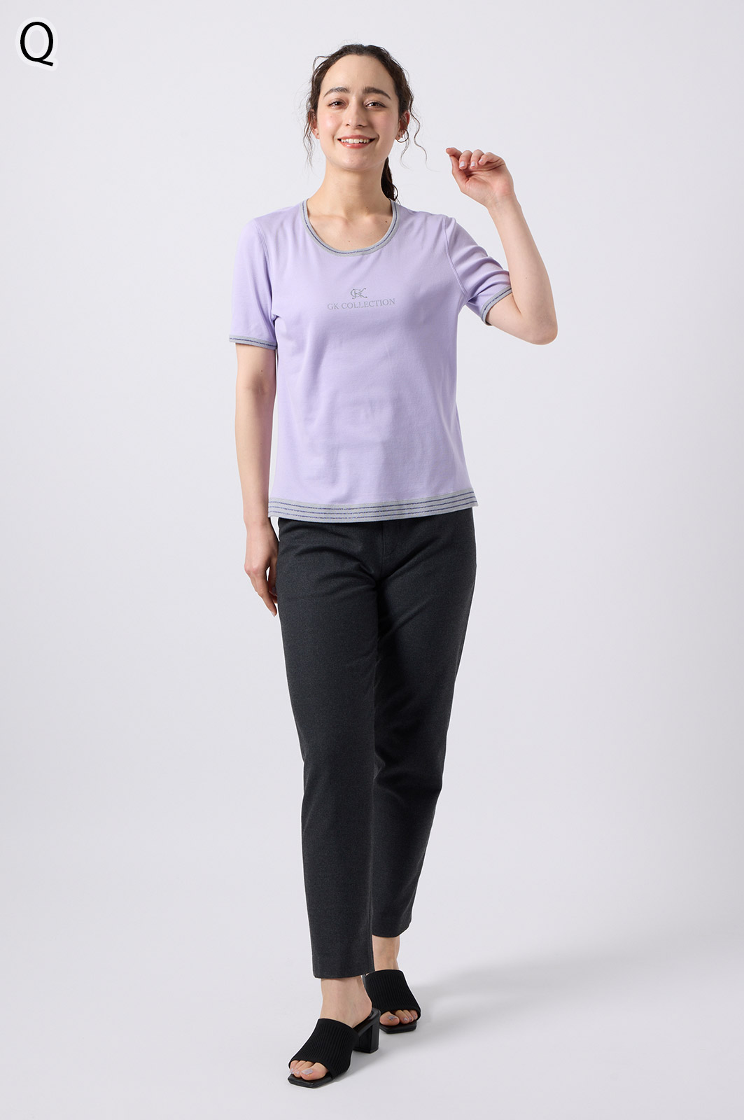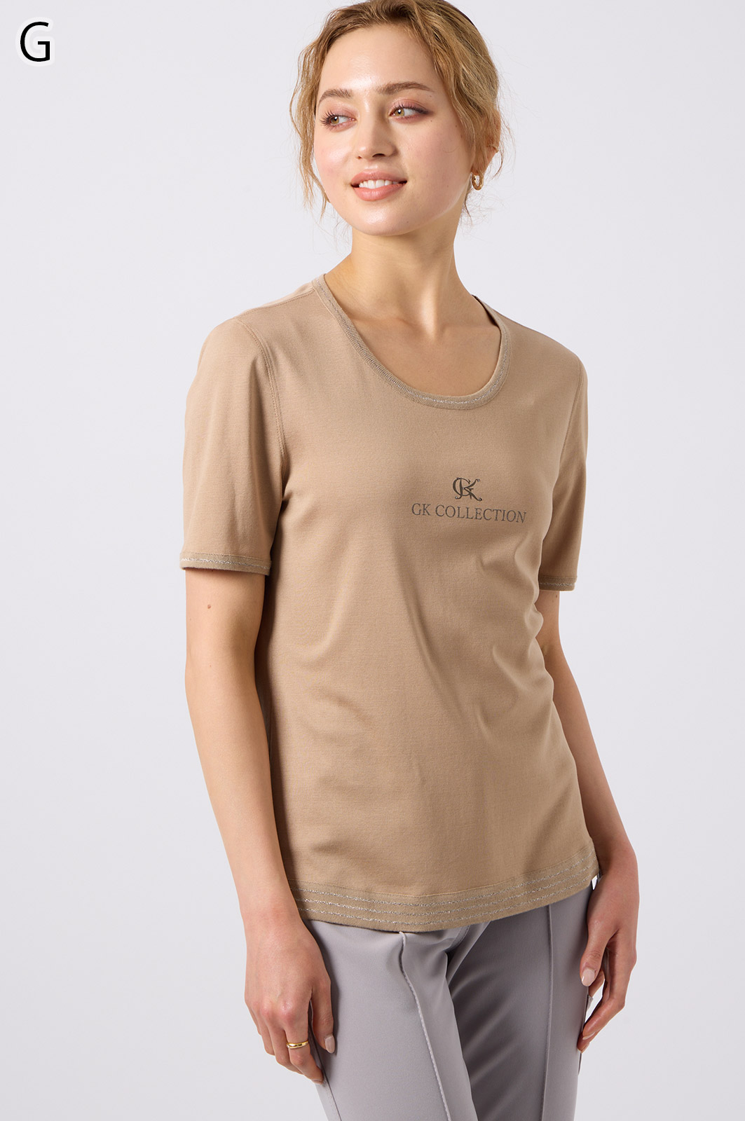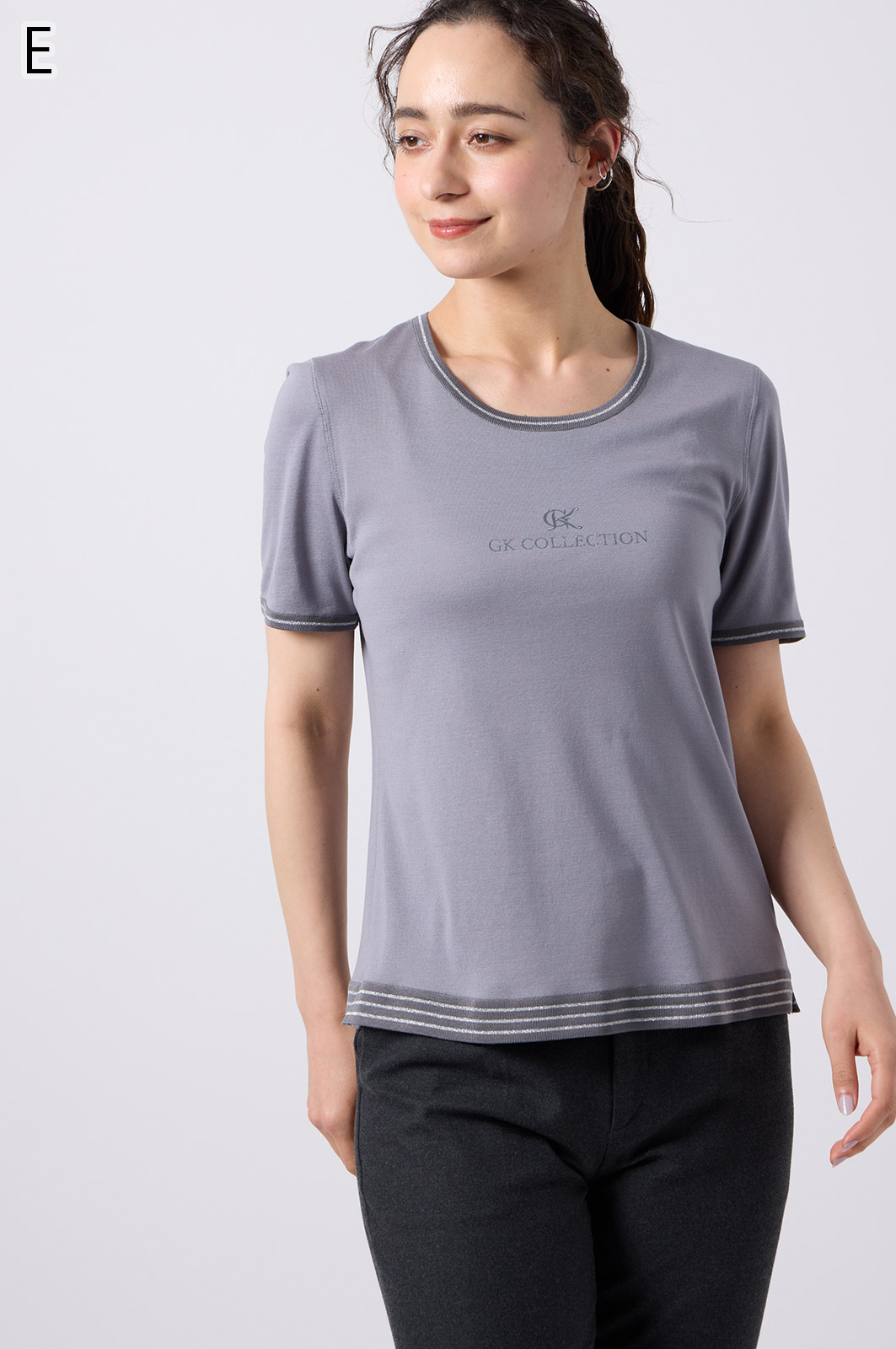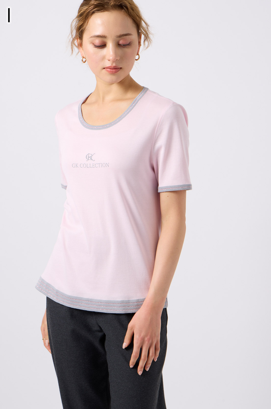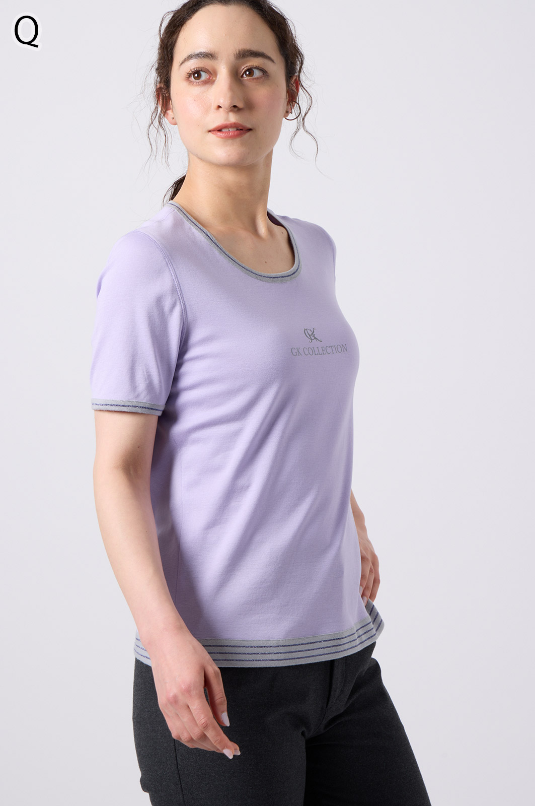 すっきり着られるストレートな形の半袖Tシャツ。首元や袖、すそには綿素材にラメをプラスした縁取り付きで、きらっと上品な仕上がり。