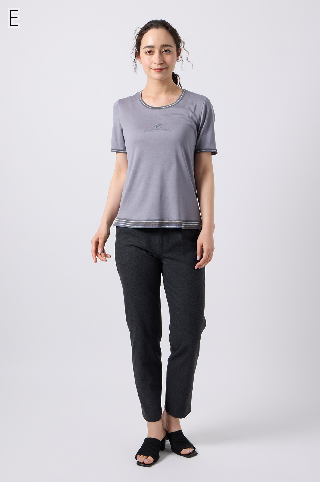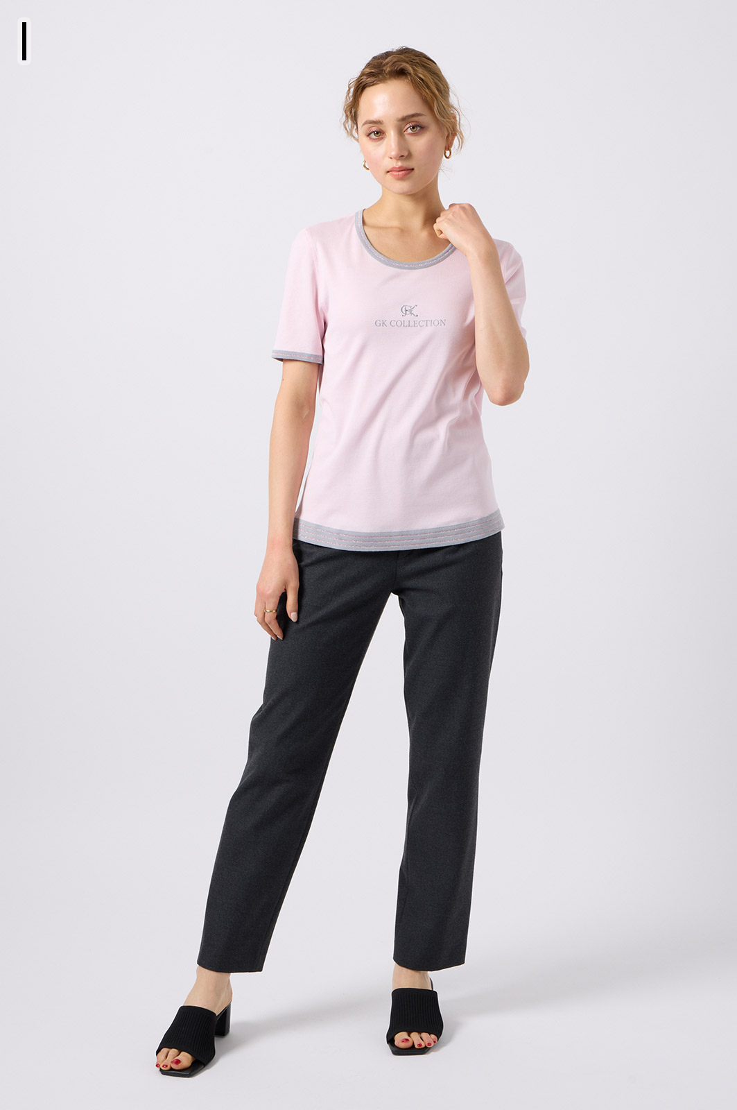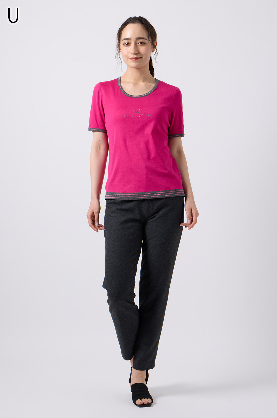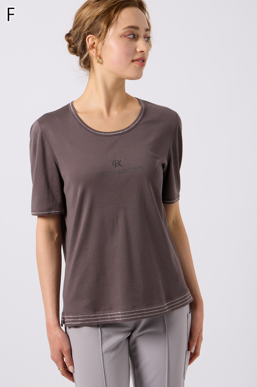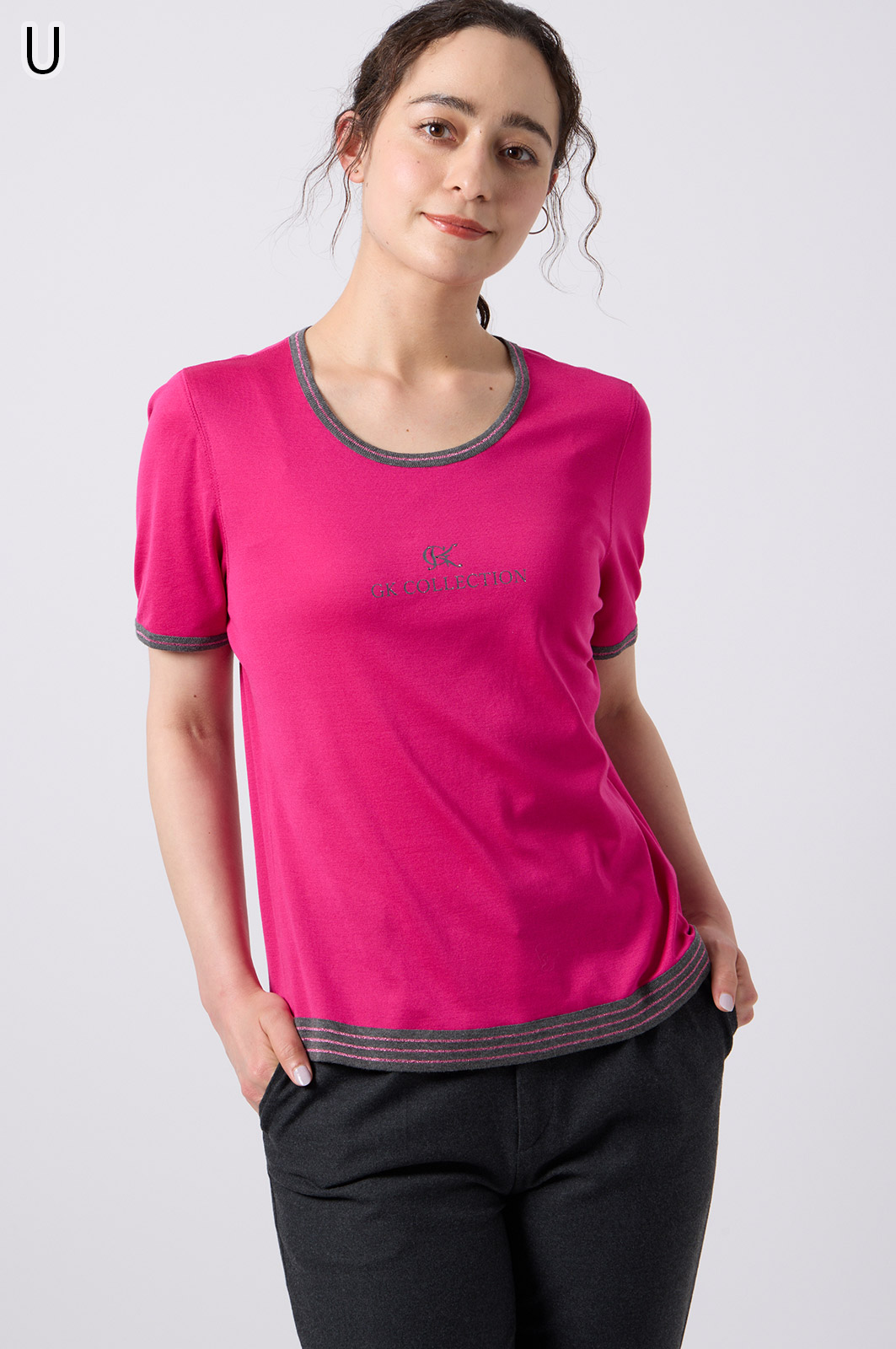 すっきり着られるストレートな形の半袖Tシャツ。首元や袖、すそには綿素材にラメをプラスした縁取り付きで、きらっと上品な仕上がり。