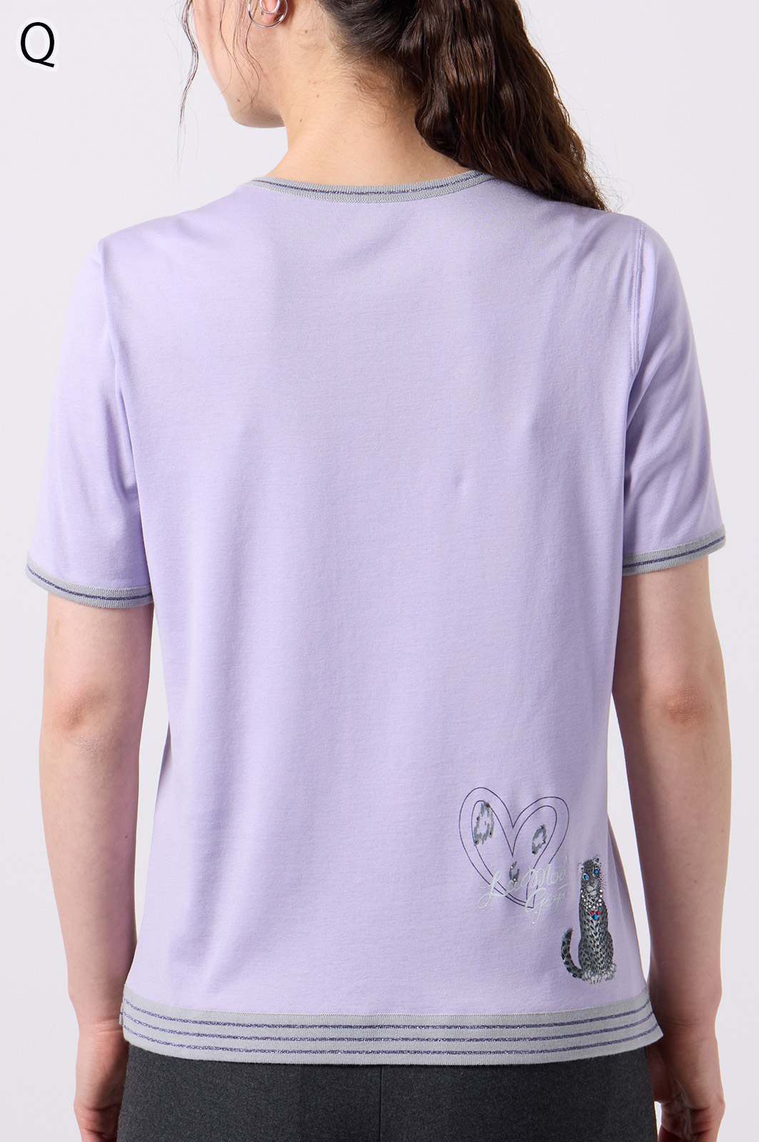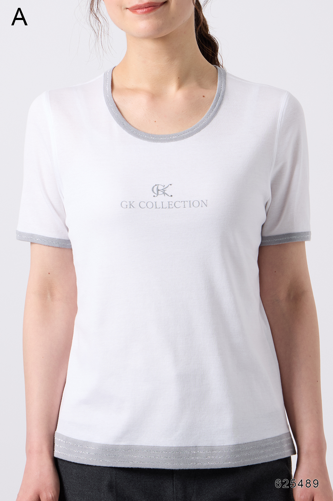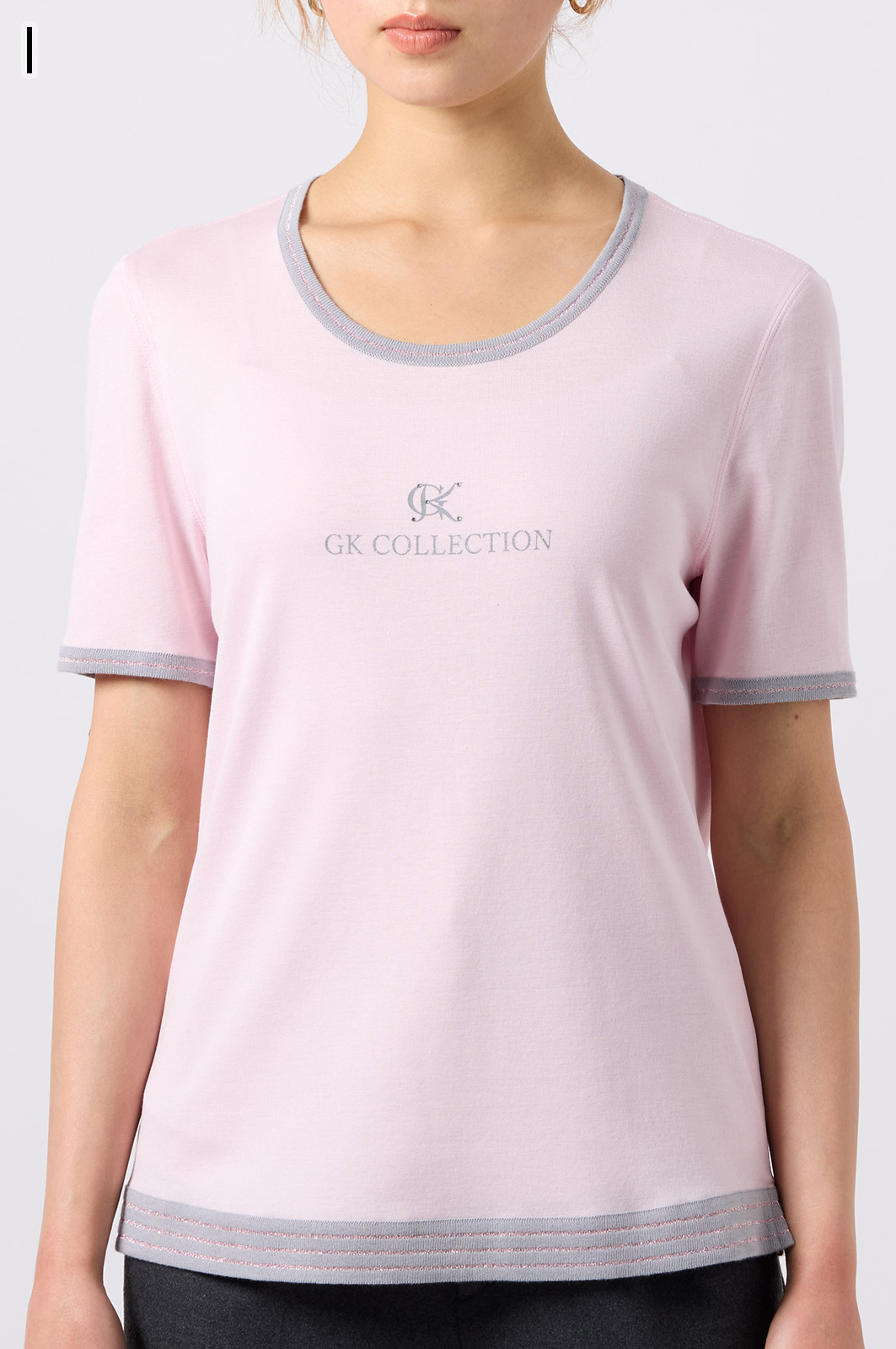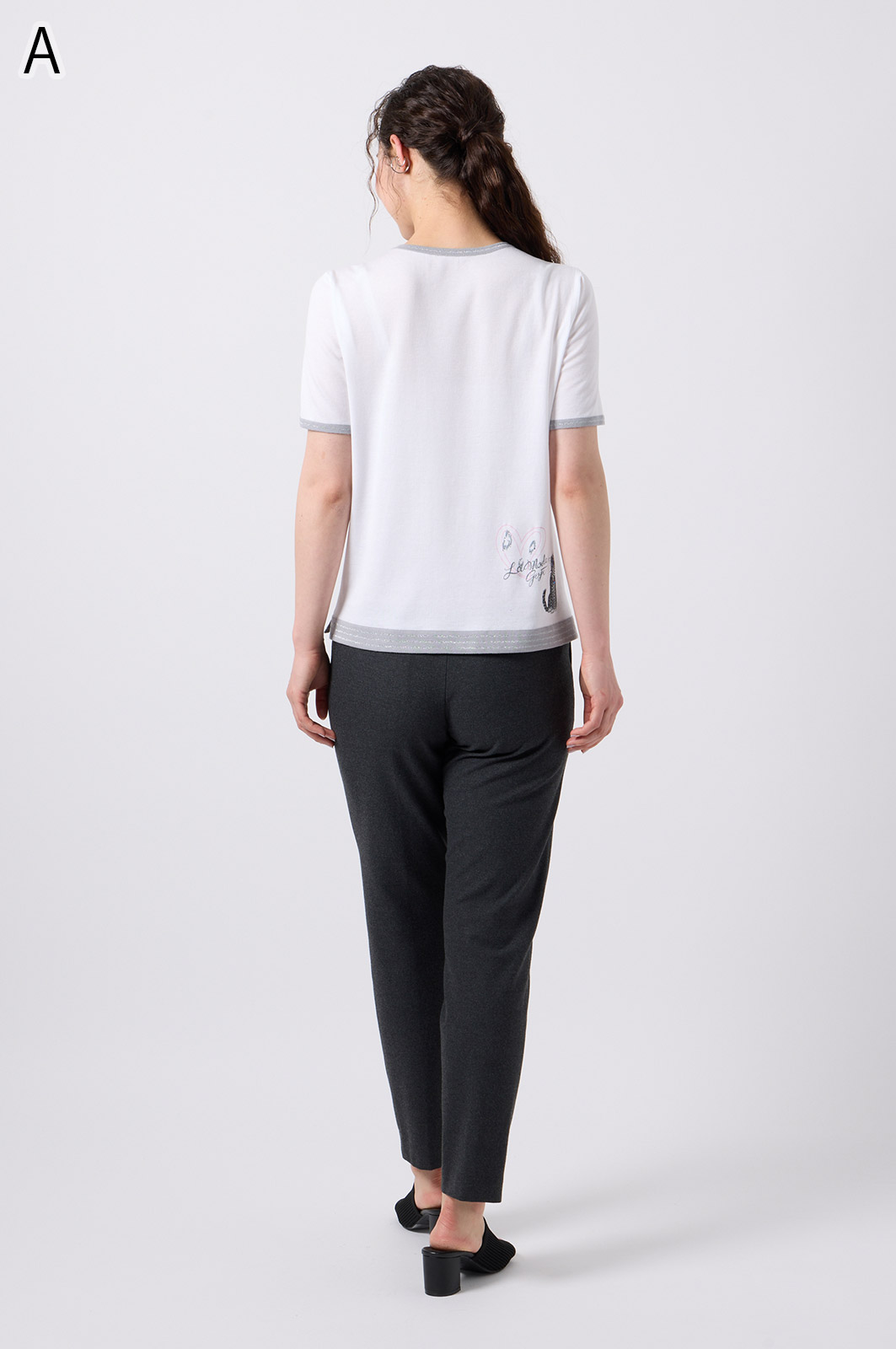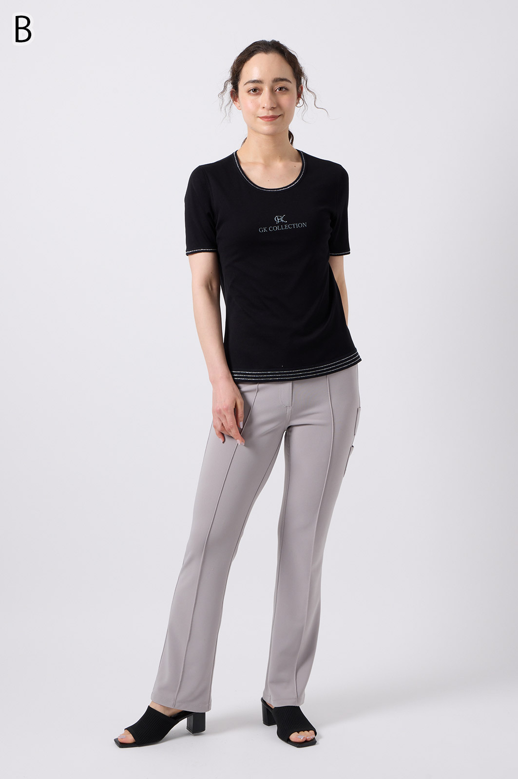 すっきり着られるストレートな形の半袖Tシャツ。首元や袖、すそには綿素材にラメをプラスした縁取り付きで、きらっと上品な仕上がり。