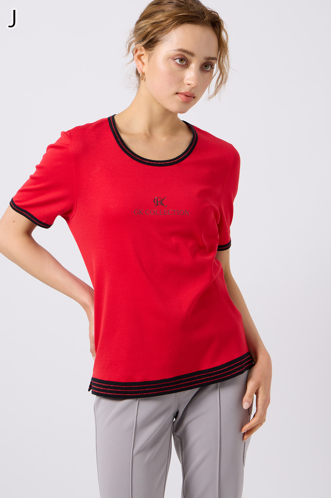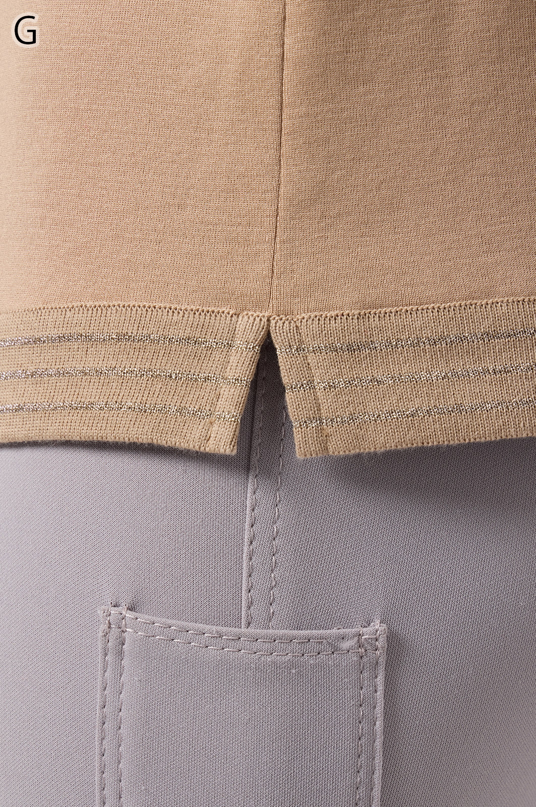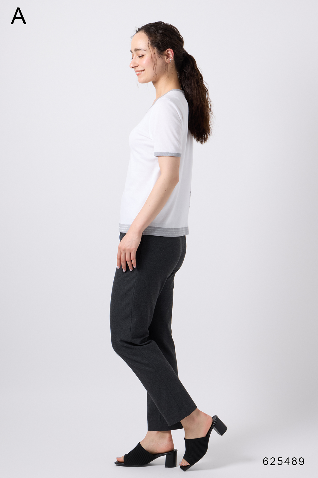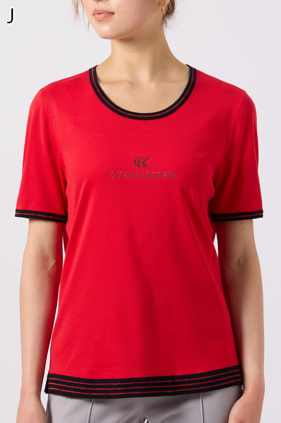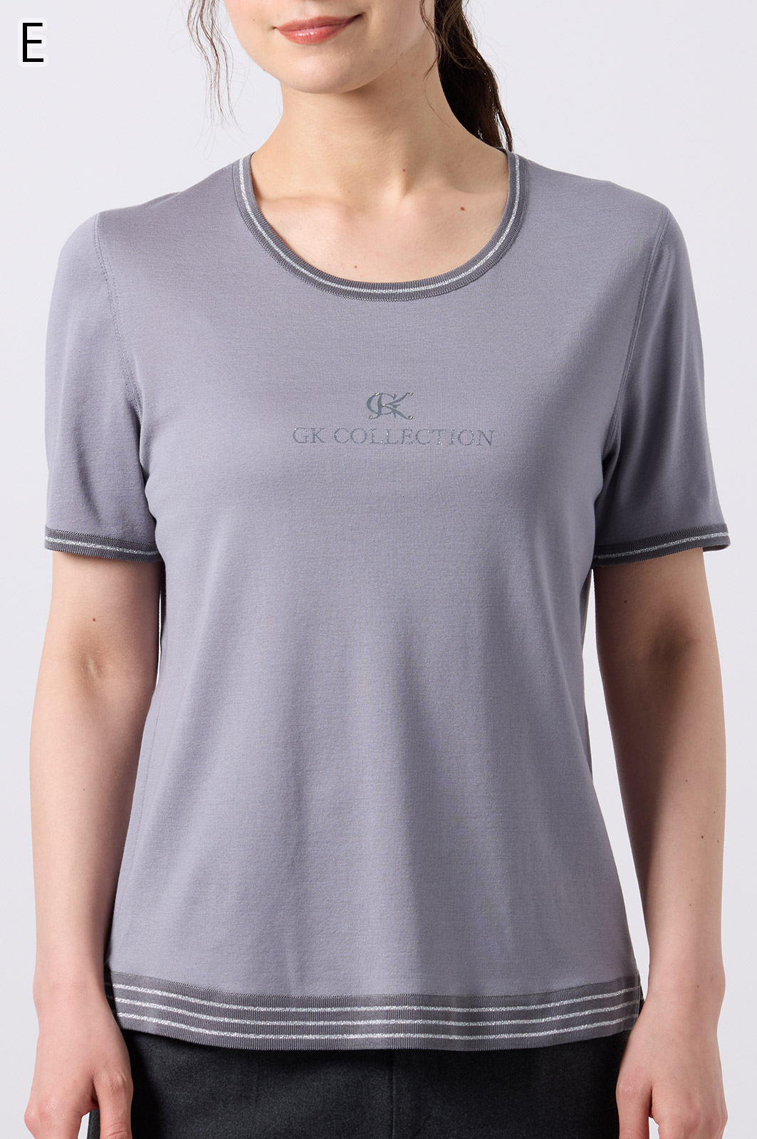 すっきり着られるストレートな形の半袖Tシャツ。首元や袖、すそには綿素材にラメをプラスした縁取り付きで、きらっと上品な仕上がり。