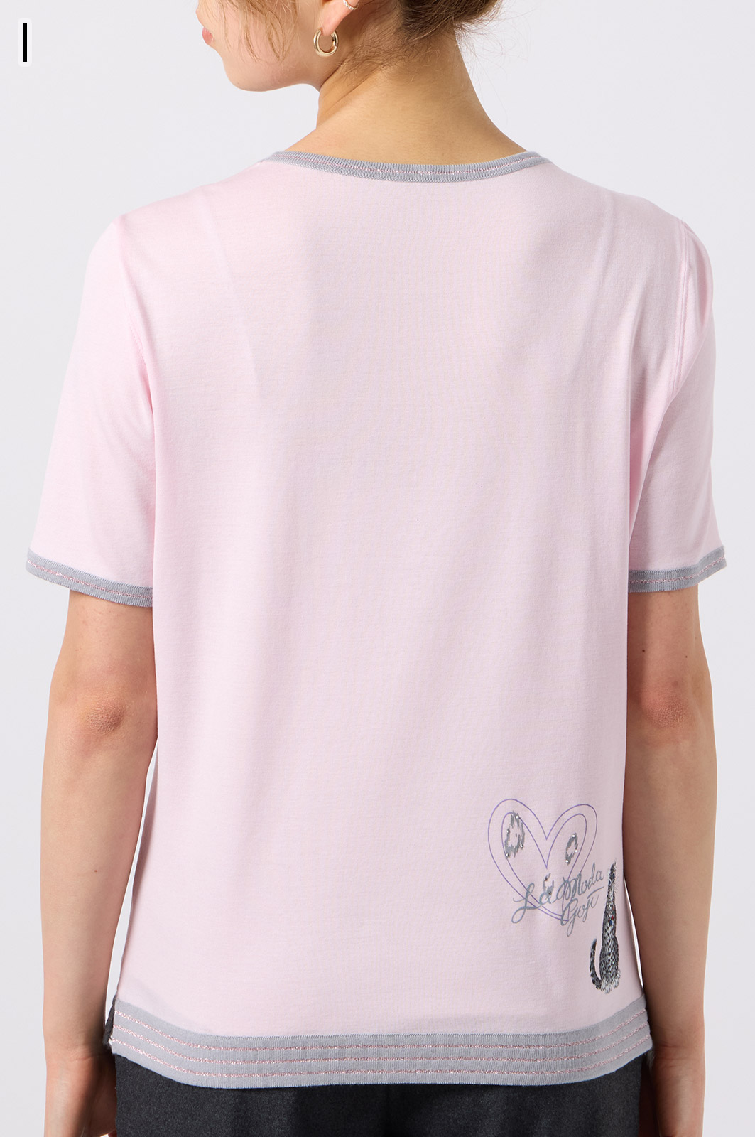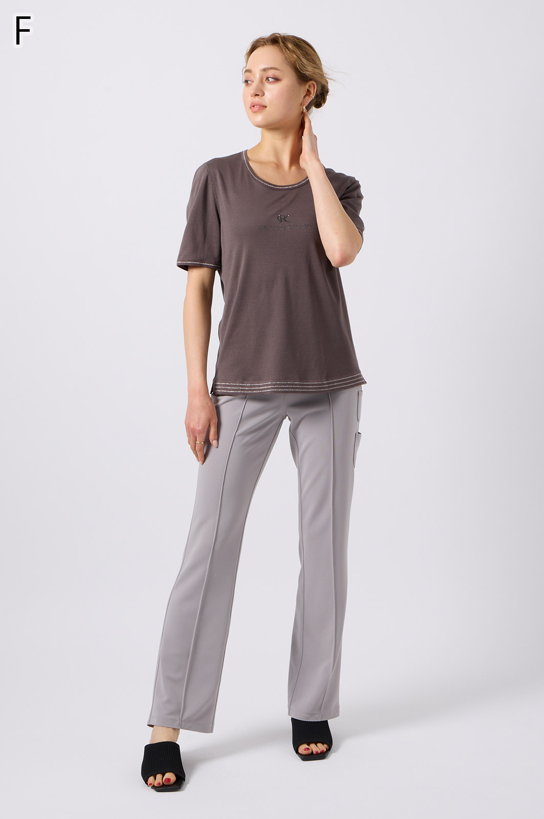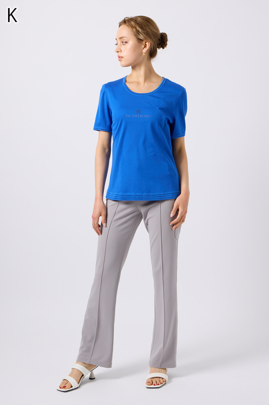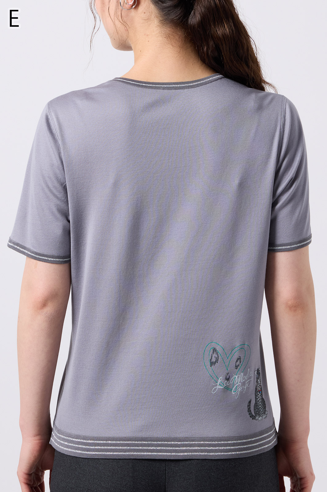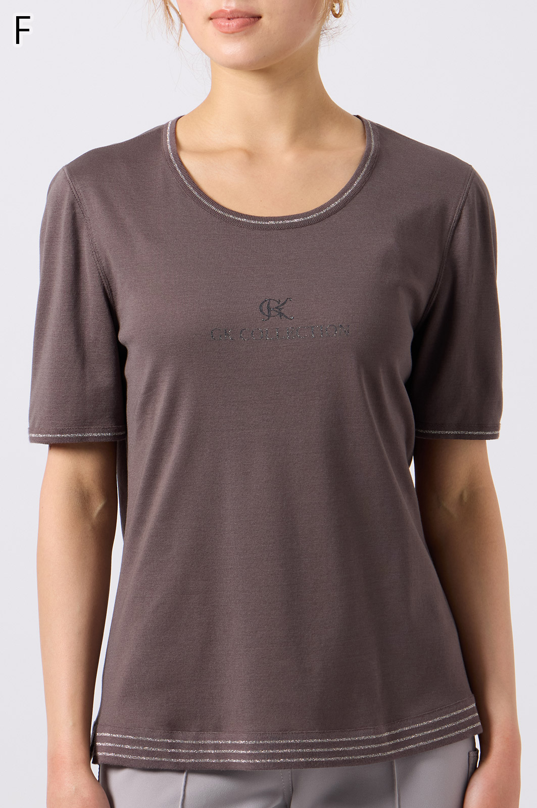 すっきり着られるストレートな形の半袖Tシャツ。首元や袖、すそには綿素材にラメをプラスした縁取り付きで、きらっと上品な仕上がり。