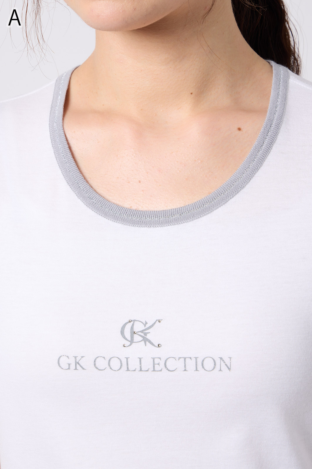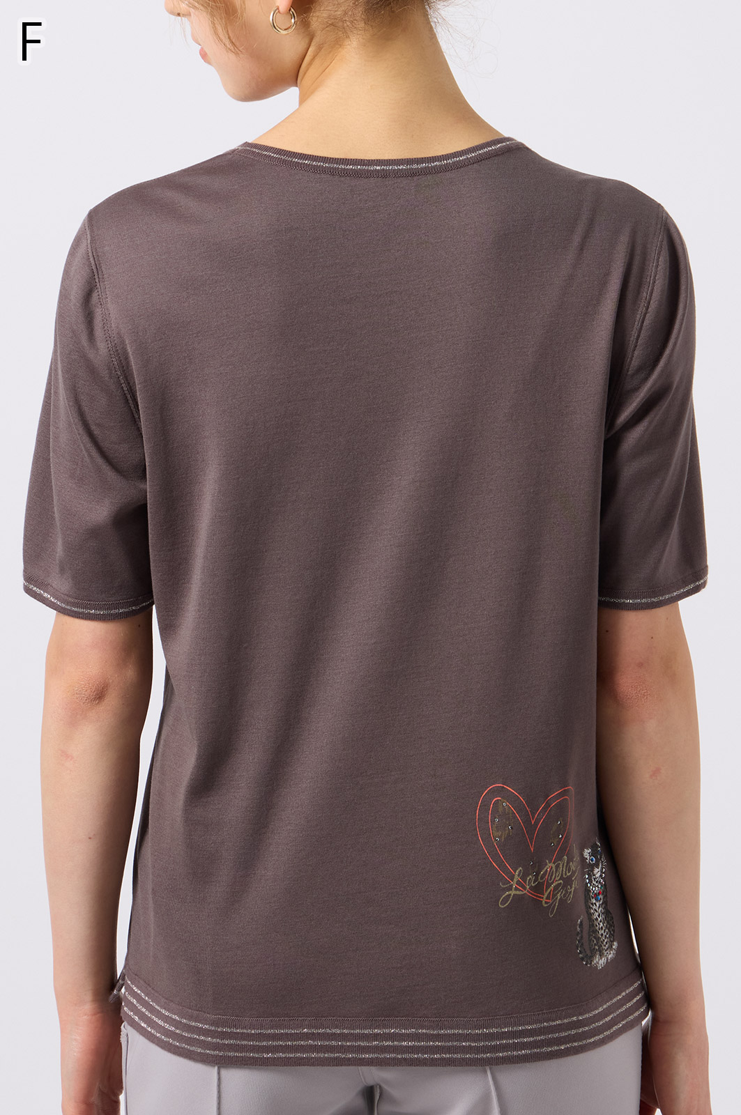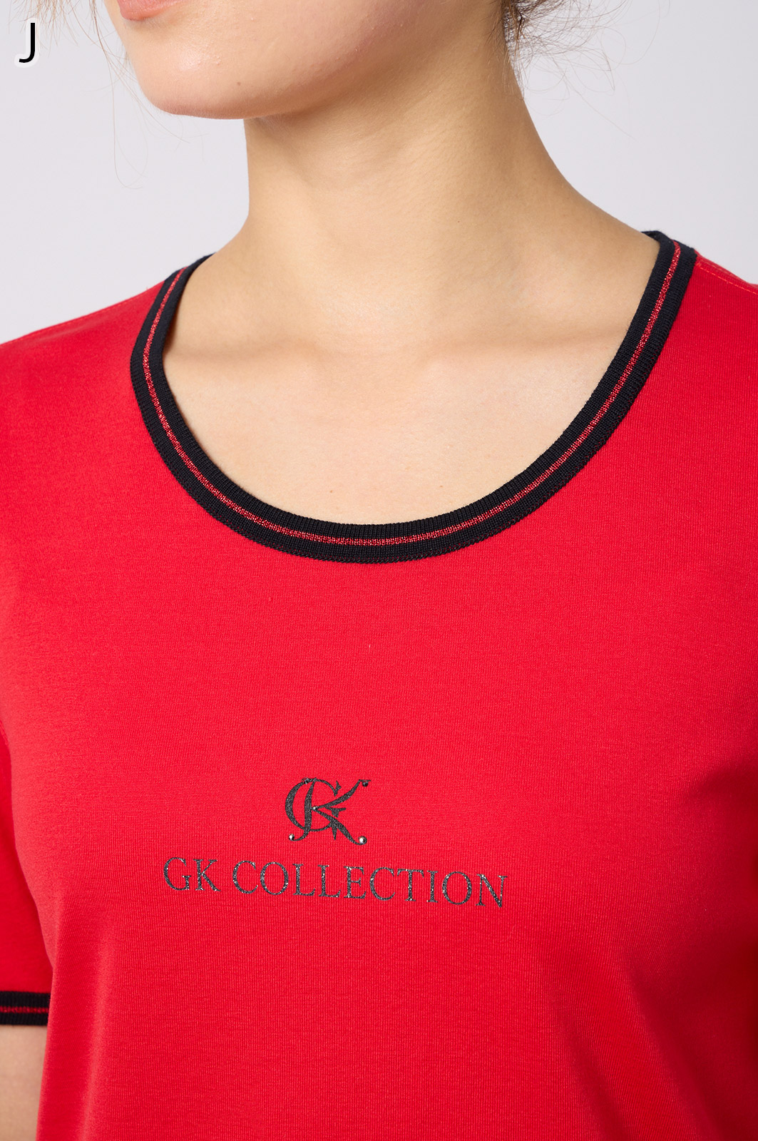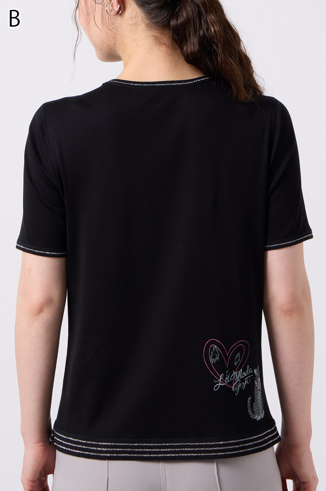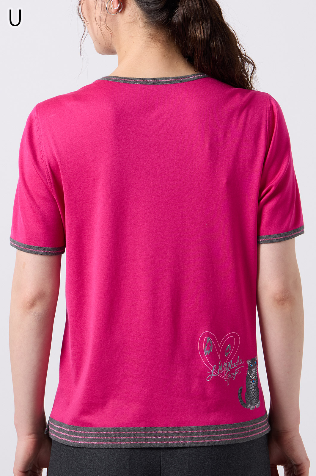 すっきり着られるストレートな形の半袖Tシャツ。首元や袖、すそには綿素材にラメをプラスした縁取り付きで、きらっと上品な仕上がり。