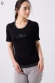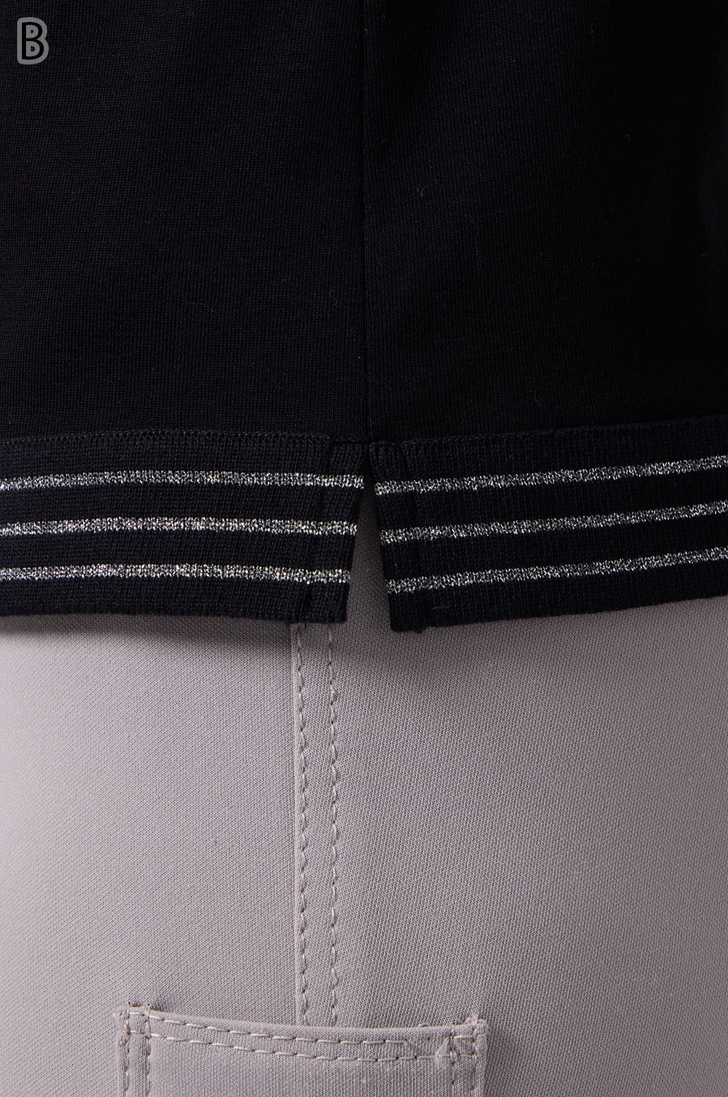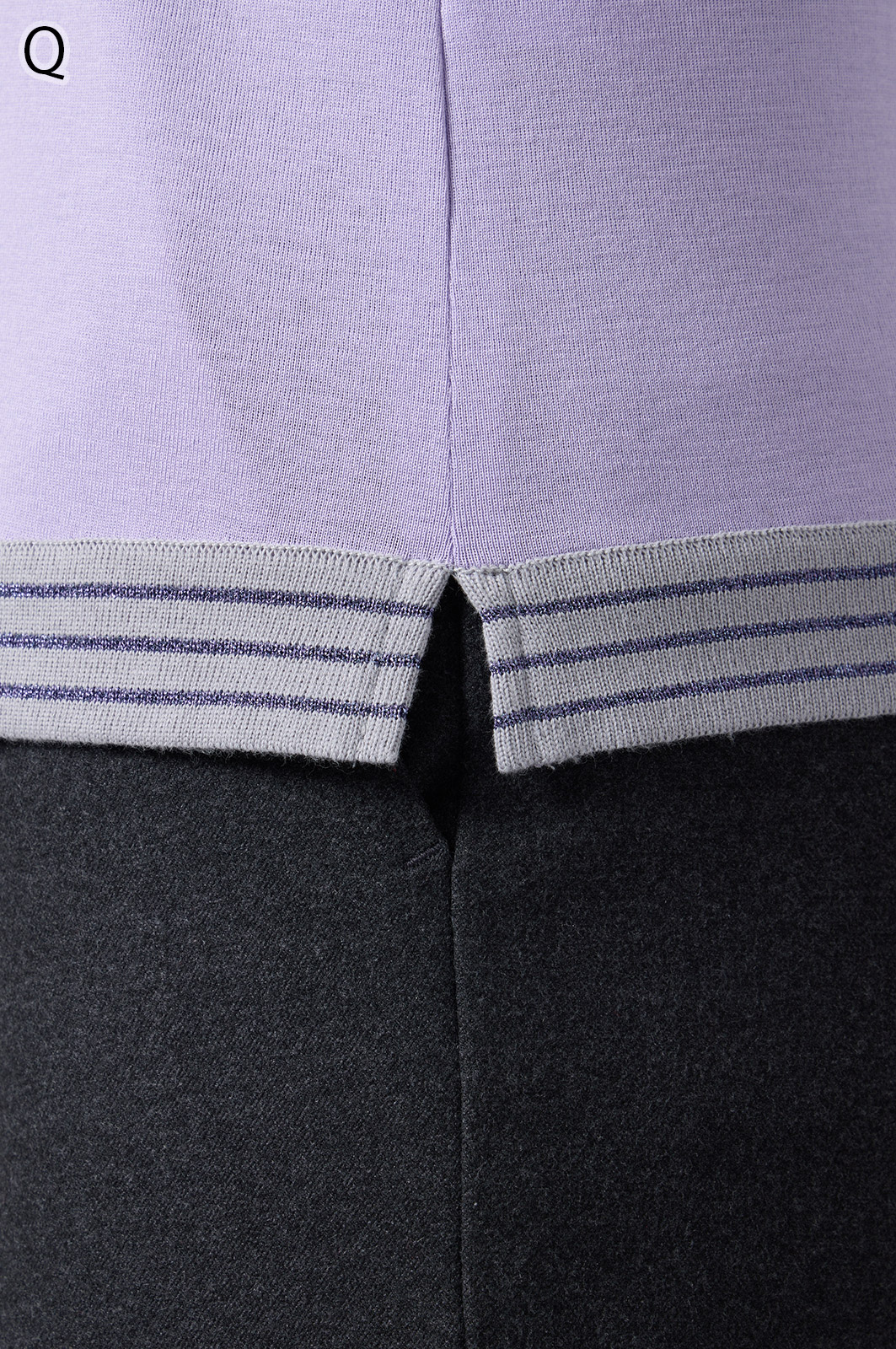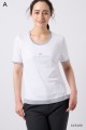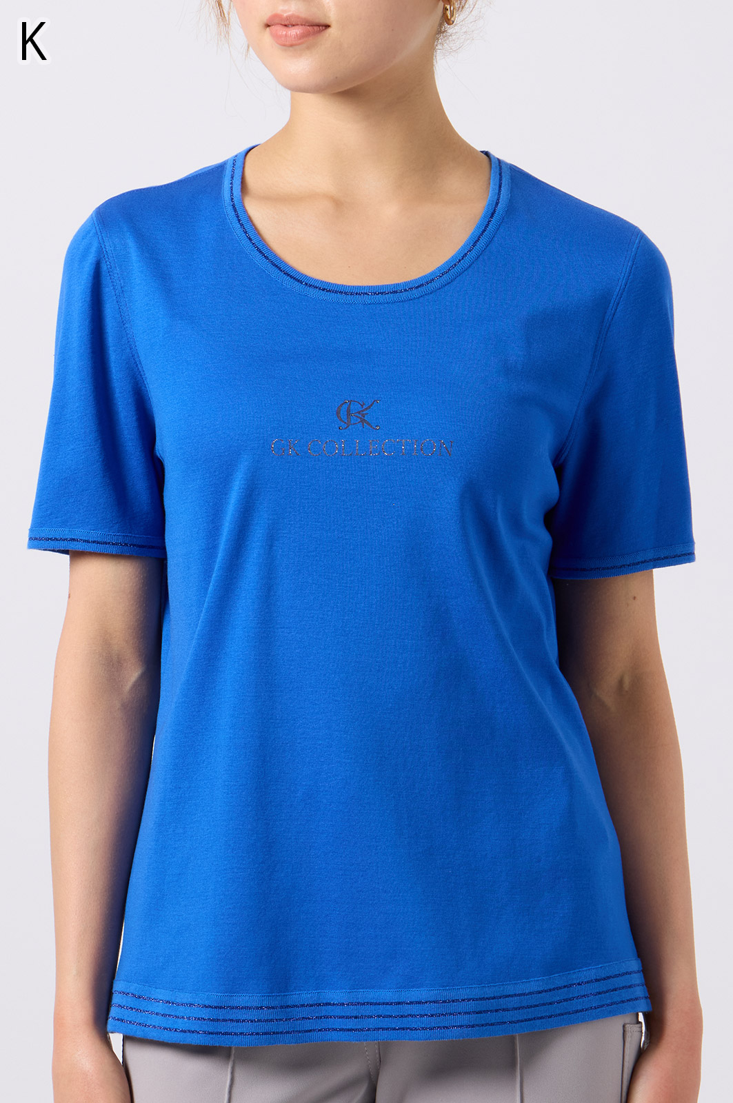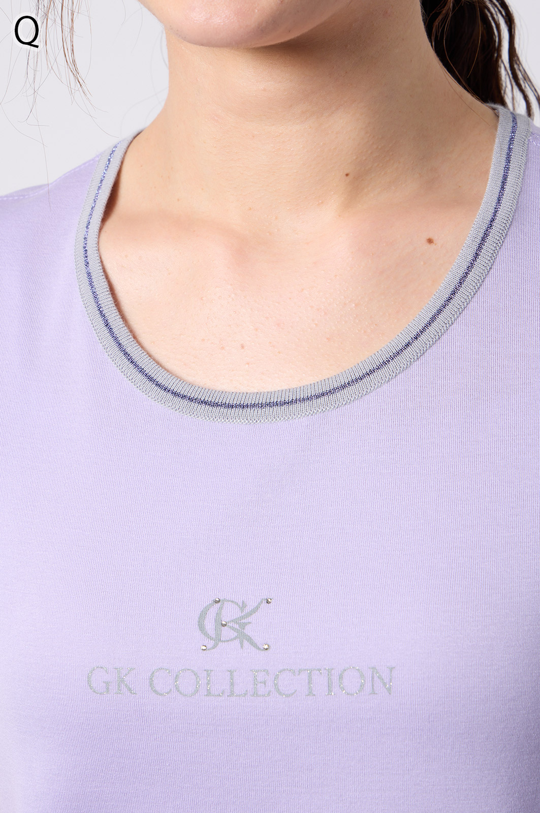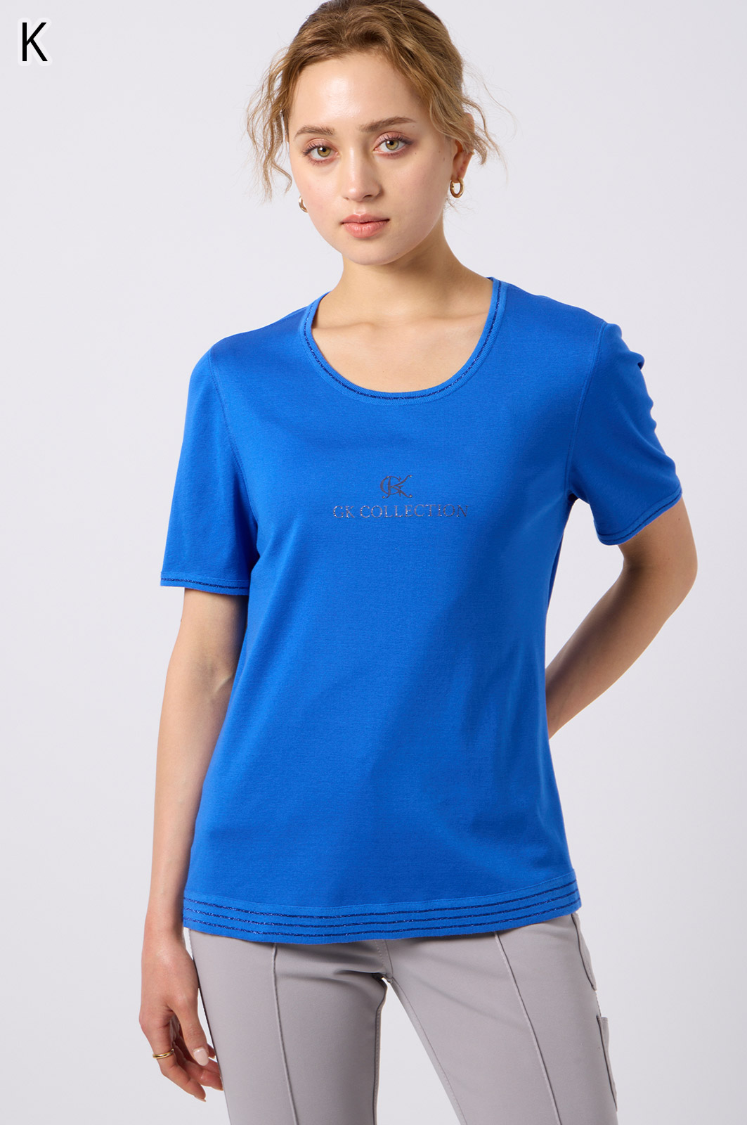 すっきり着られるストレートな形の半袖Tシャツ。首元や袖、すそには綿素材にラメをプラスした縁取り付きで、きらっと上品な仕上がり。