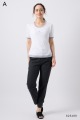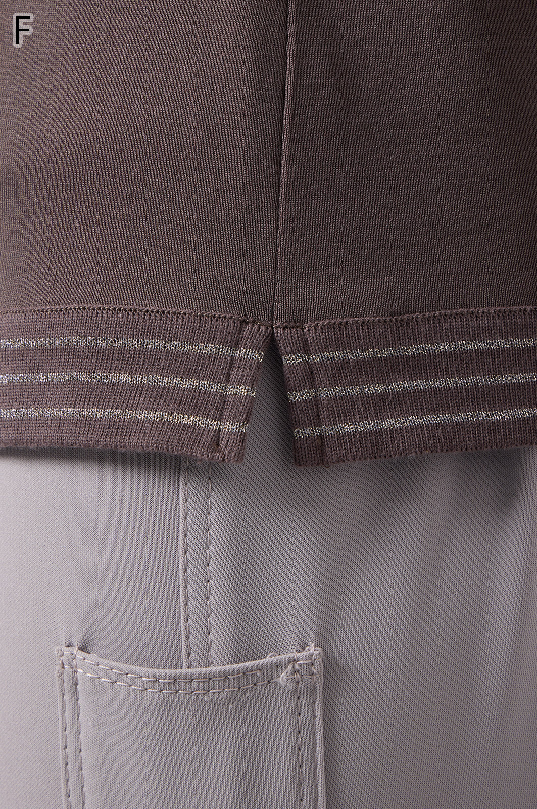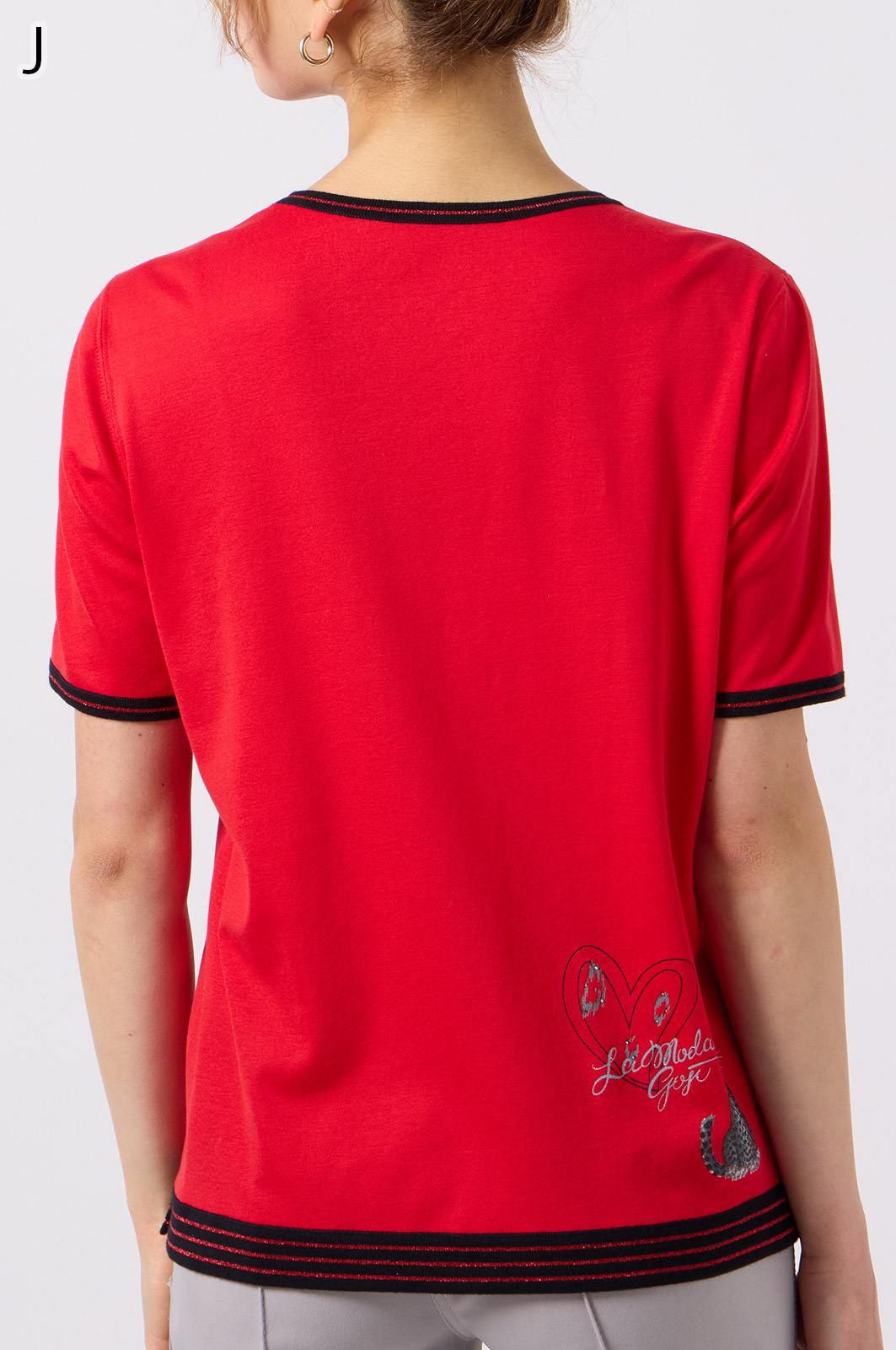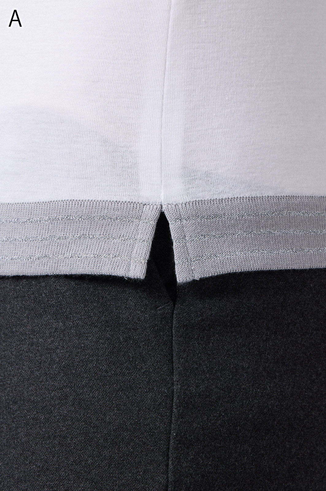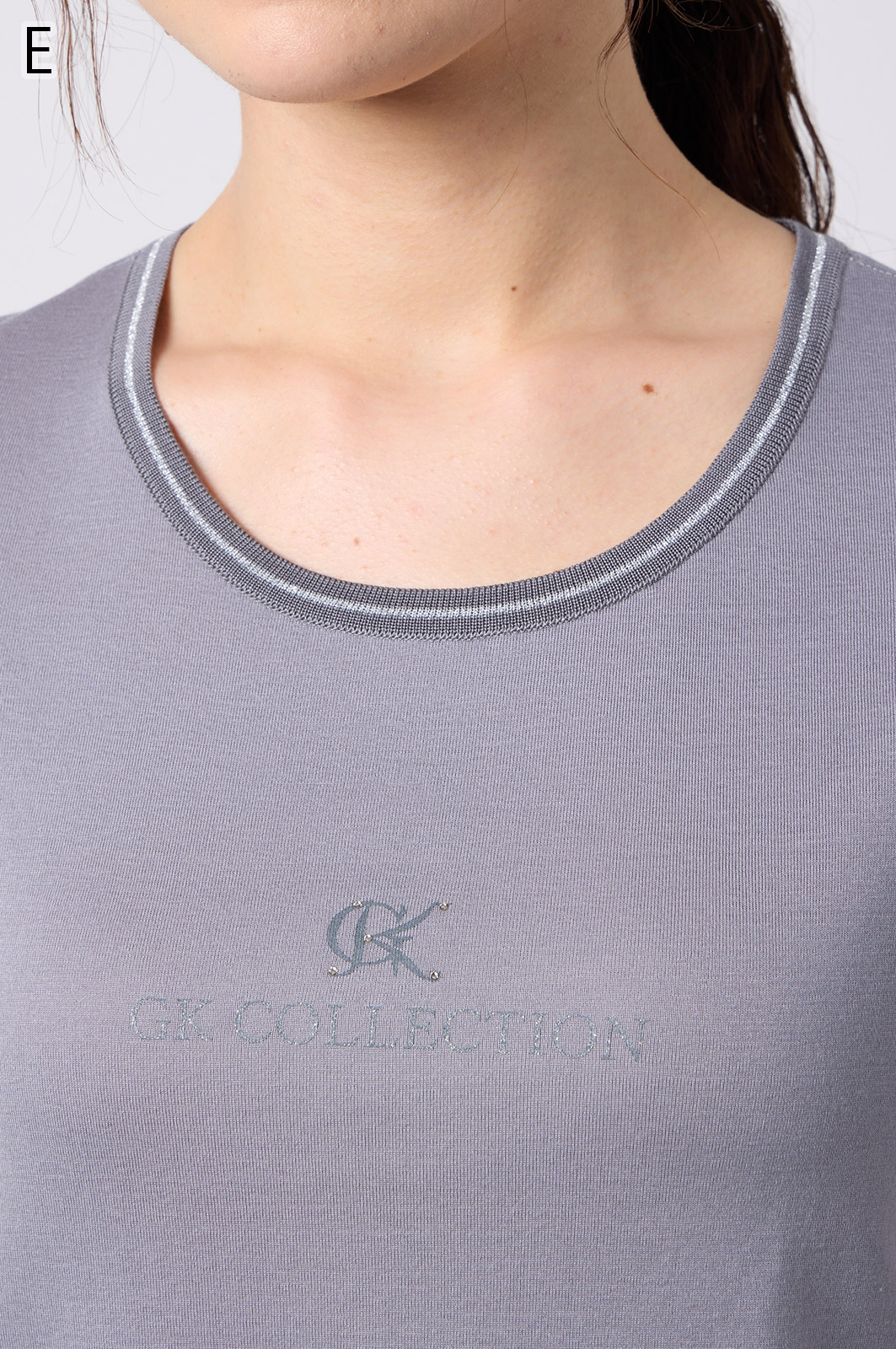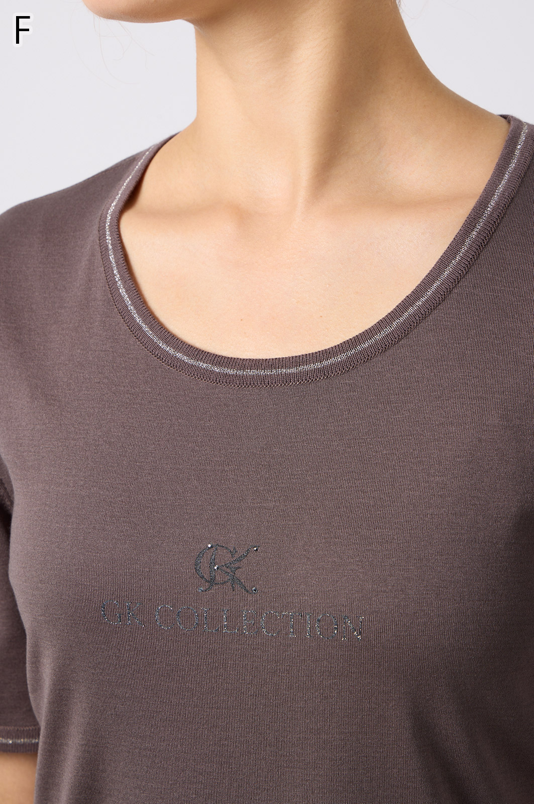 すっきり着られるストレートな形の半袖Tシャツ。首元や袖、すそには綿素材にラメをプラスした縁取り付きで、きらっと上品な仕上がり。