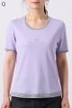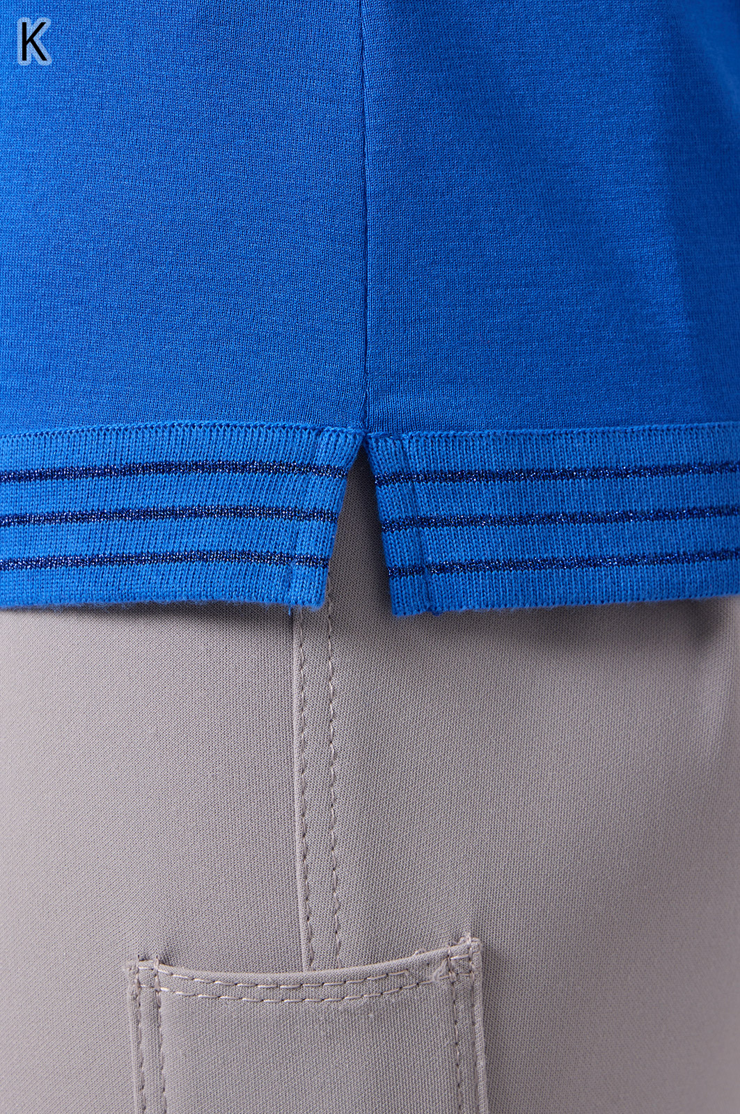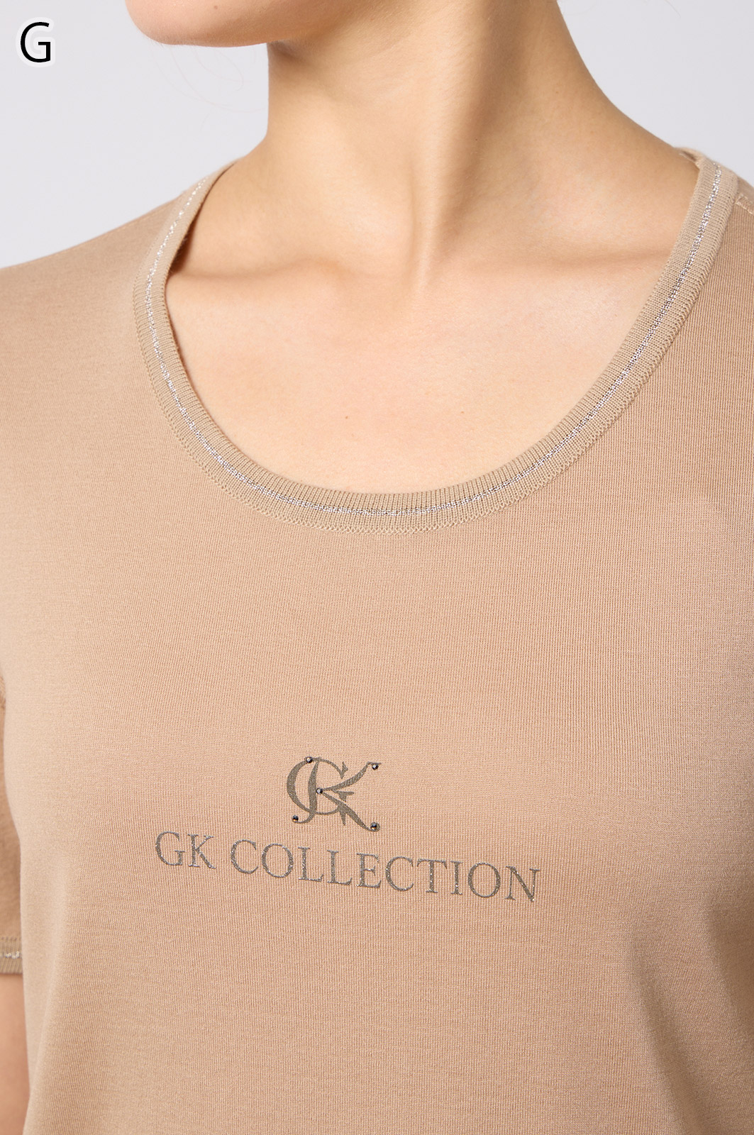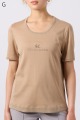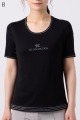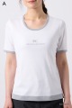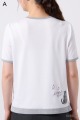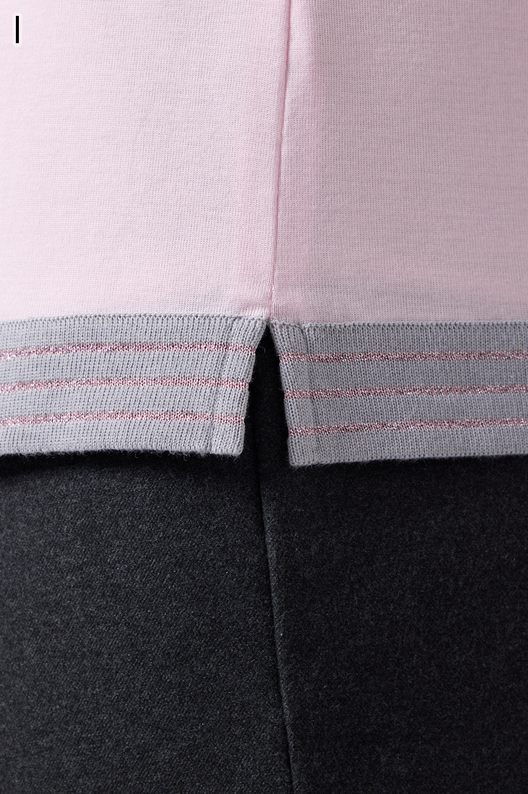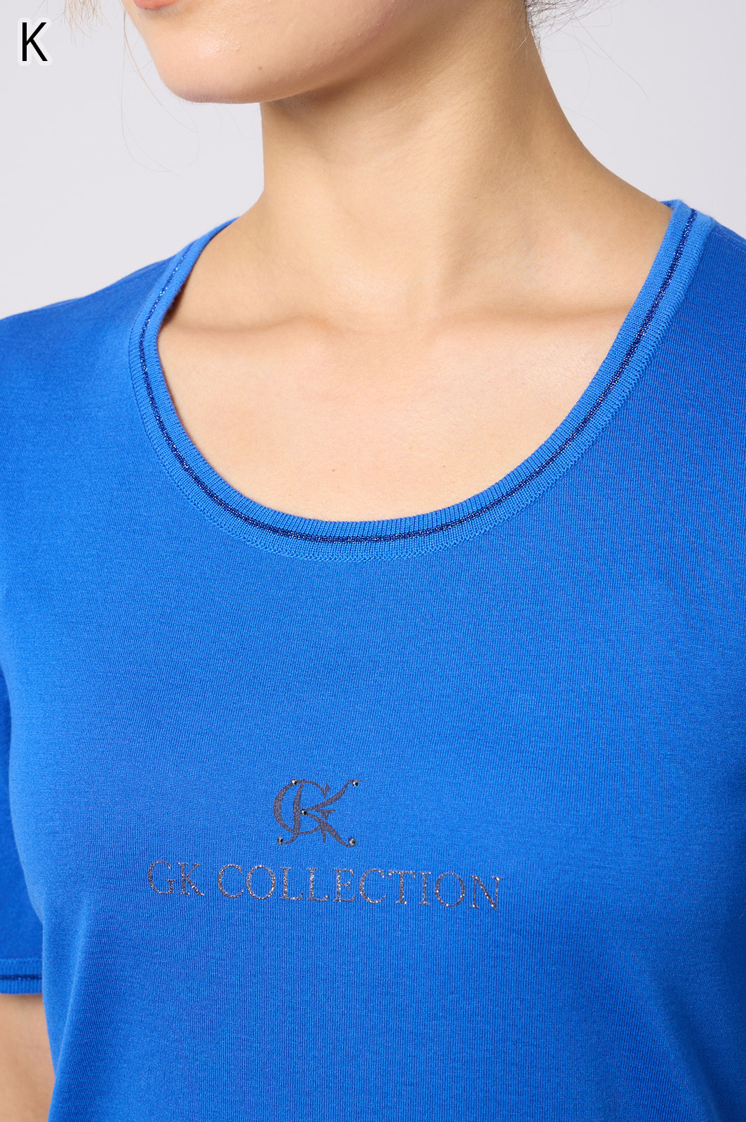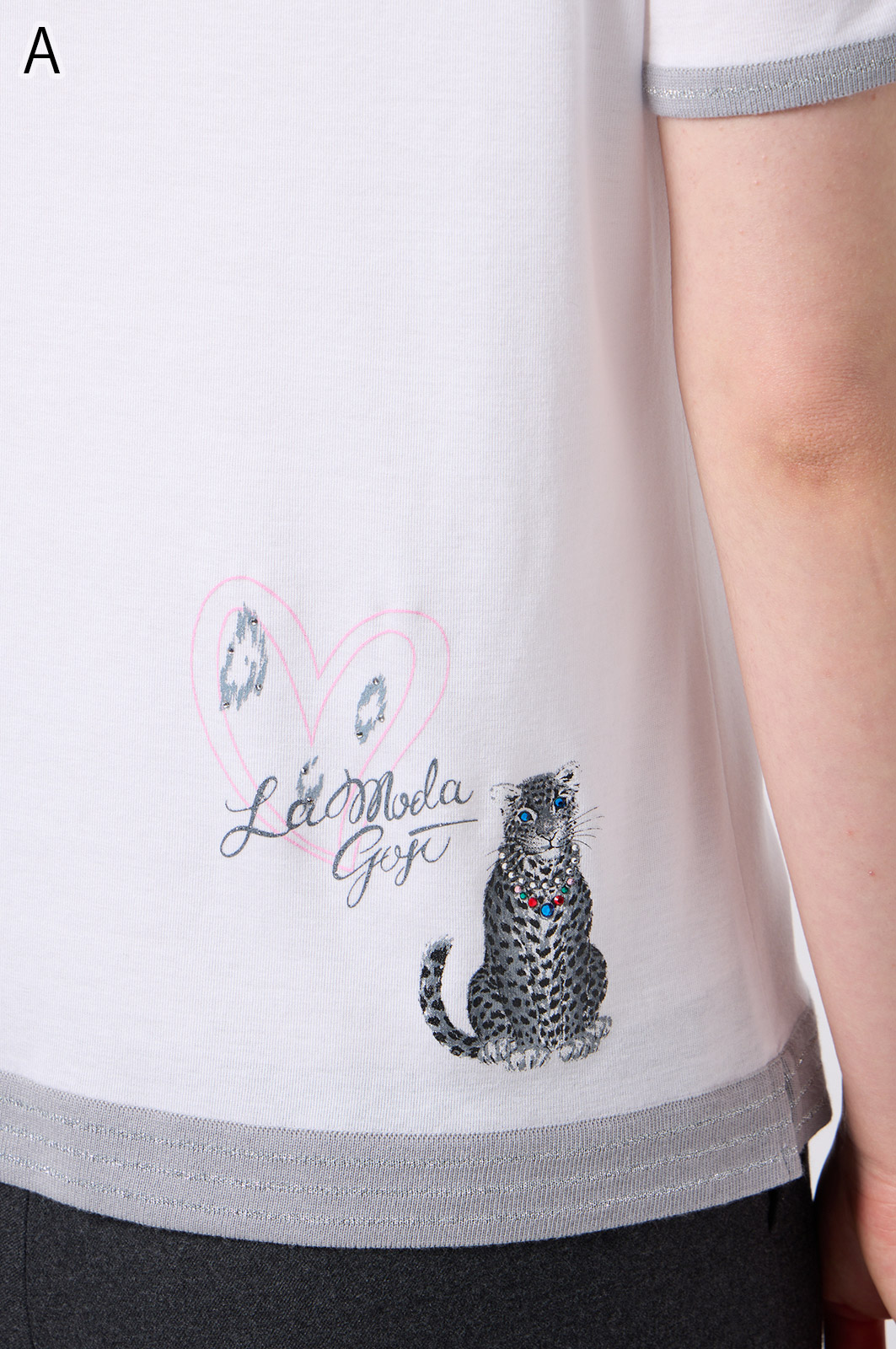 すっきり着られるストレートな形の半袖Tシャツ。首元や袖、すそには綿素材にラメをプラスした縁取り付きで、きらっと上品な仕上がり。