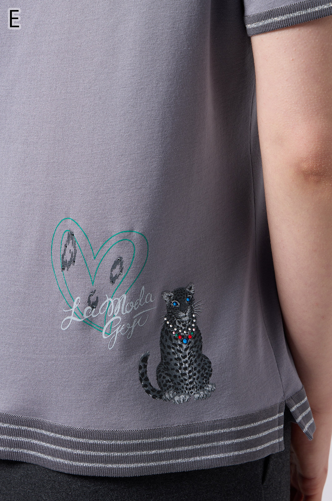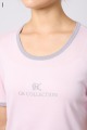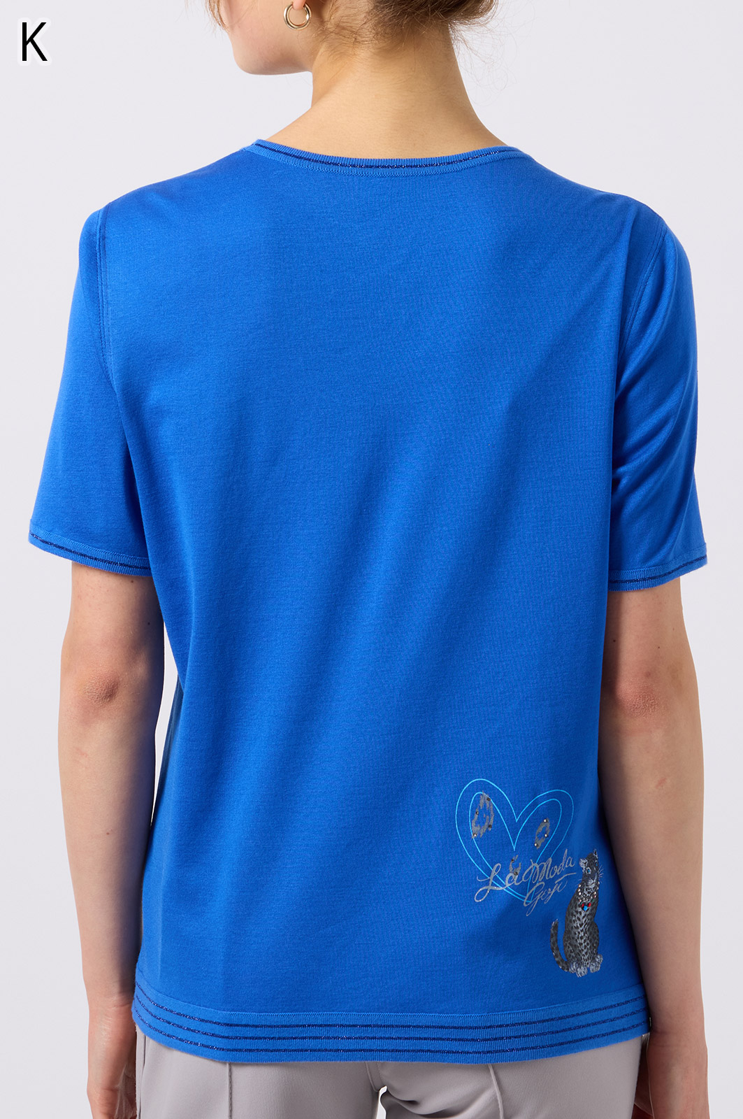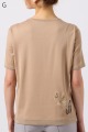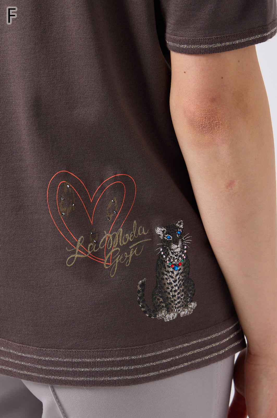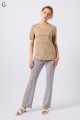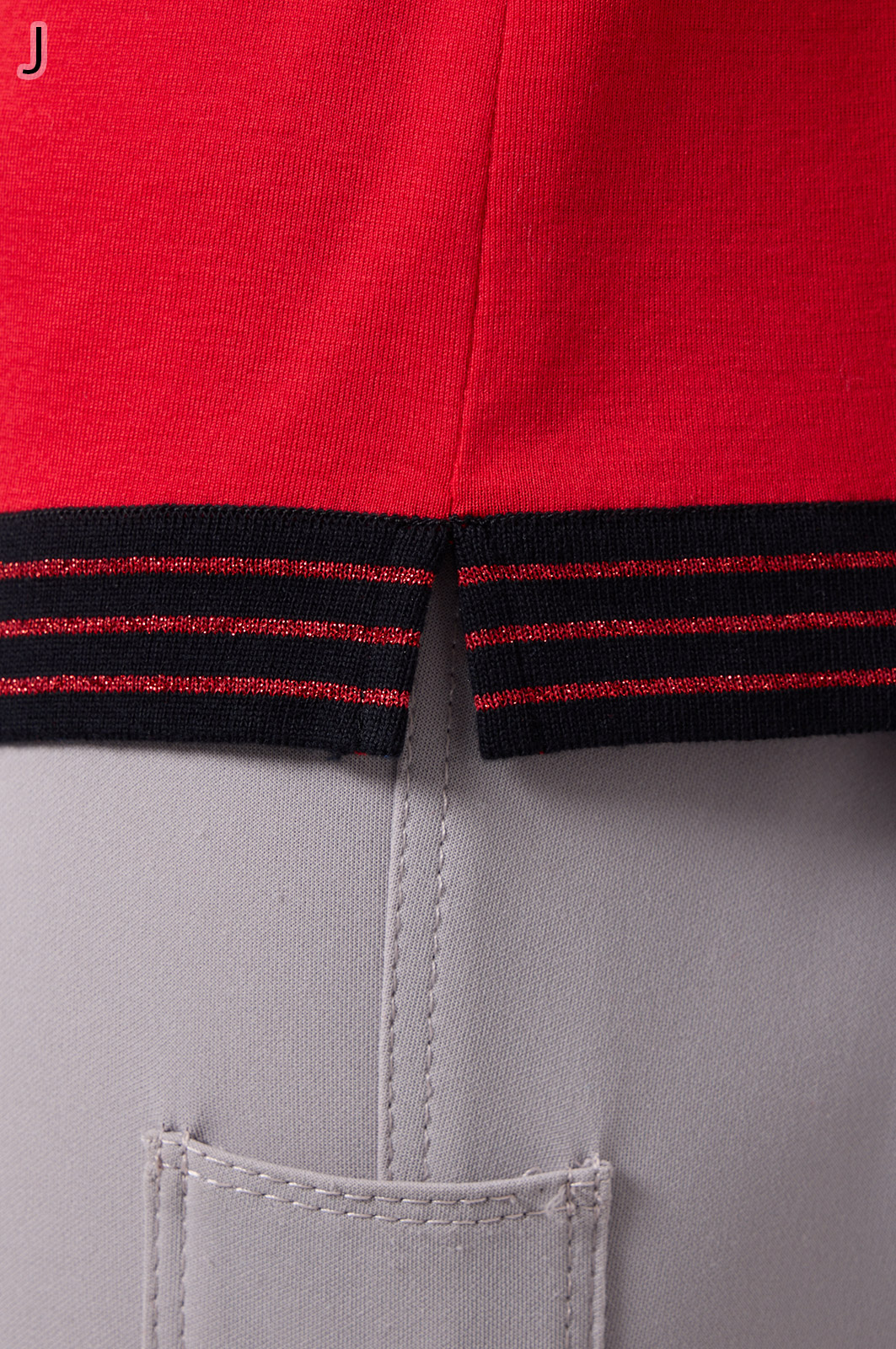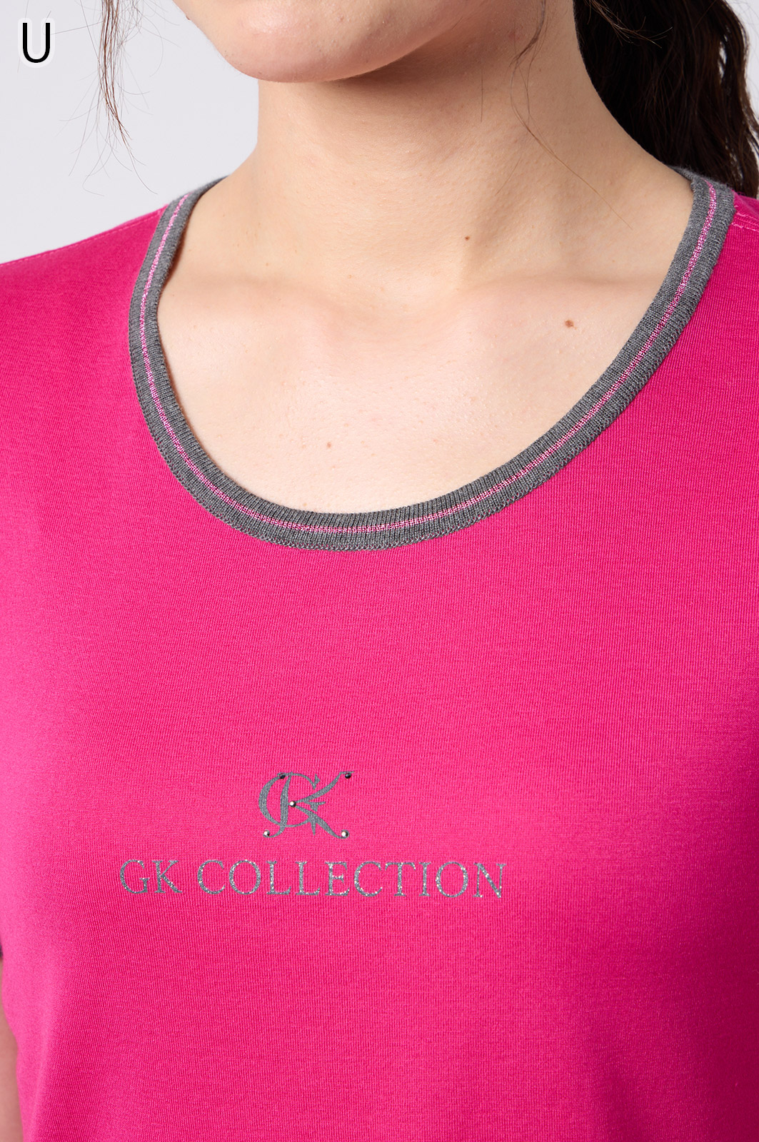 すっきり着られるストレートな形の半袖Tシャツ。首元や袖、すそには綿素材にラメをプラスした縁取り付きで、きらっと上品な仕上がり。