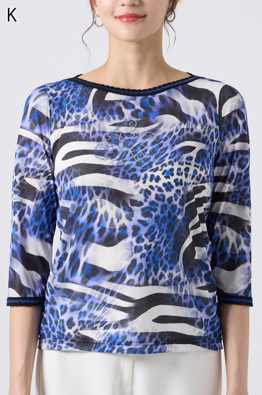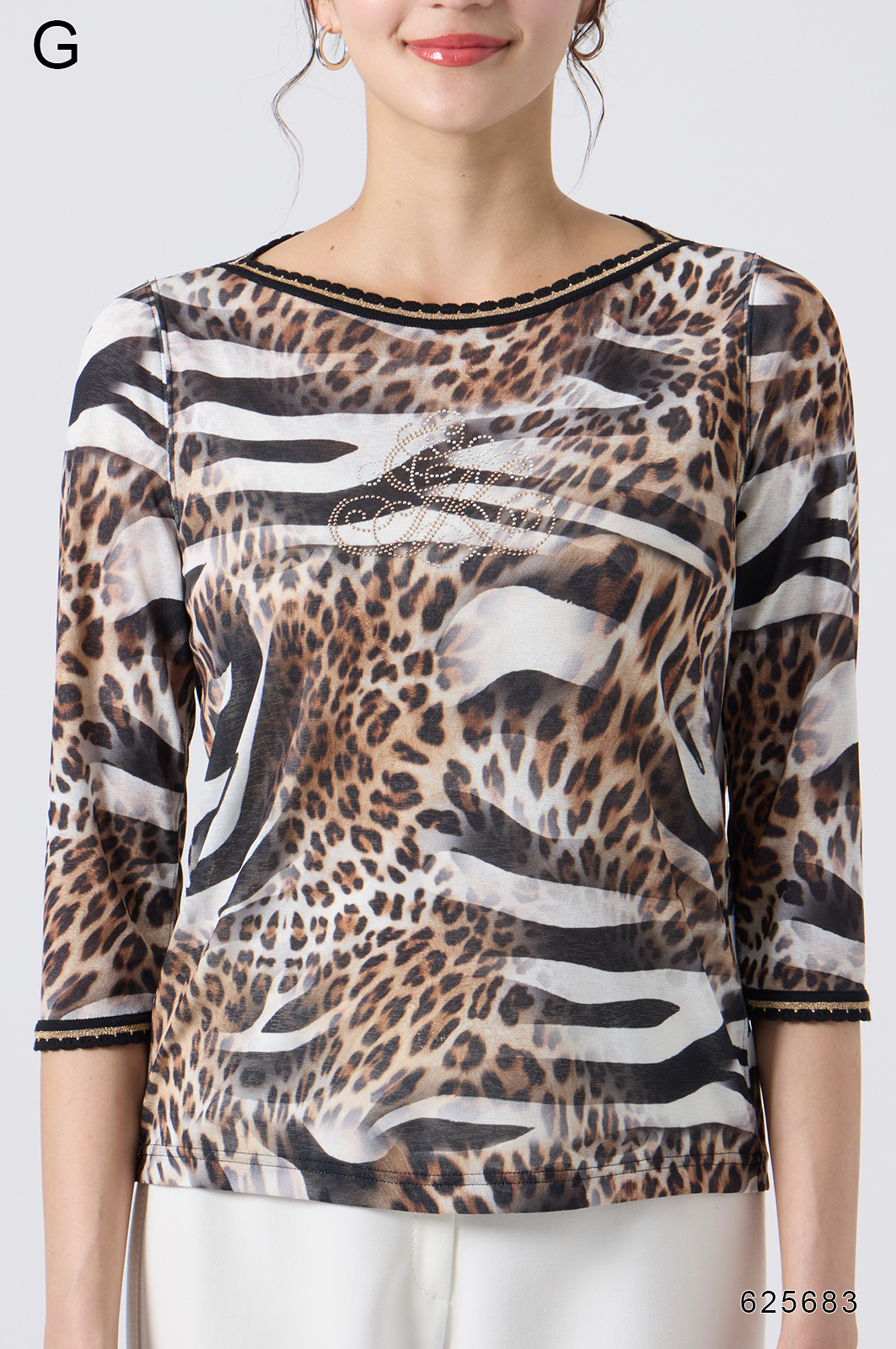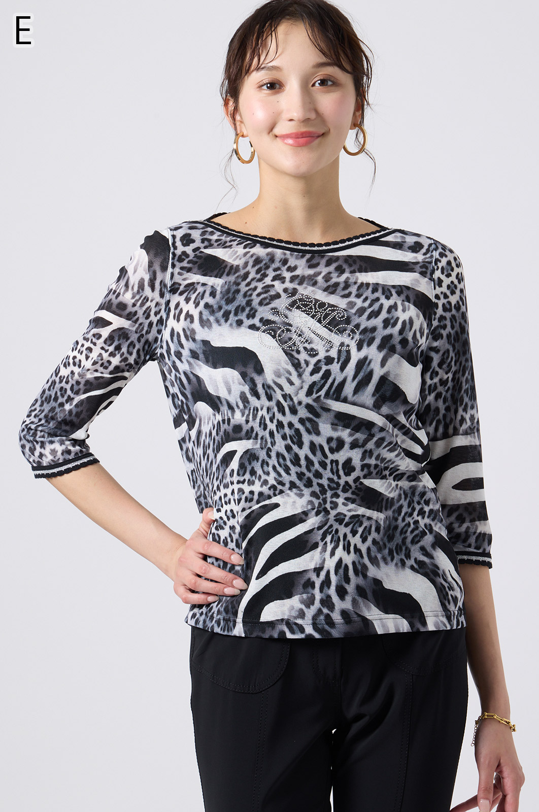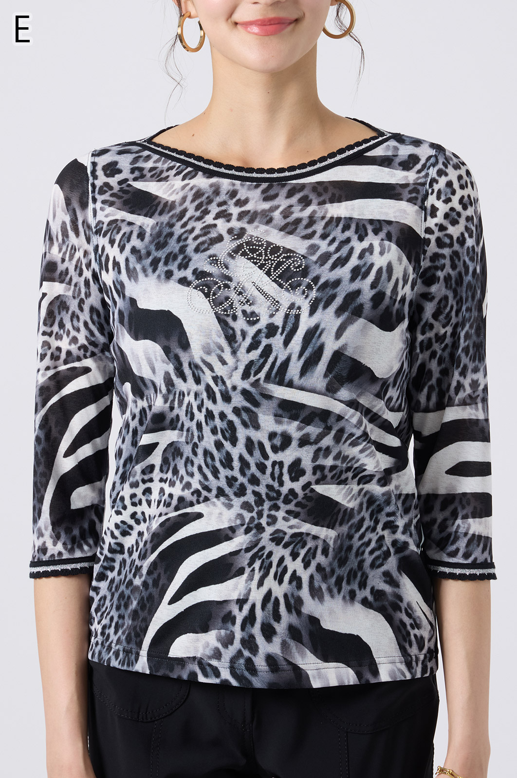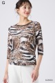 爽やかな着心地と遊び心あるアニマル柄が魅力♪首元がきれいに見えるボートネックと、すっきり見せる七分袖で大人カジュアルにぴったりのTシャツです。