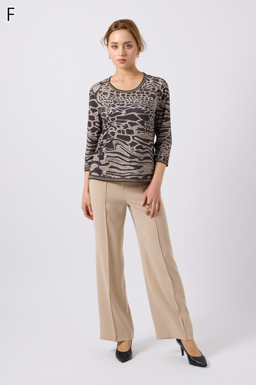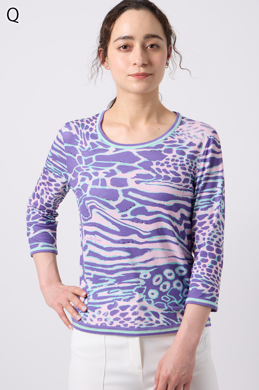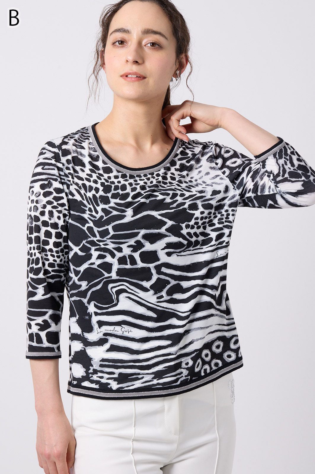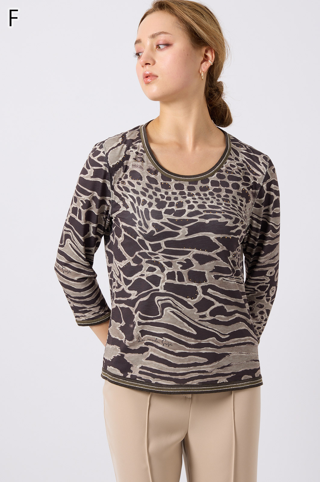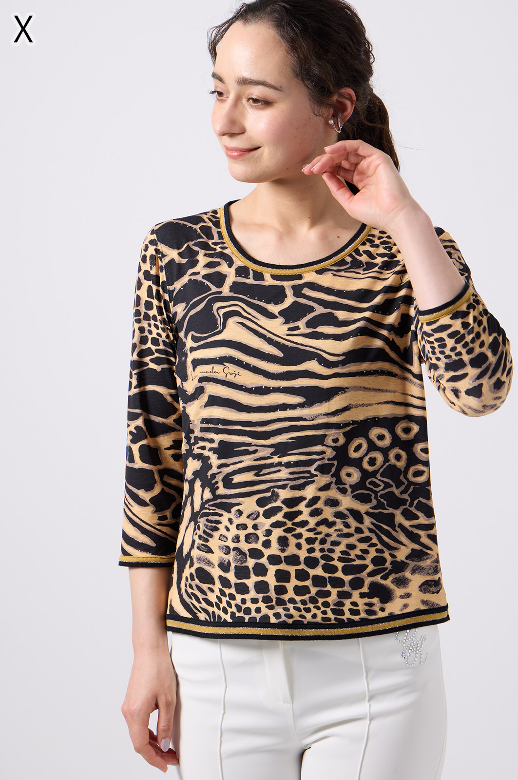 なめらかな素材感が魅力のアニマル柄トップス。すっきりした形と7分袖で着まわしやすく、首元や袖、すそに細ボーダーがアクセント。